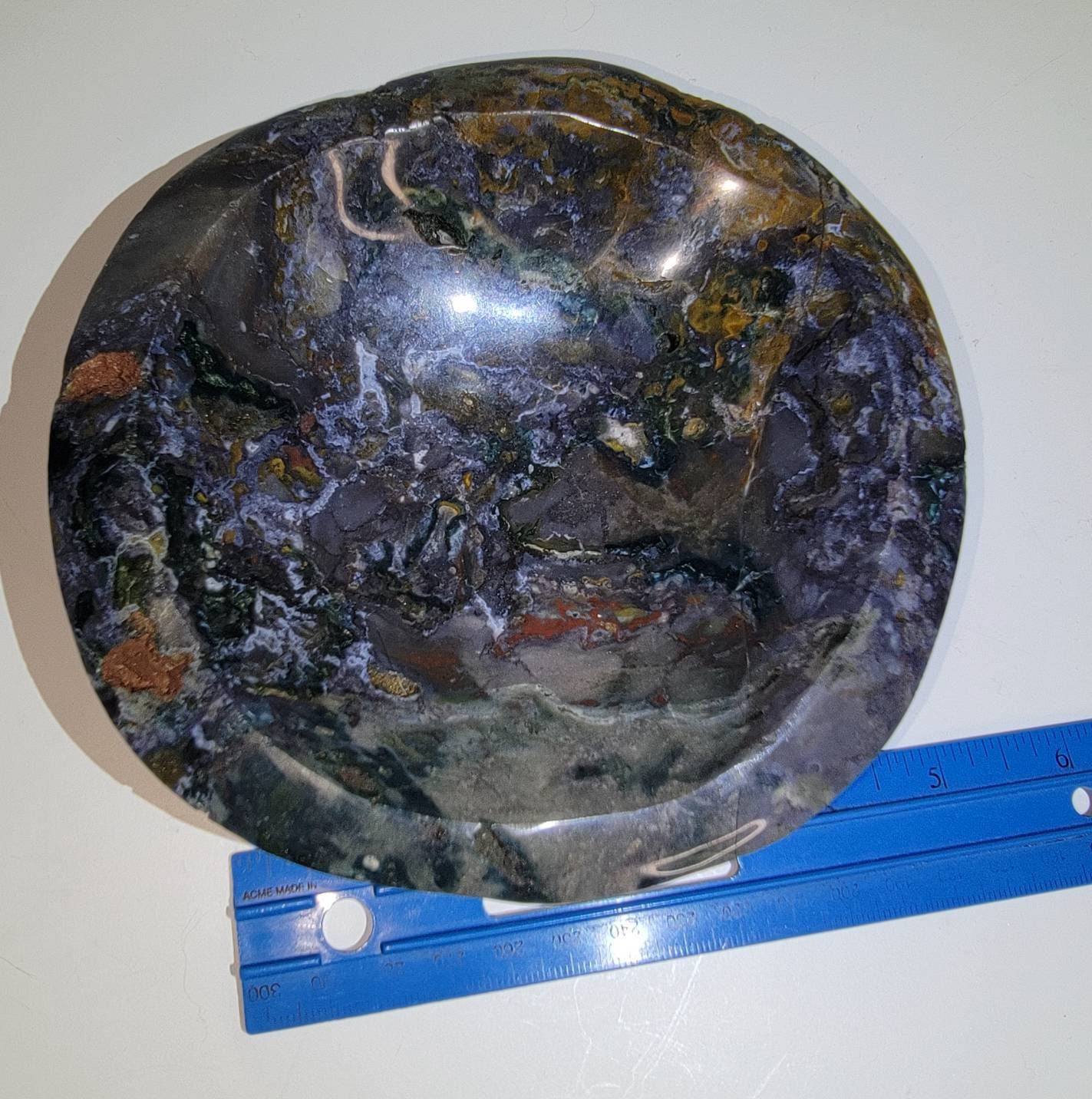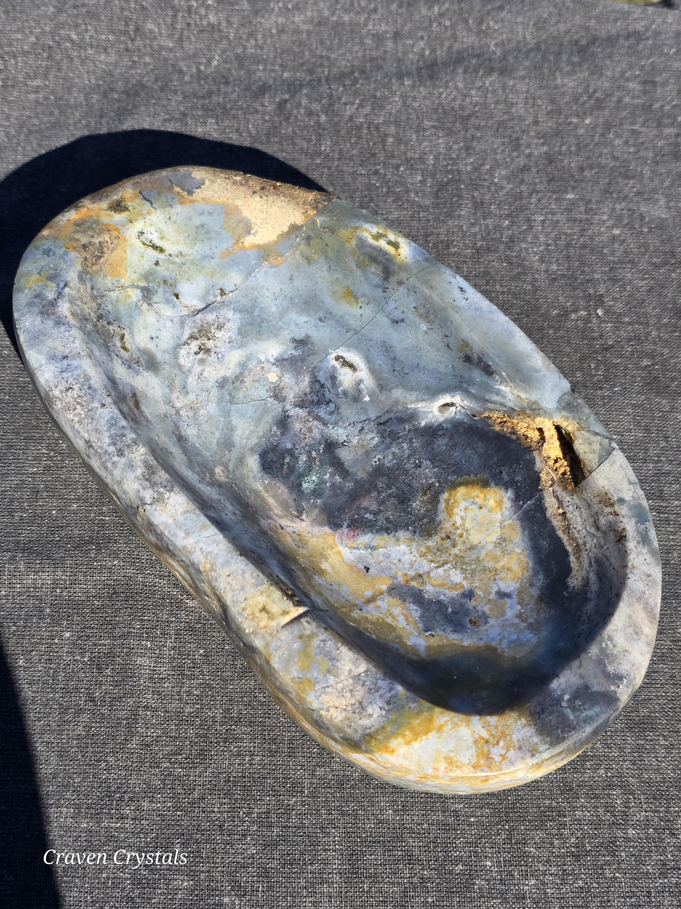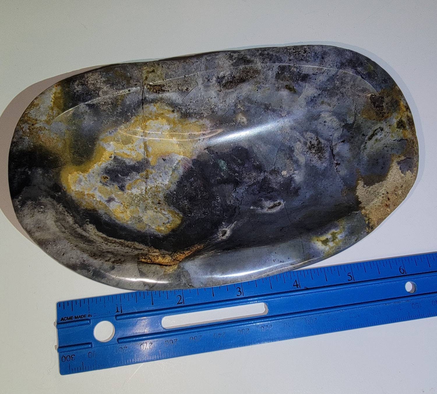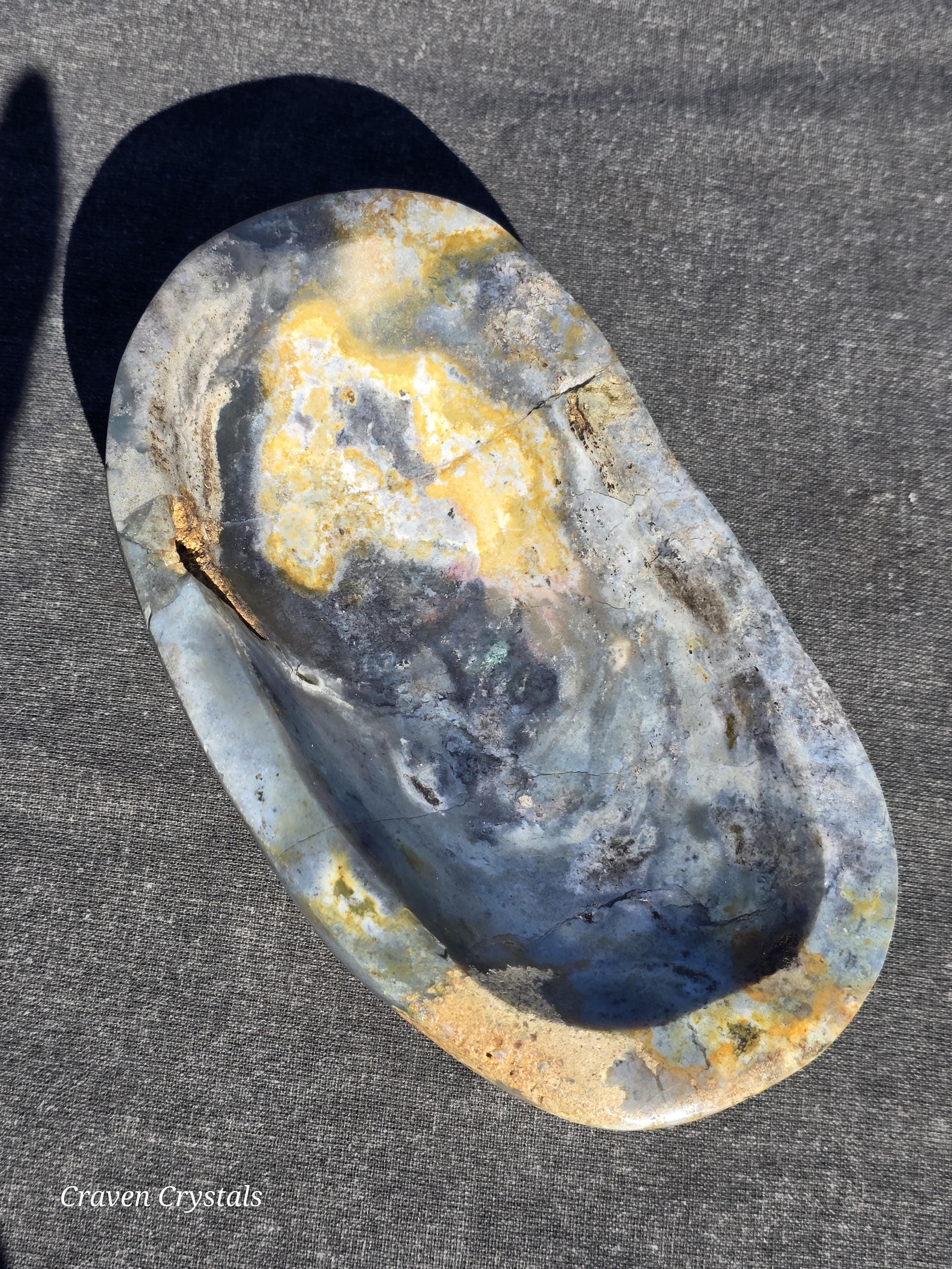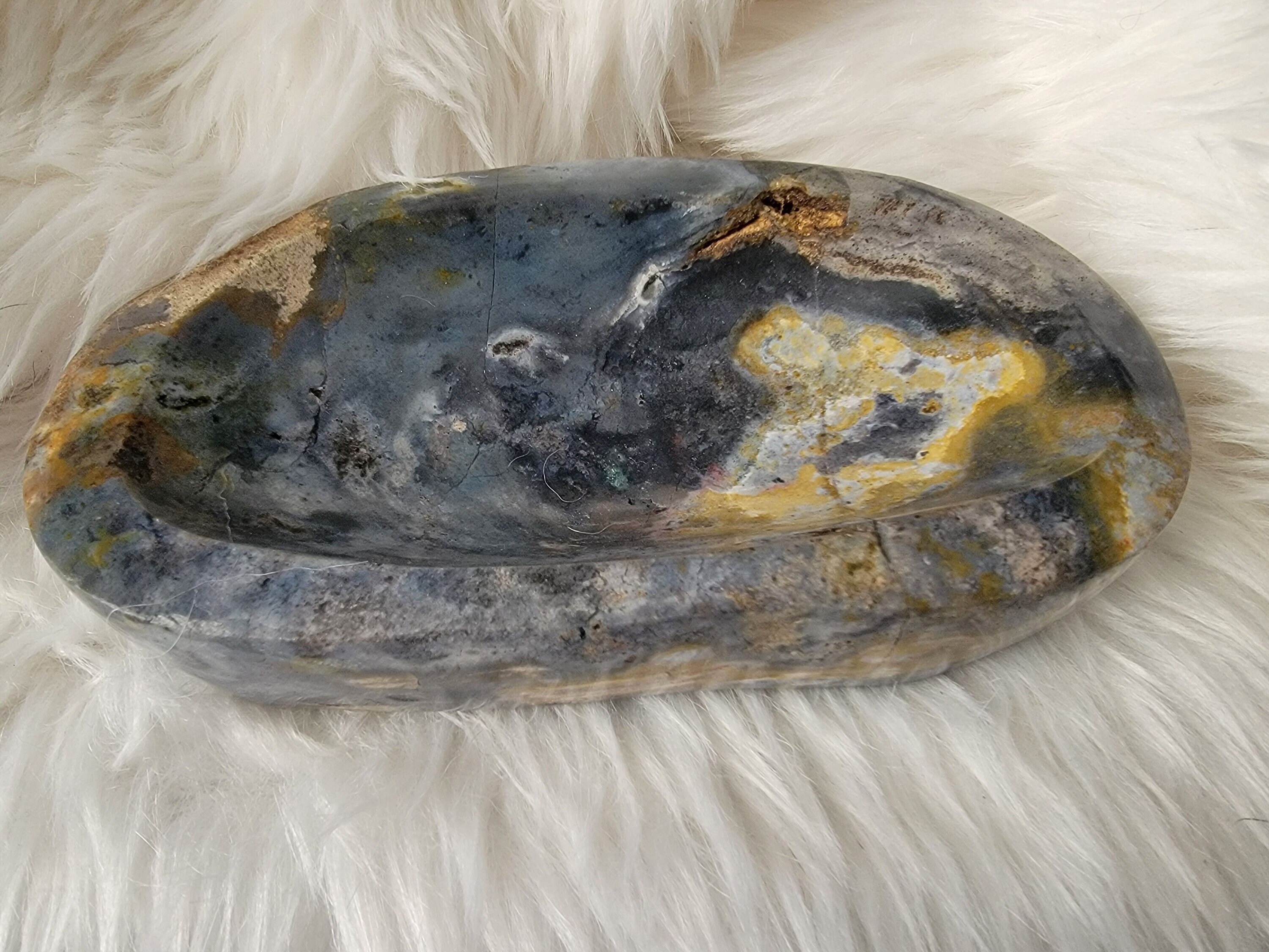 Beautiful gray/blue Ocean Jasper solid stone oval bowl with natural drusy. It's perfect to hold jewelry or just as a decorative piece