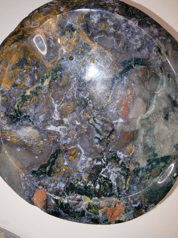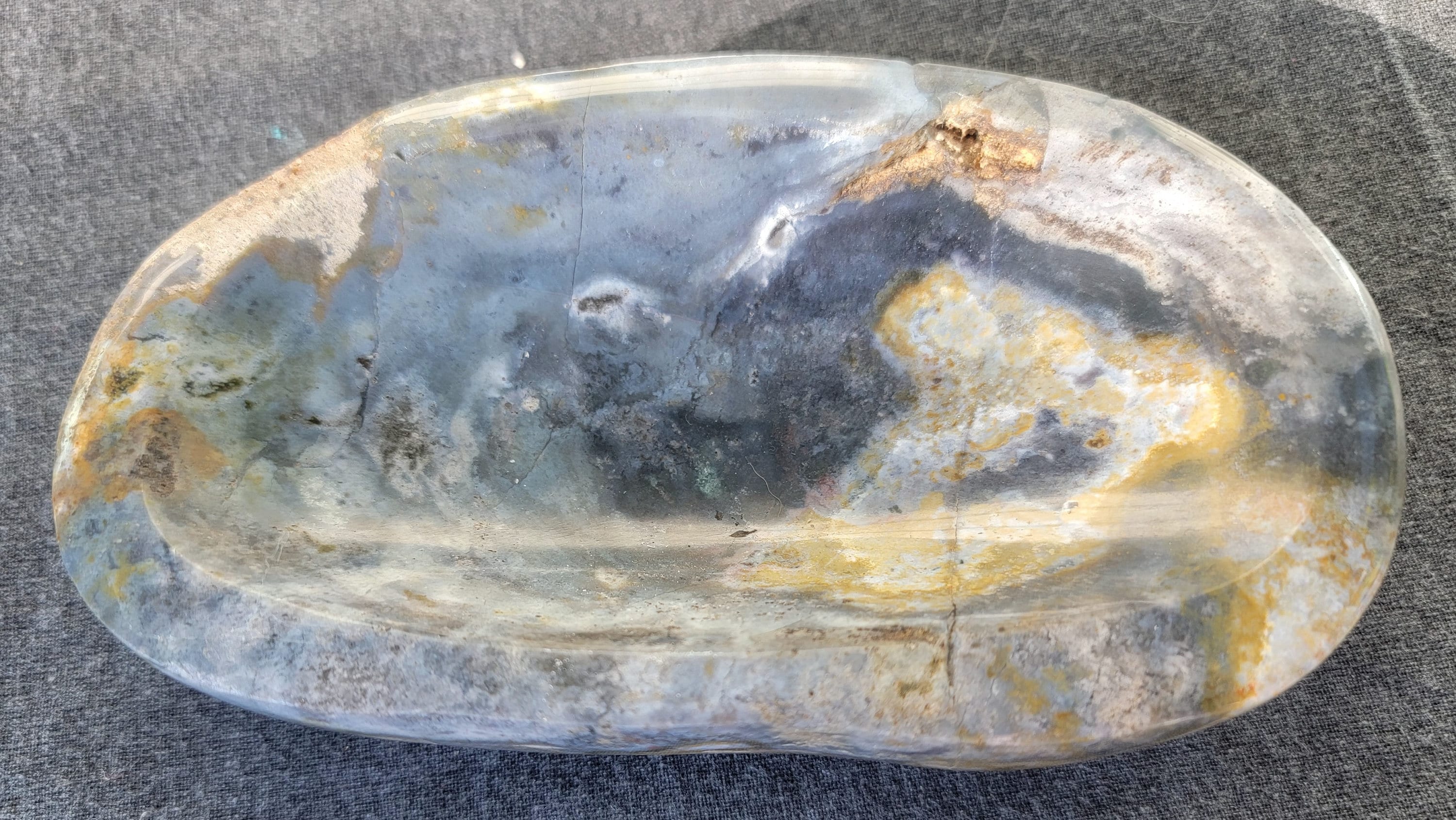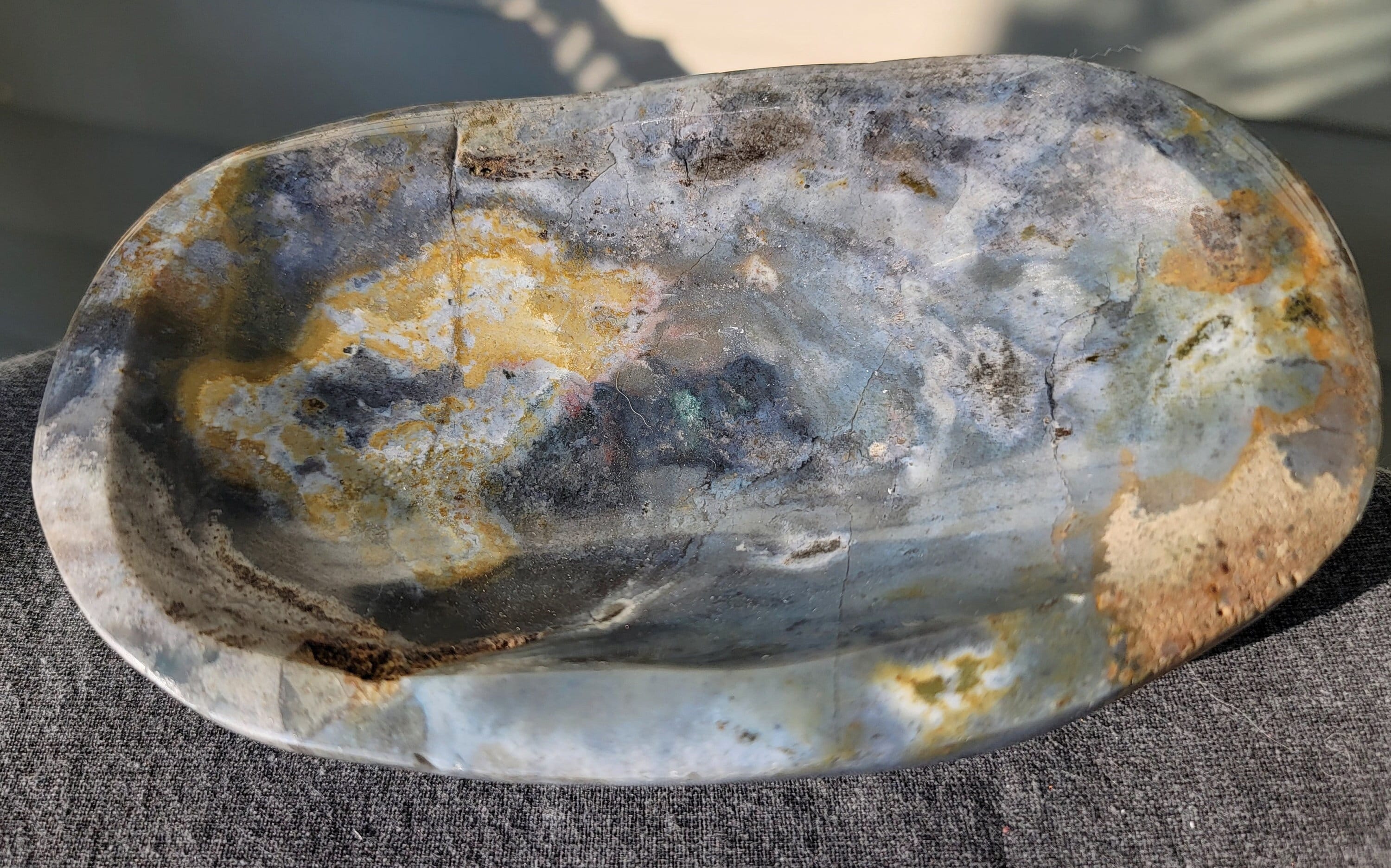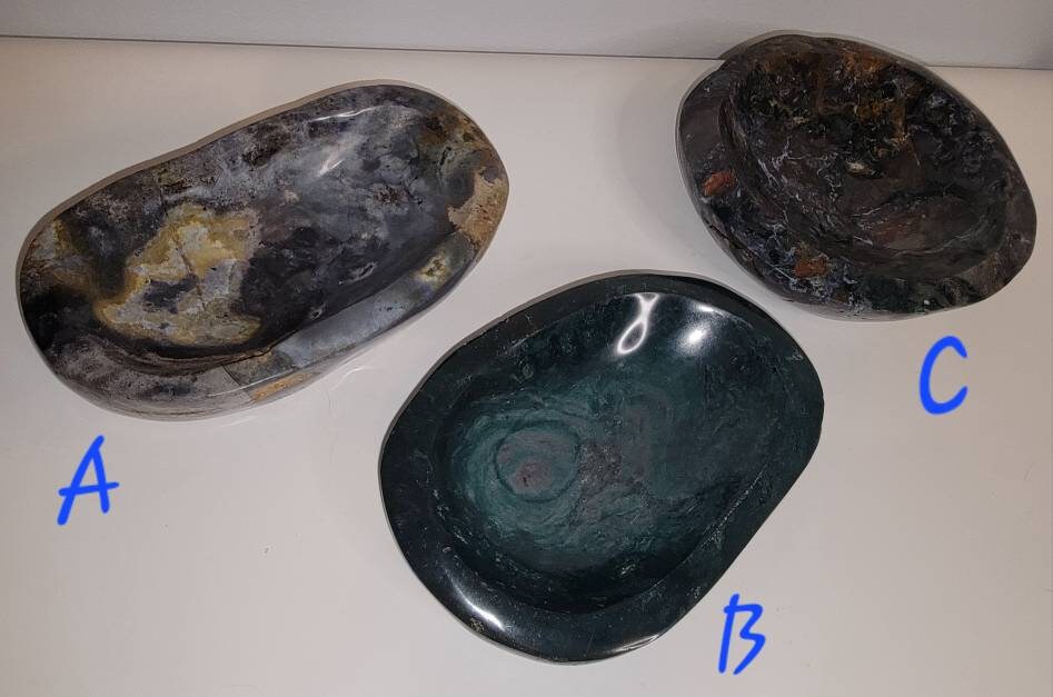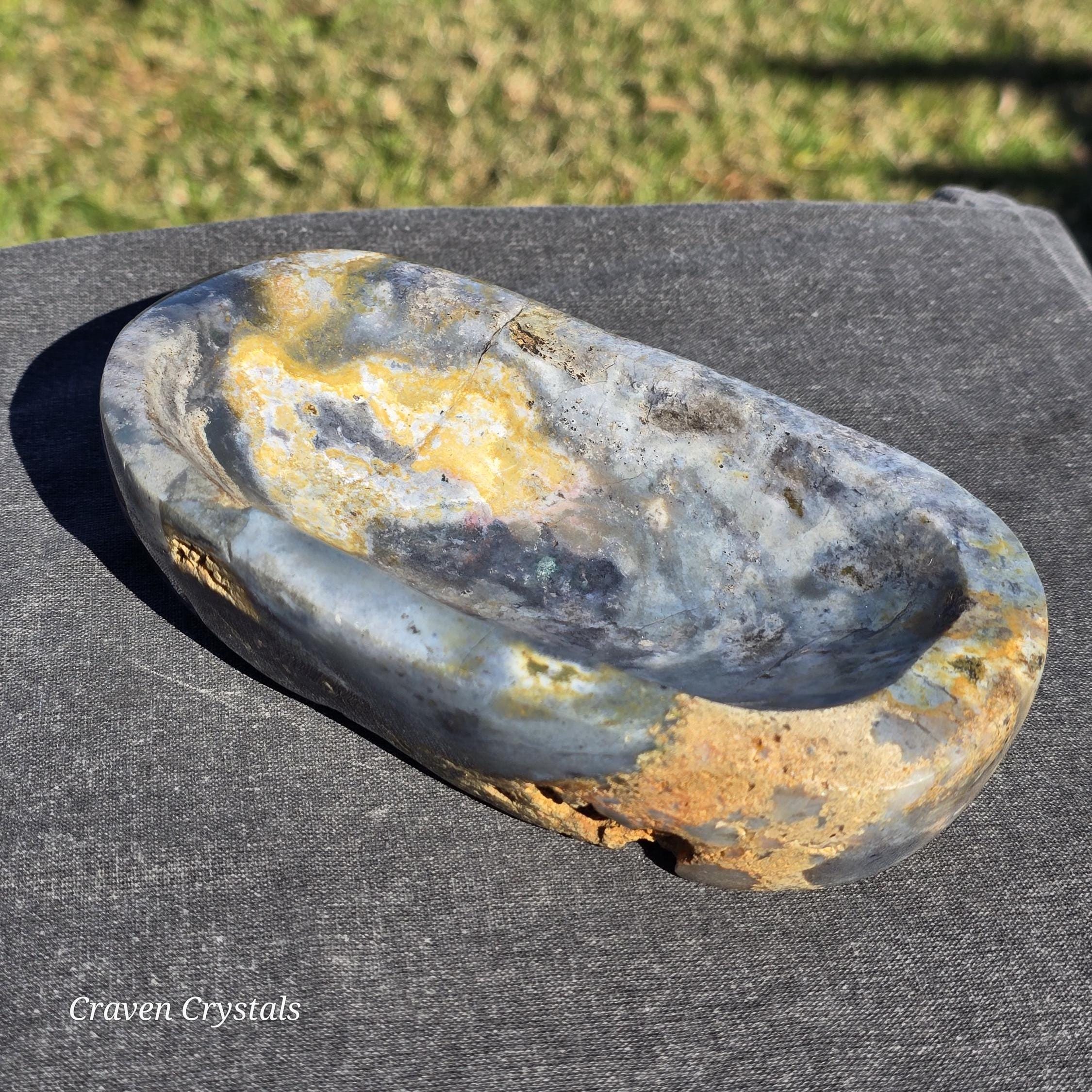 Beautiful gray/blue Ocean Jasper solid stone oval bowl with natural drusy. It's perfect to hold jewelry or just as a decorative piece