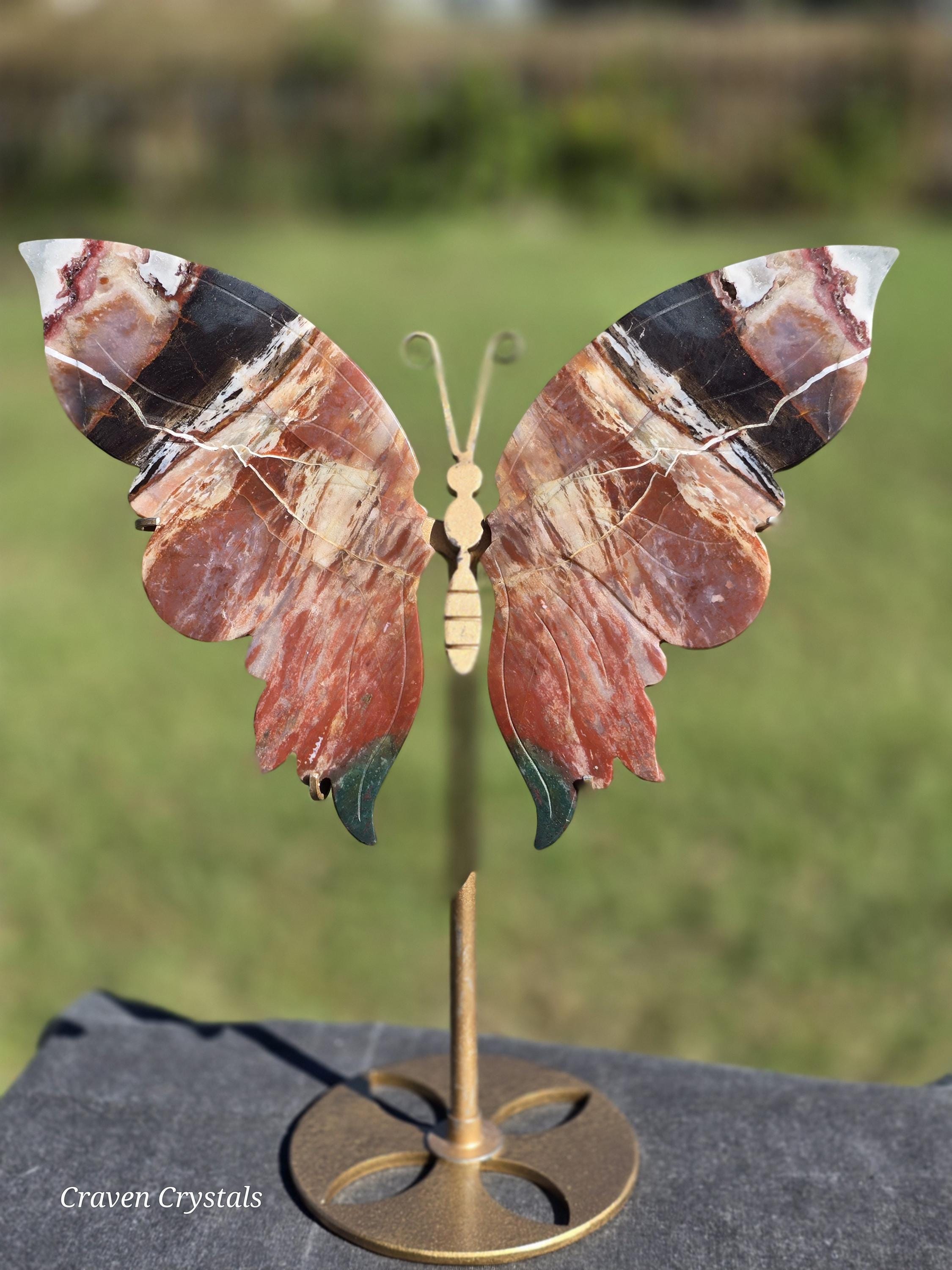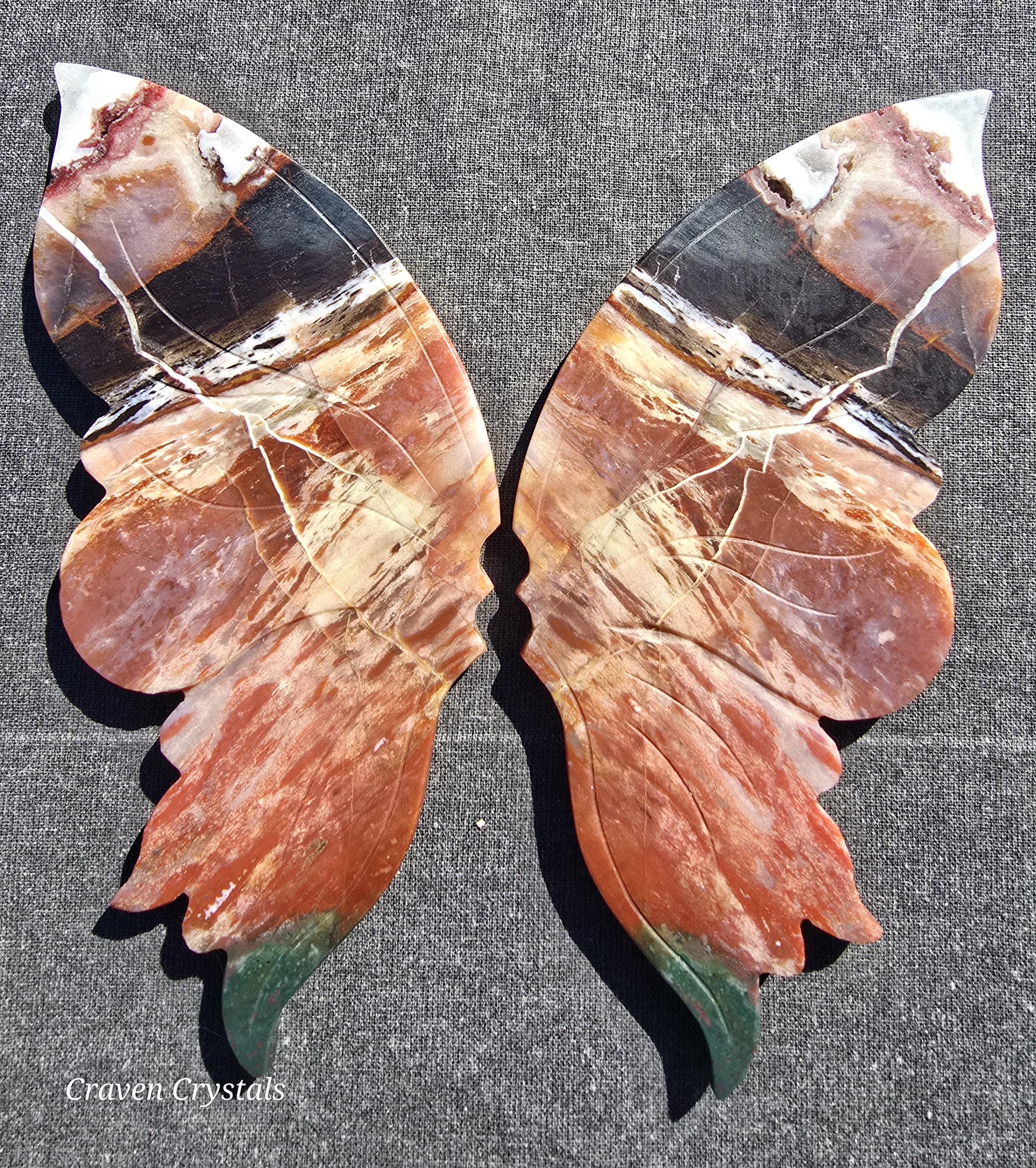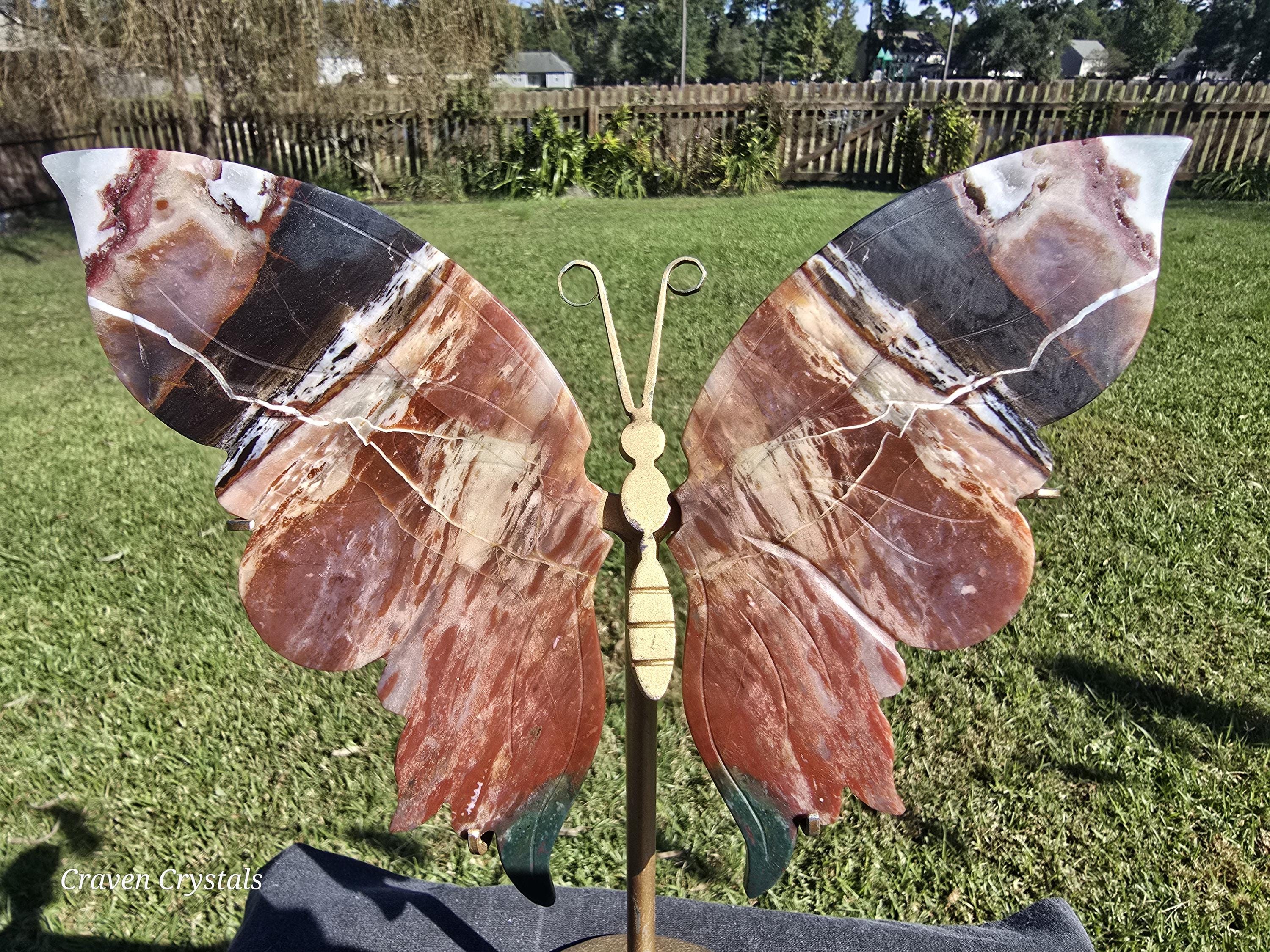 Gorgeous red and black Ocean Jasper Crystal Butterfly Wings with creamy white tips and red drusy quartz.