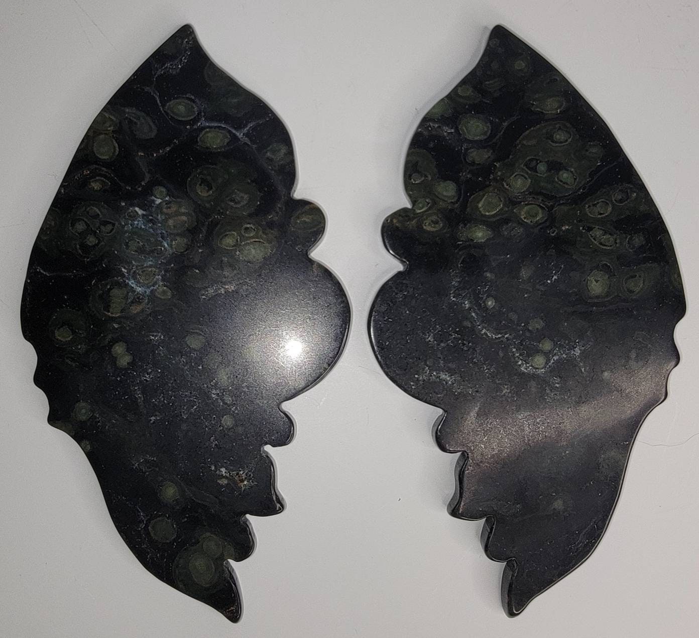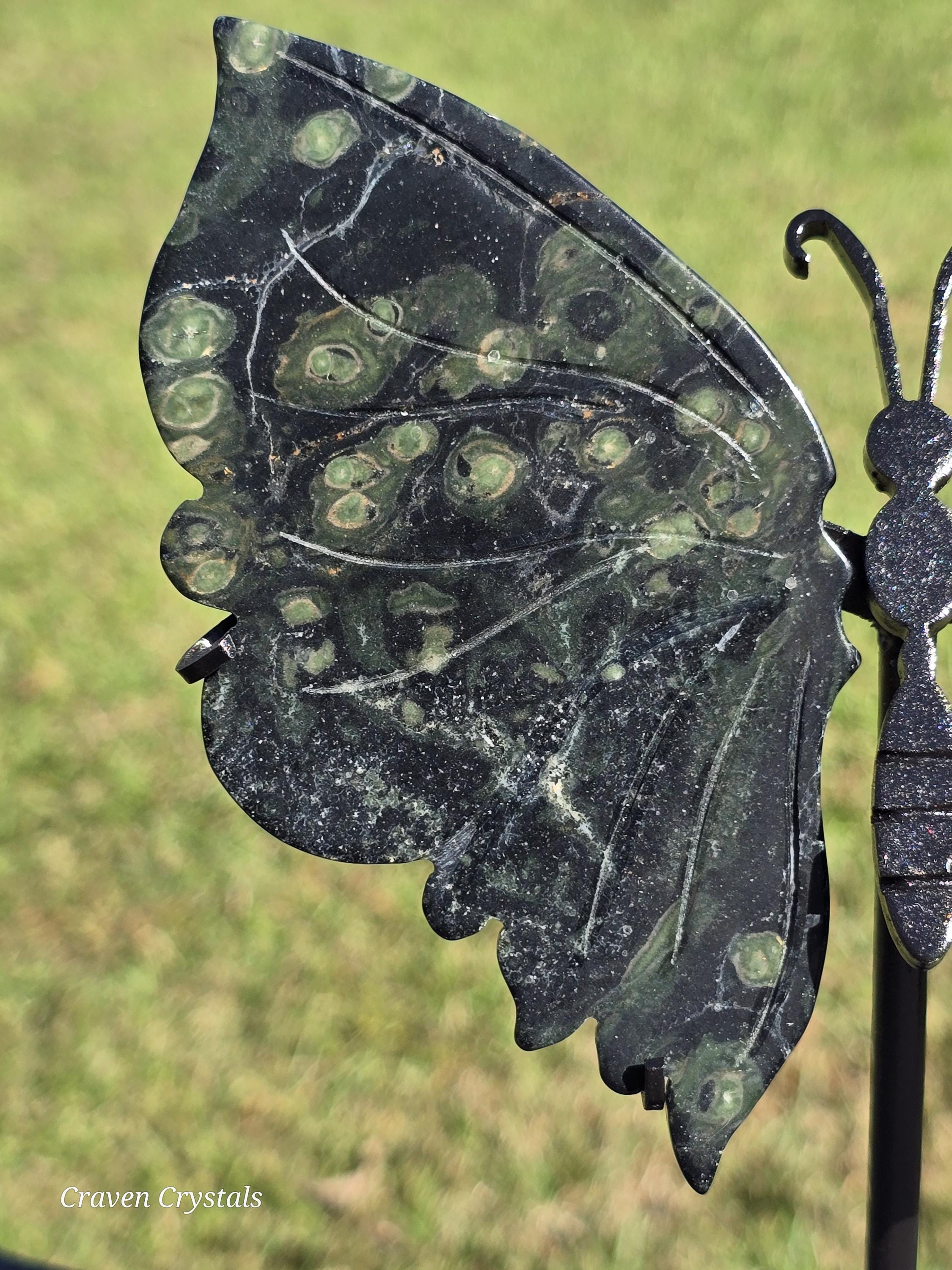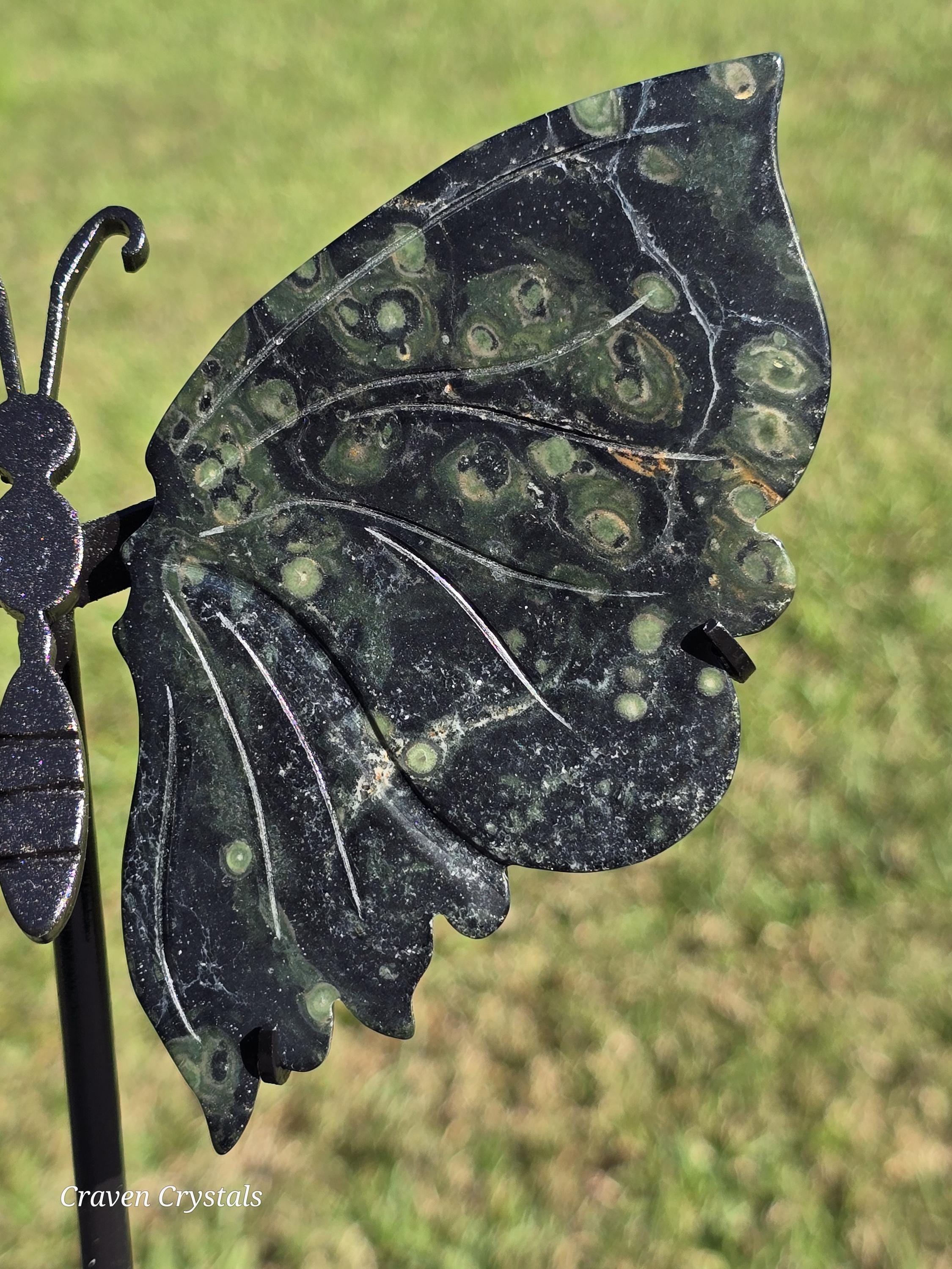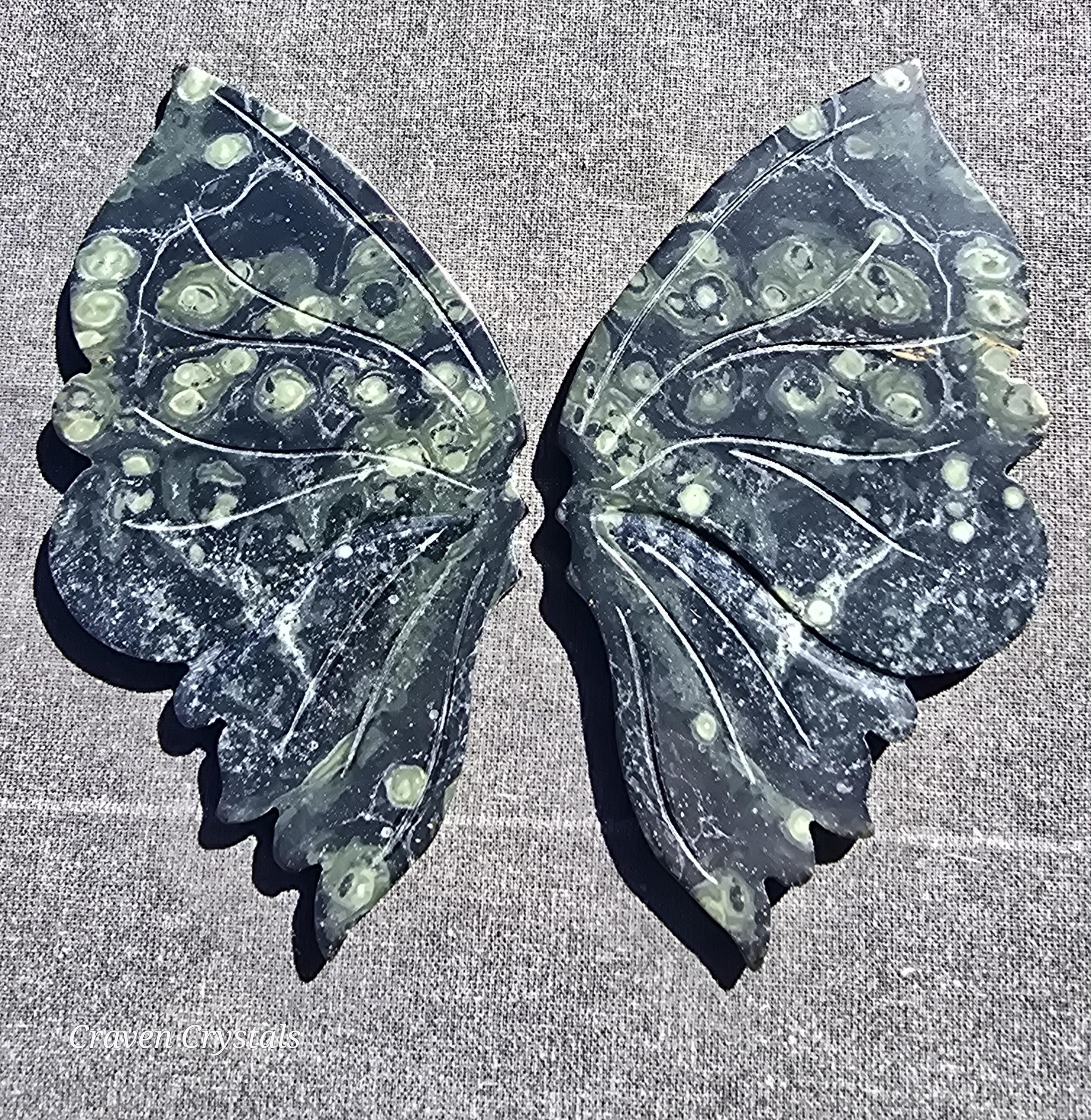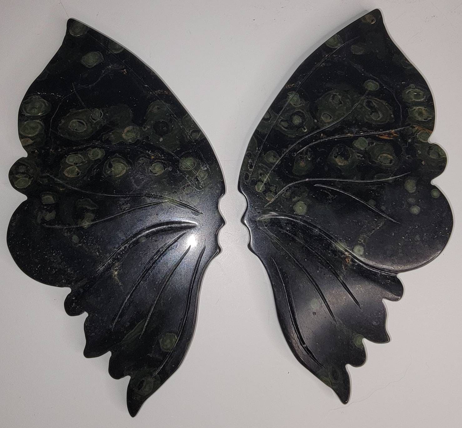 Stunning deep green Kambaba Jasper Crystal Butterfly Wings with lighter green spots