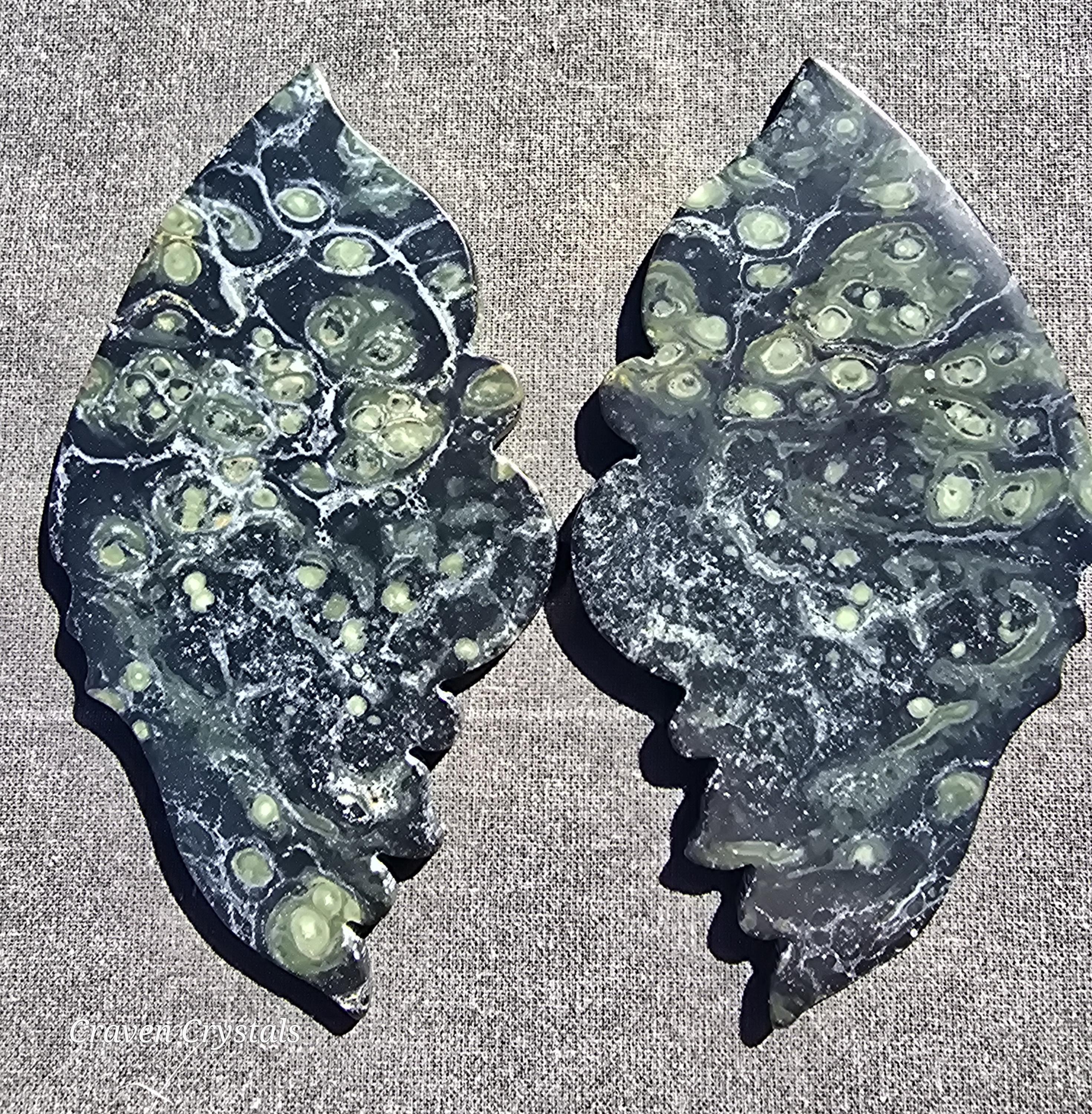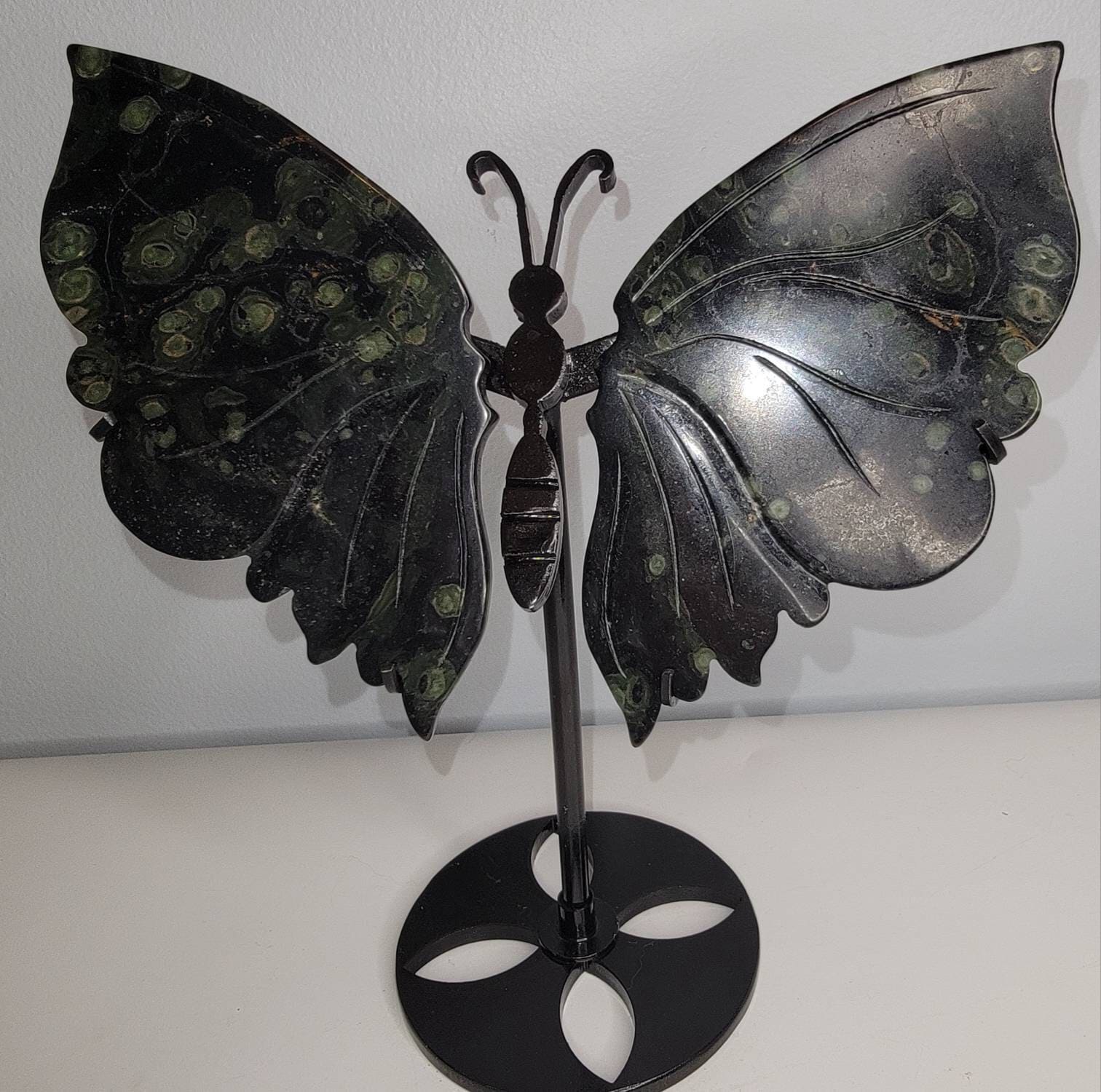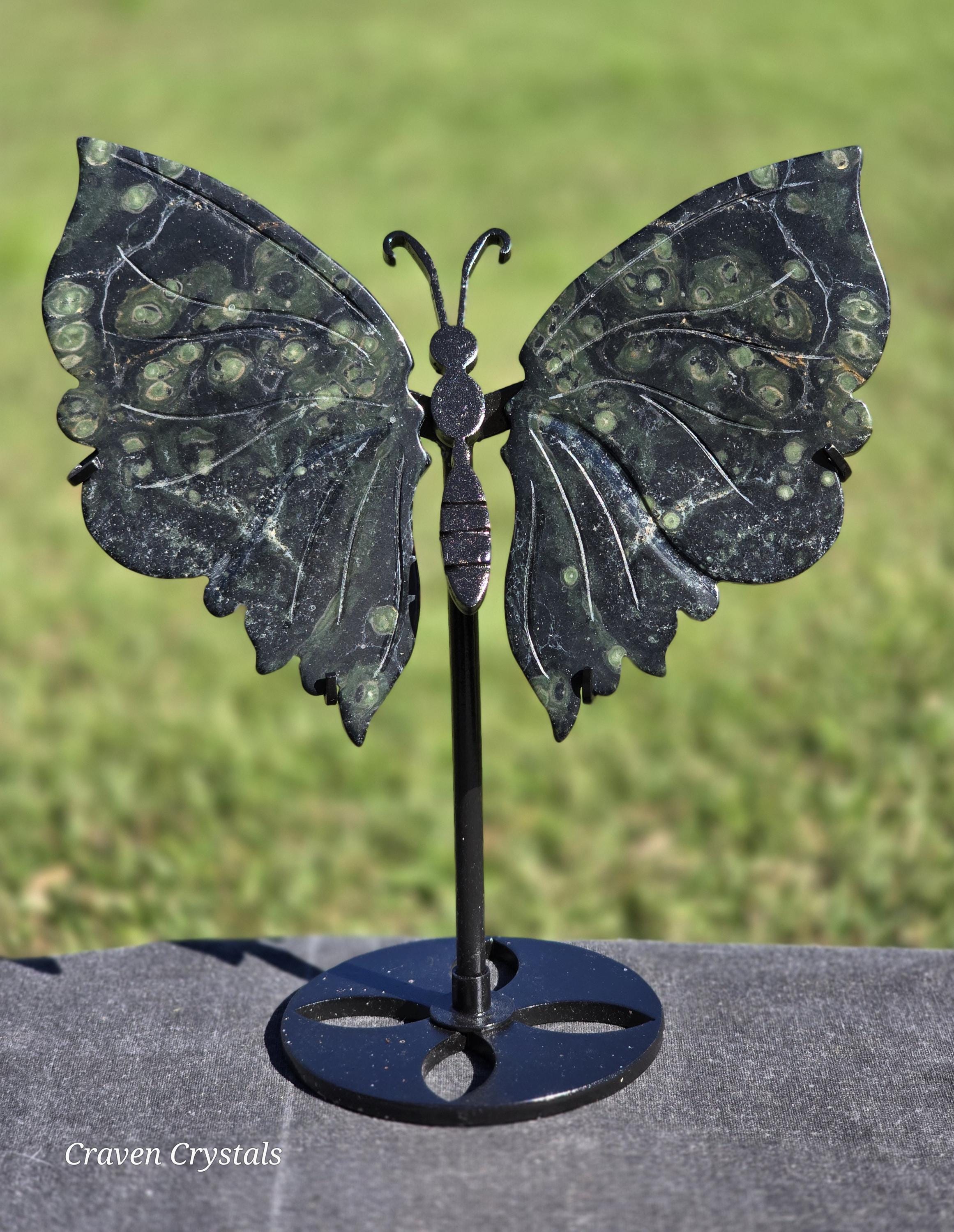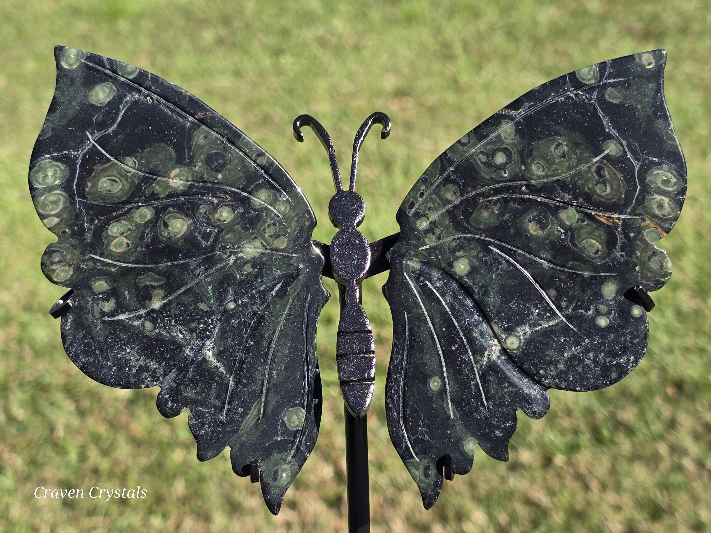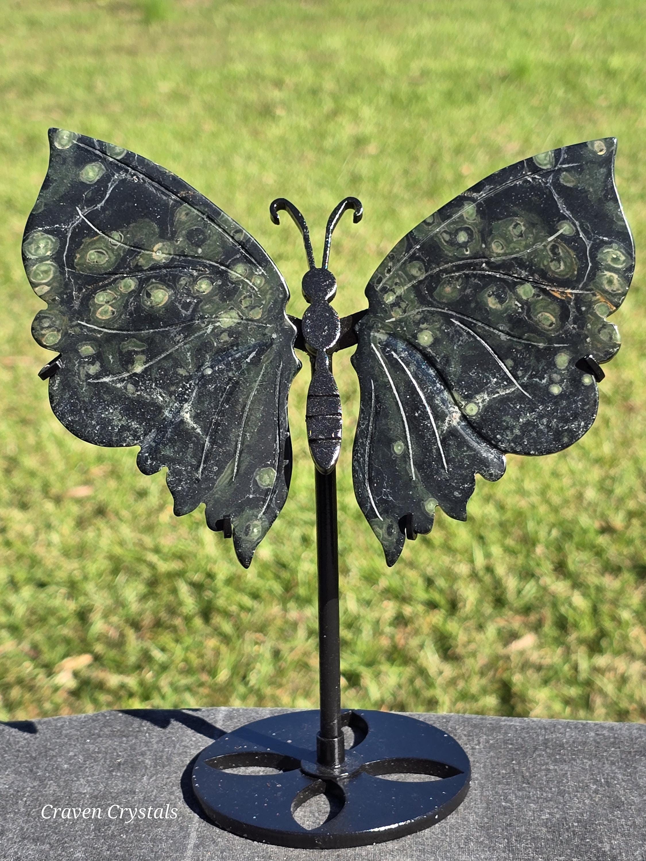 Stunning deep green Kambaba Jasper Crystal Butterfly Wings with lighter green spots