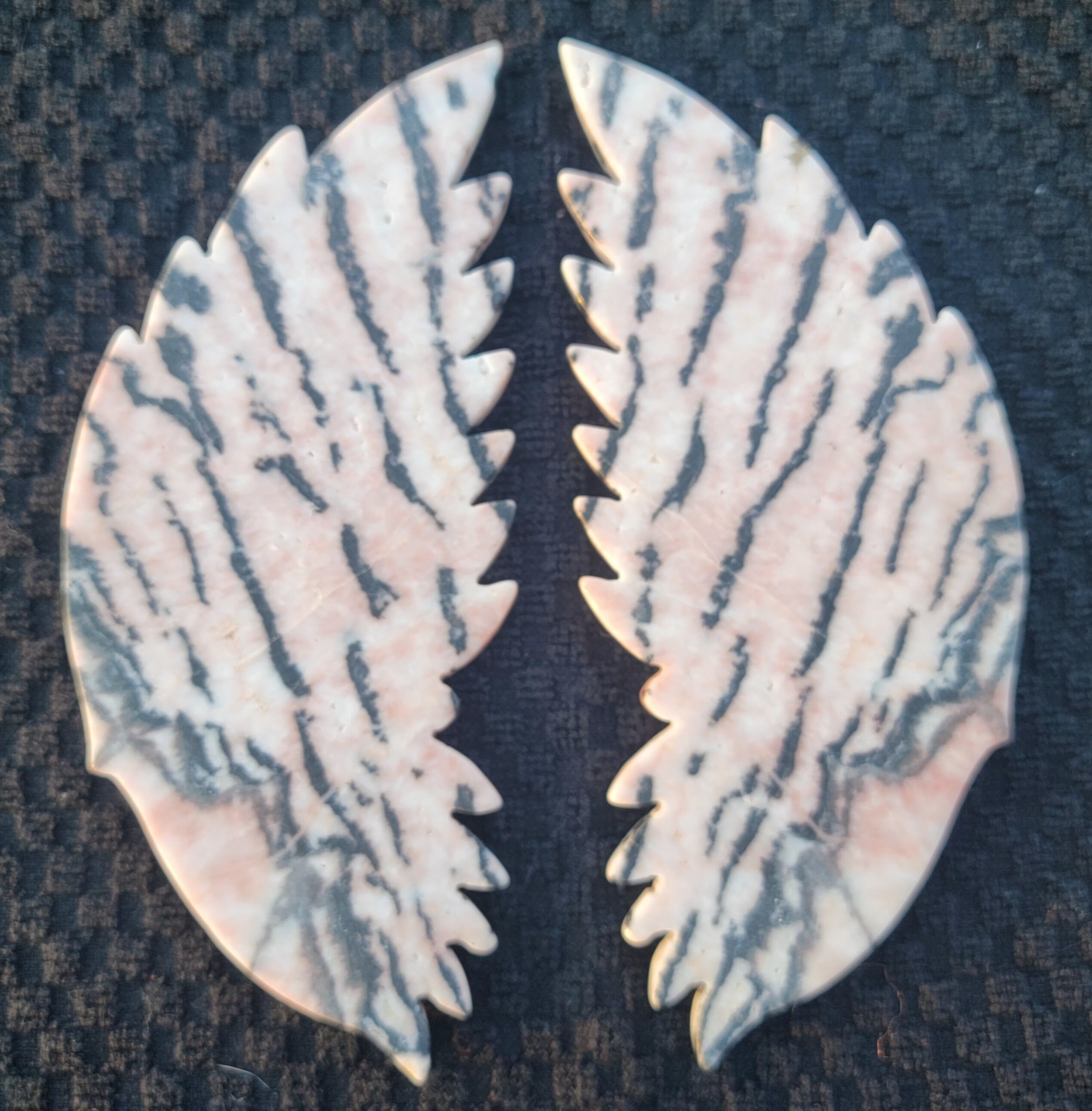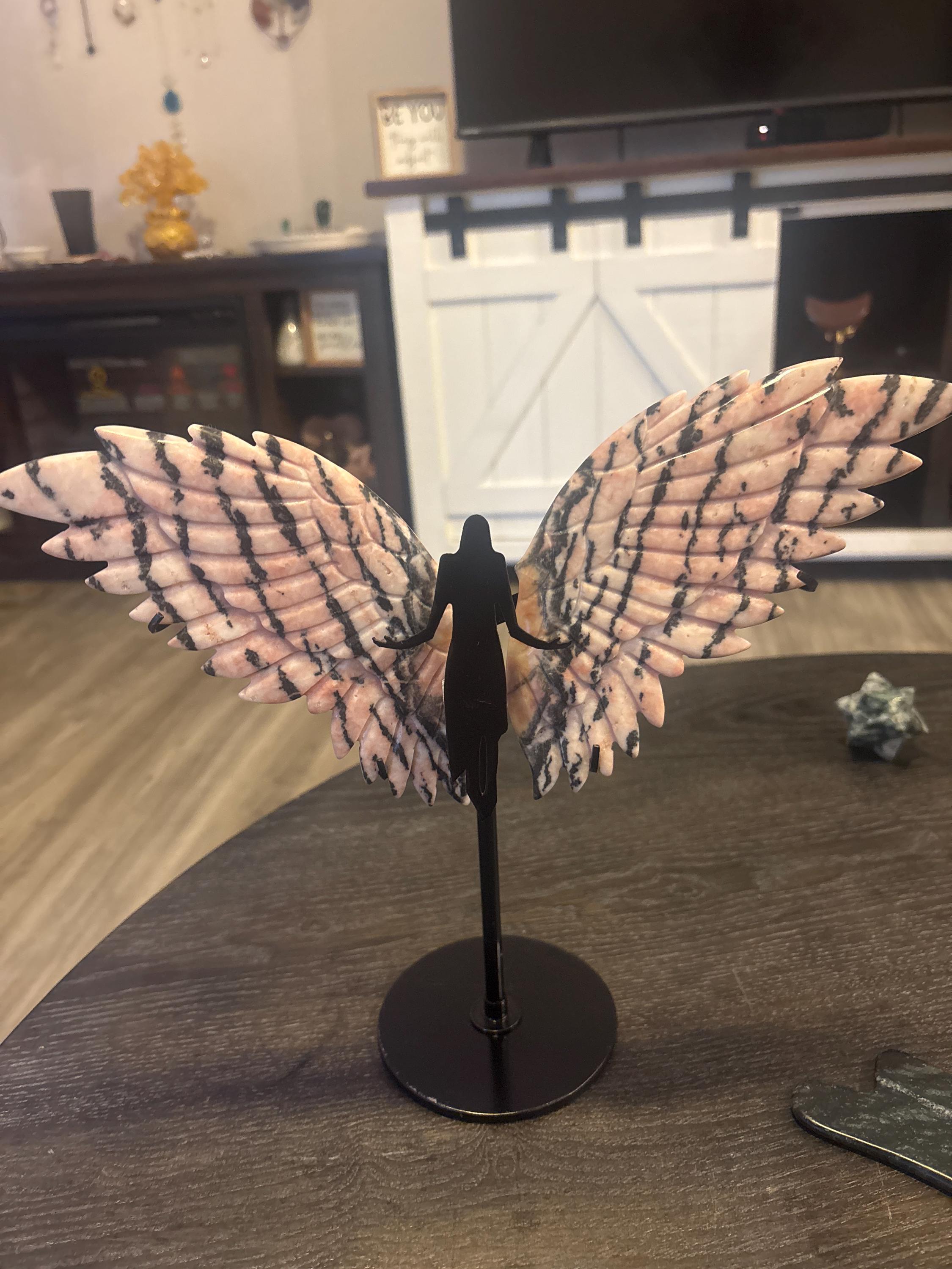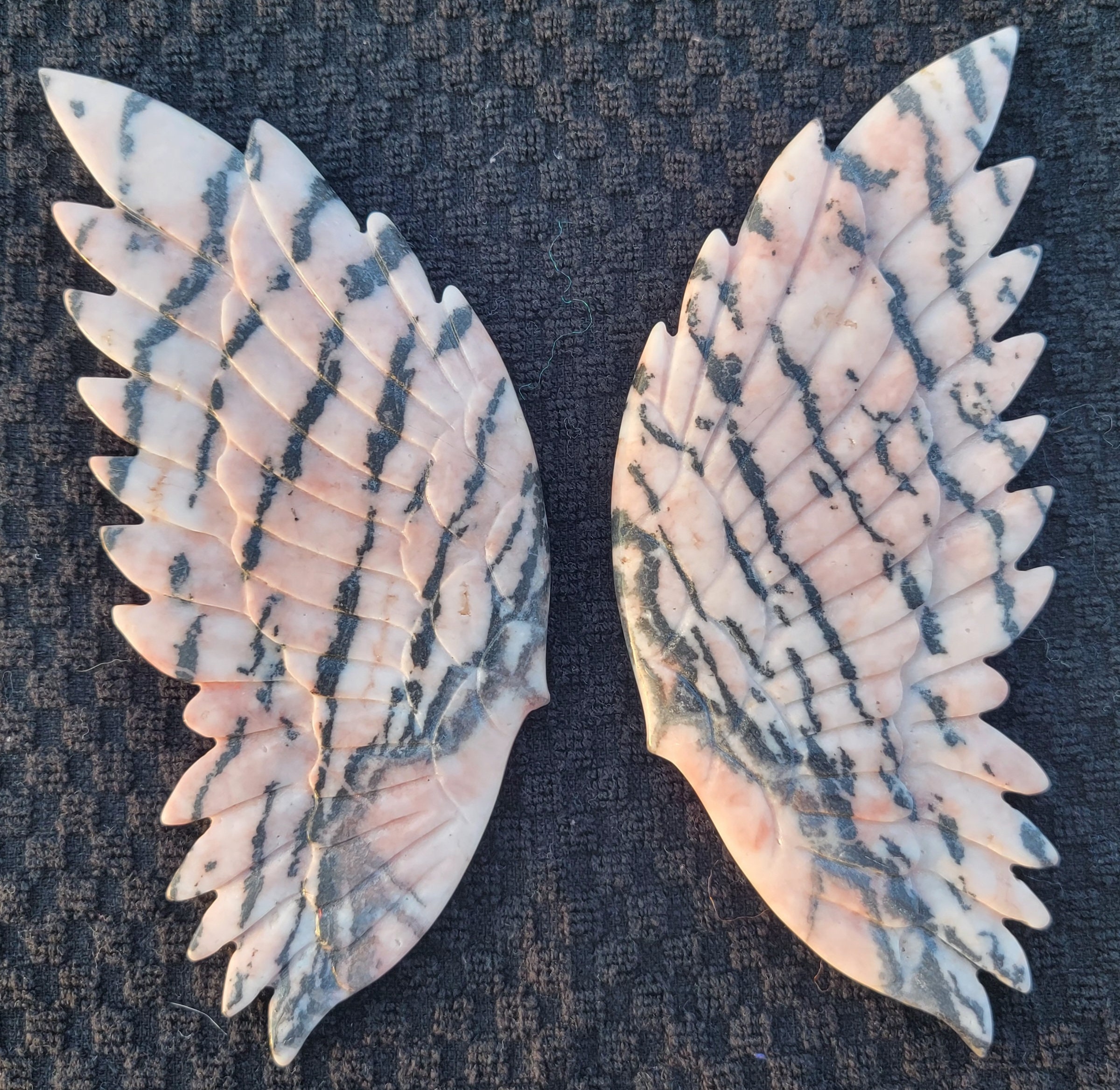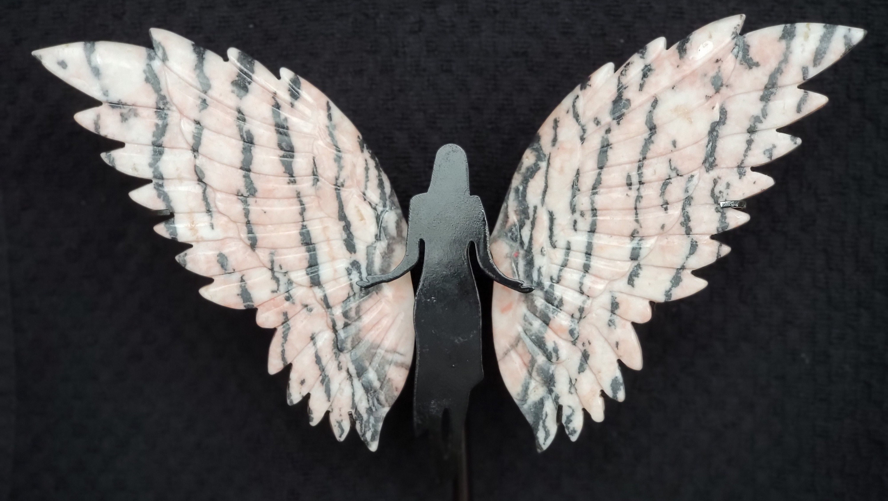 Delicate pink background Pink Zebra Jasper Crystal Angel / Fairy Double Feather Wings with stunning black zebra stripes. This pair has amazing detail with a double layer of feathers.