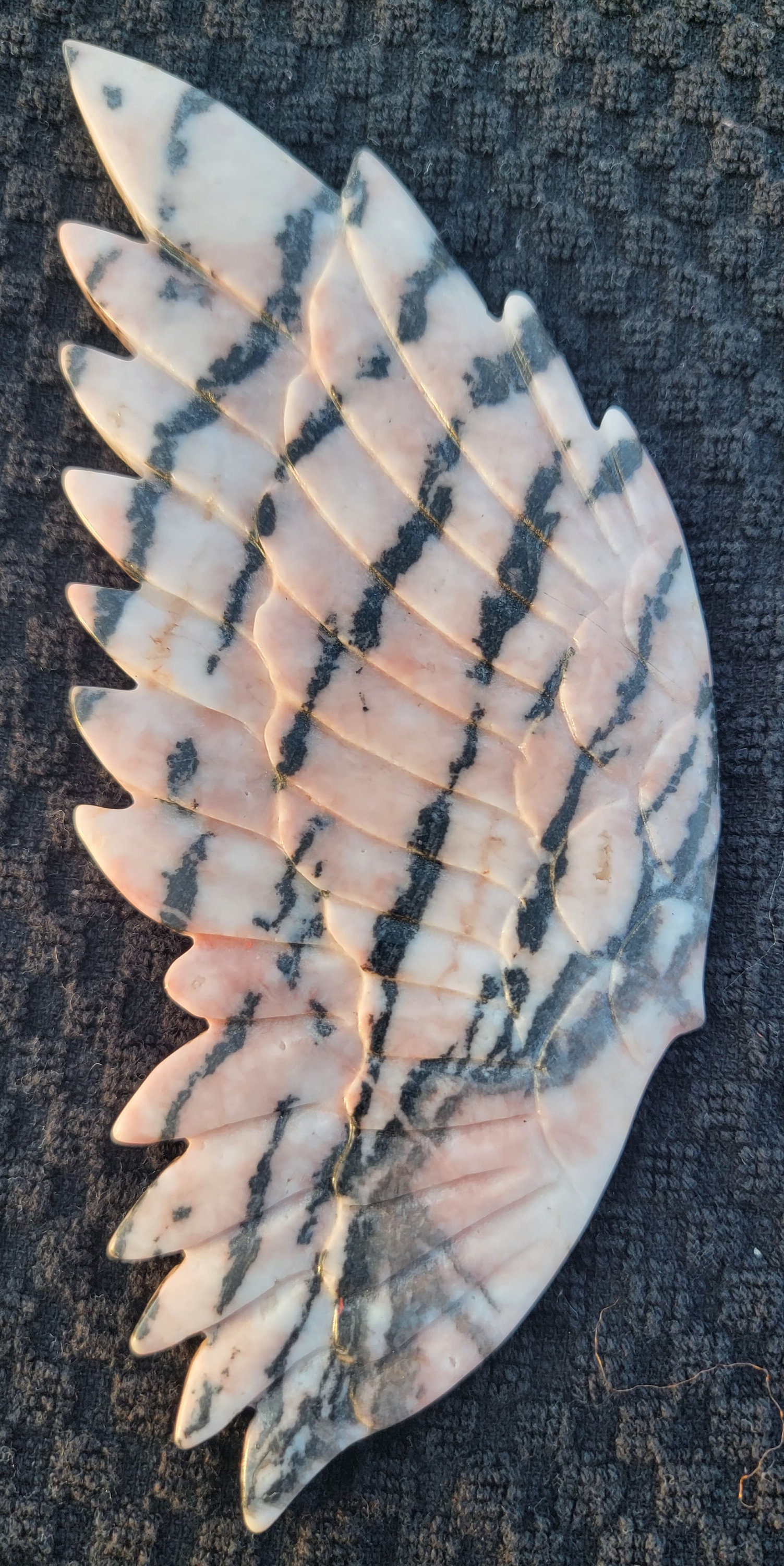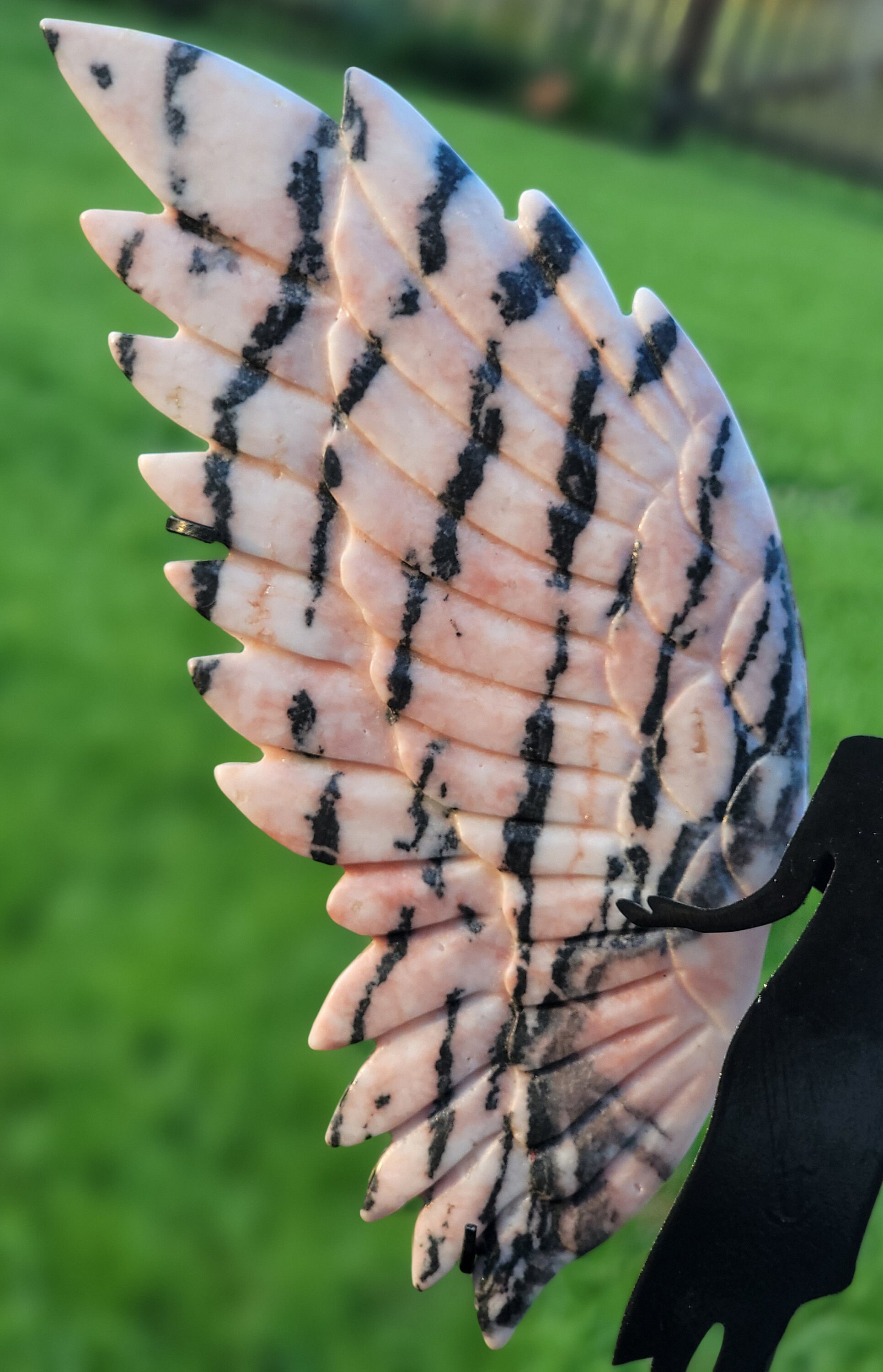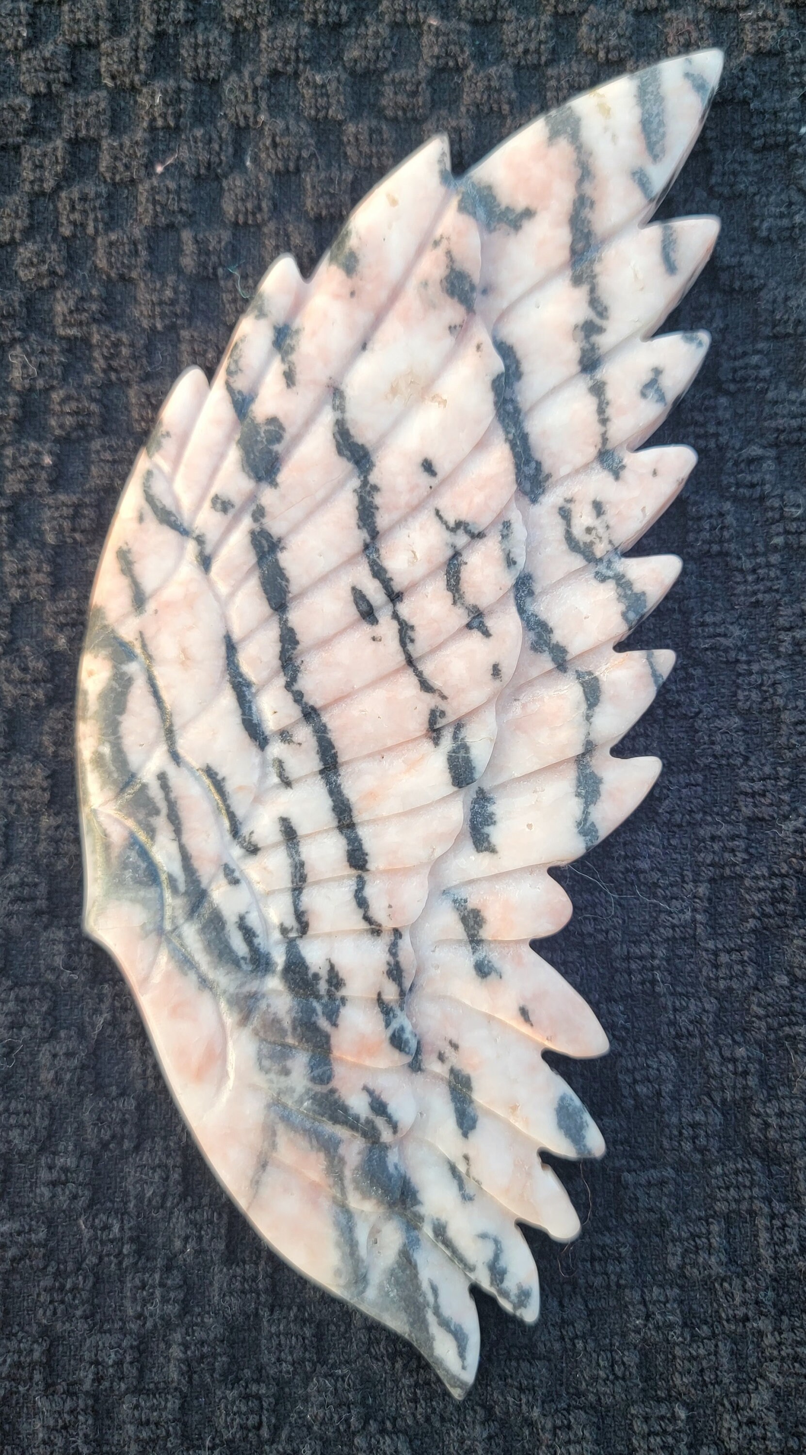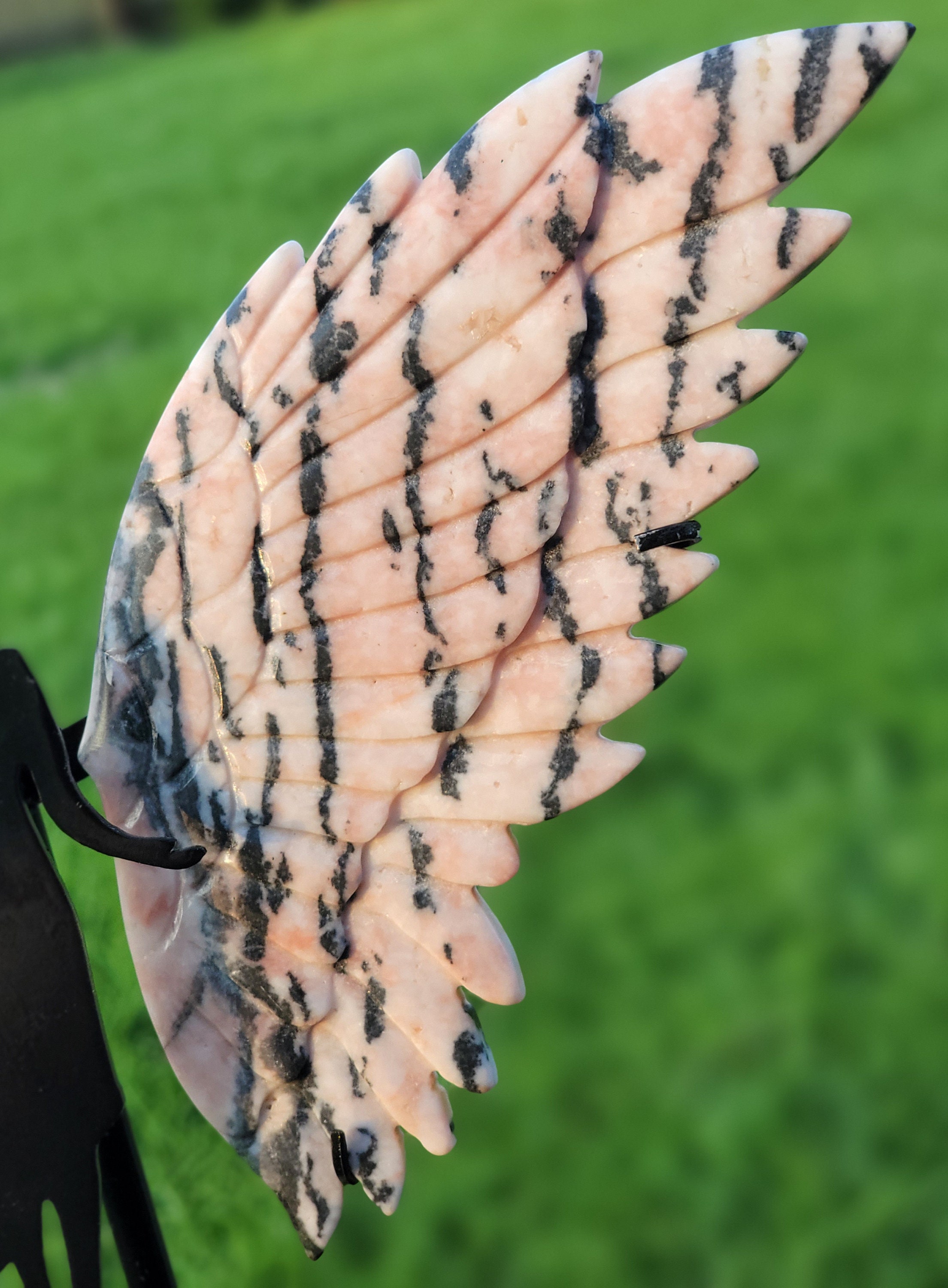 Delicate pink background Pink Zebra Jasper Crystal Angel / Fairy Double Feather Wings with stunning black zebra stripes. This pair has amazing detail with a double layer of feathers.