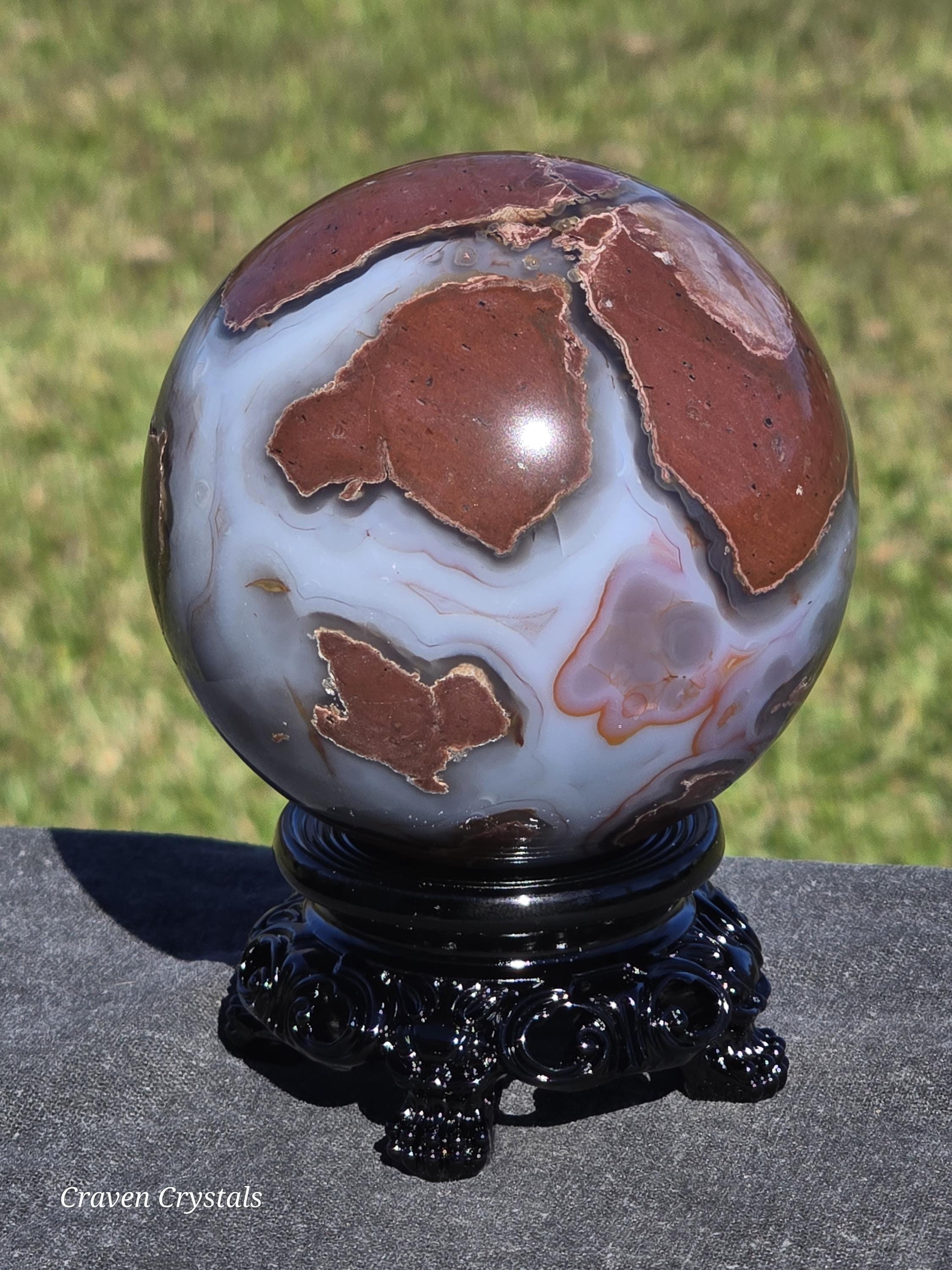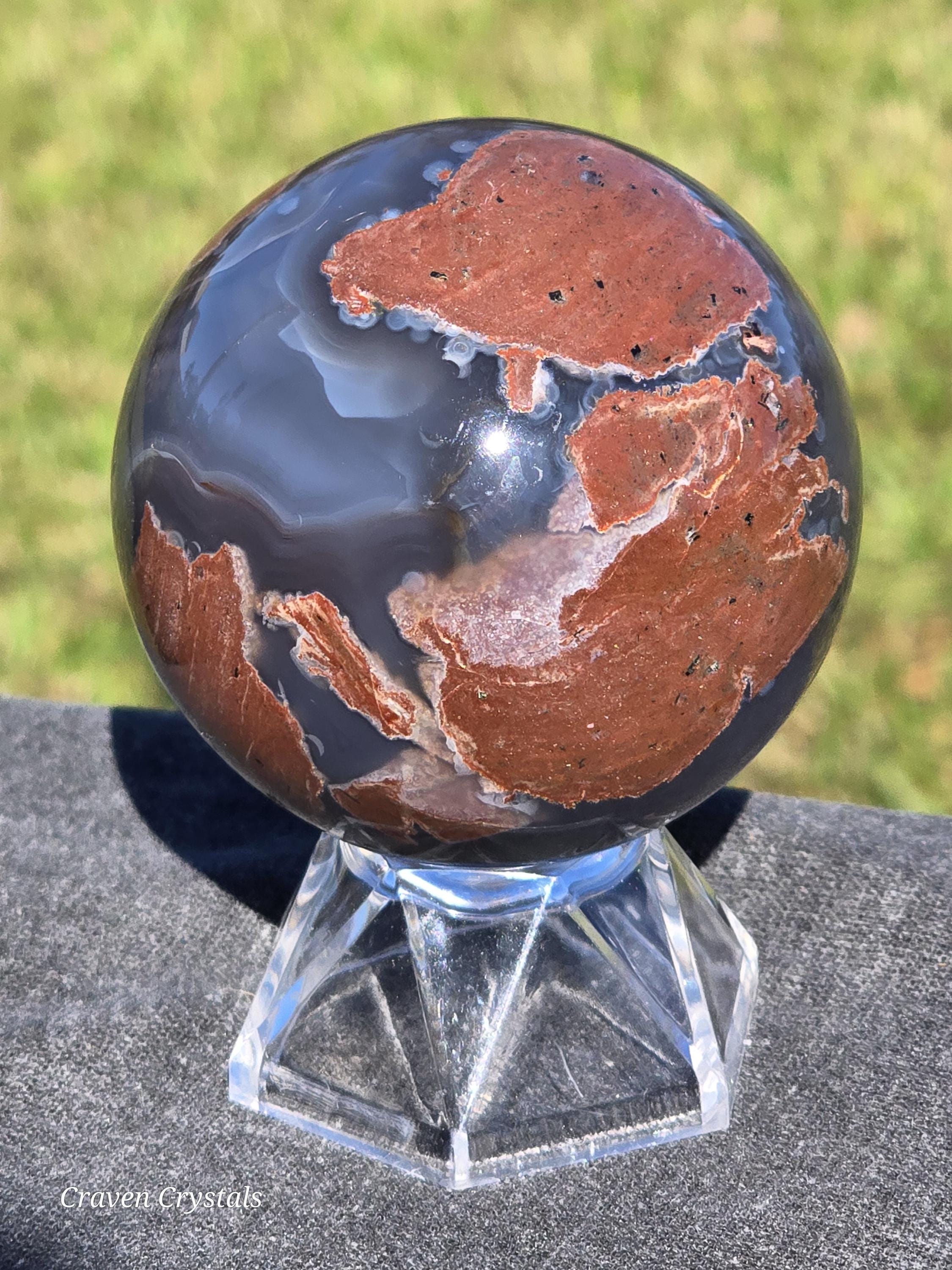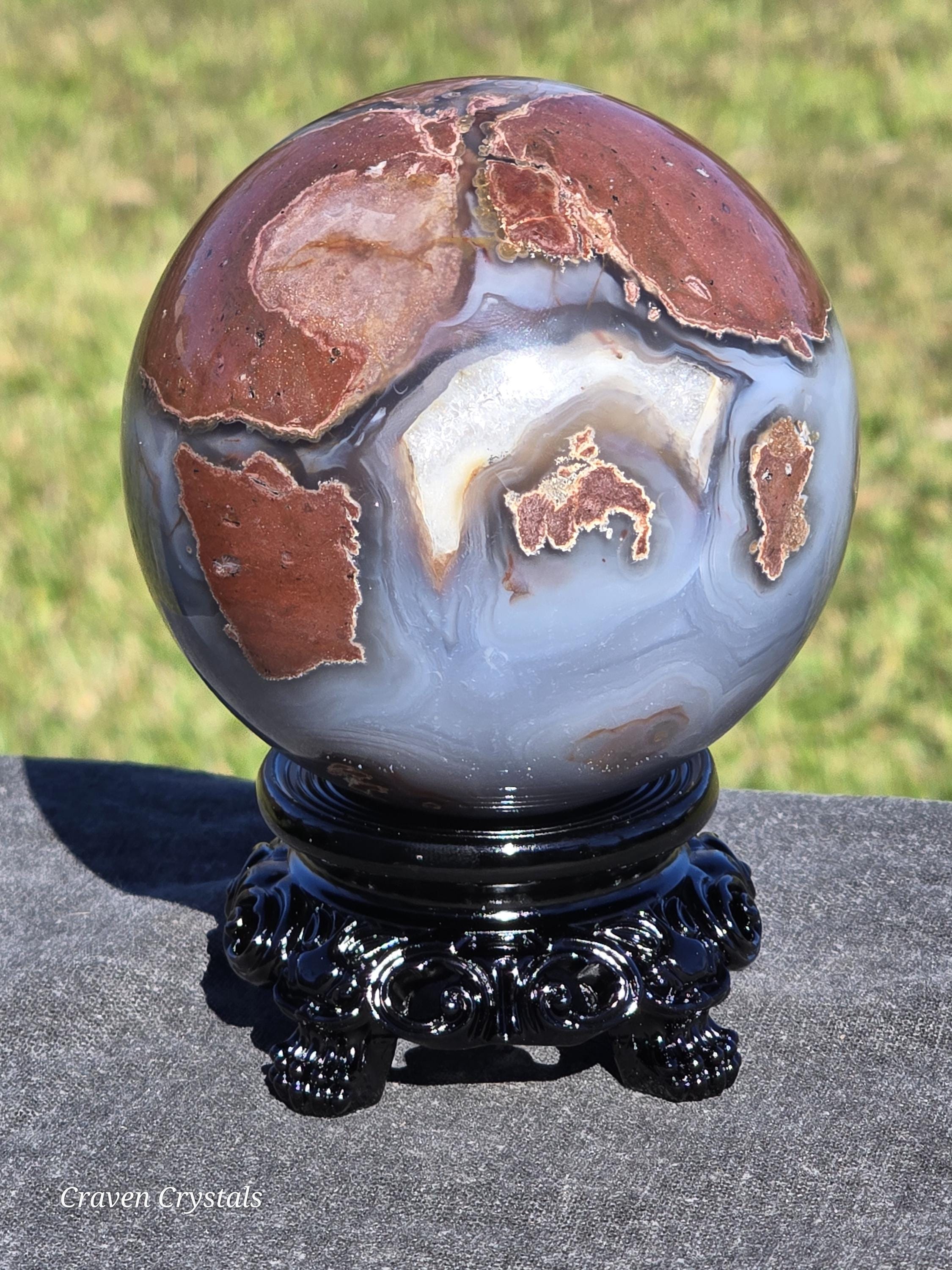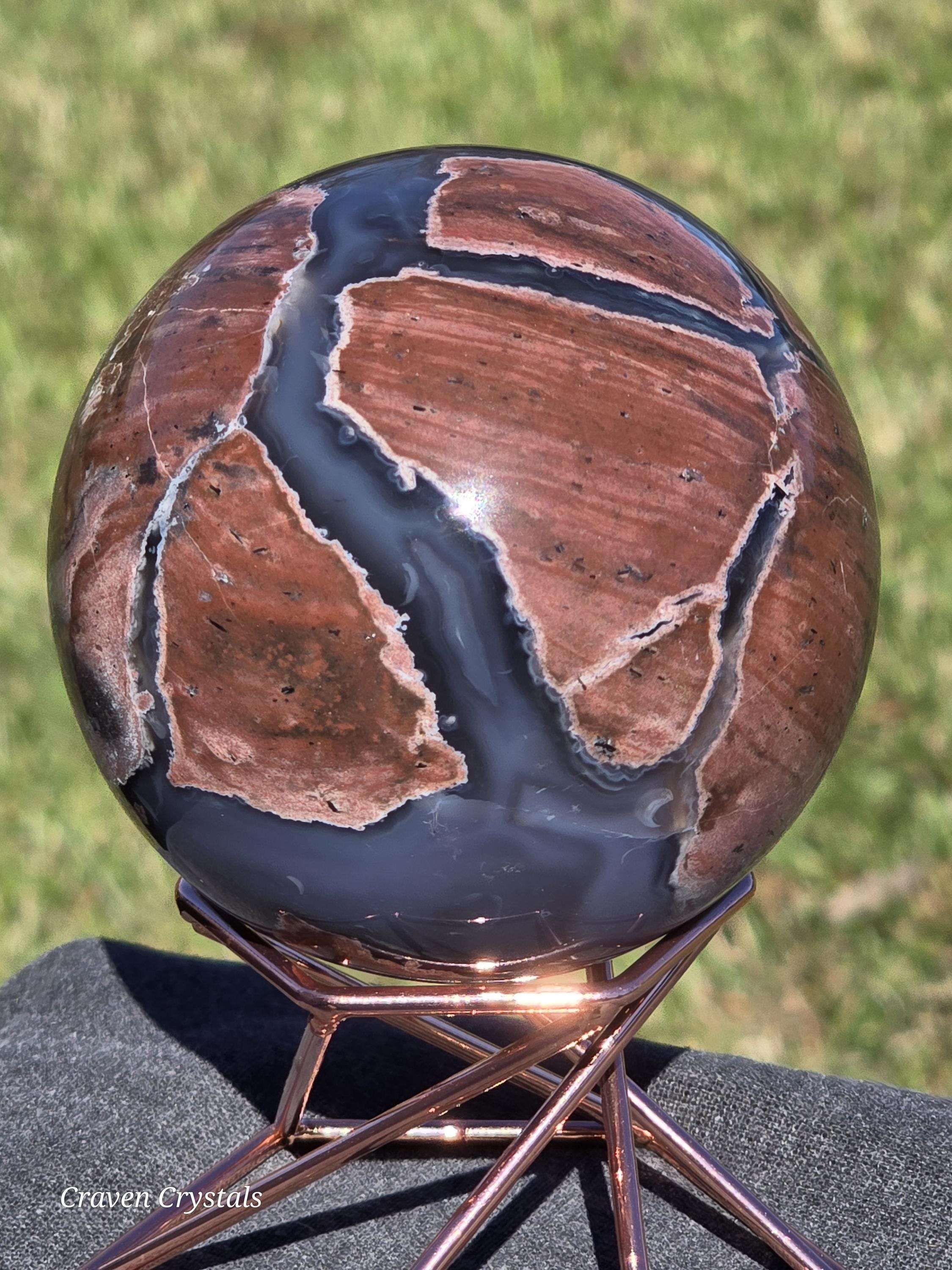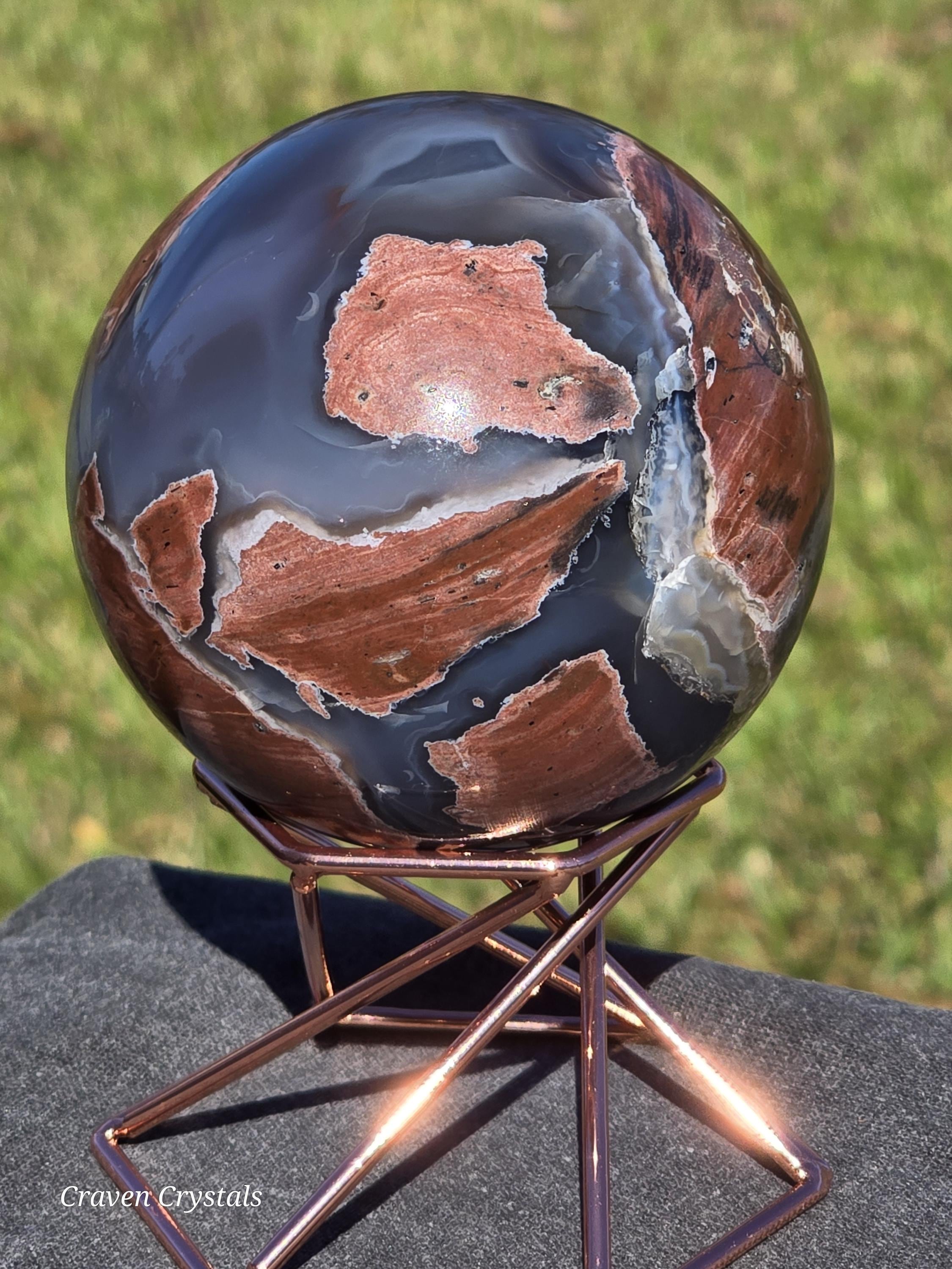 Red Fluorescent Volcano Agate Crystal Sphere, a type of chalcedony that has intricate patterns of different colors and shapes. It is also known as football agate or florescent agate.