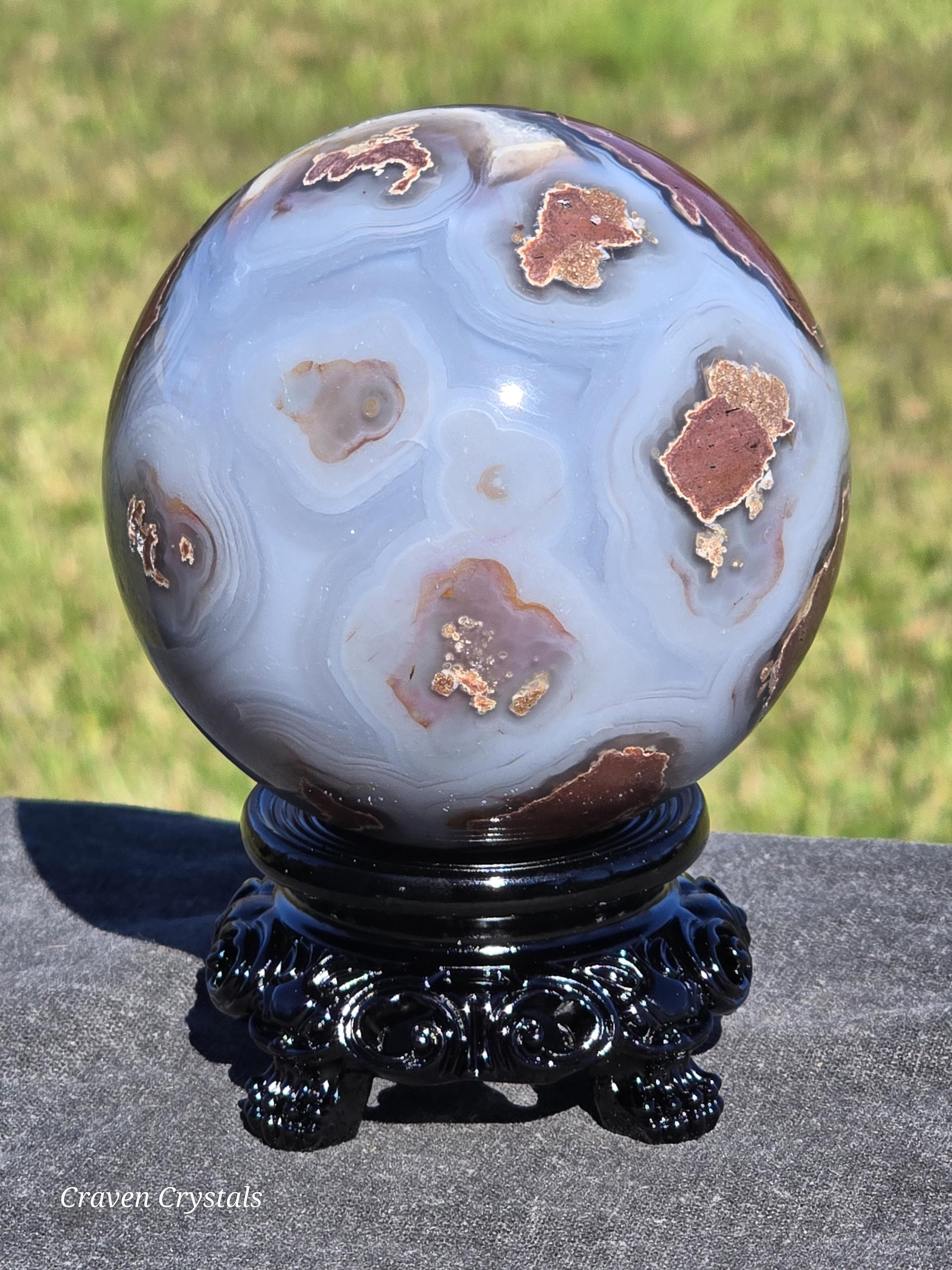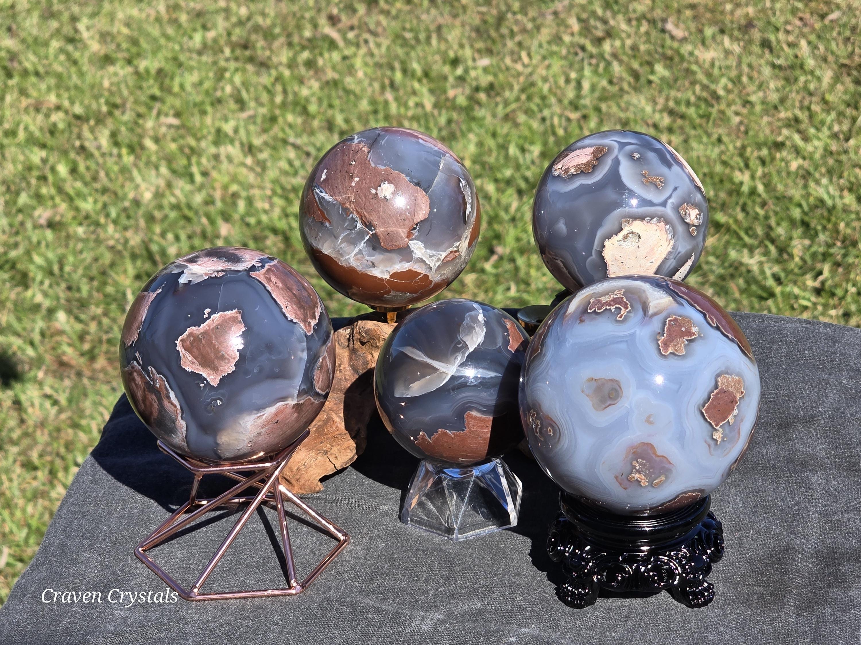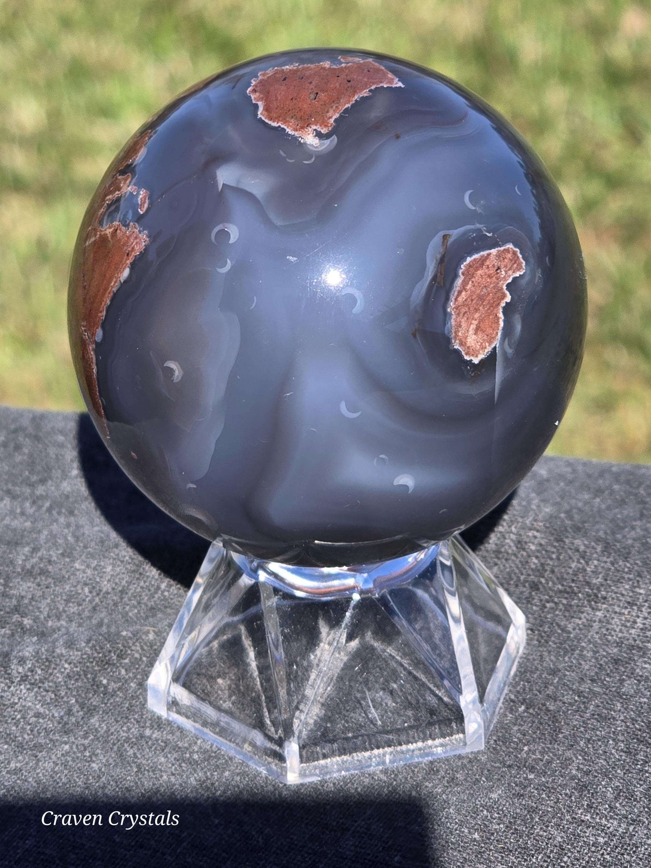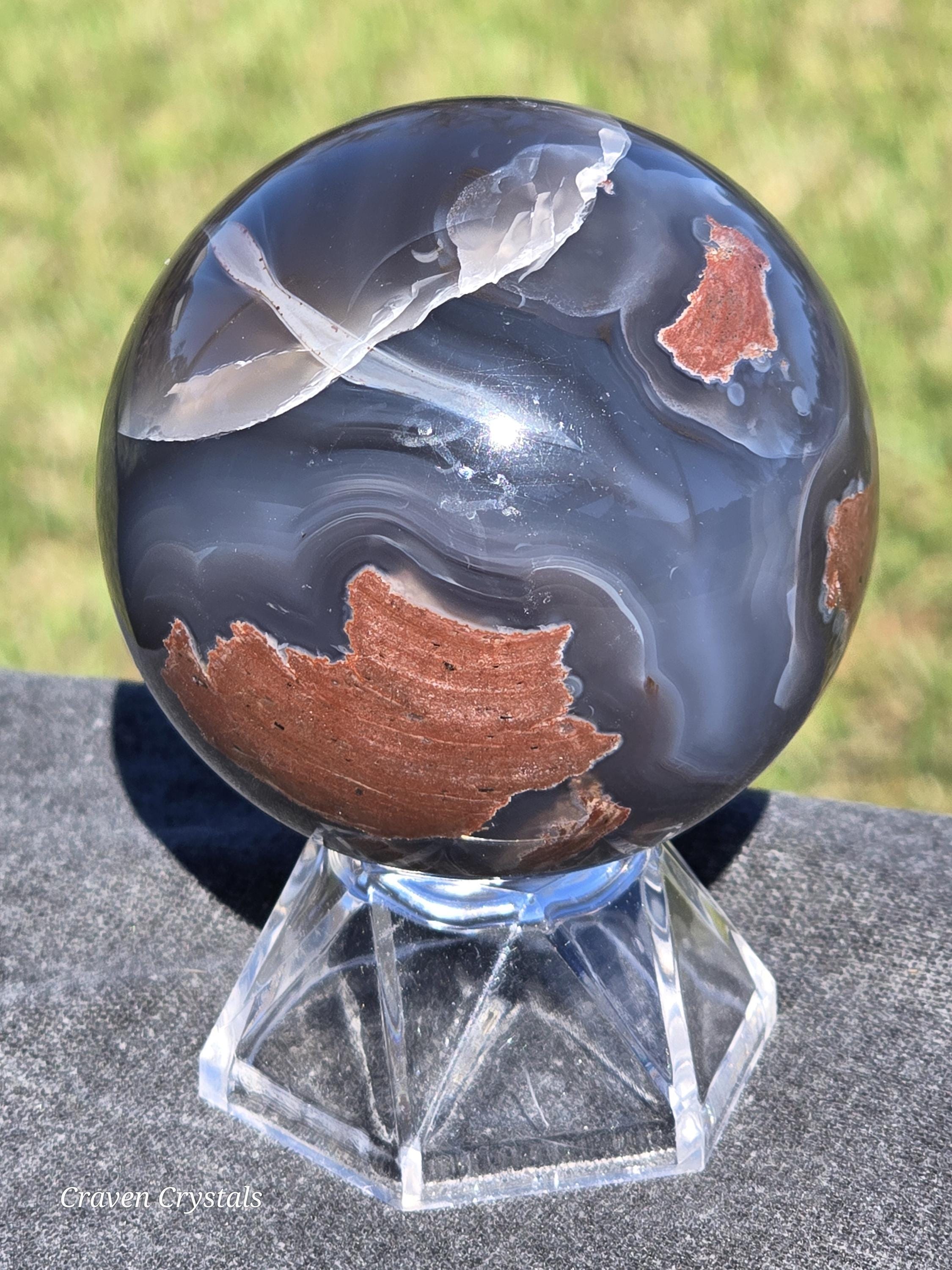 Red Fluorescent Volcano Agate Crystal Sphere, a type of chalcedony that has intricate patterns of different colors and shapes. It is also known as football agate or florescent agate.