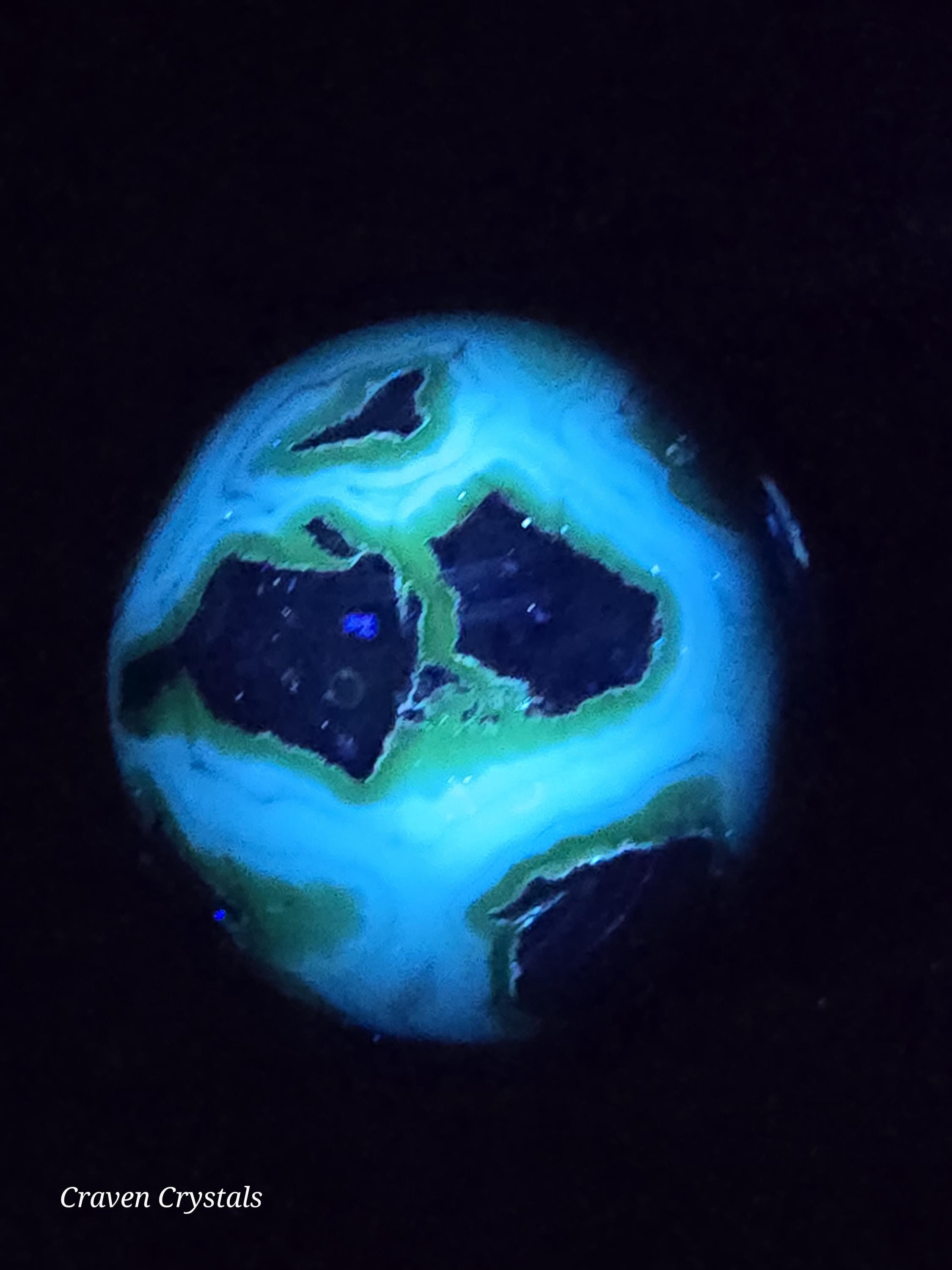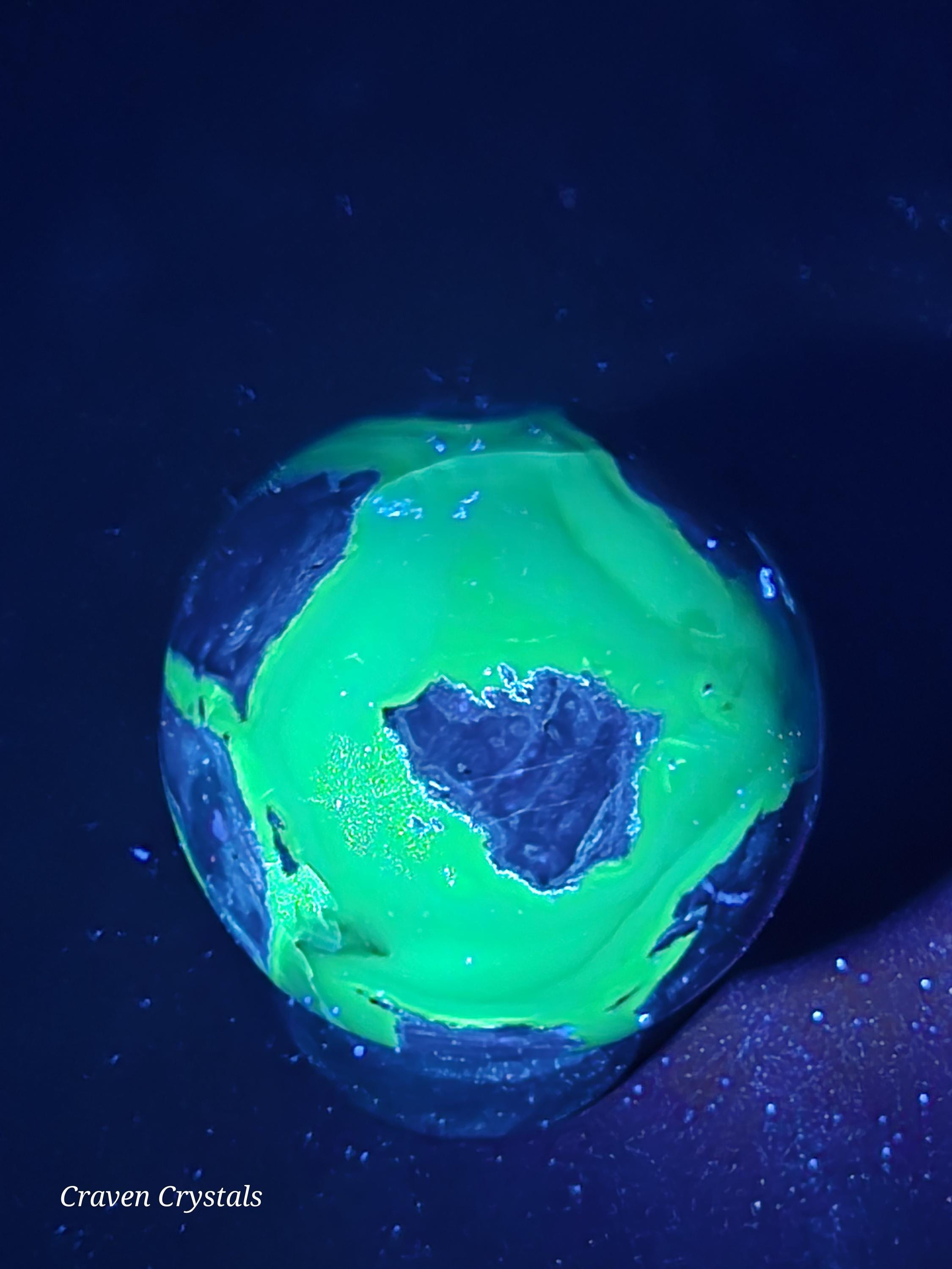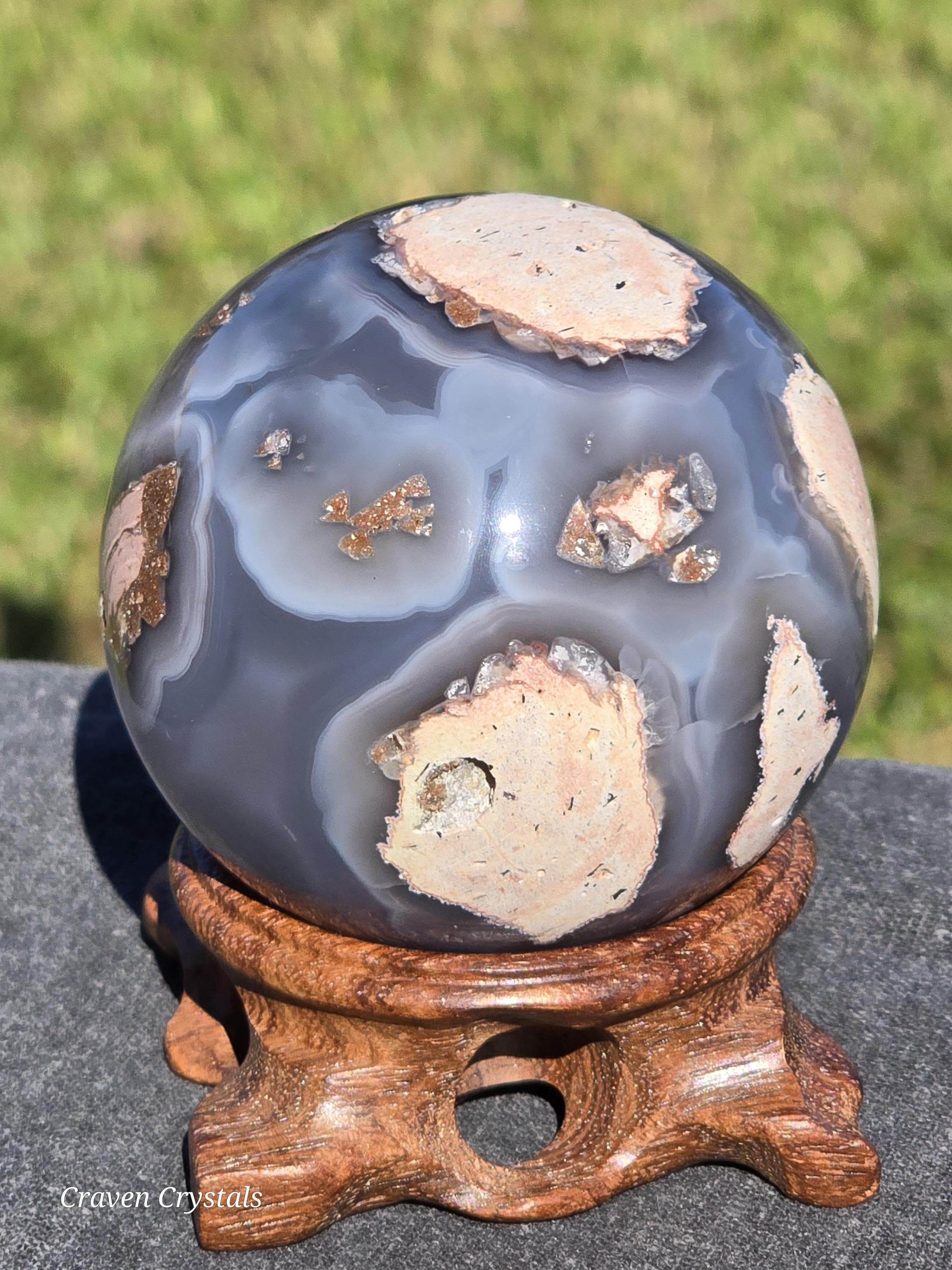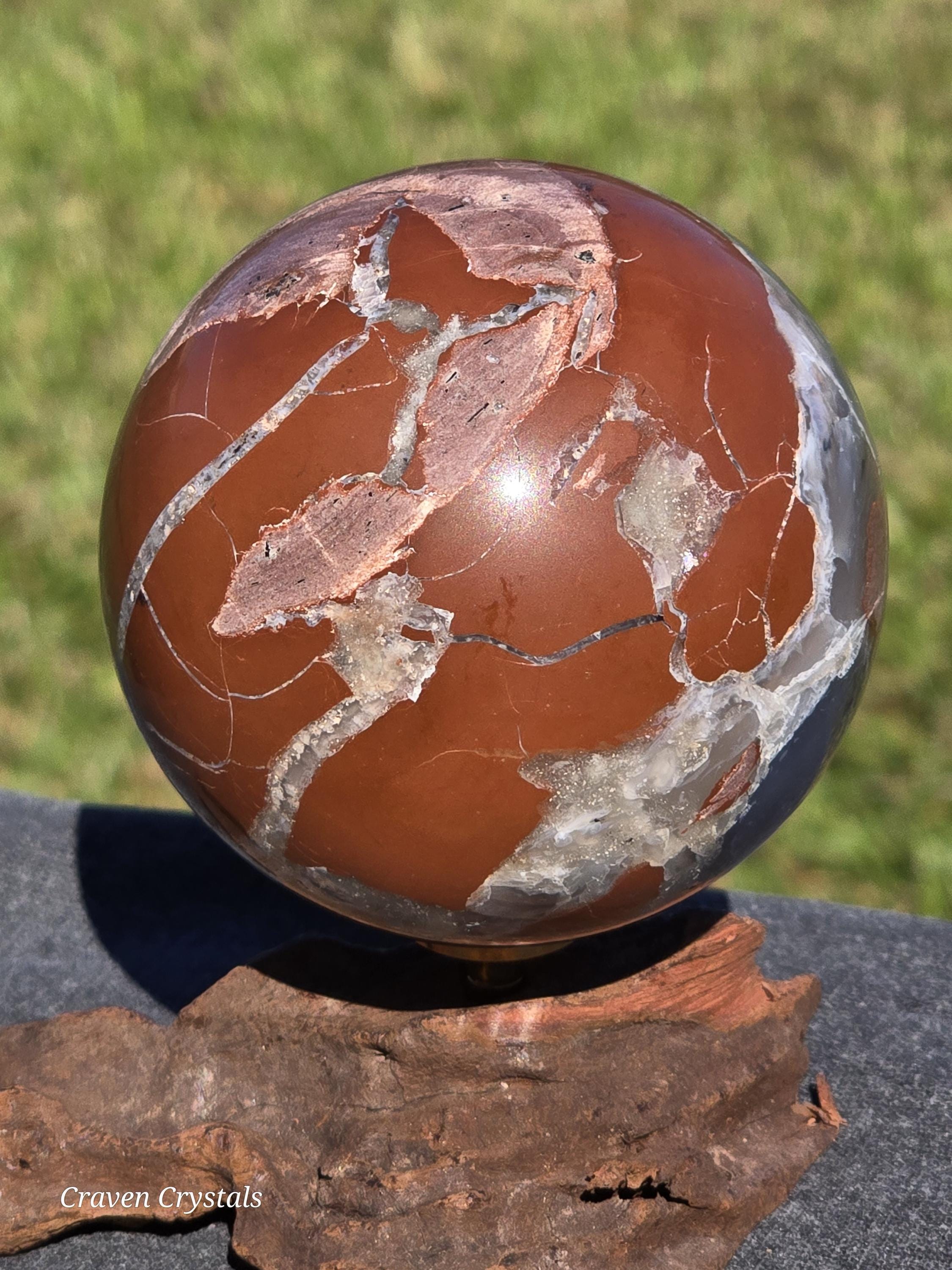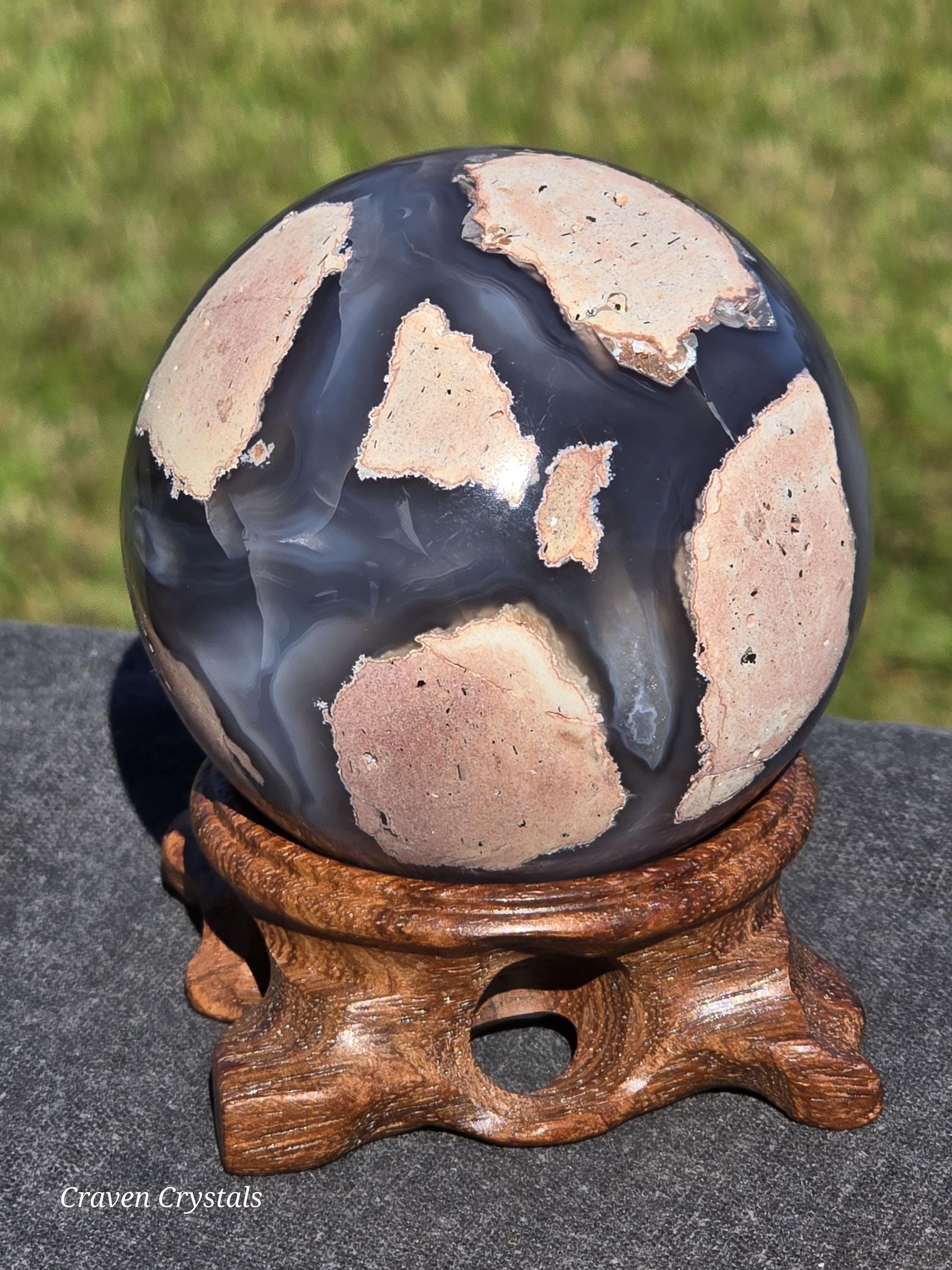 Red Fluorescent Volcano Agate Crystal Sphere, a type of chalcedony that has intricate patterns of different colors and shapes. It is also known as football agate or florescent agate.