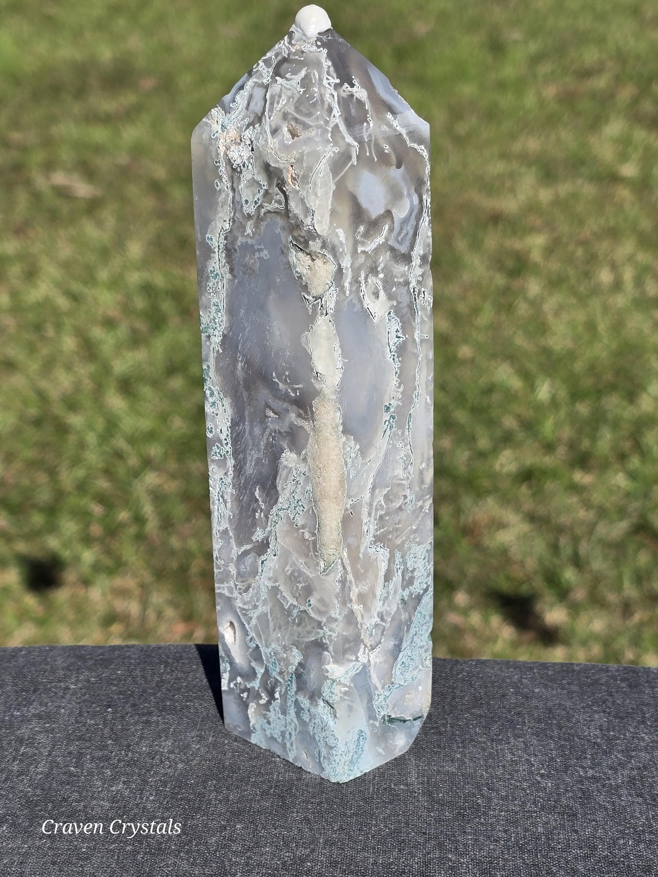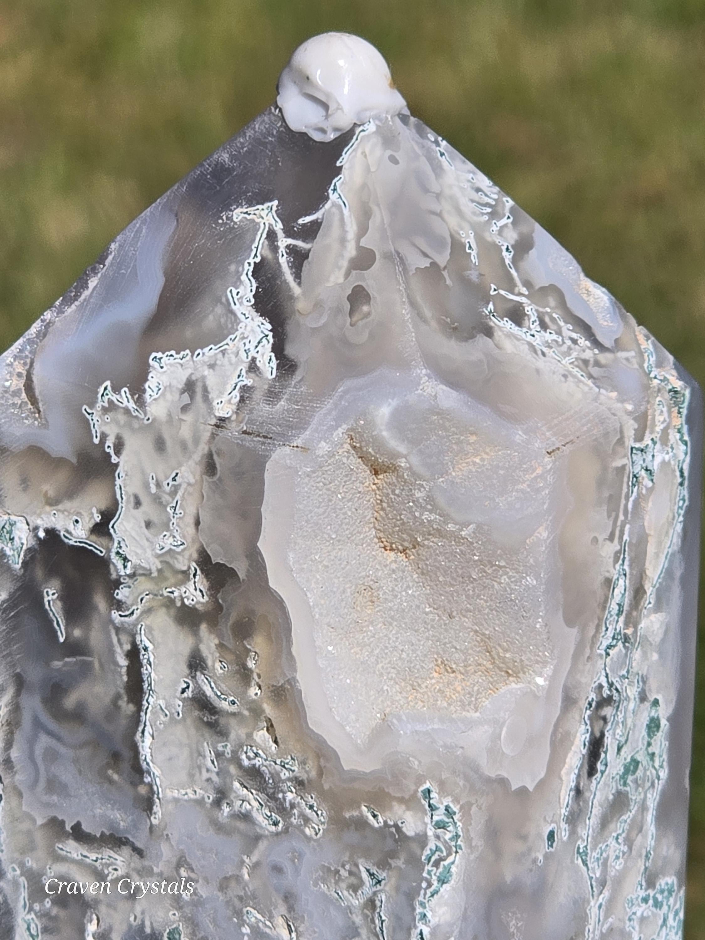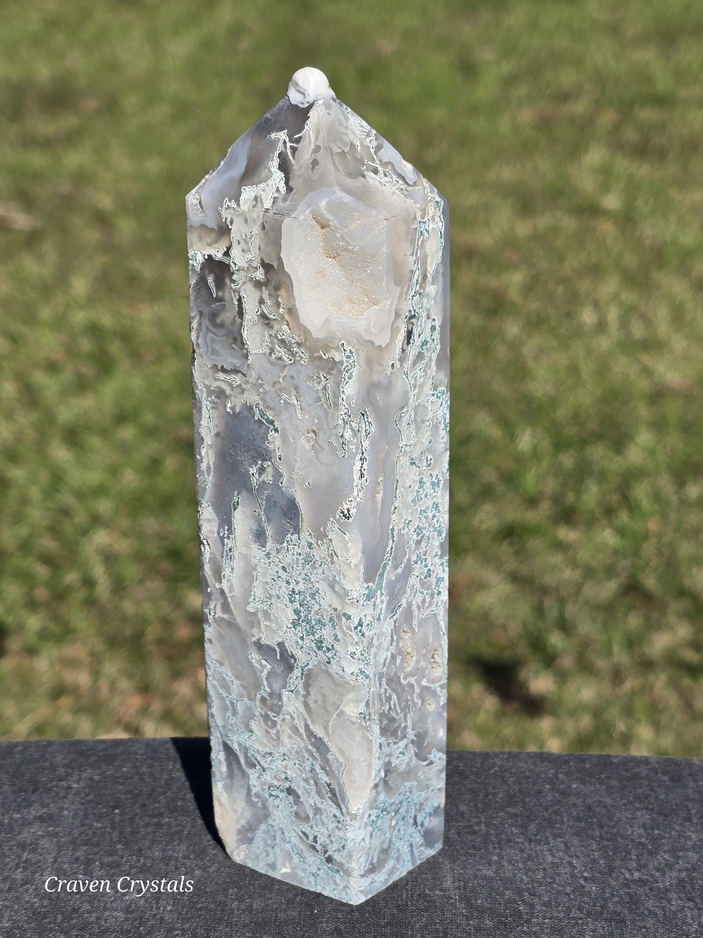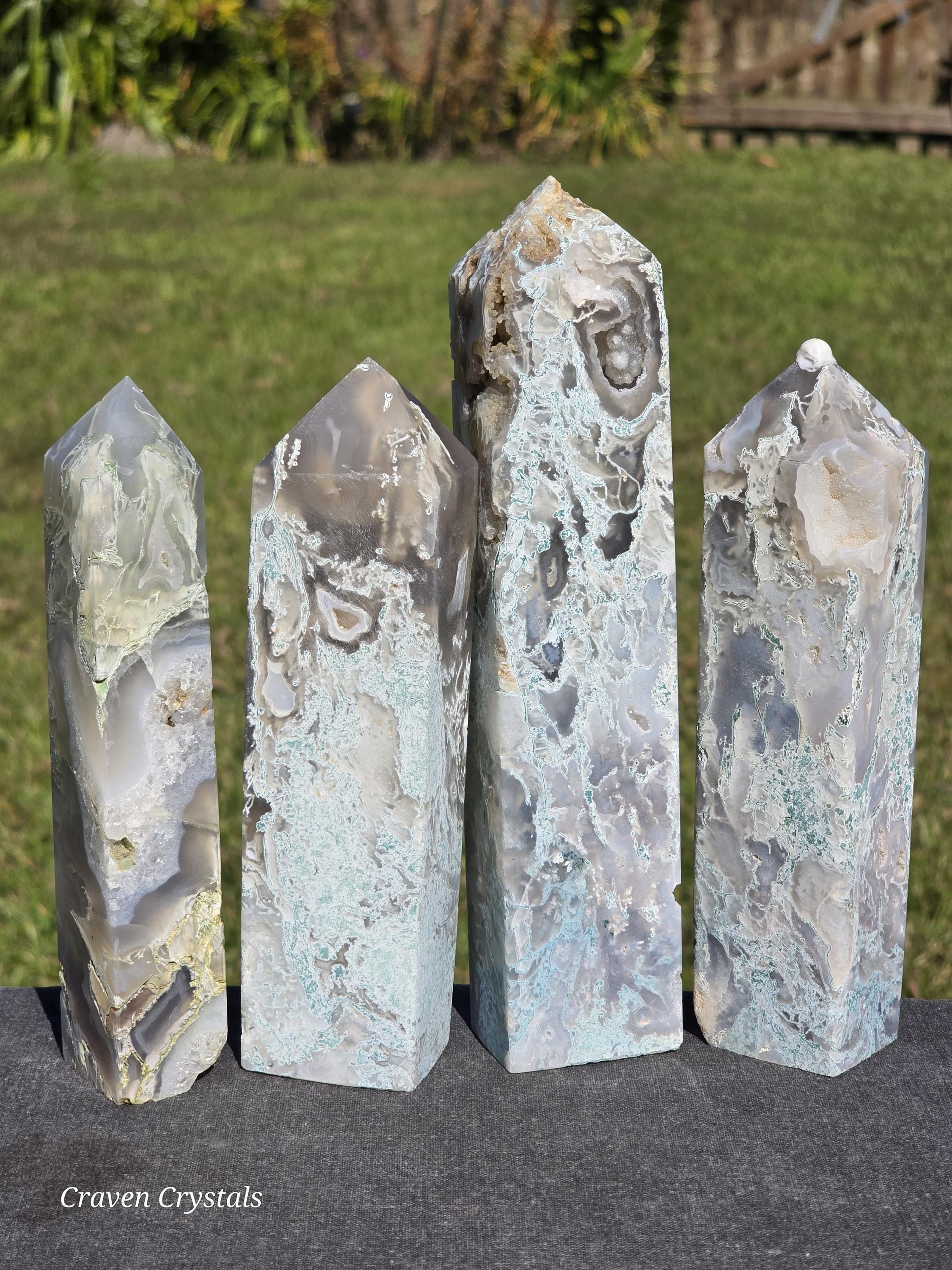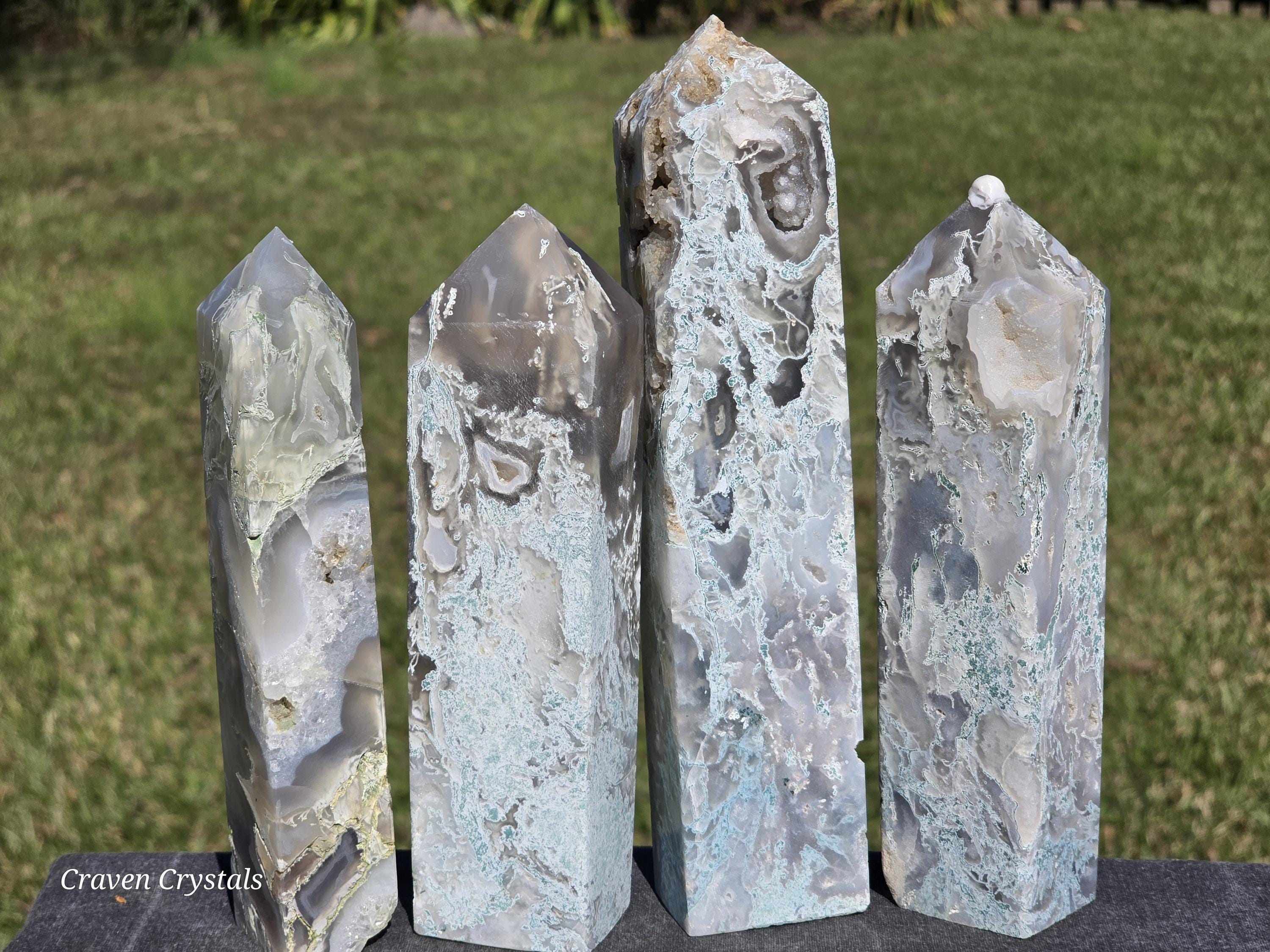 Beautiful Drusy Blue Moss Agate Crystal Towers with Smokey and Clear Quartz inclusions