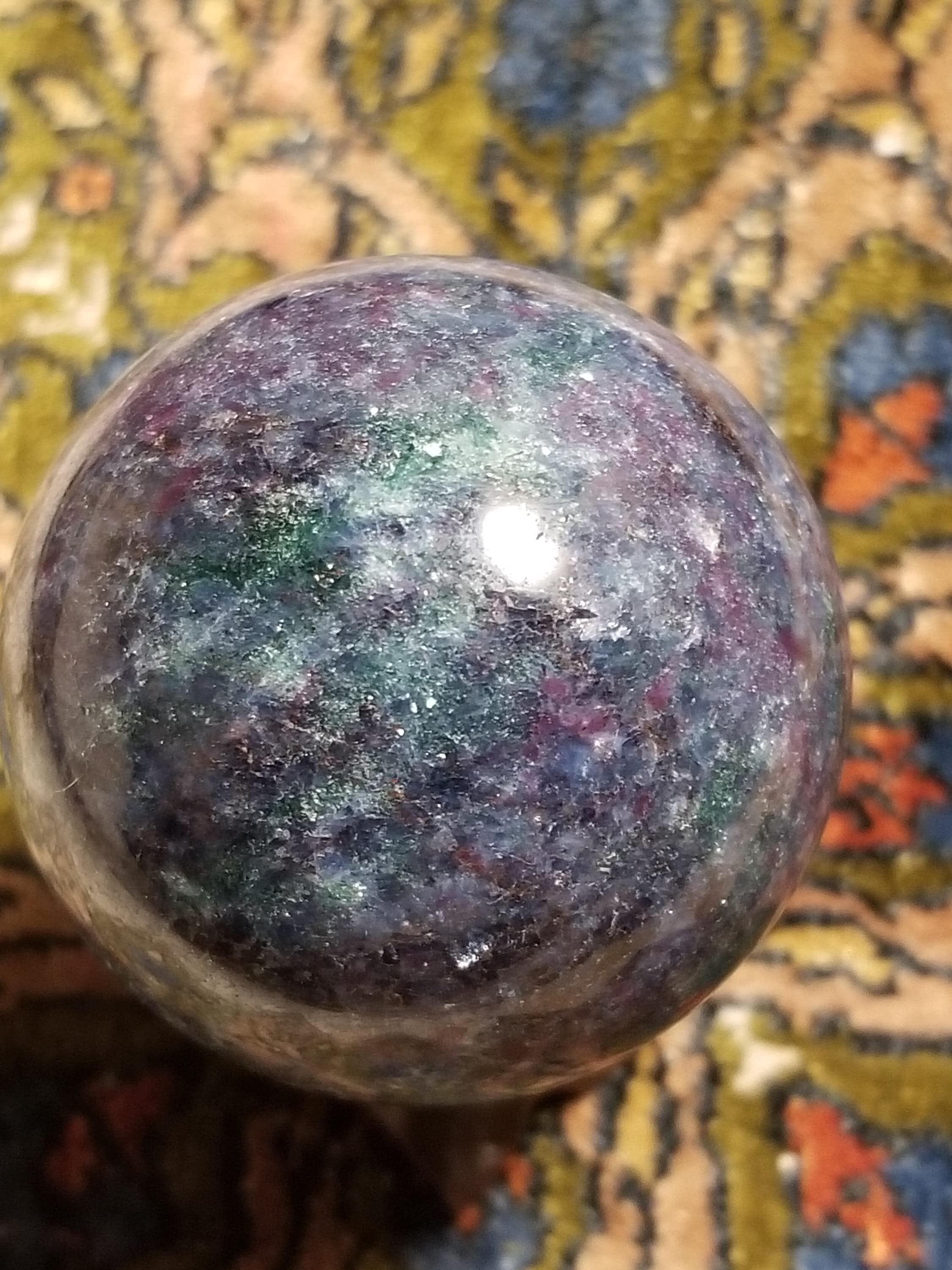 Ruby in Kyanite Crystal Spheres, a unique and visually striking combination of two minerals: Ruby and Kyanite. These minerals are often found together in the same matrix, creating a gemstone with contrasting colors and properties. Ruby in the stone creates a bright pink UV reaction