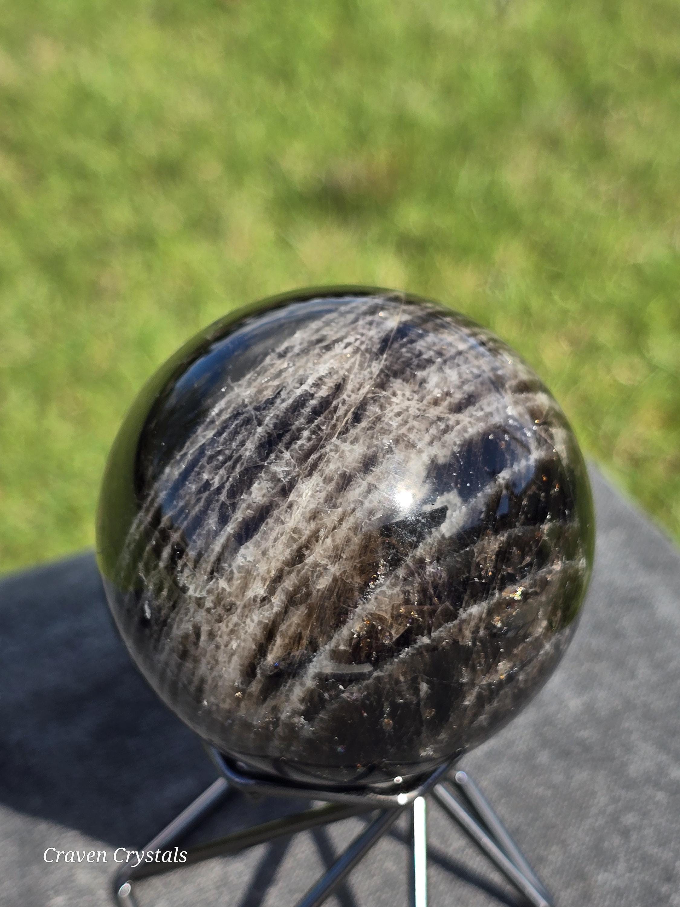 Smaller darker sphere with very little pink visible but some amazing flashy rainbows.