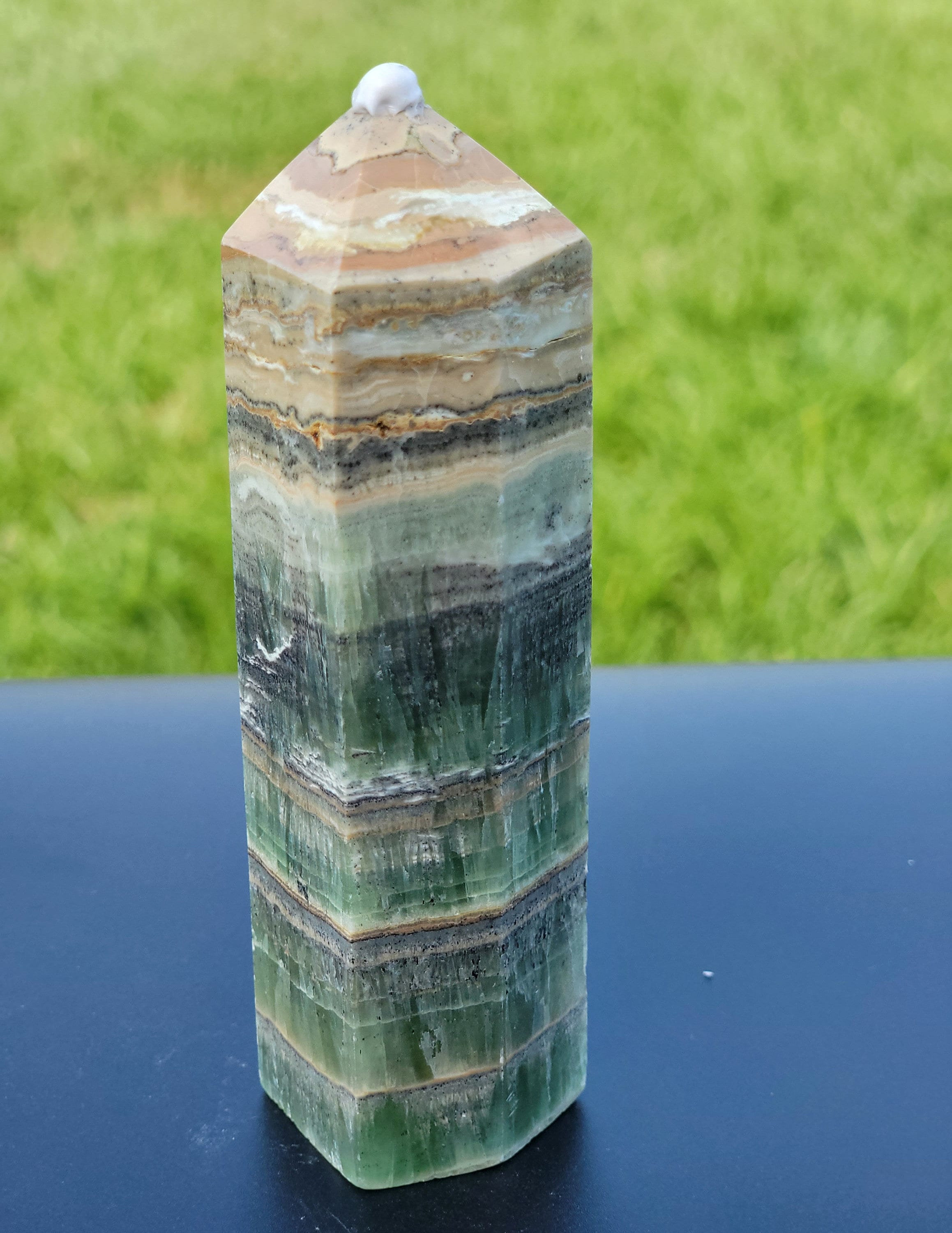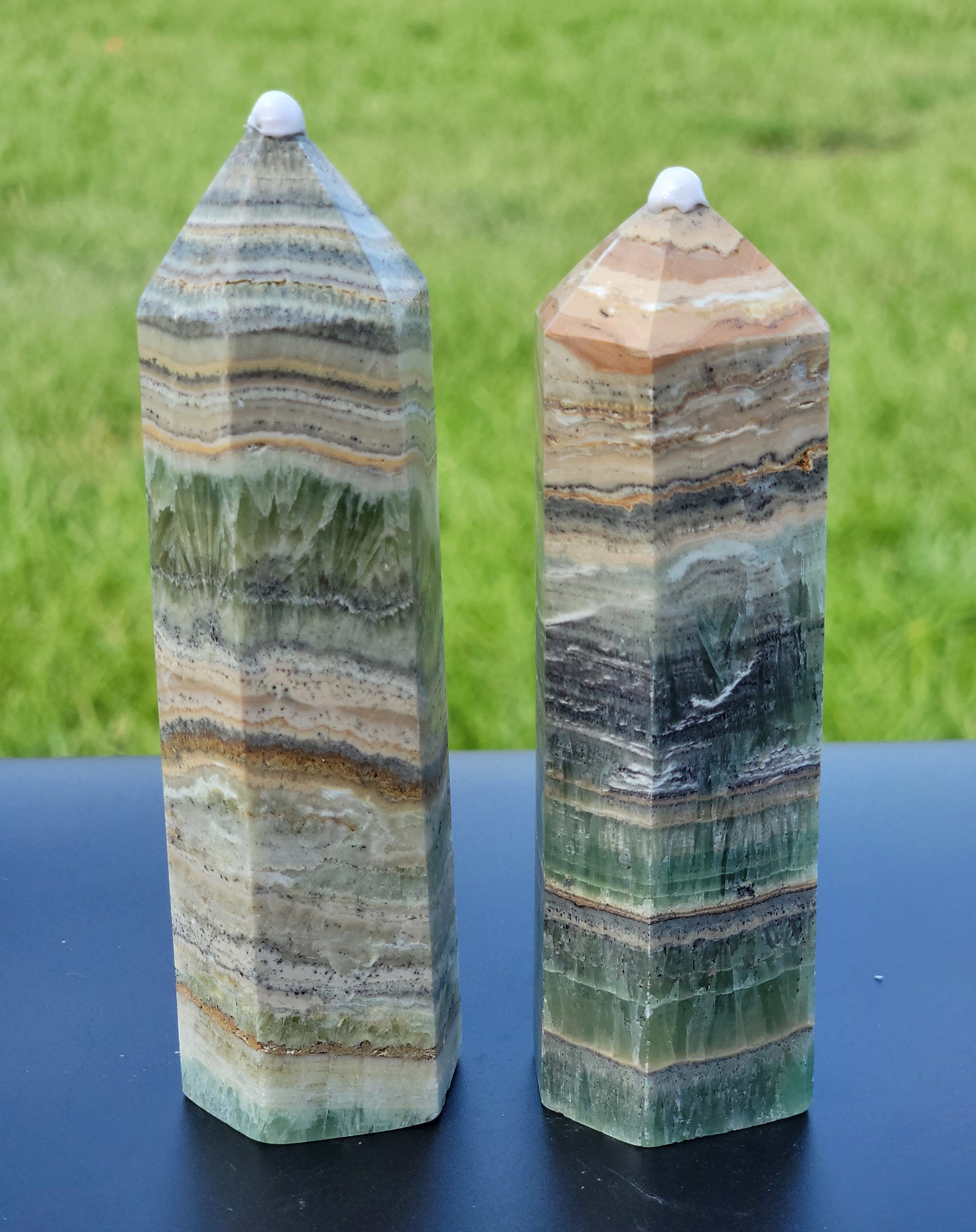 Gorgeous Pistachio Calcite Crystal Towers with banding in shades of green, brown, white and black.