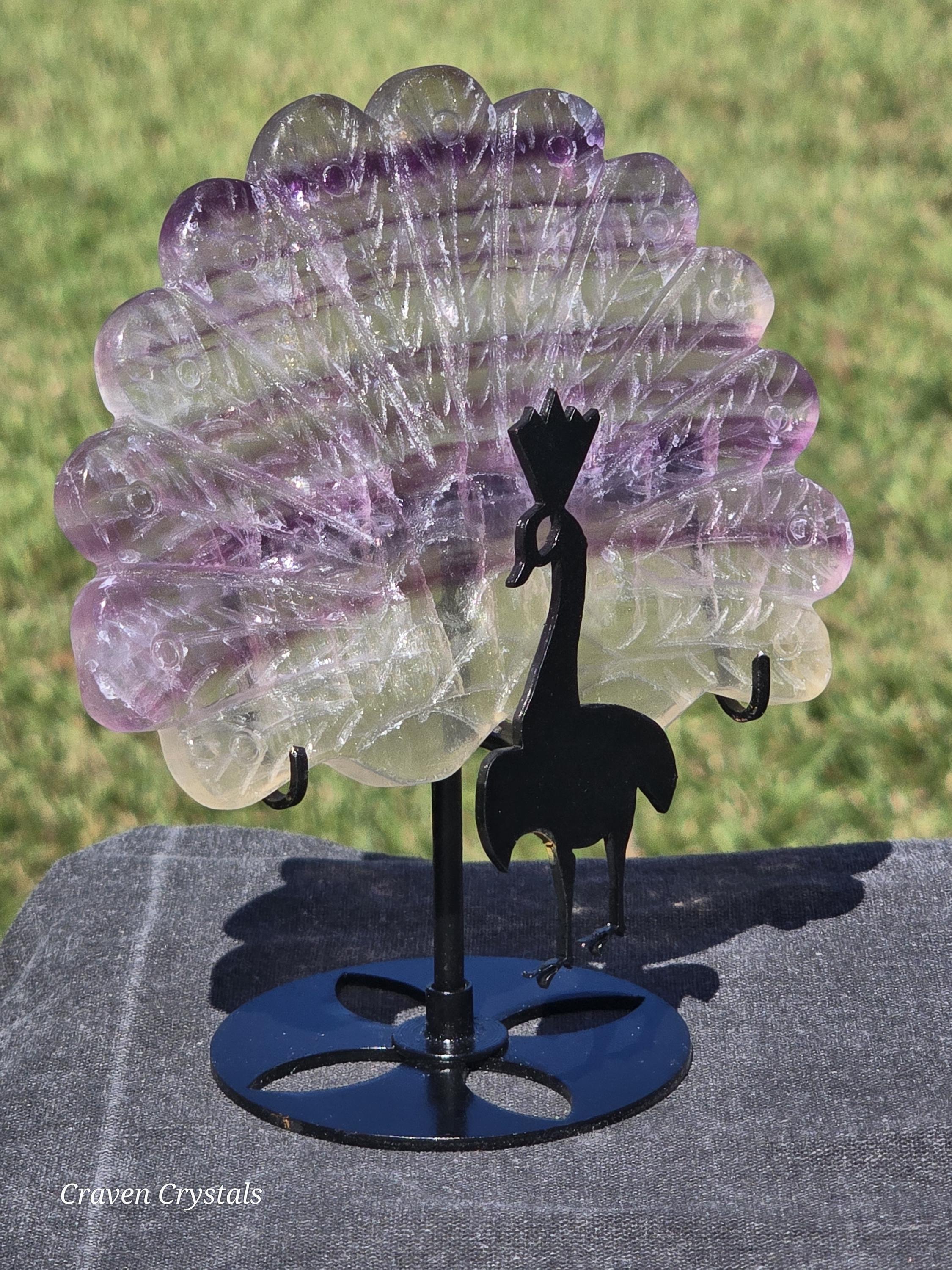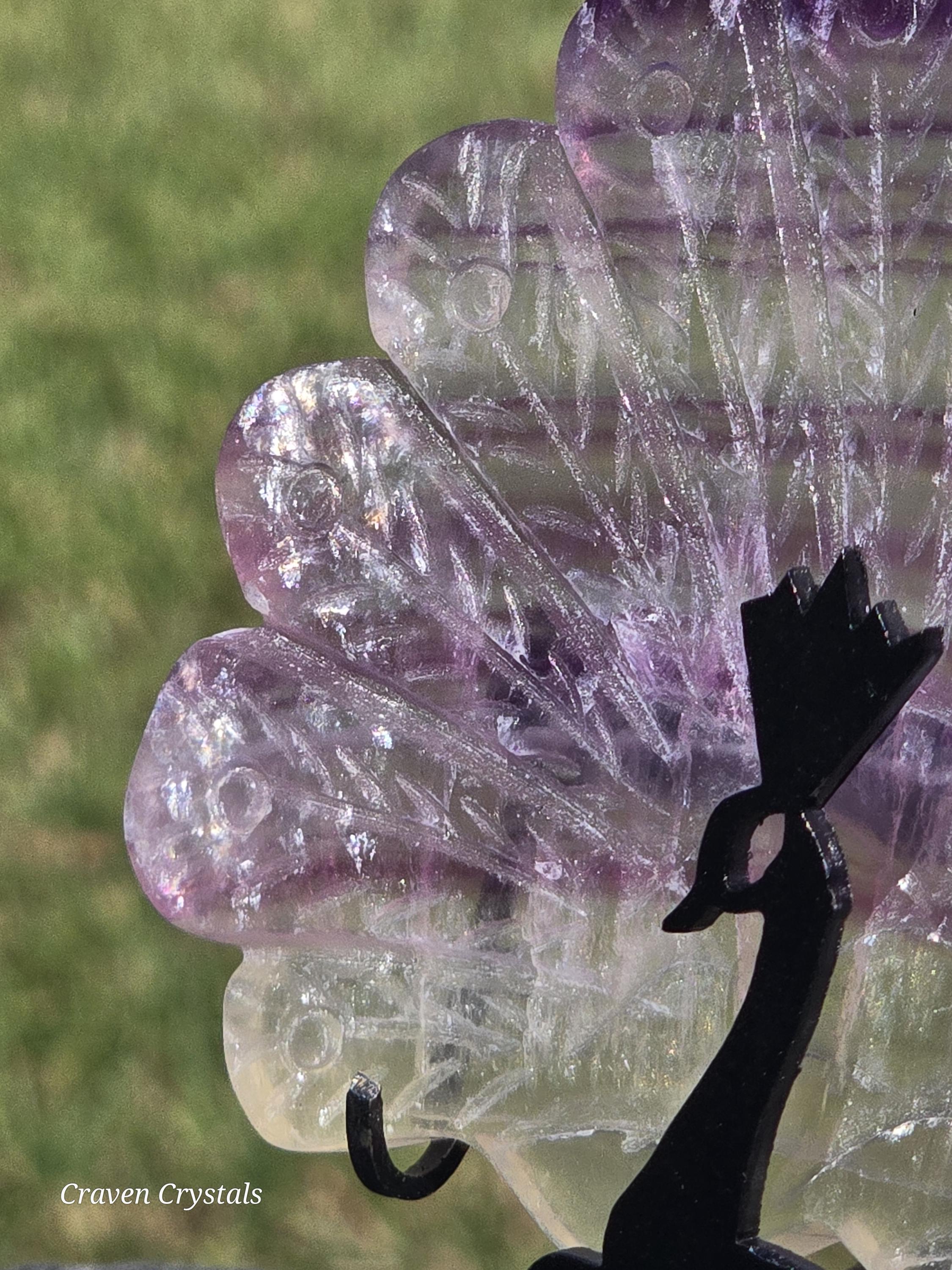 Pastel yellow and purple banded Fluorite Crystal Peacock with rainbow flash