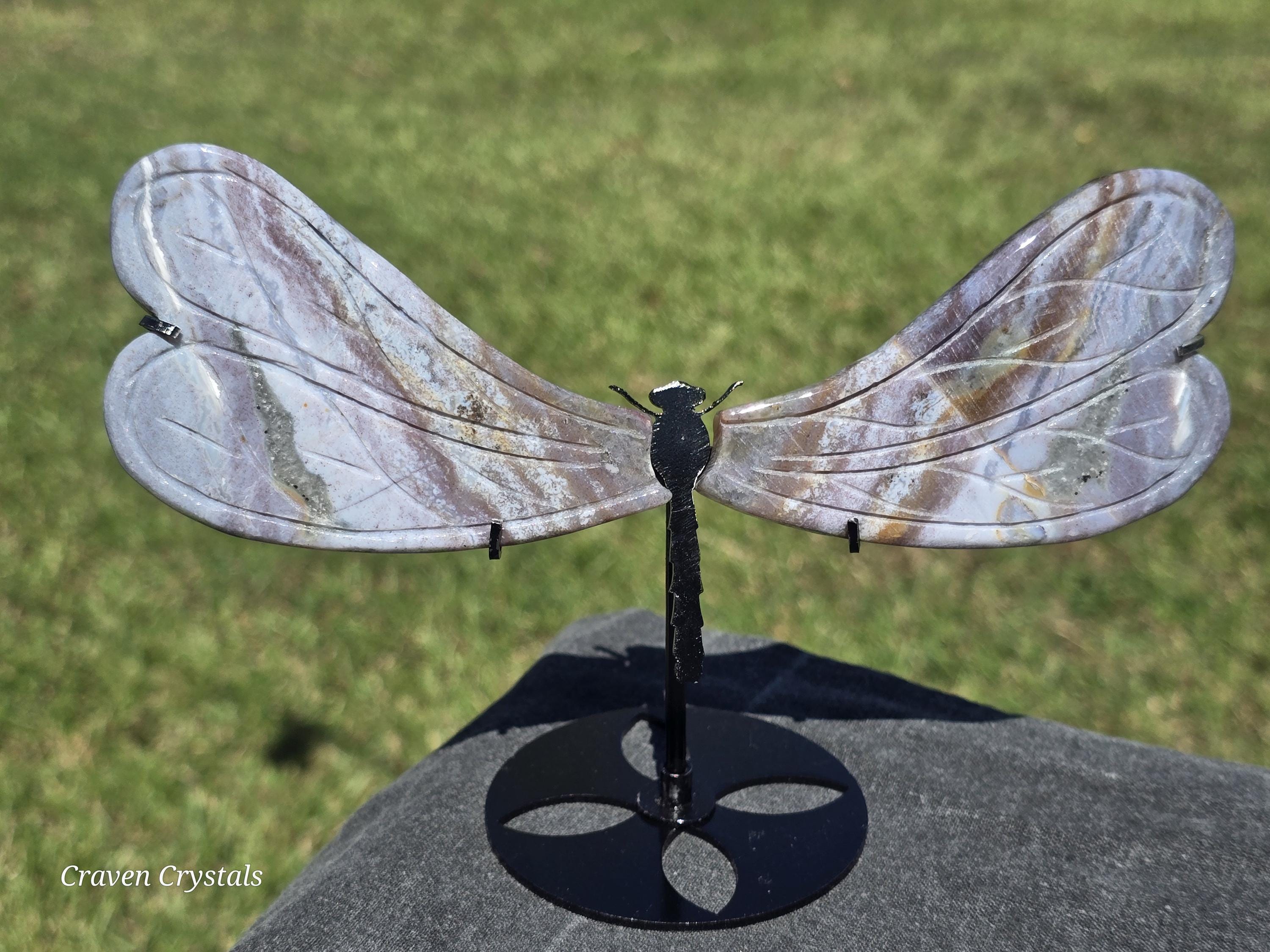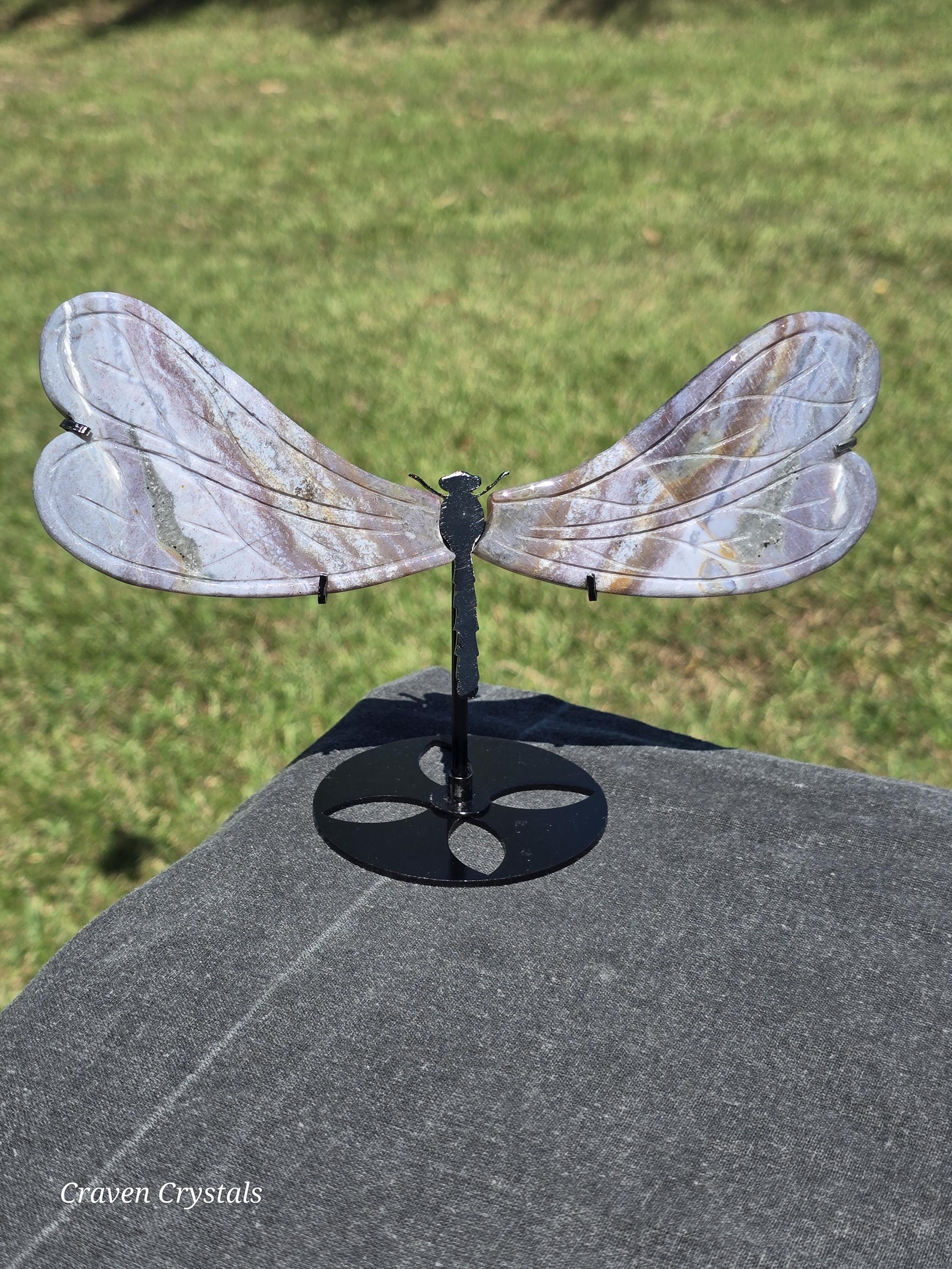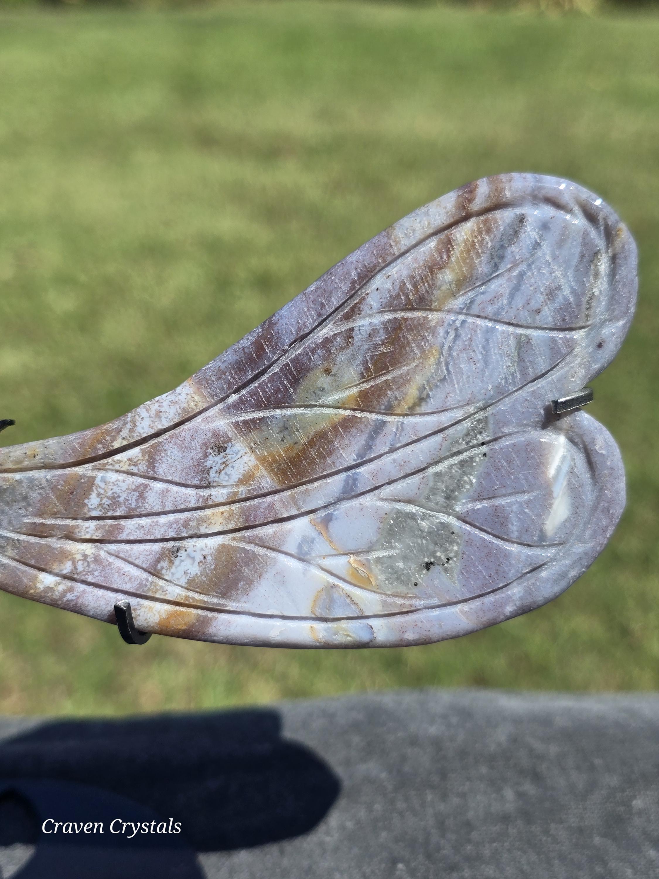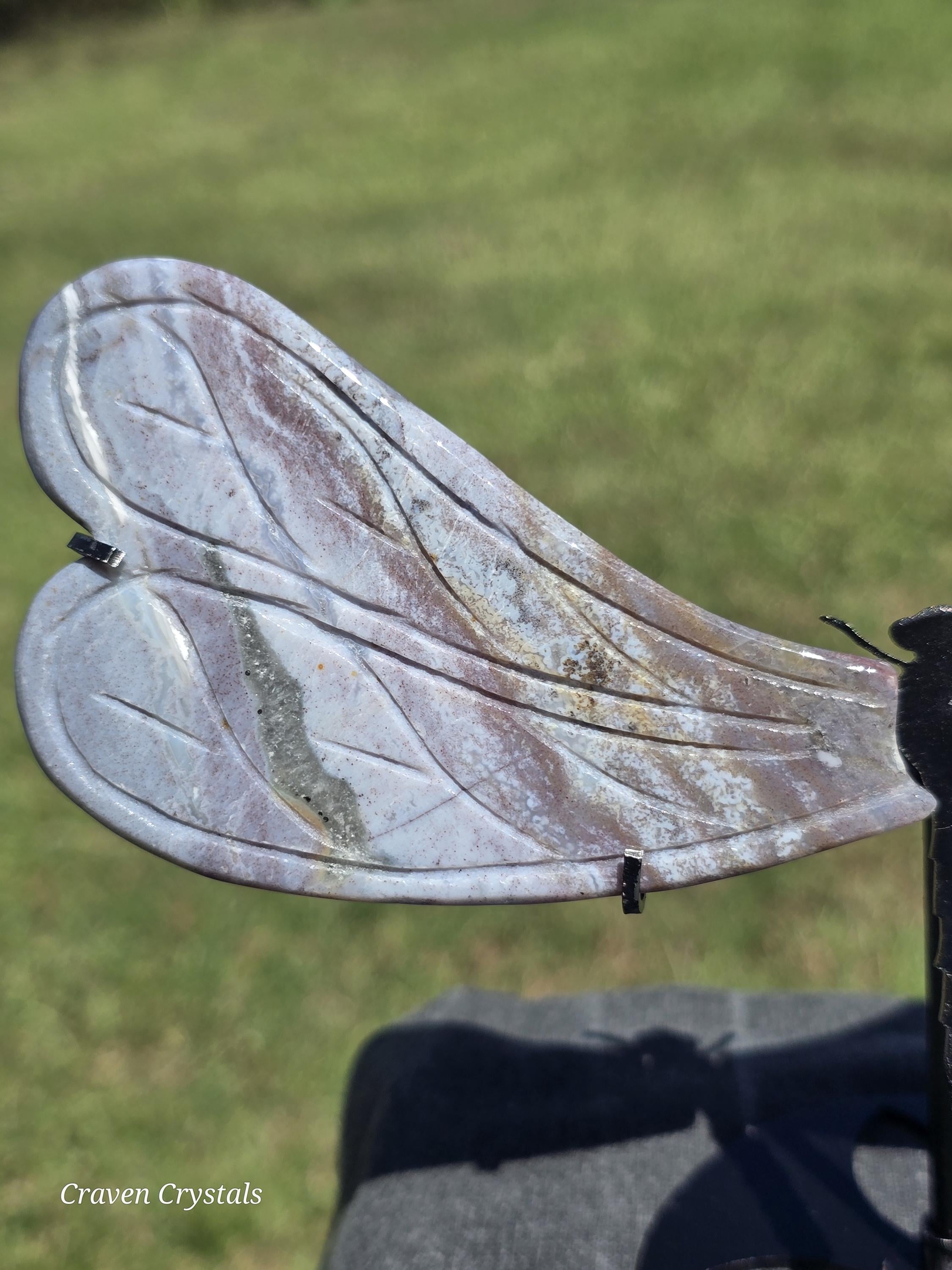 Beautiful lavender purple Ocean Jasper Crystal Dragonfly Wings with bands of blue, red and yellow. Matching quartz pockets on each wing.