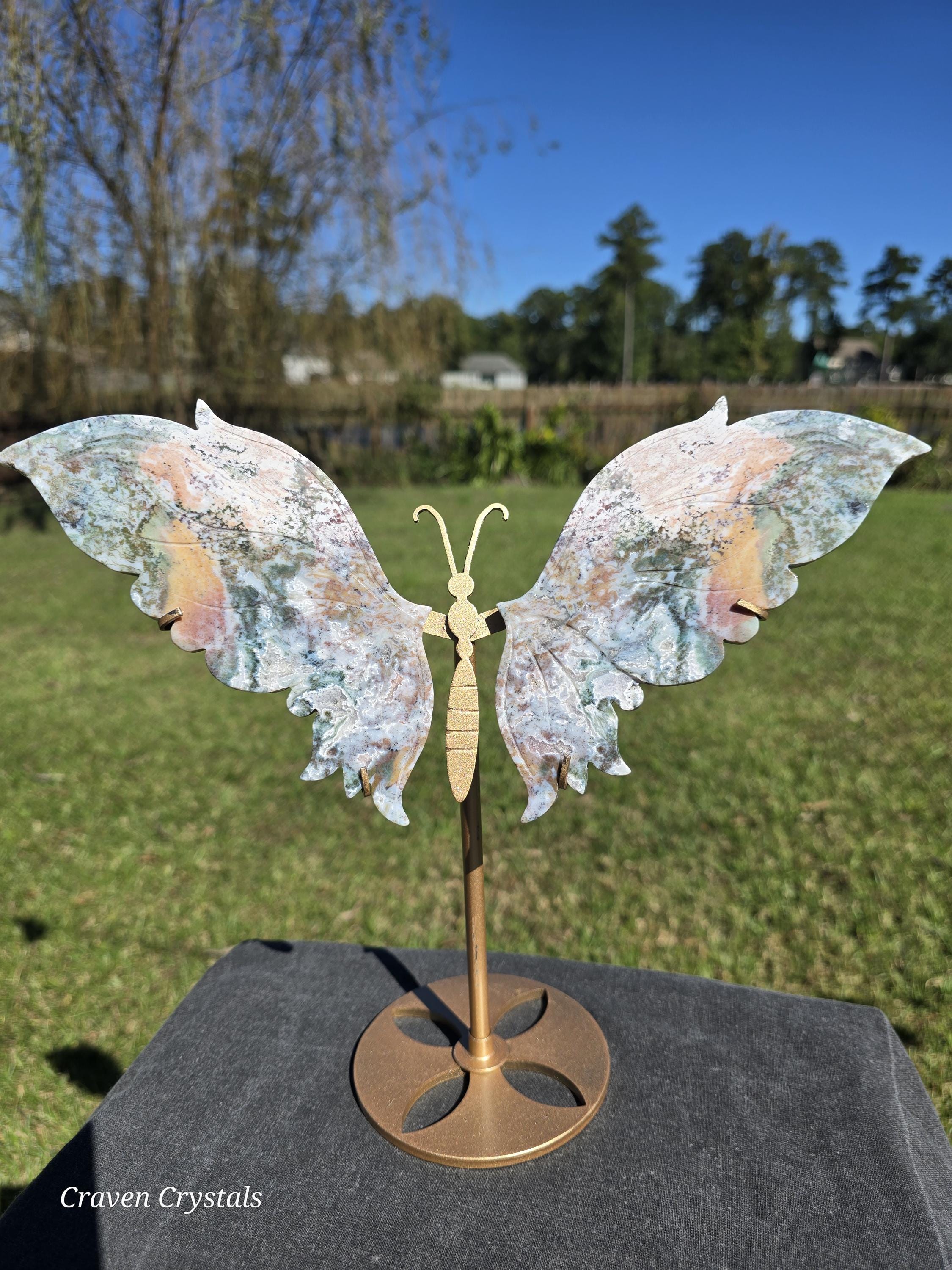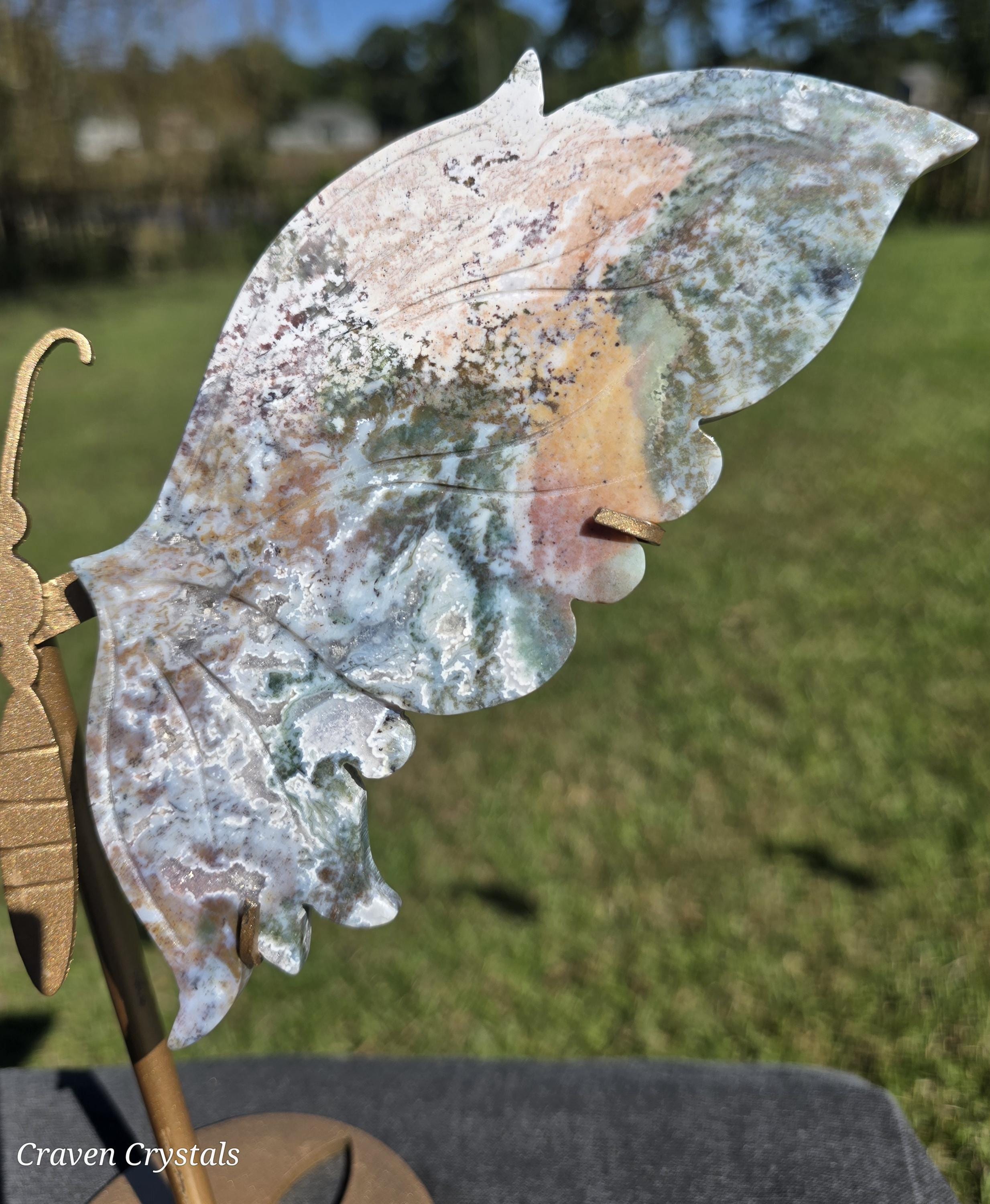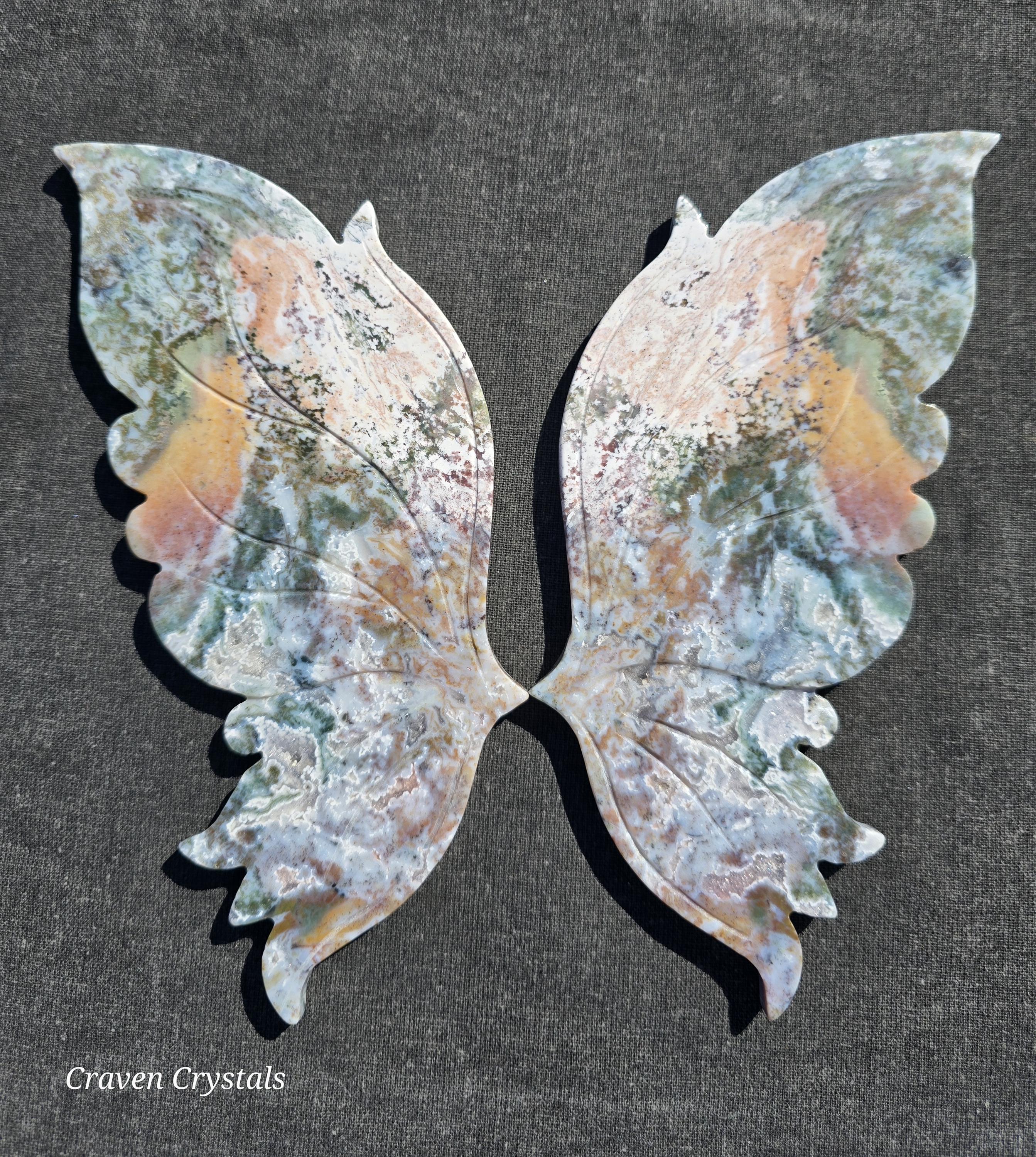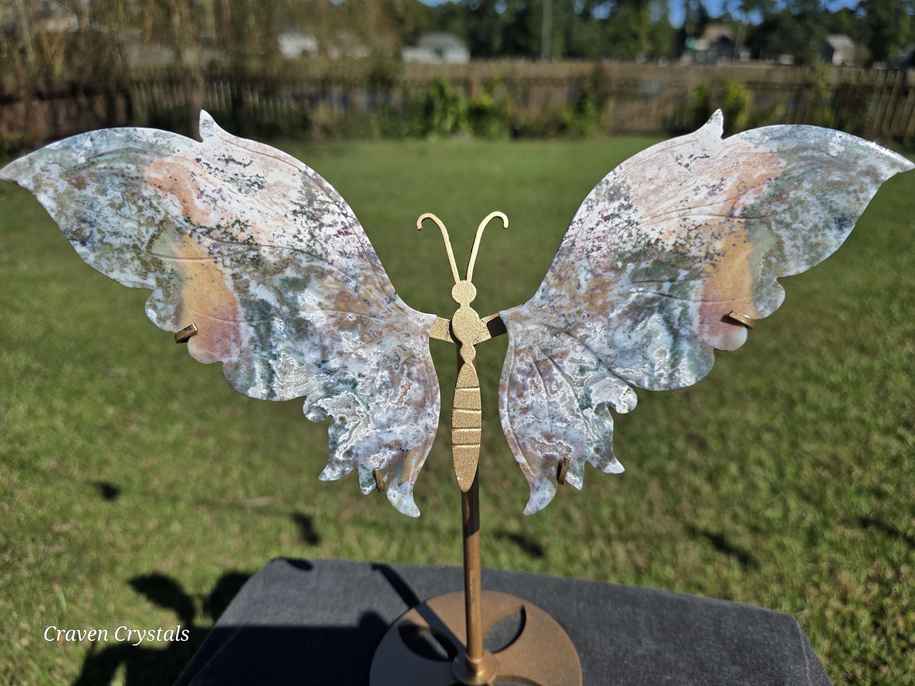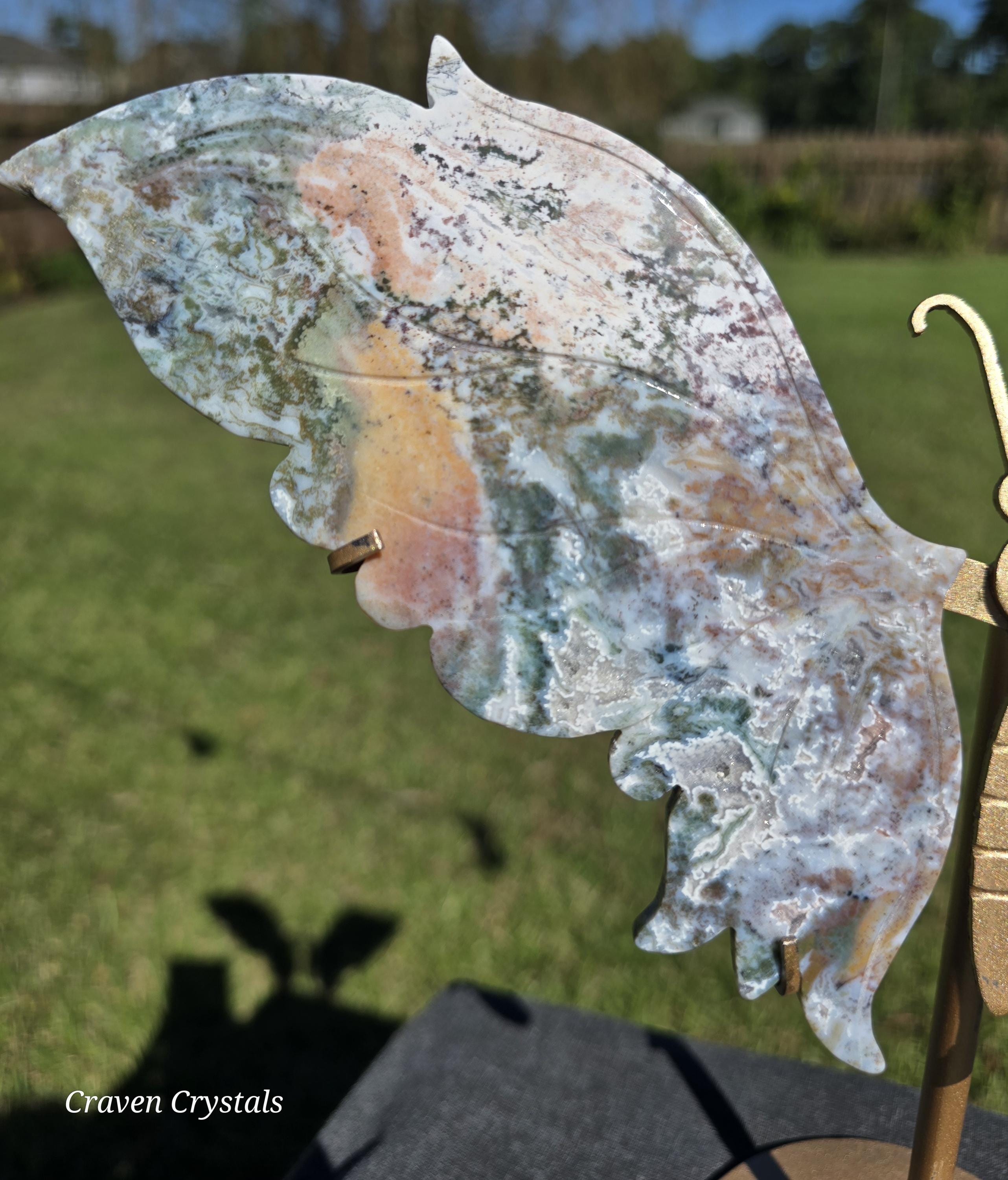 These colorful Ocean Jasper Crystal Butterfly Wings are a work of art! Both wings have sparkly drusy quartz inclusions and swirls of pink and green
