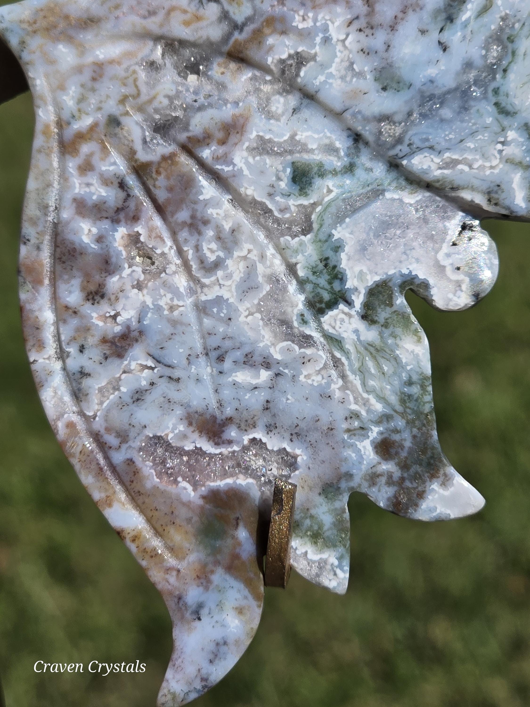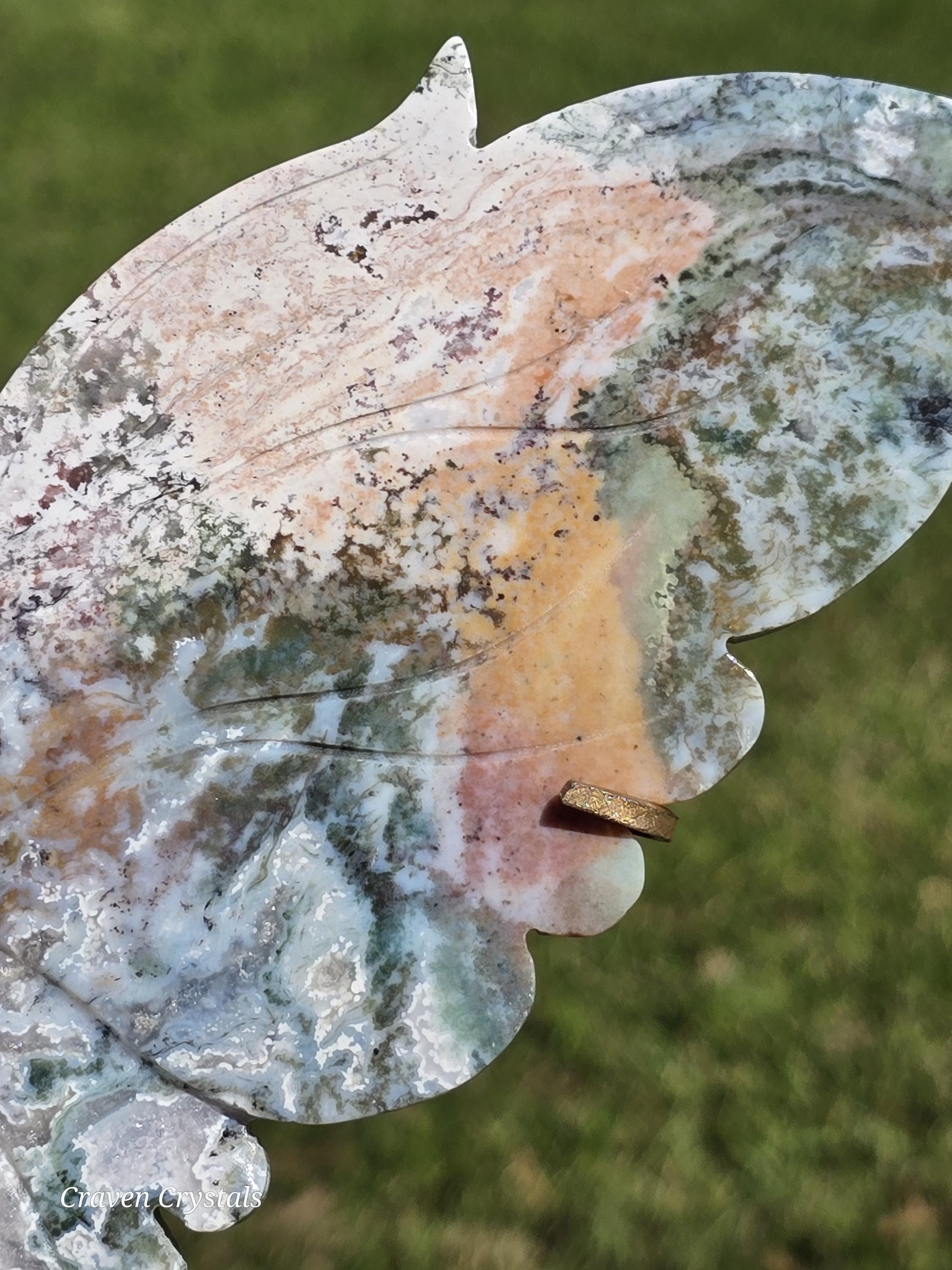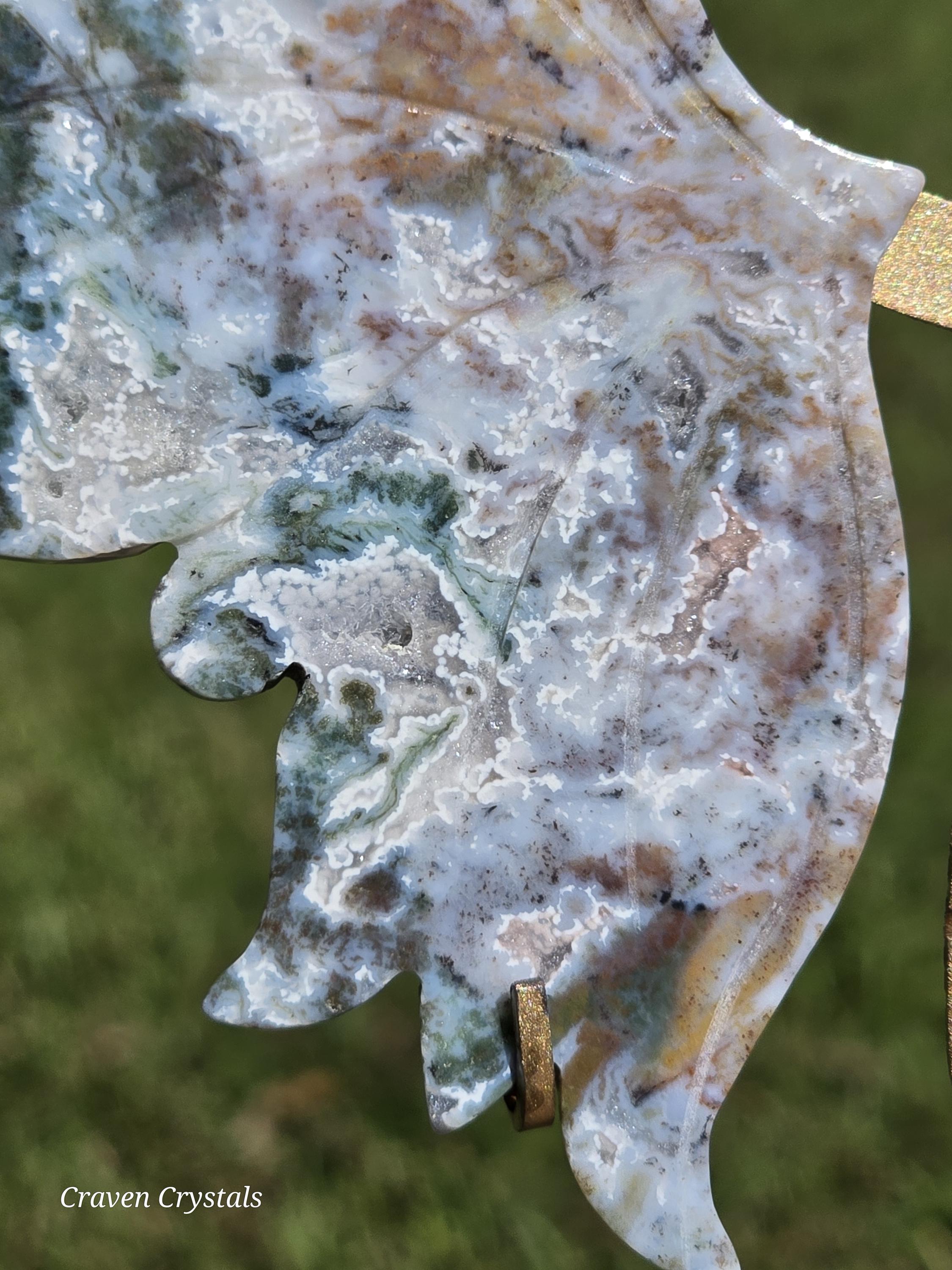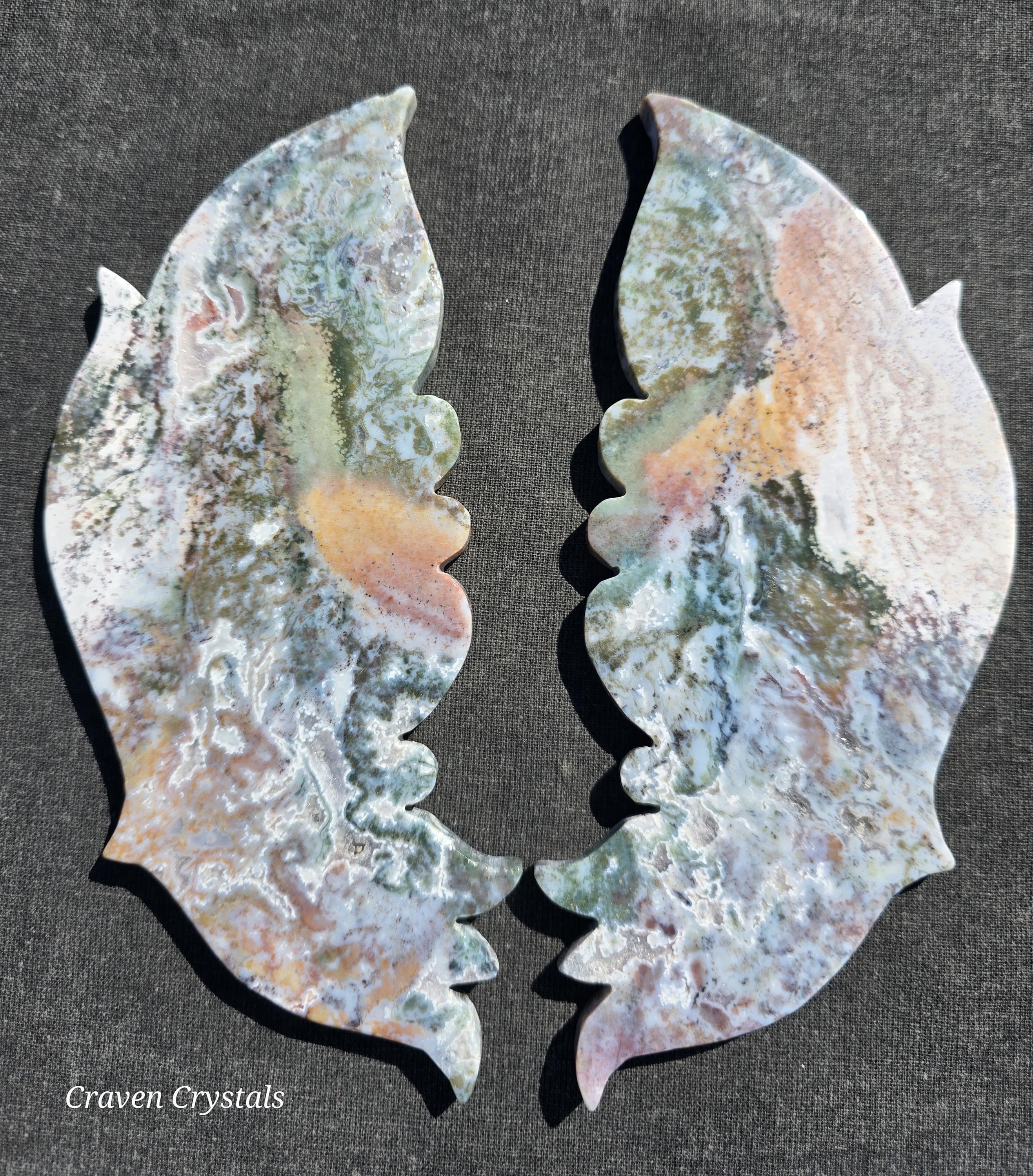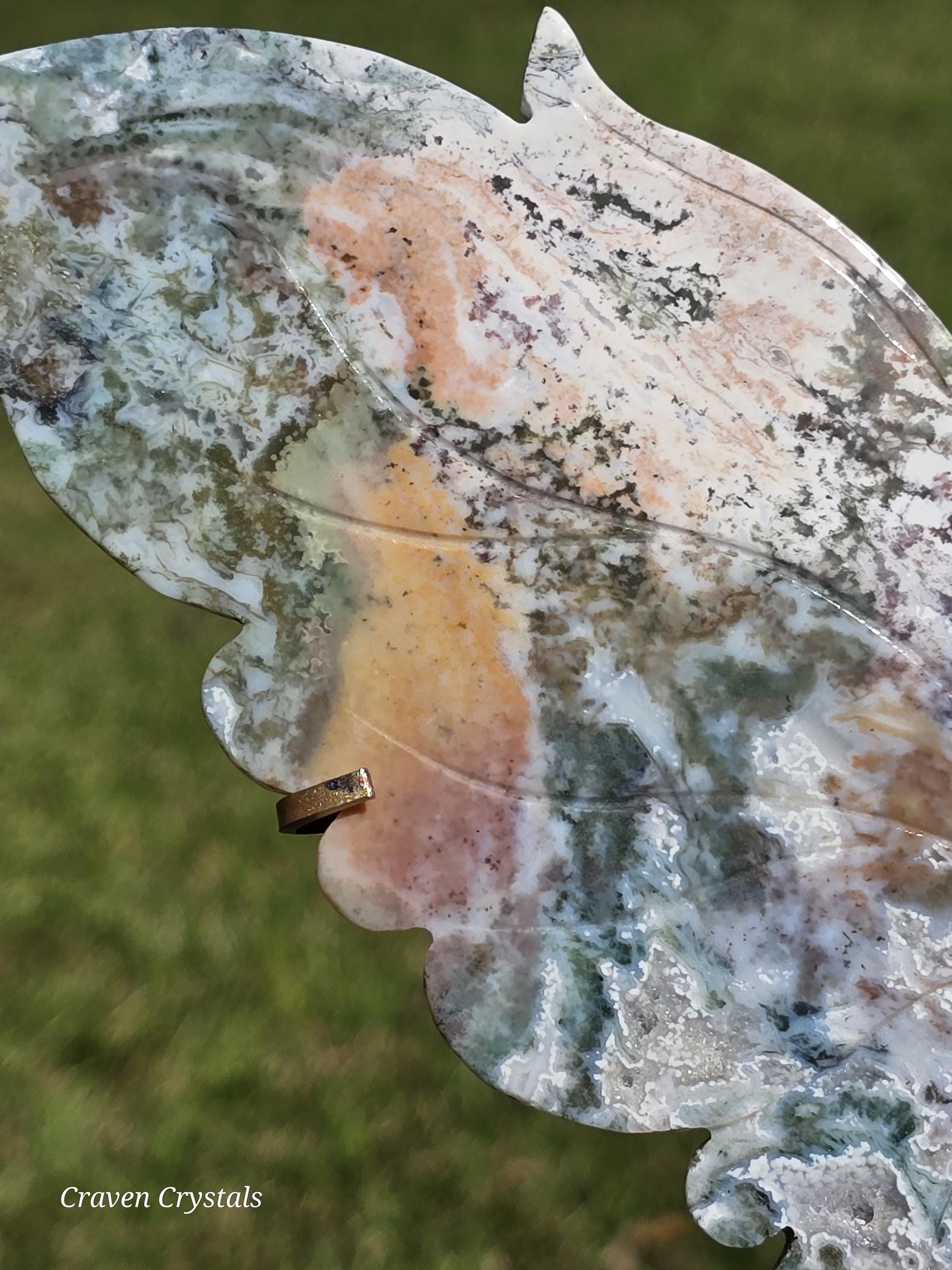These colorful Ocean Jasper Crystal Butterfly Wings are a work of art! Both wings have sparkly drusy quartz inclusions and swirls of pink and green