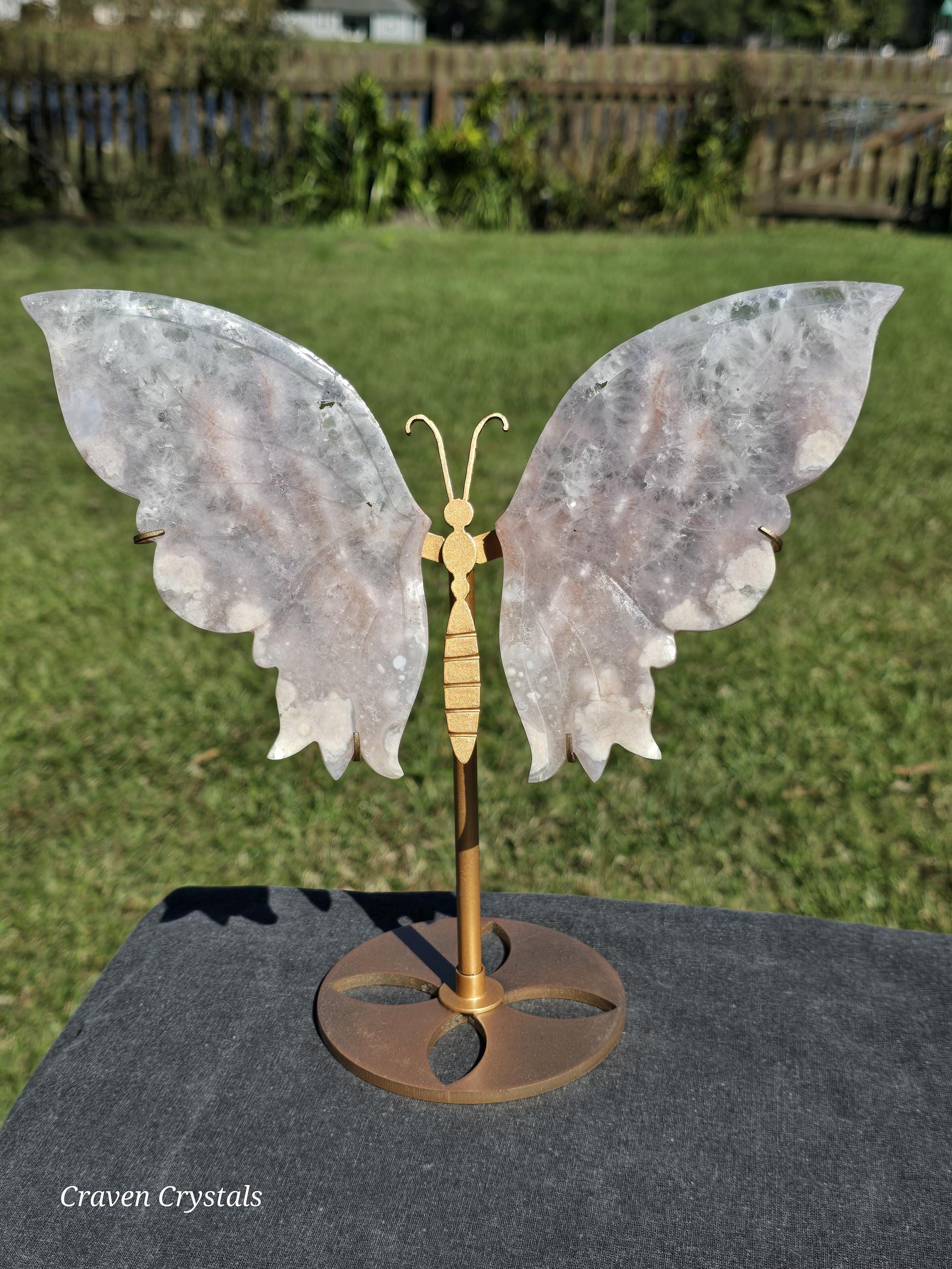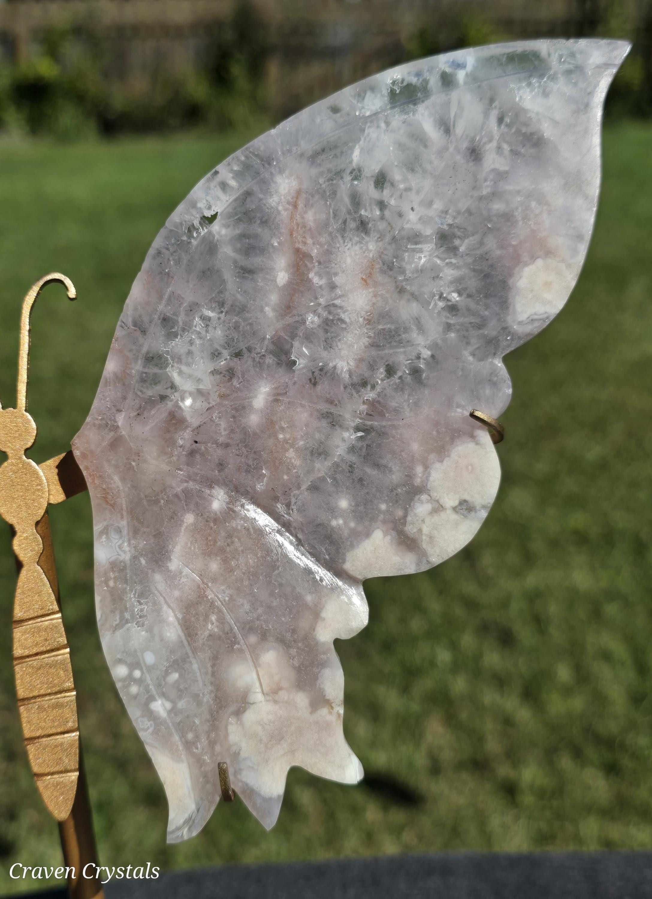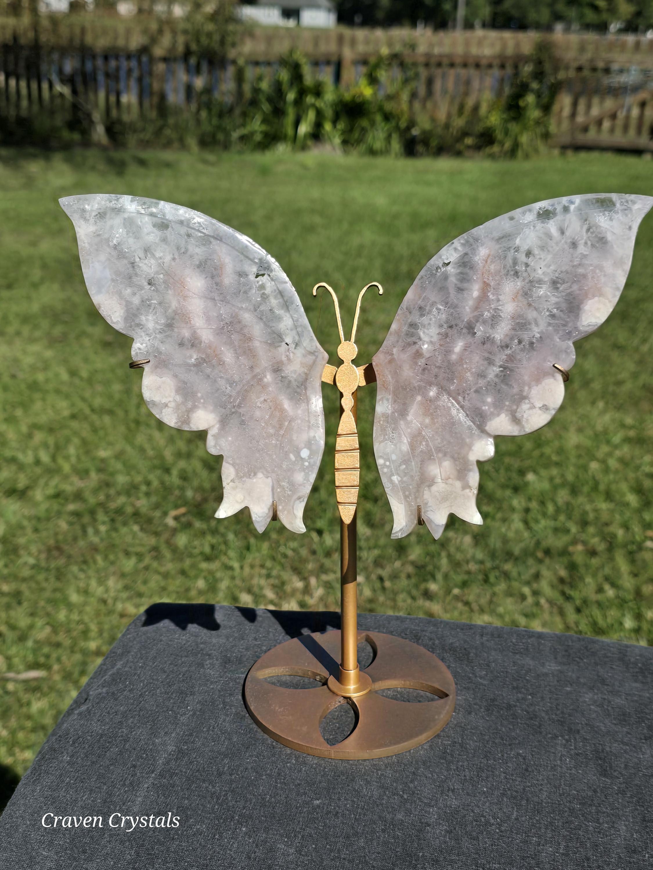 Stunning pastel Pink Amethyst Crystal Butterfly Wings with clear drusy and pink flowers