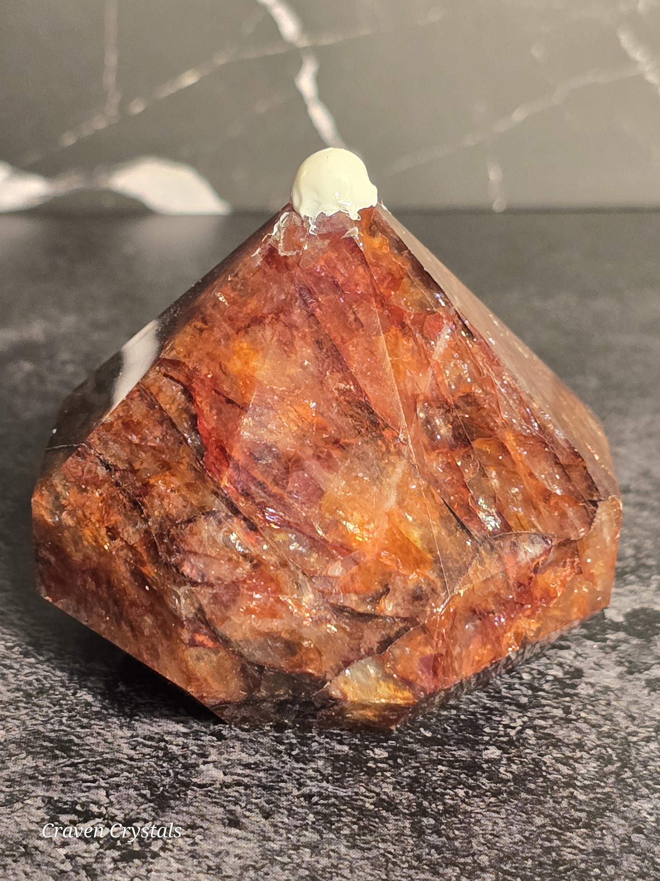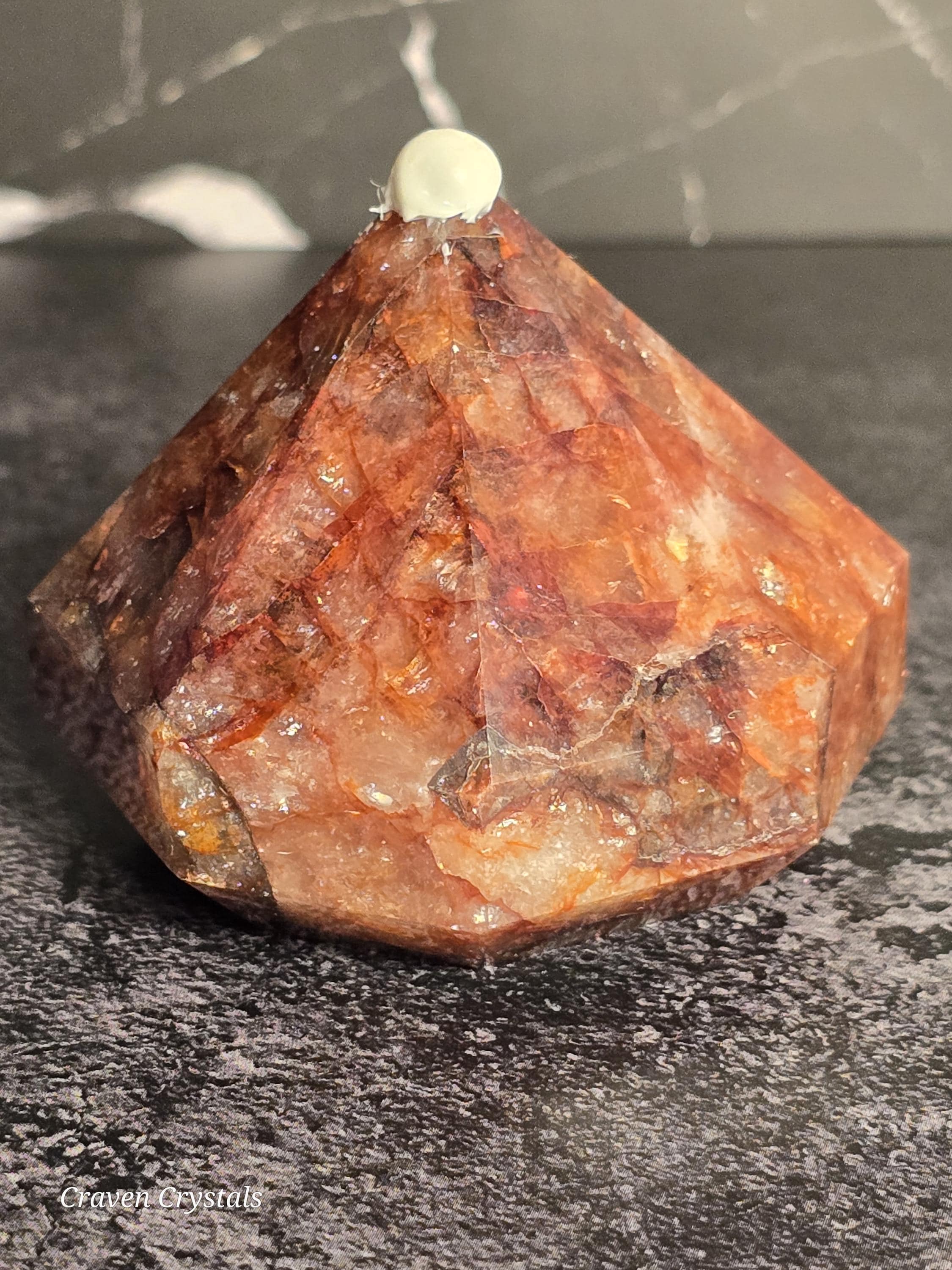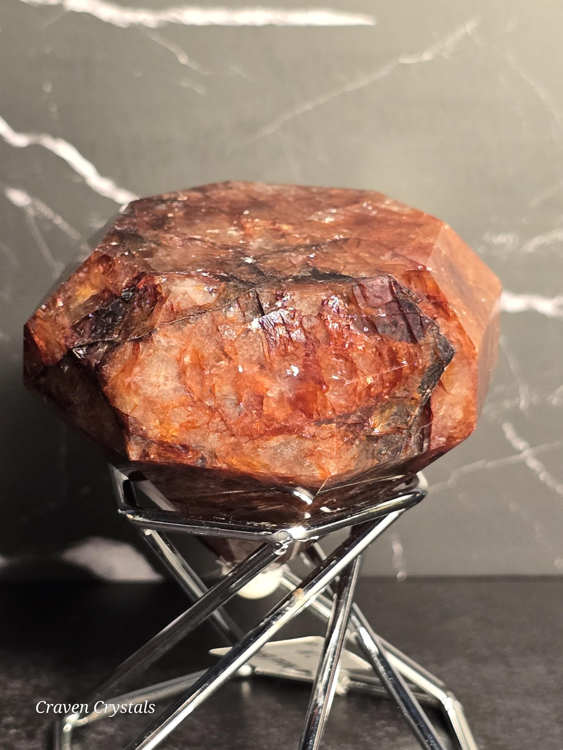 Stunning dark red Fire Quartz, also known as Hematoid Quartz, Harlequin Quartz, or Ferruginous Quartz, Crystal Diamond with rainbows, a captivating and unique variety of quartz that exhibits a combination of clear quartz and hematite.