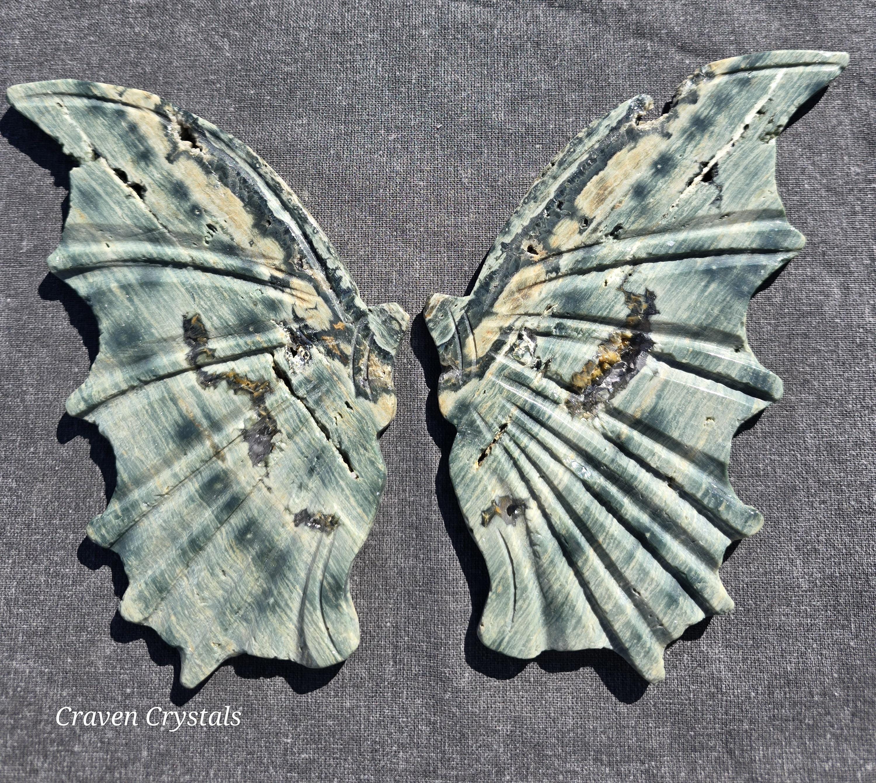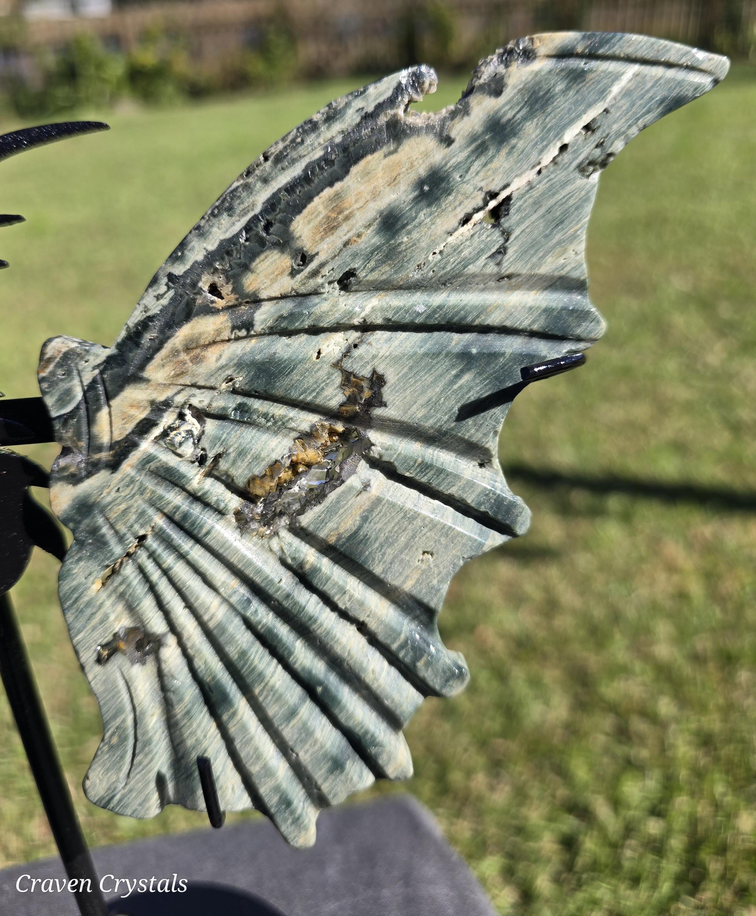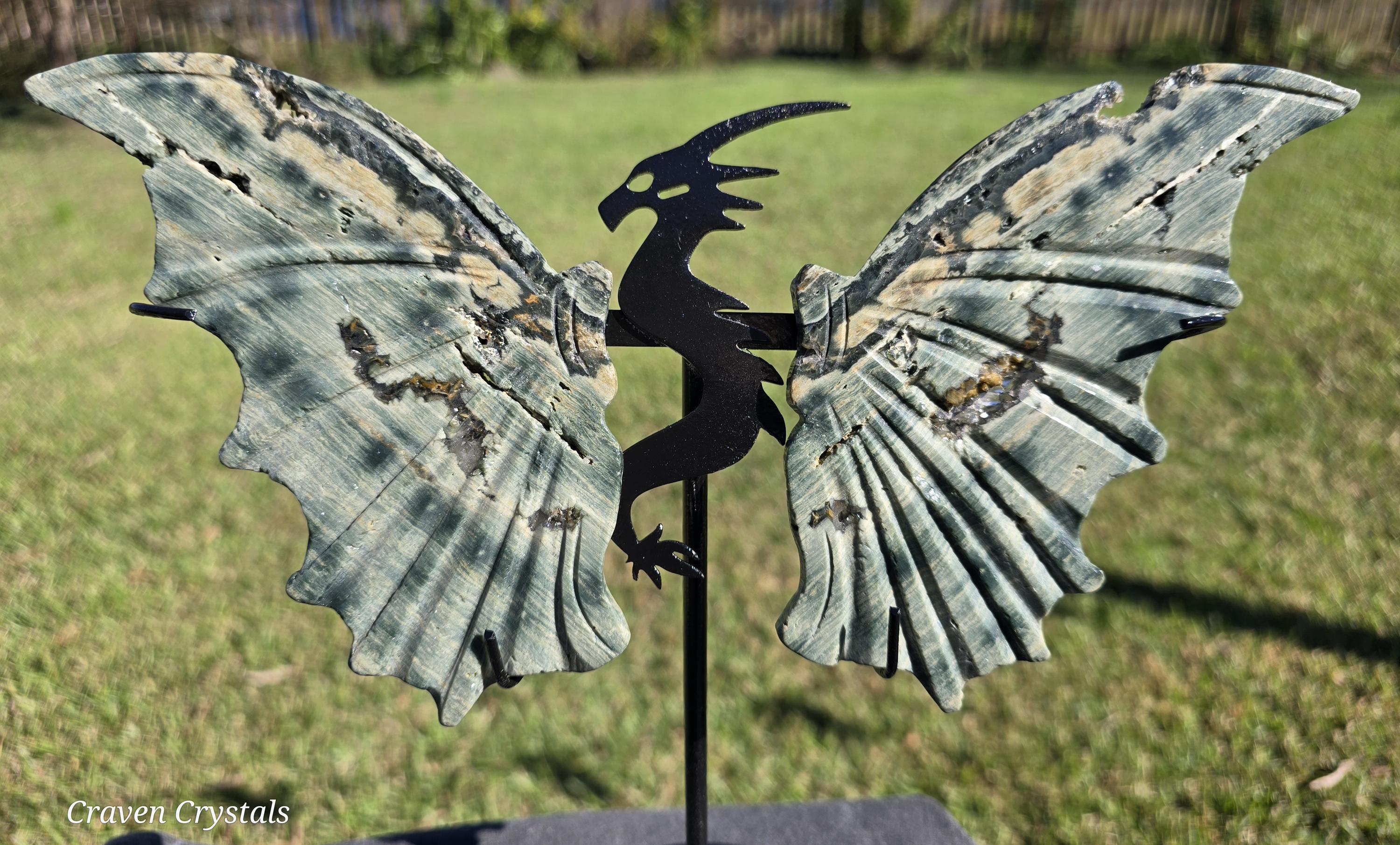 Phenomenal green Orbicular Ocean Jasper Crystal Dragon Wings with sparkly druzy Clear Quartz inclusion.