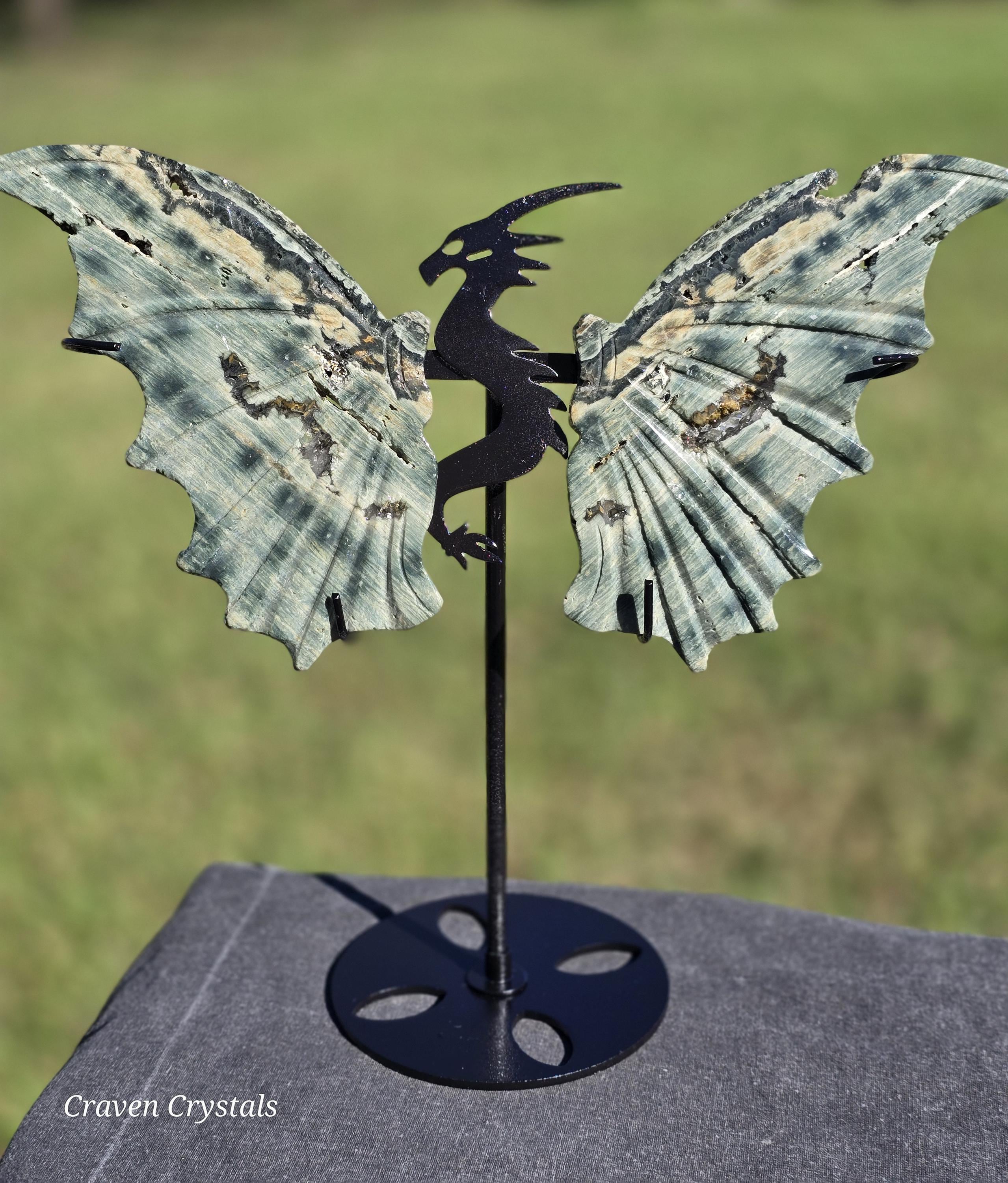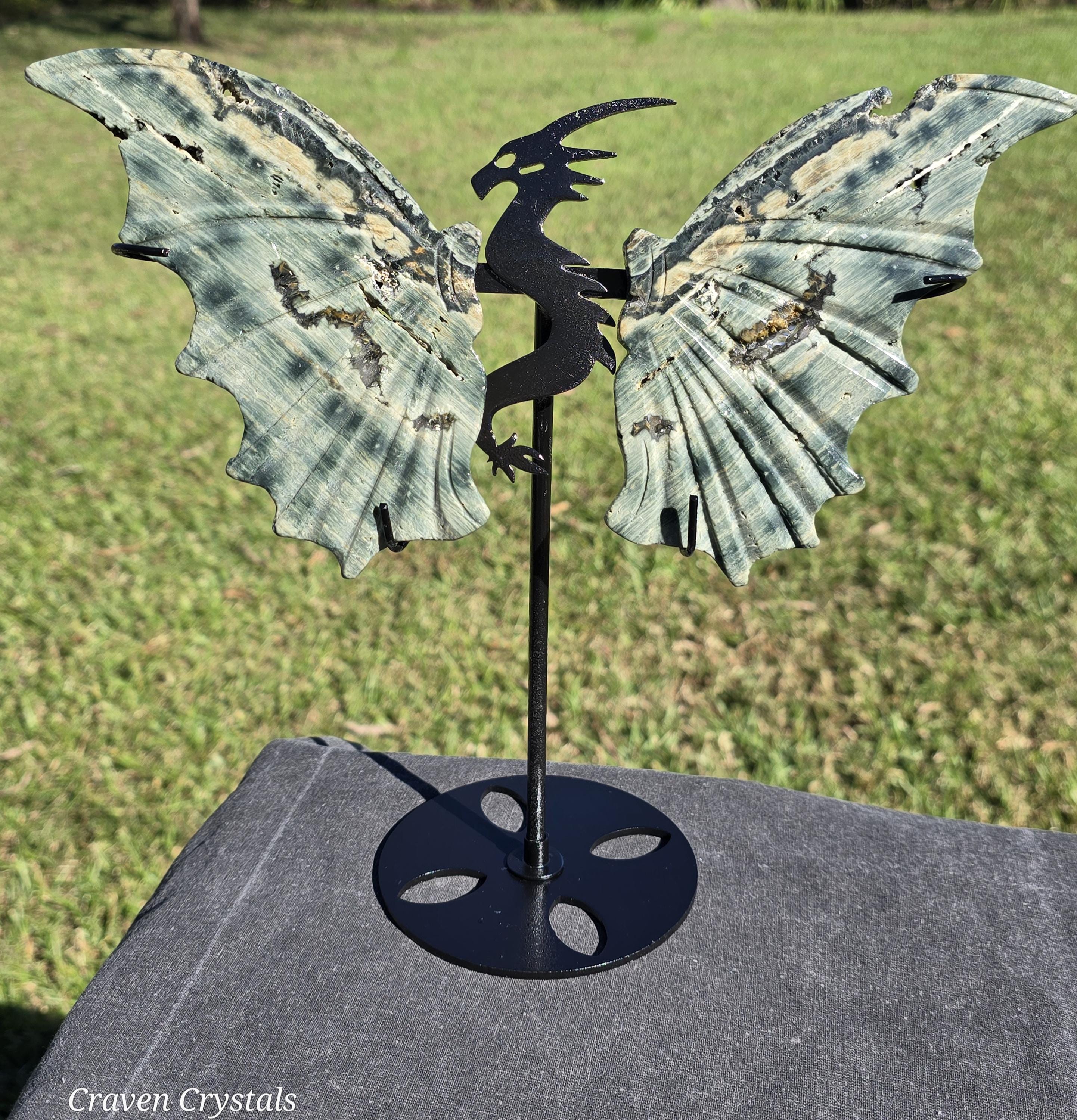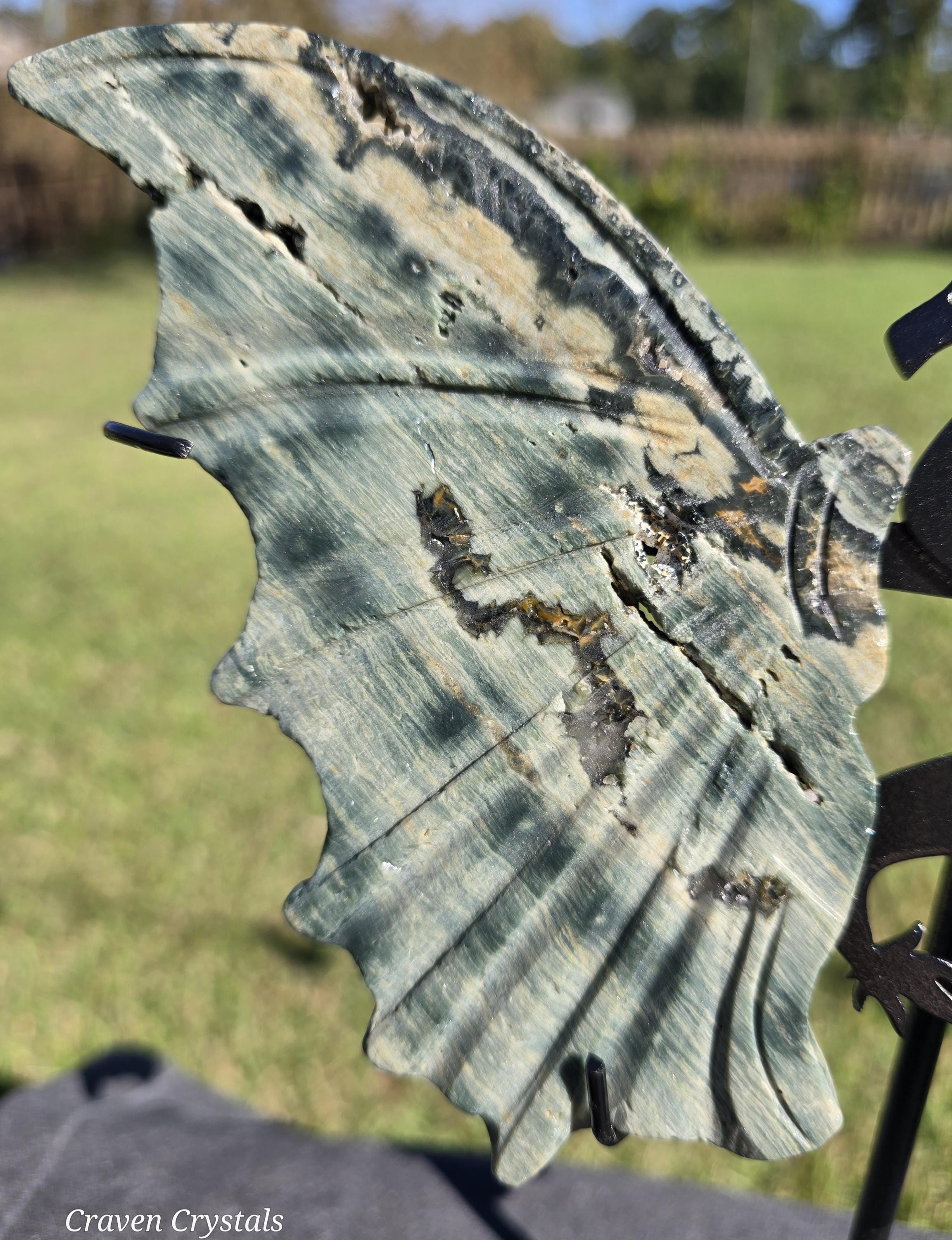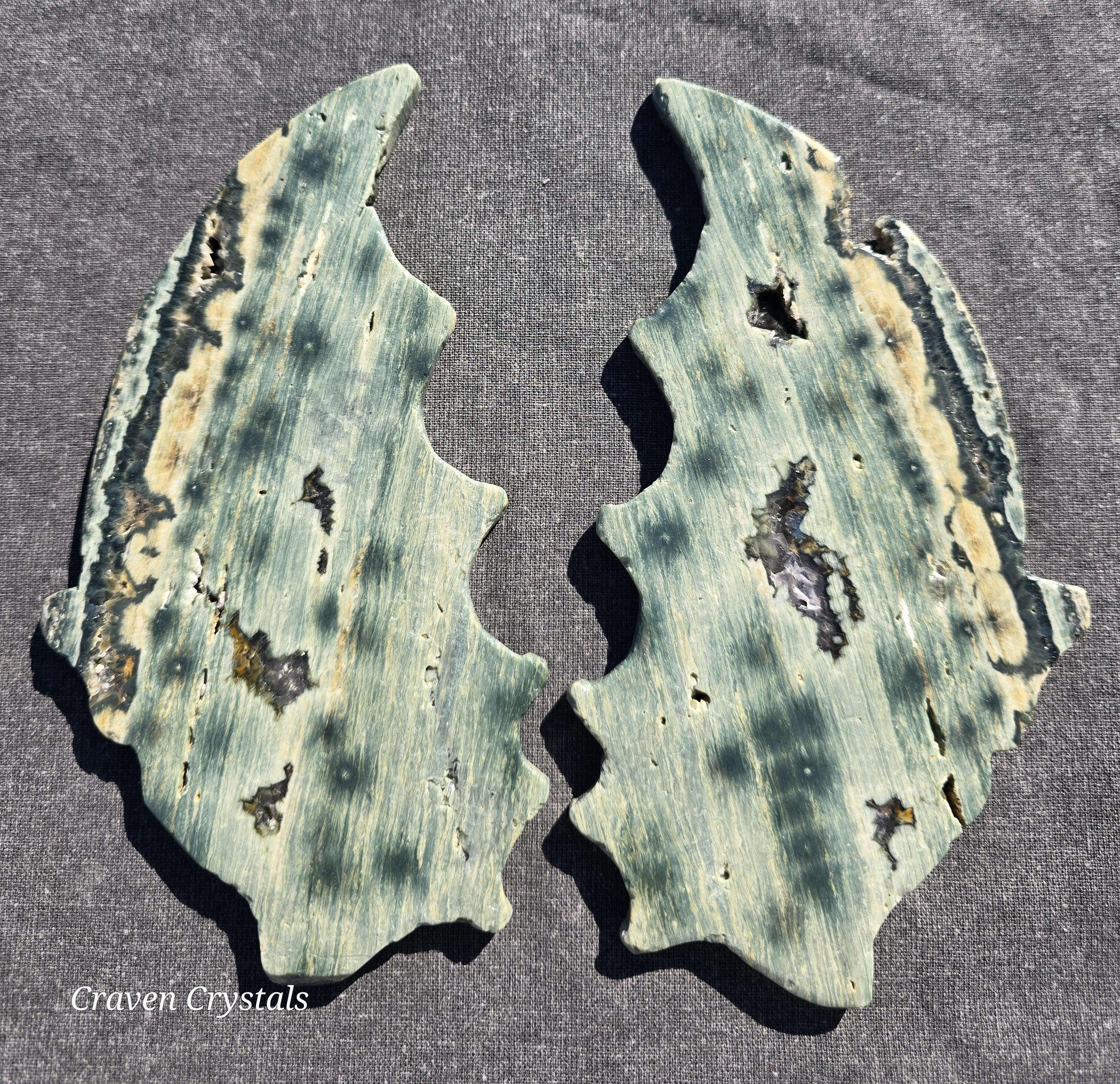 Phenomenal green Orbicular Ocean Jasper Crystal Dragon Wings with sparkly druzy Clear Quartz inclusion.