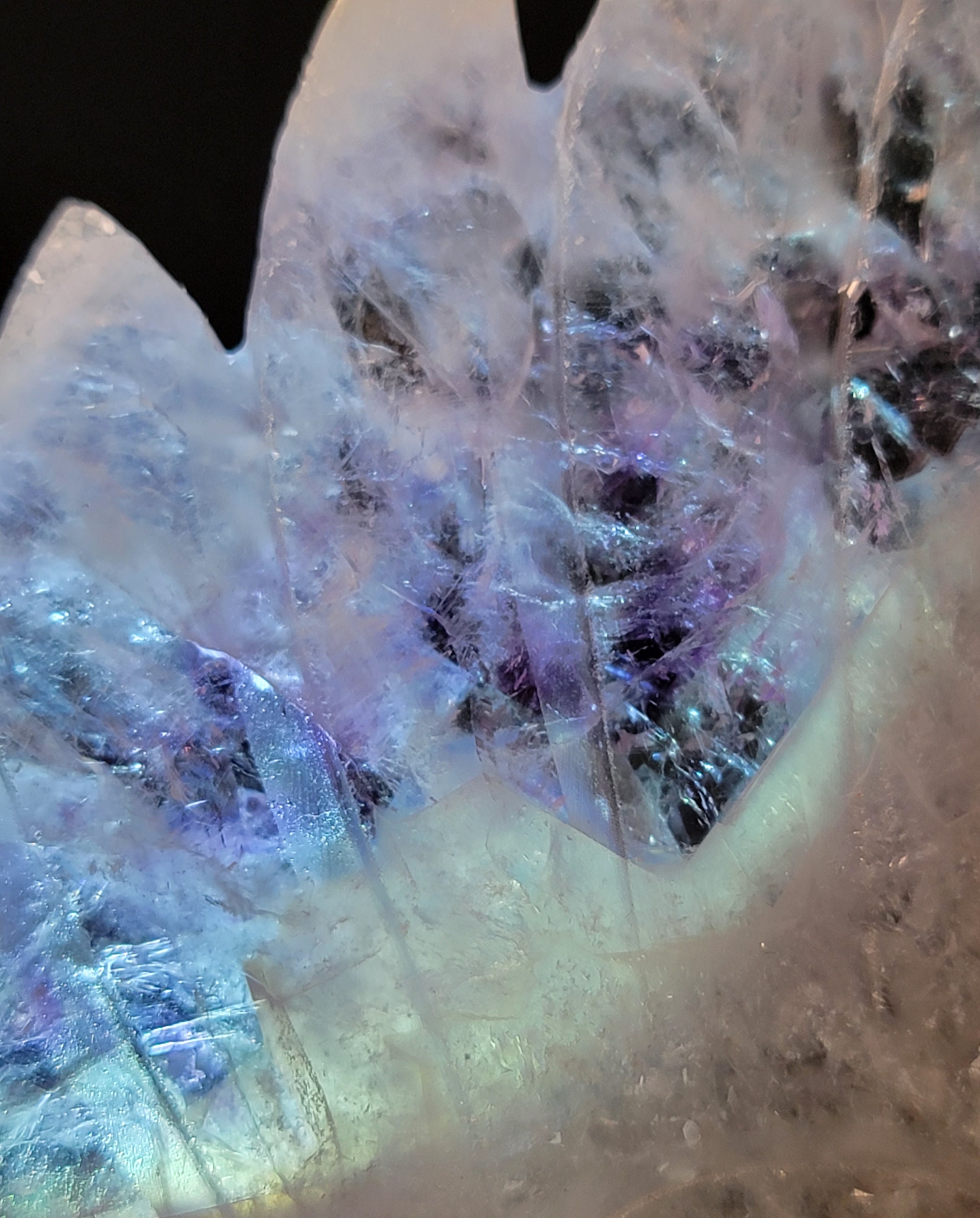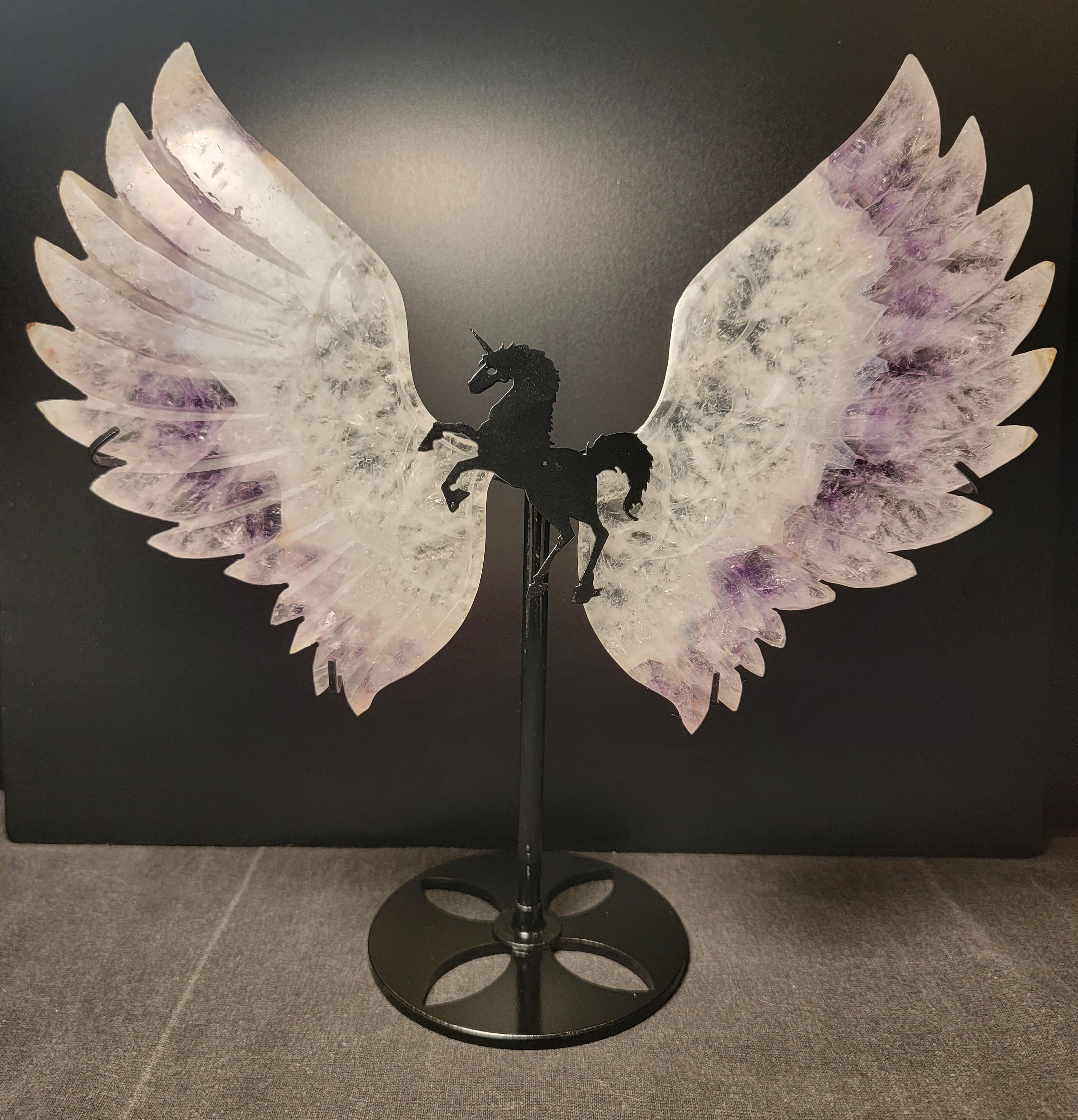 Spectacular Clear Quartz with Amethyst Crystal Wings with rainbows, feathering and what appears to be blue needles. Available with either the Angel/Fairy or Pegasus/Unicorn stands or both if you'd like to have options.
