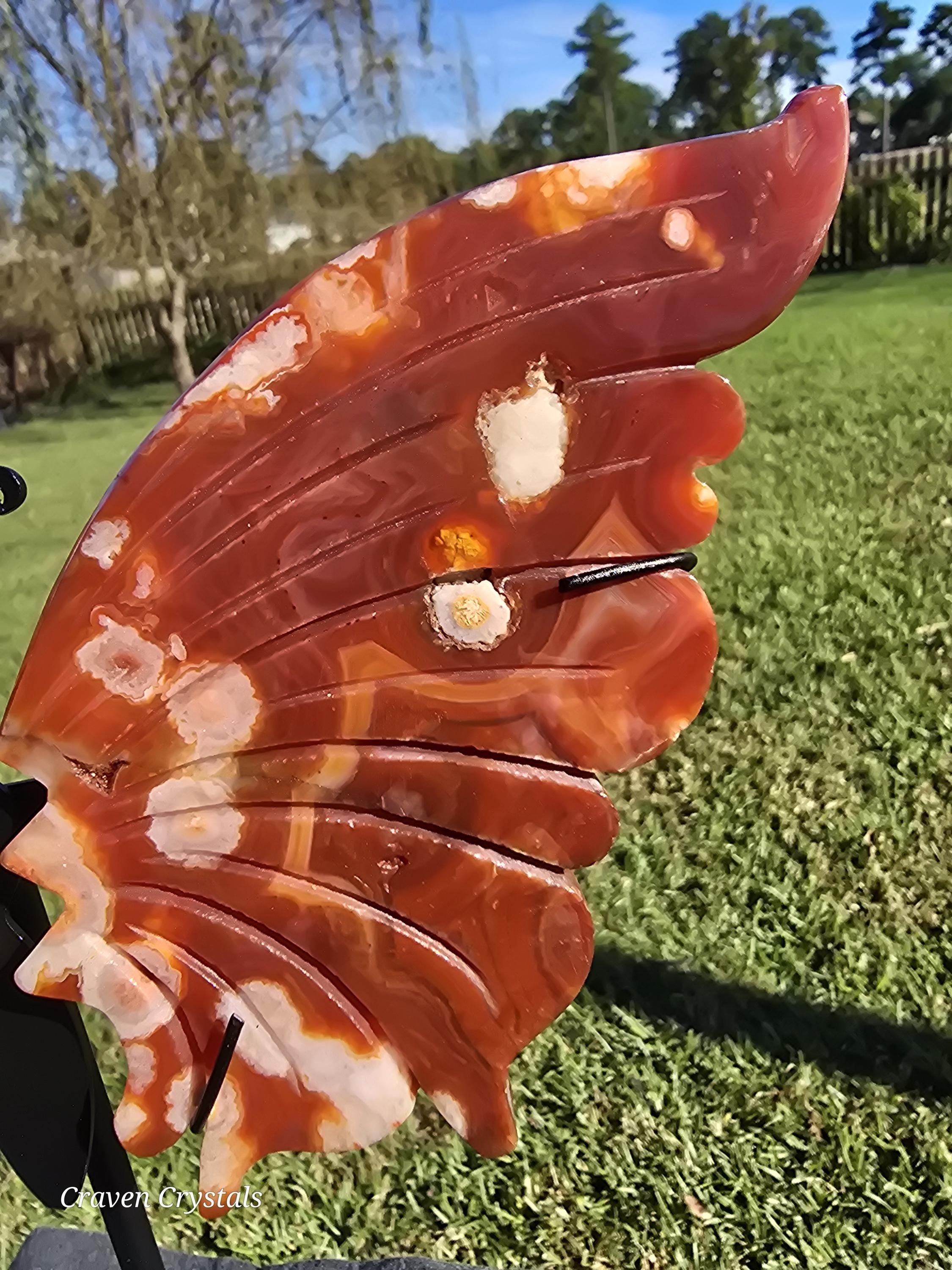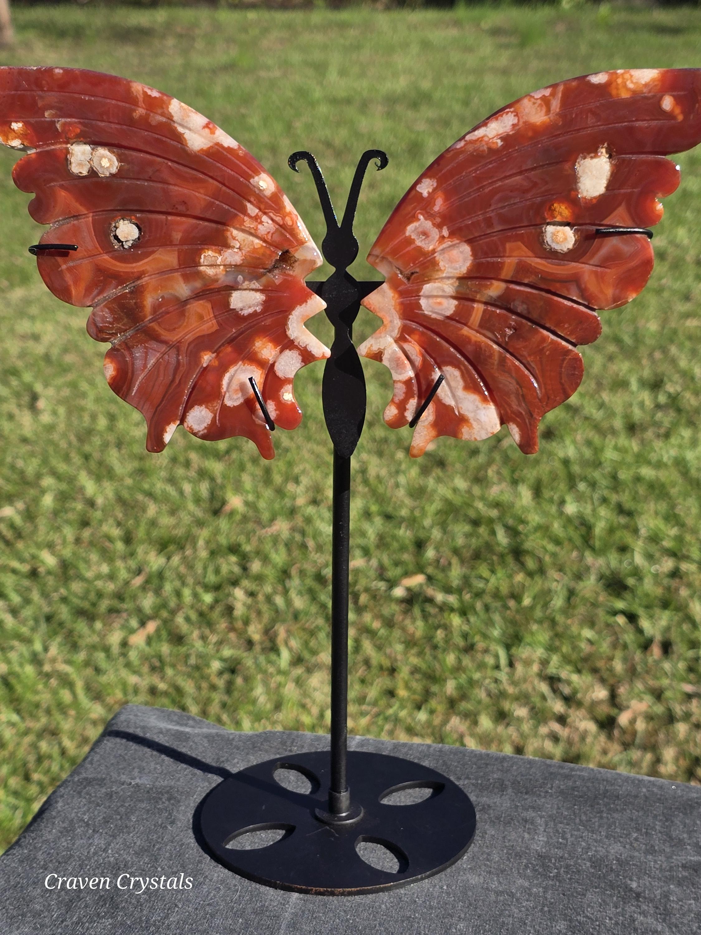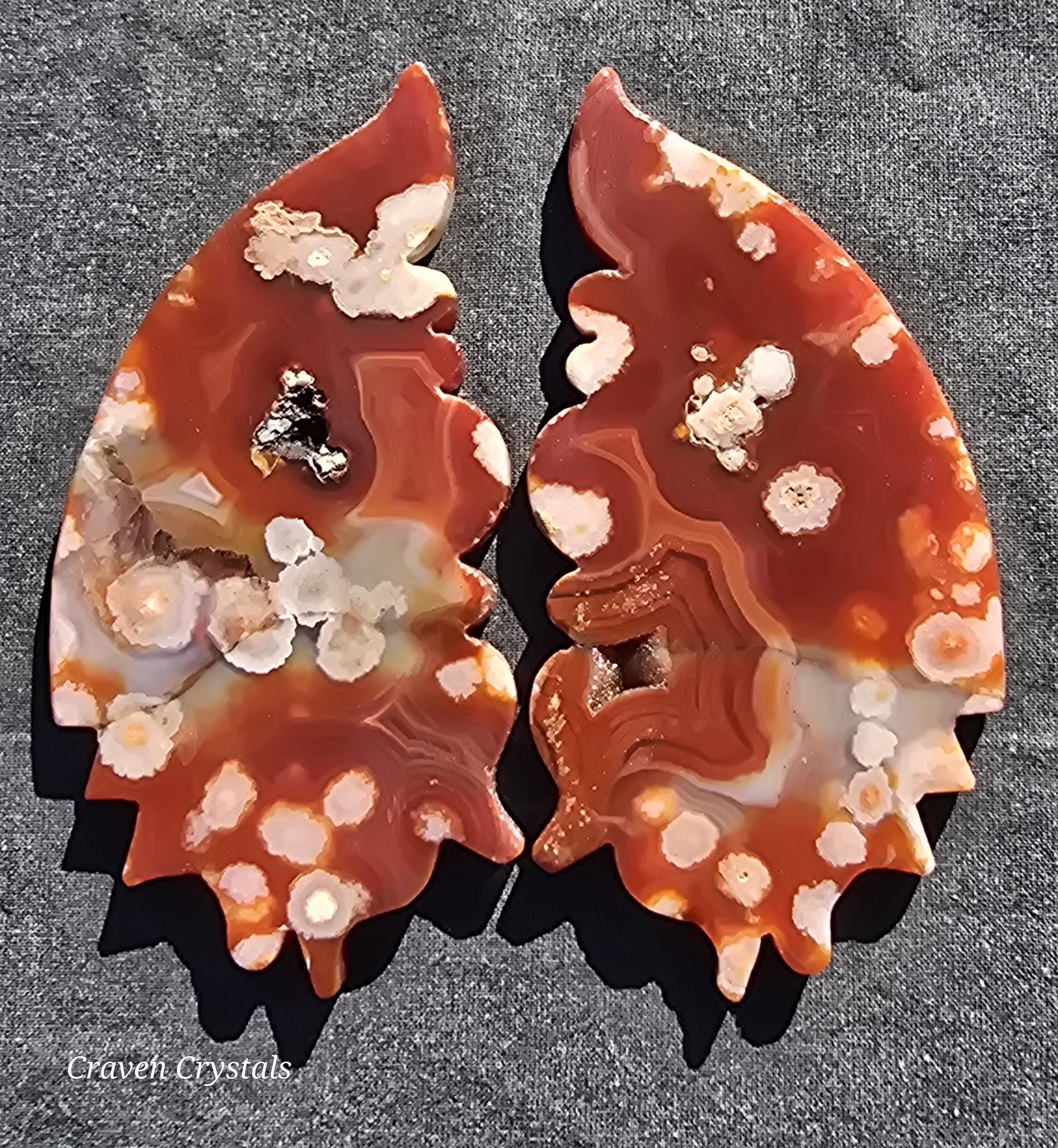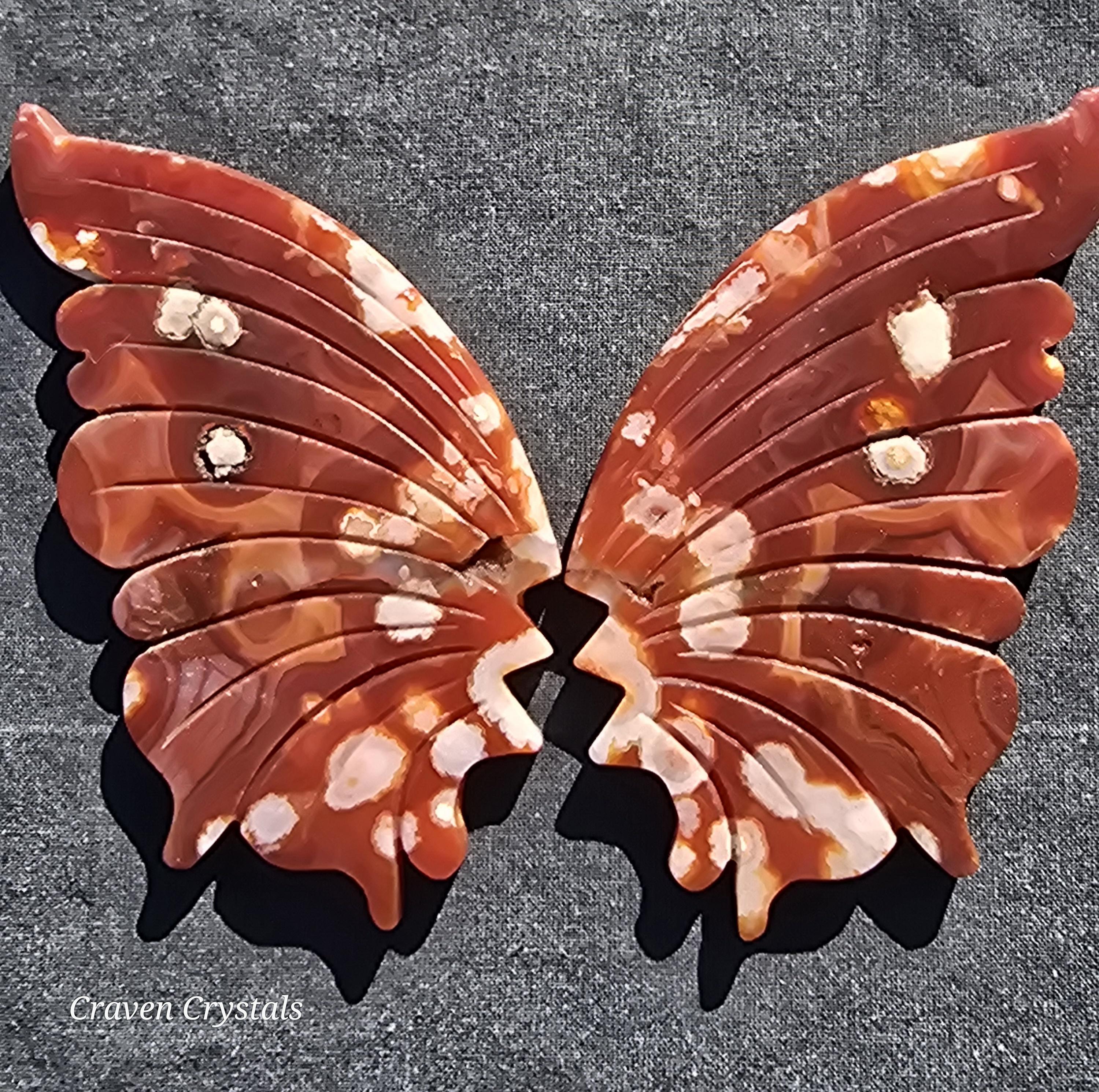 Striking Red Carnelian Flower Agate Crystal Butterfly Wings with deep red banding, white flowers and both sparkly and non sparkly drusy.
