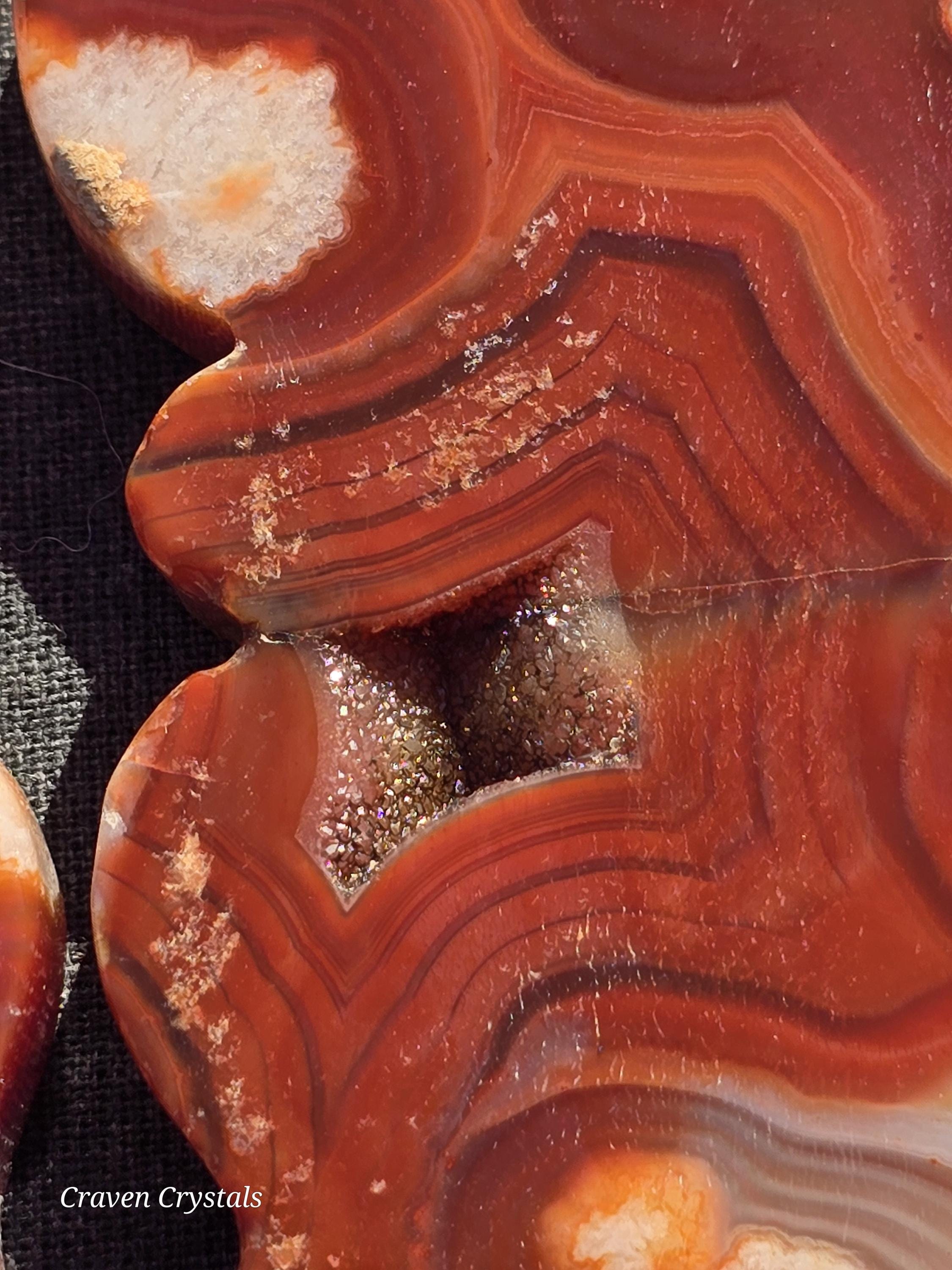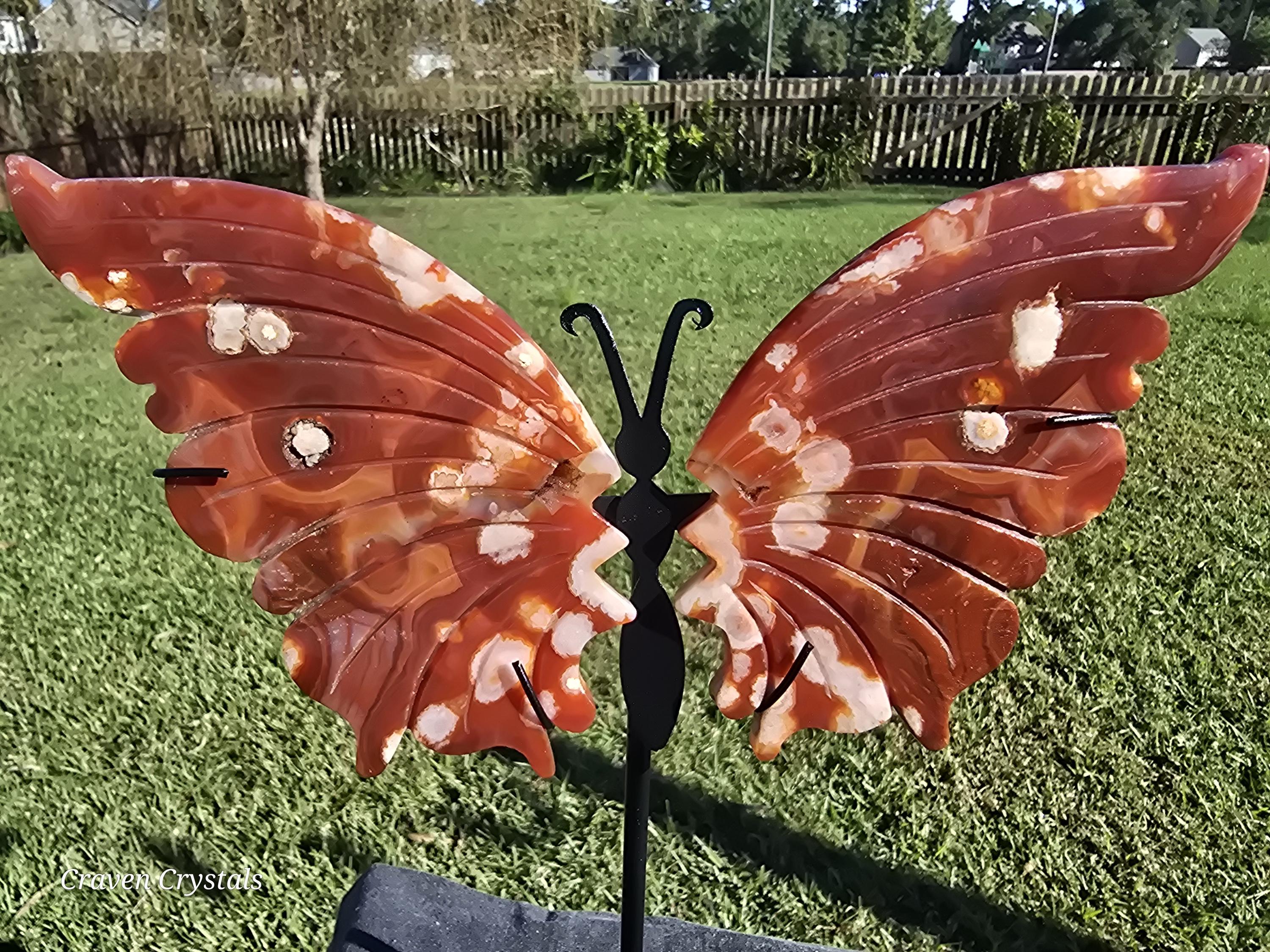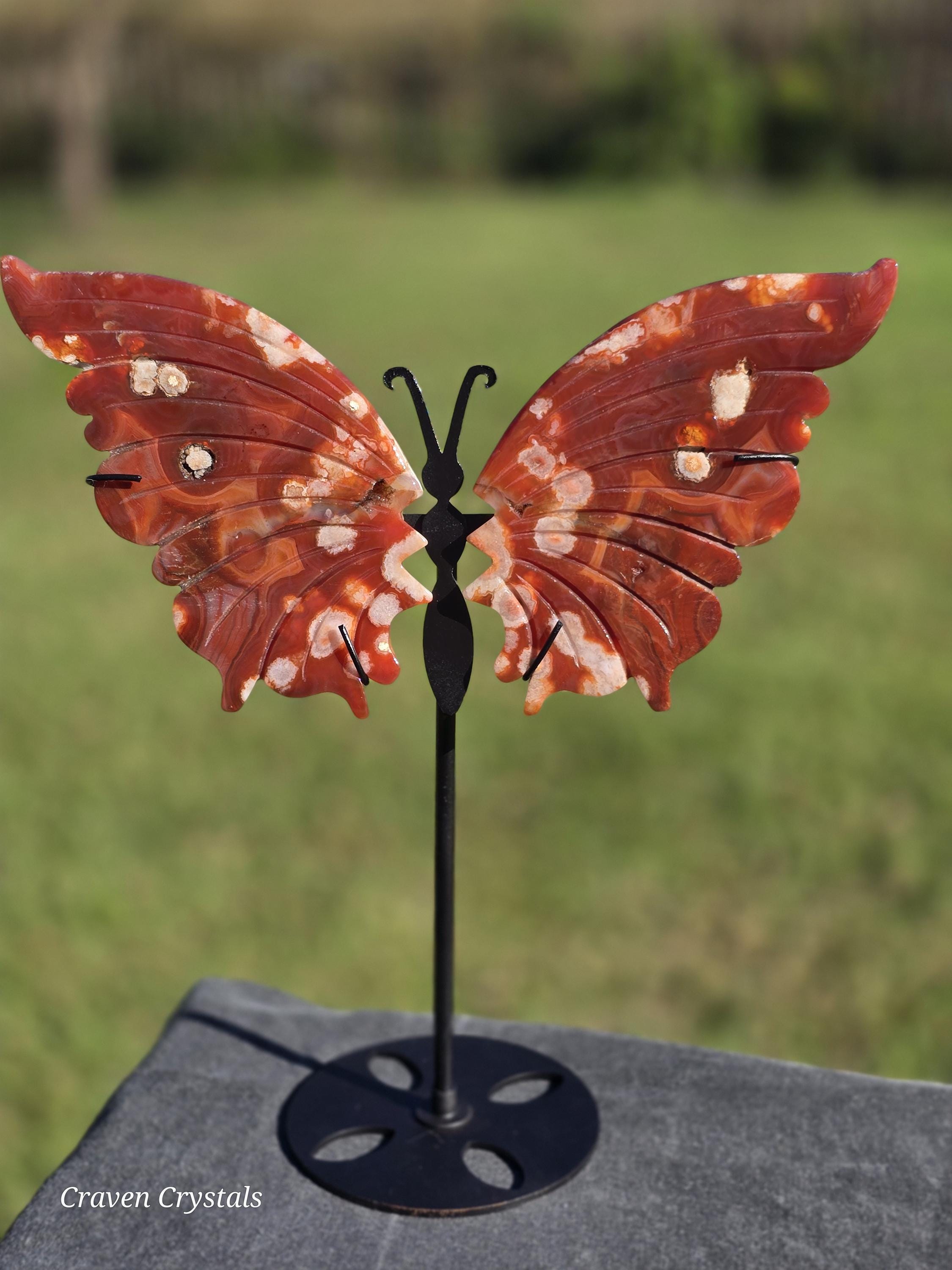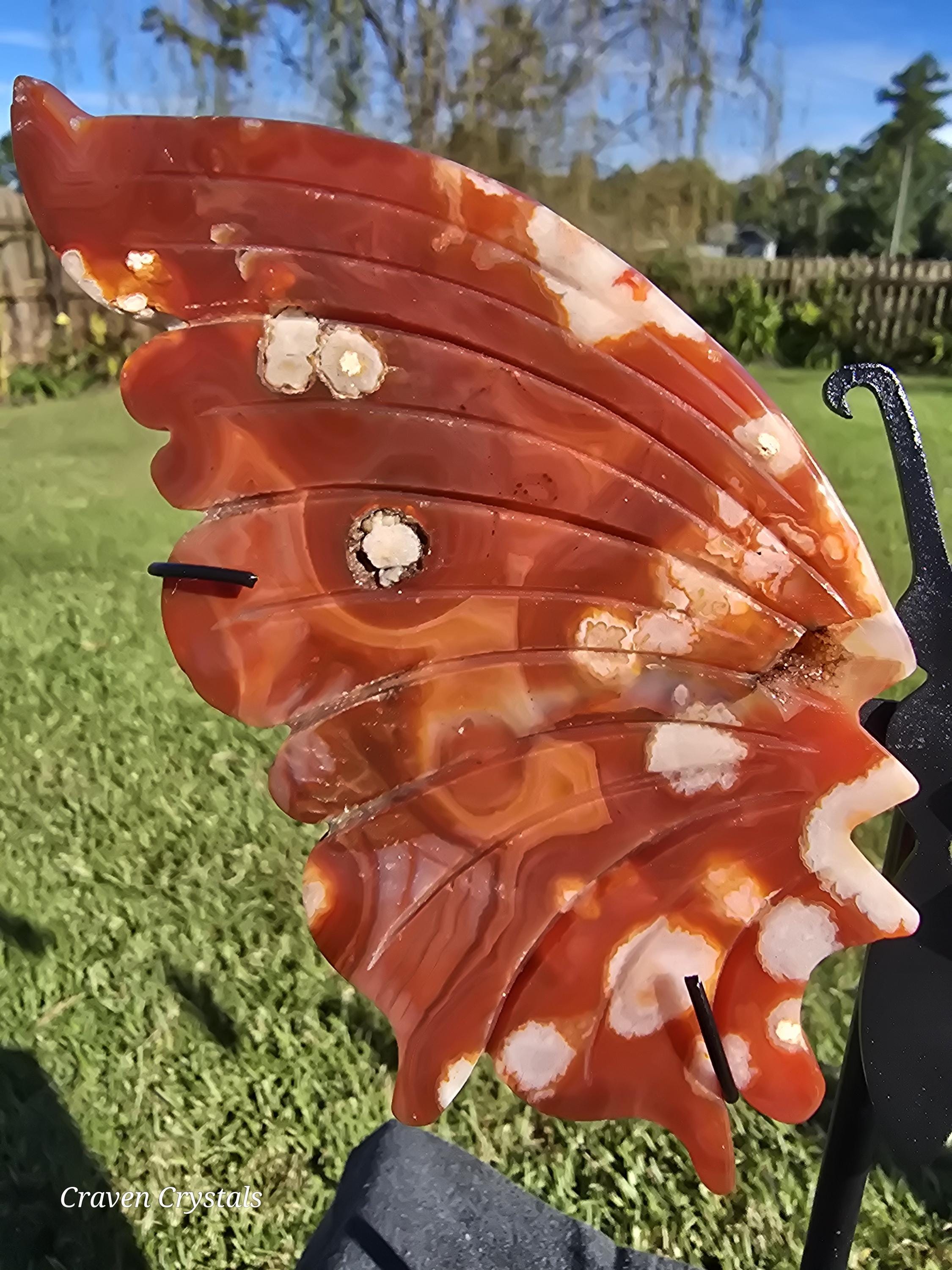 Striking Red Carnelian Flower Agate Crystal Butterfly Wings with deep red banding, white flowers and both sparkly and non sparkly drusy.