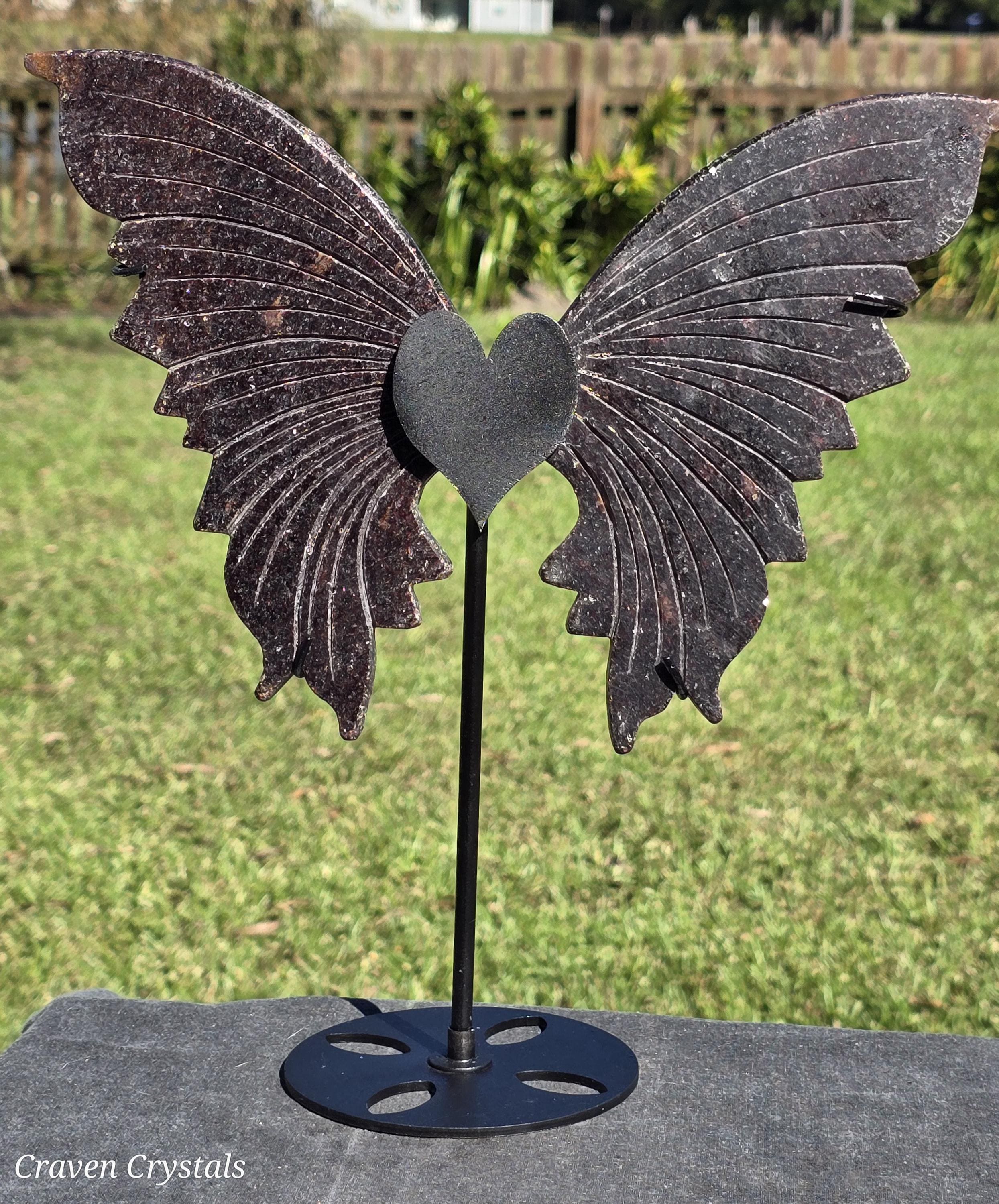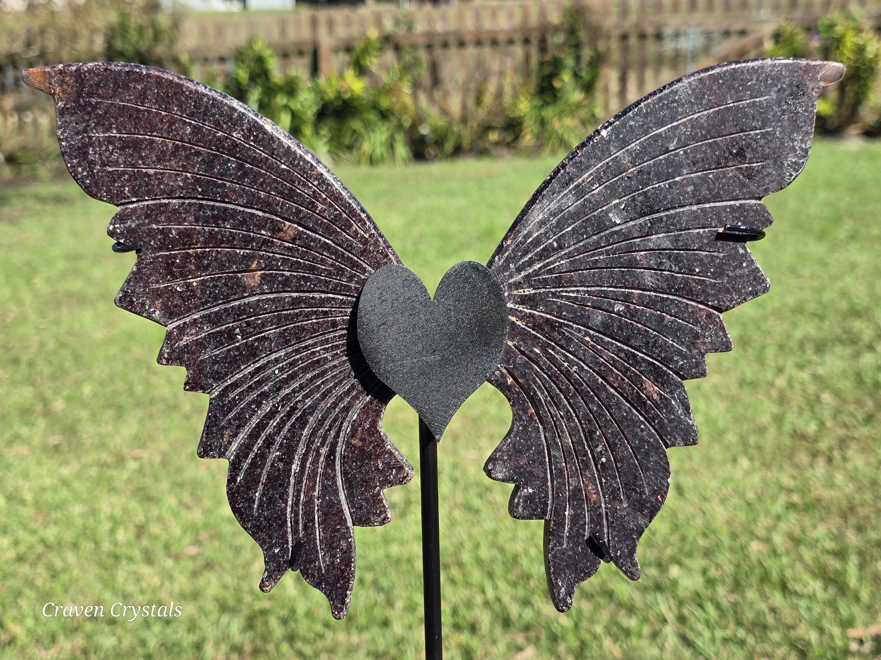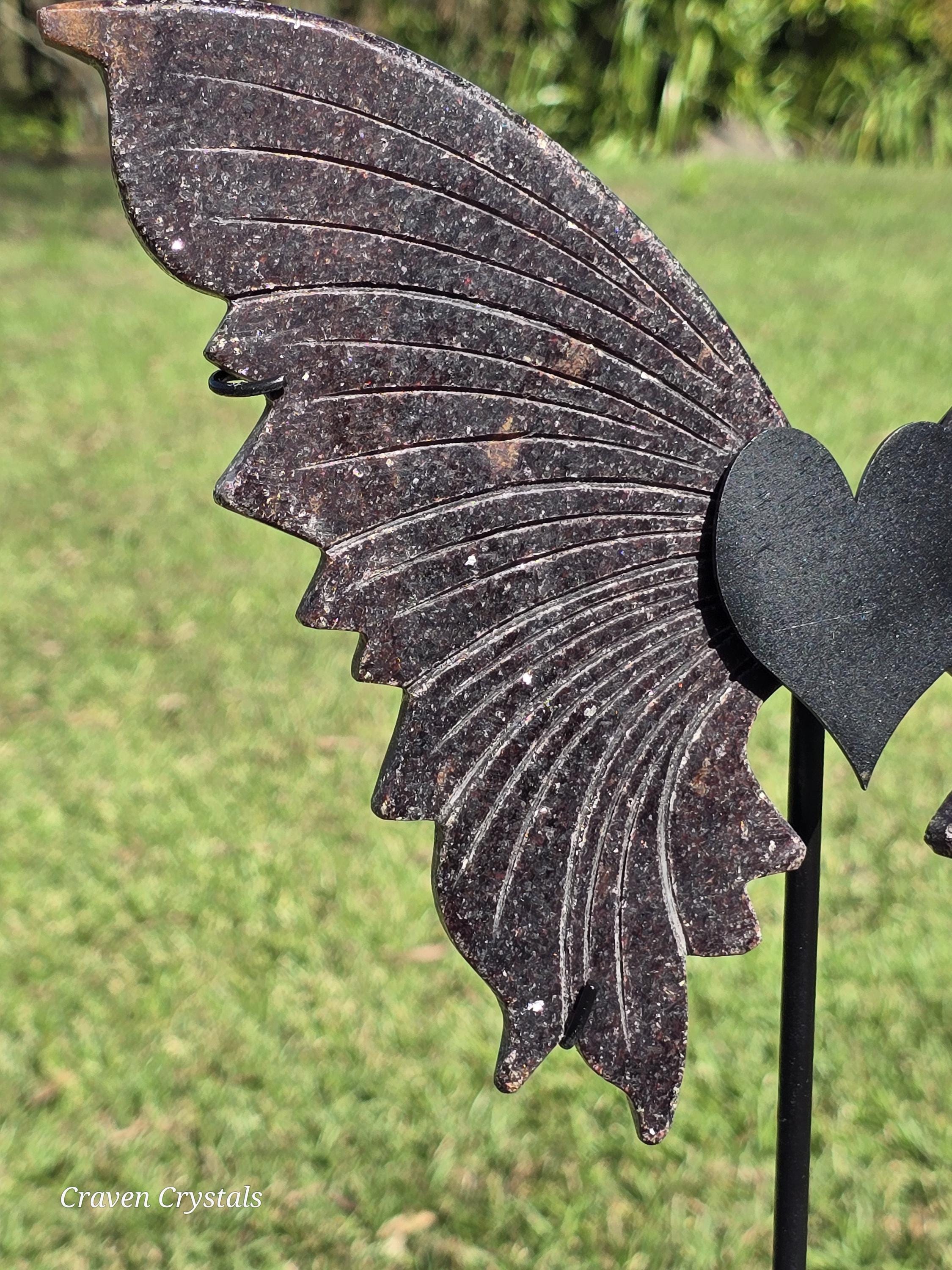 Sparkly deep Red Mica Crystal Butterfly Wings on a heart stand