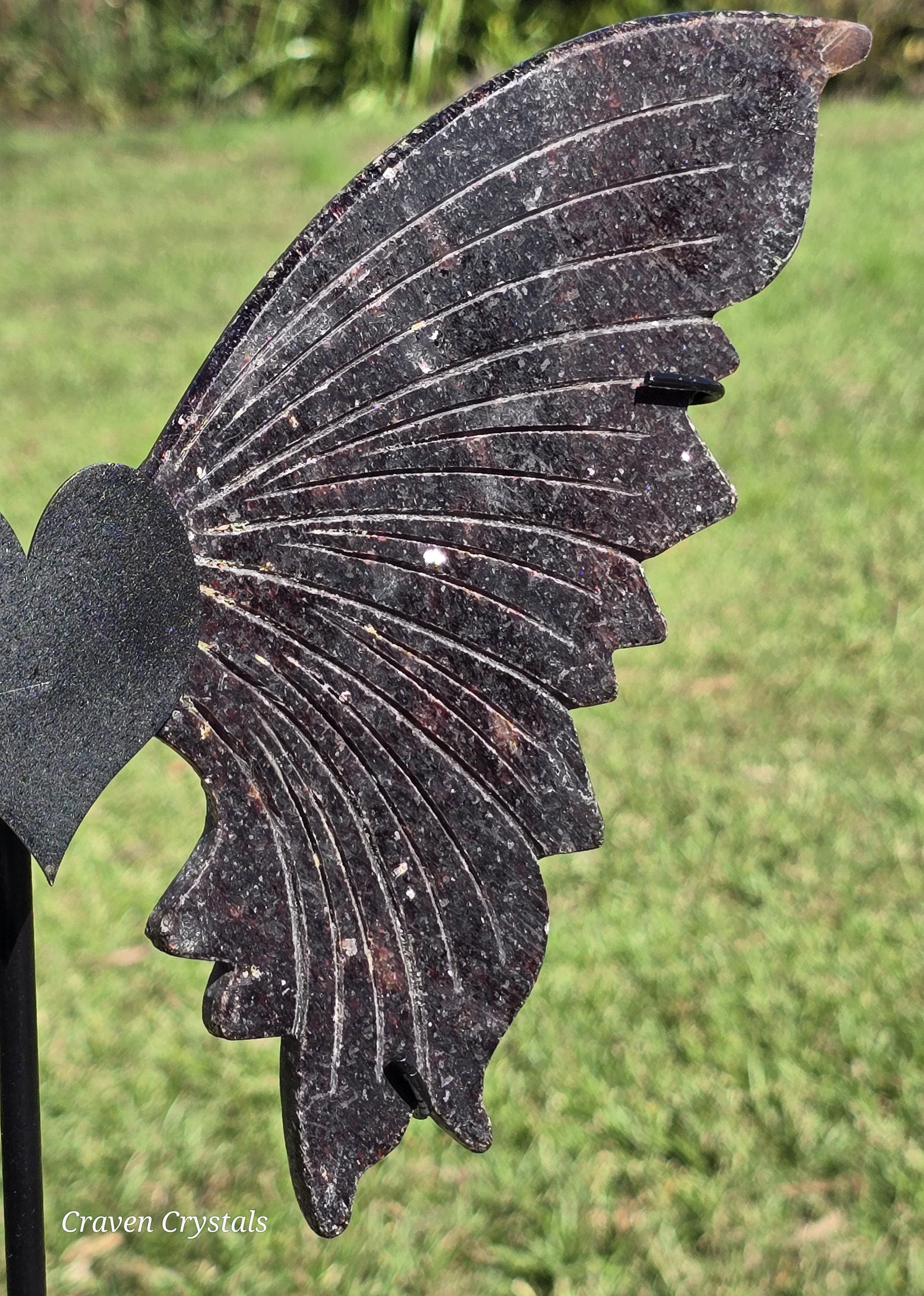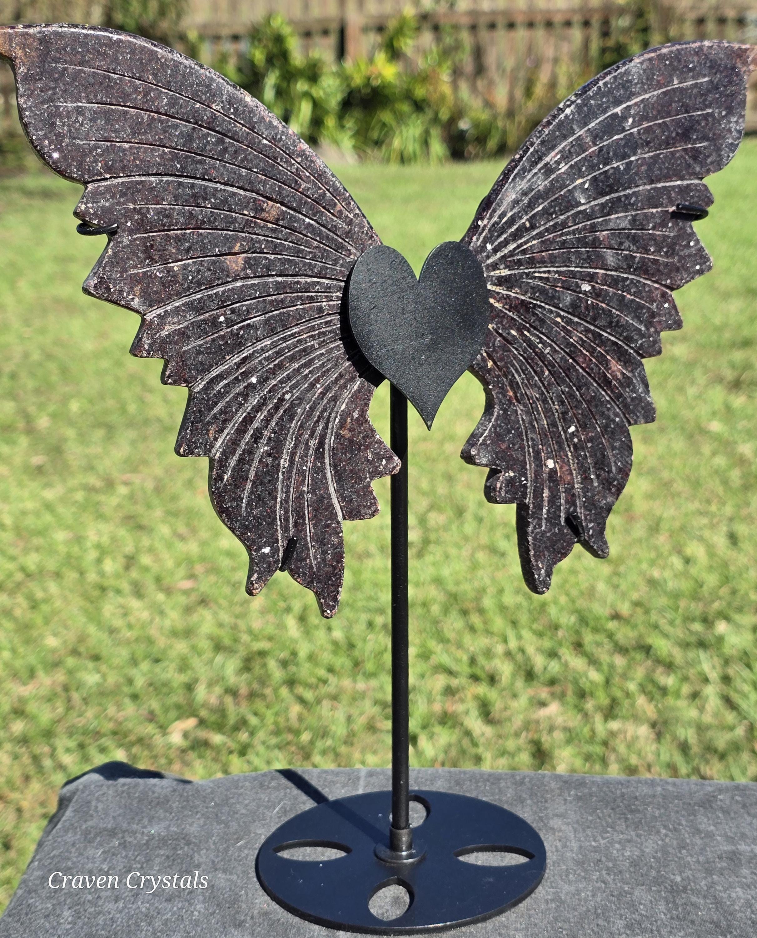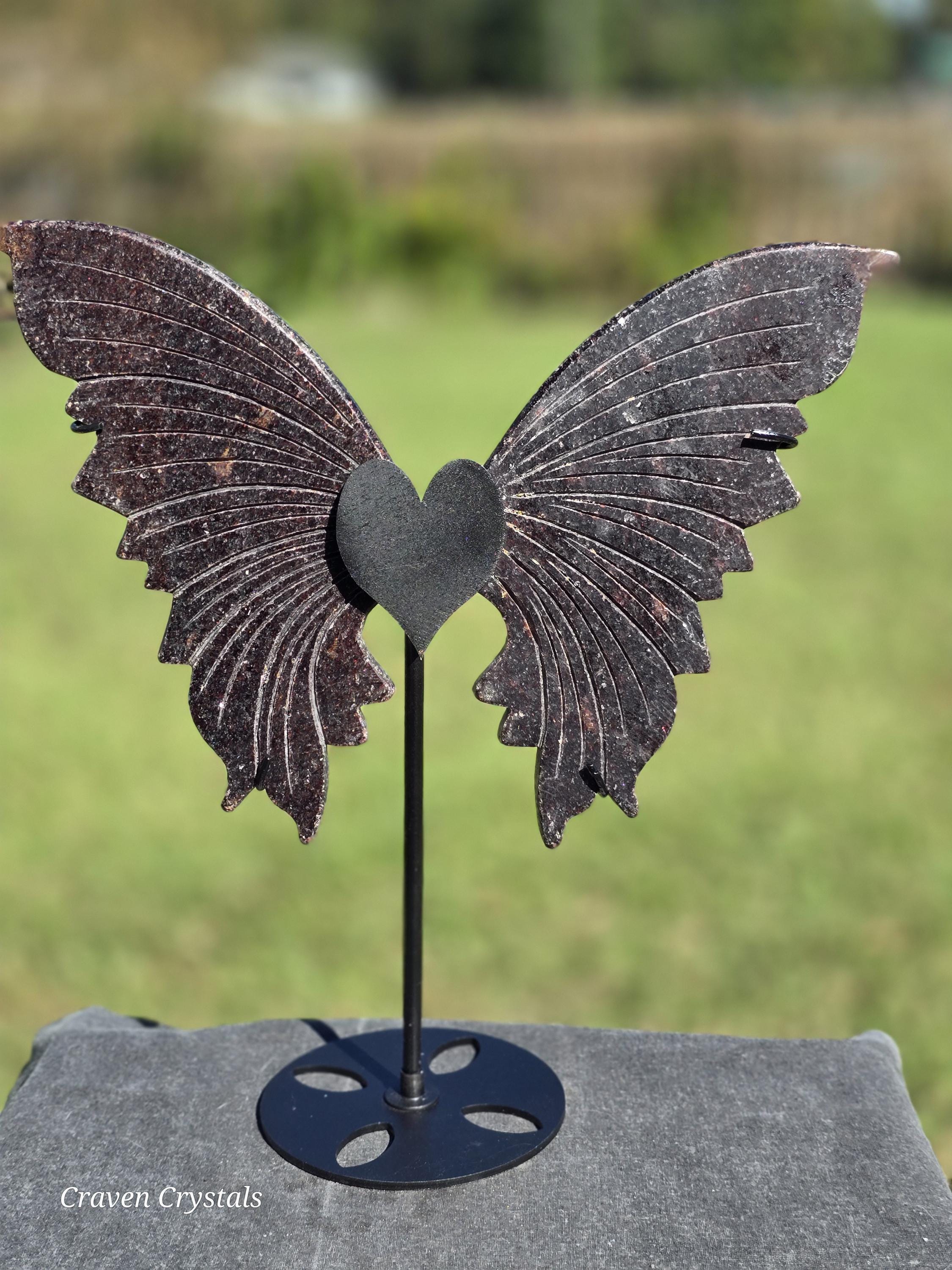 Sparkly deep Red Mica Crystal Butterfly Wings on a heart stand