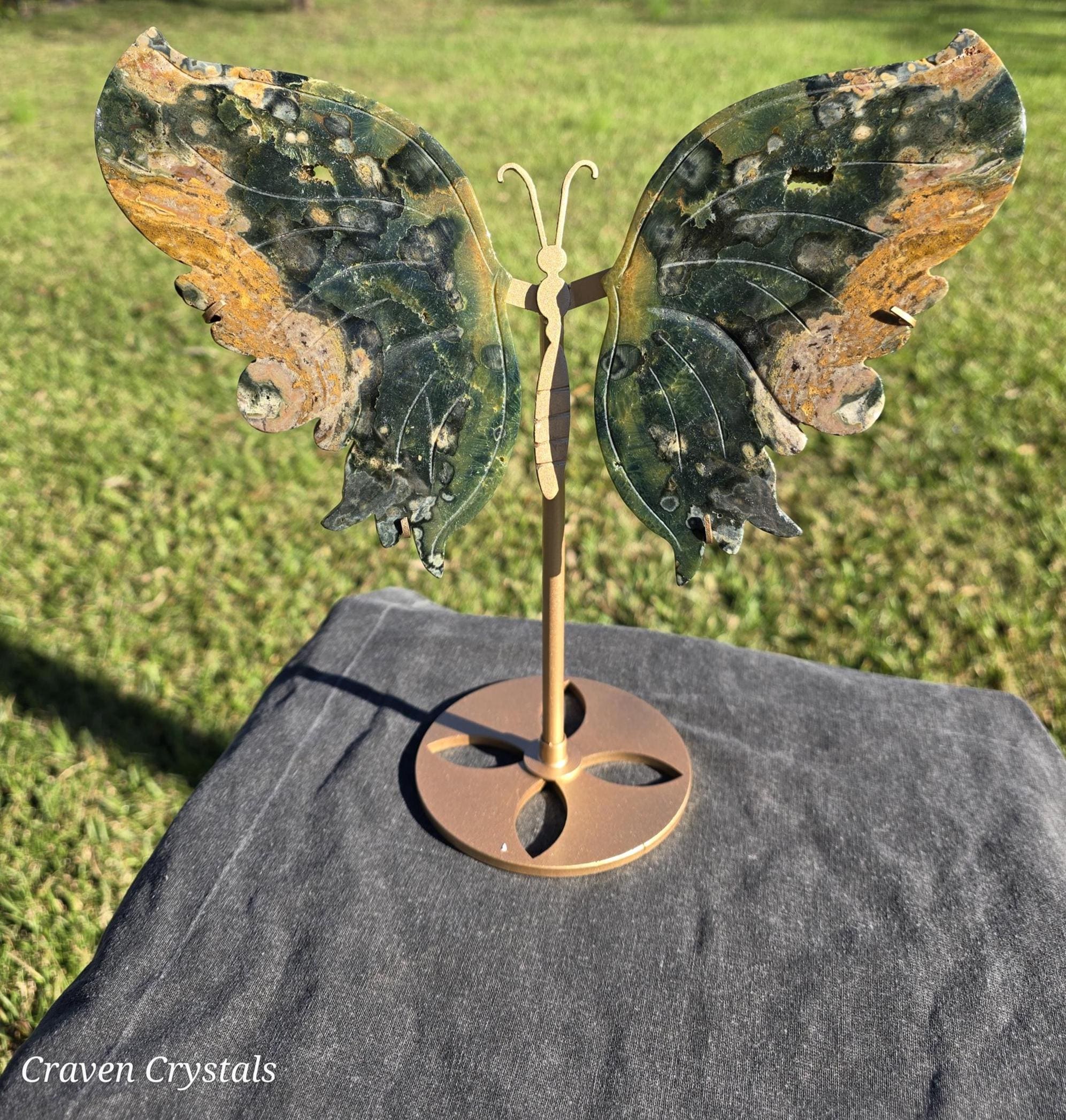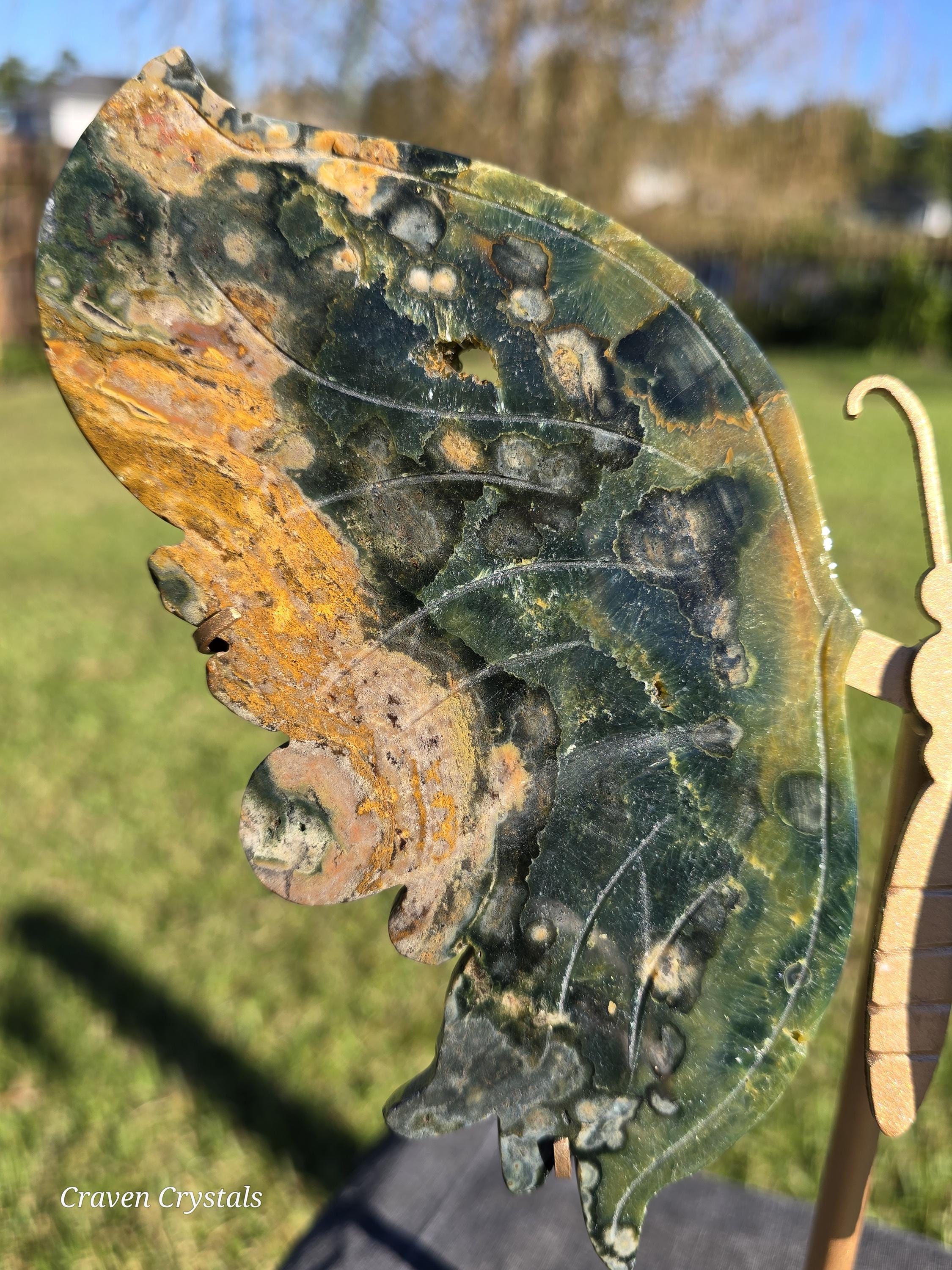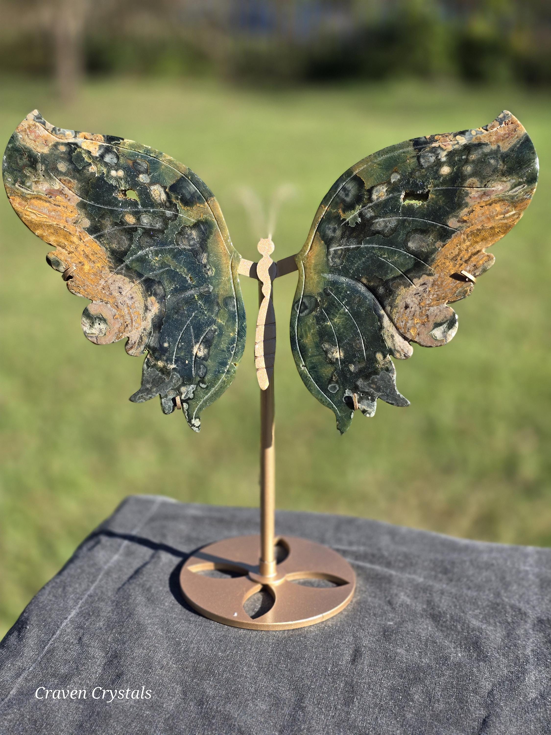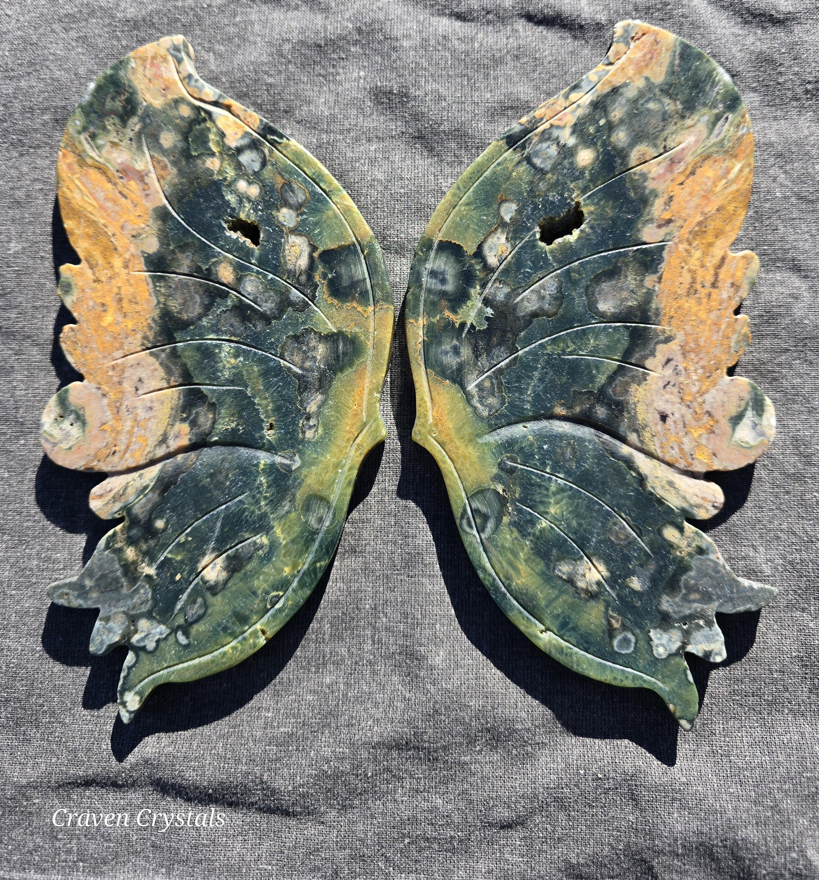 Outstanding Orbicular Ocean Jasper Crystal Butterfly Wings with beautiful greens, yellows and browns giving them an almost camouflage appearance. Drusy pocket on both wings