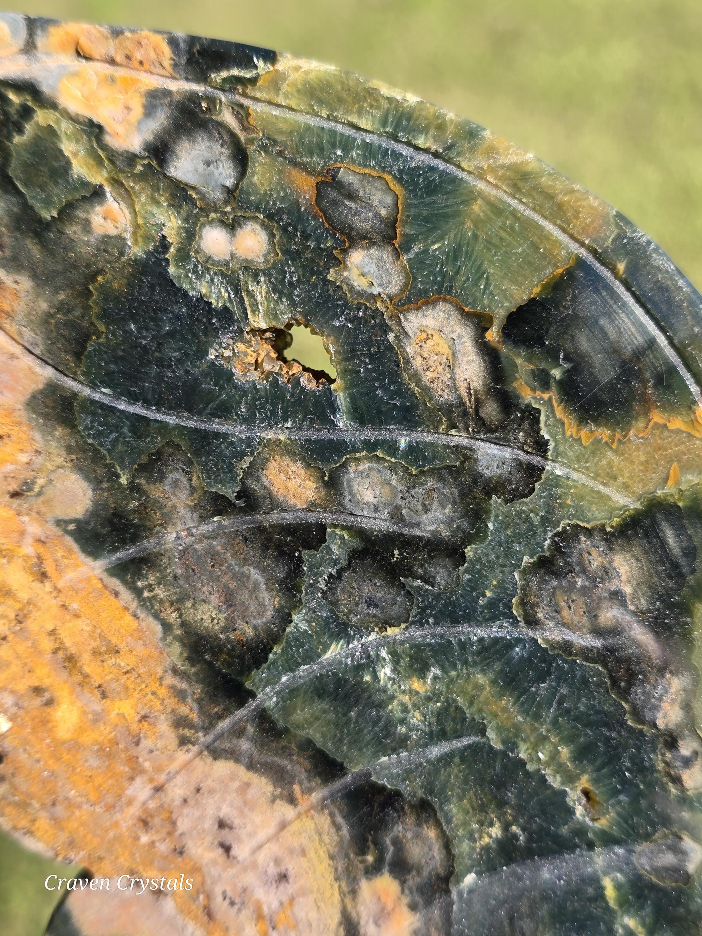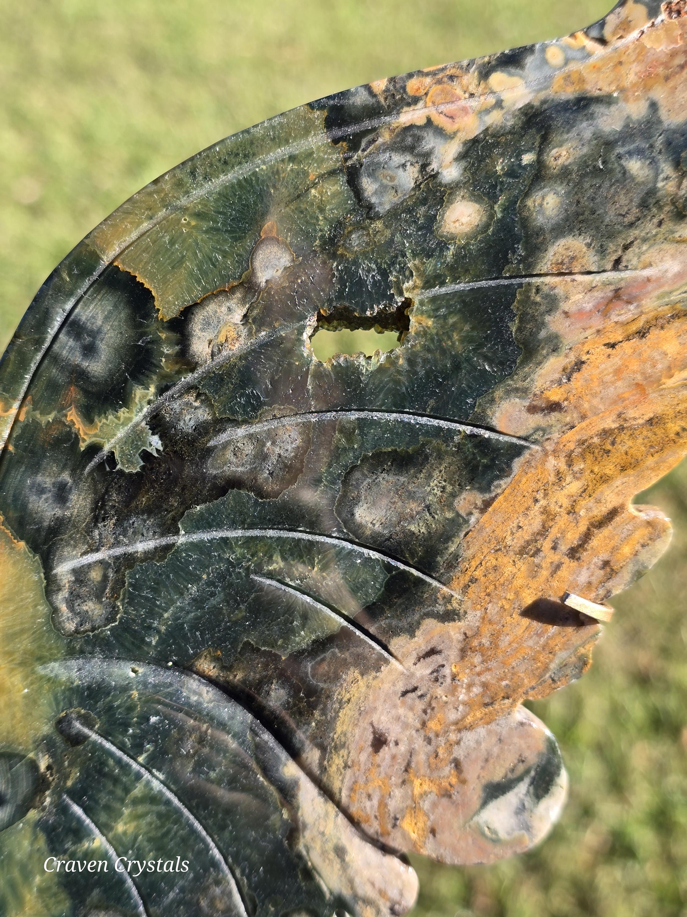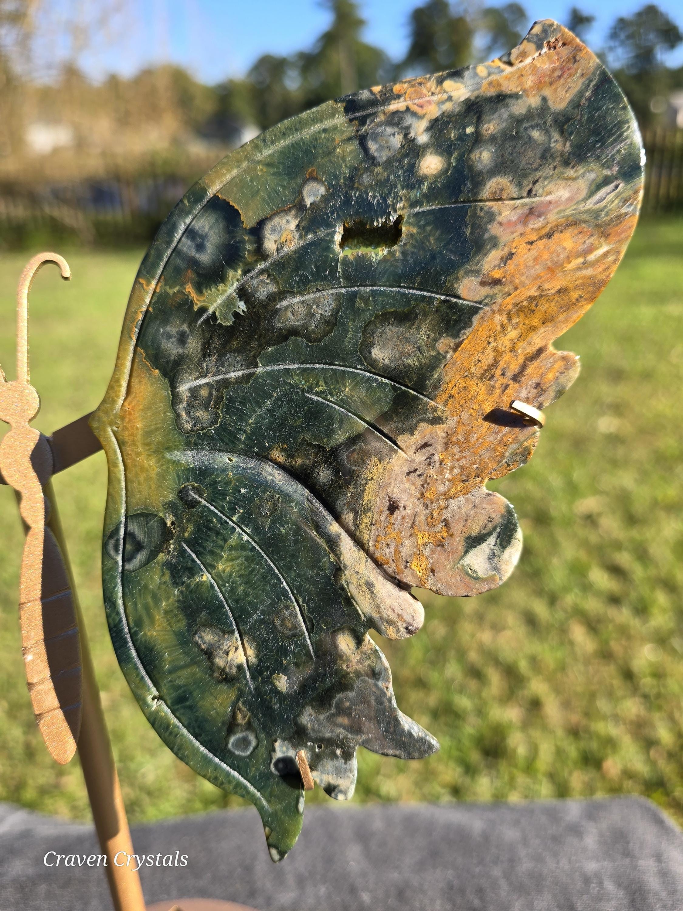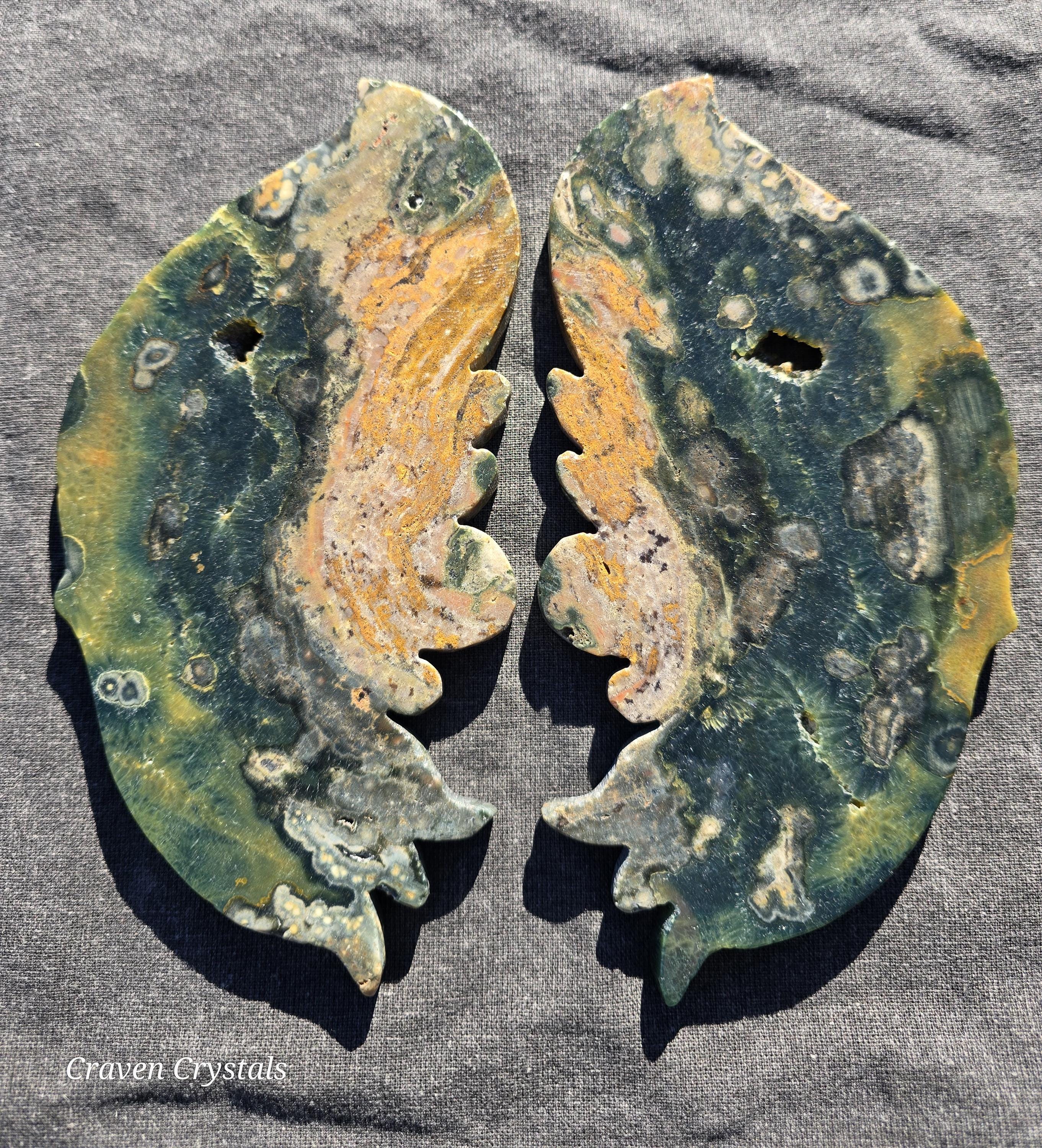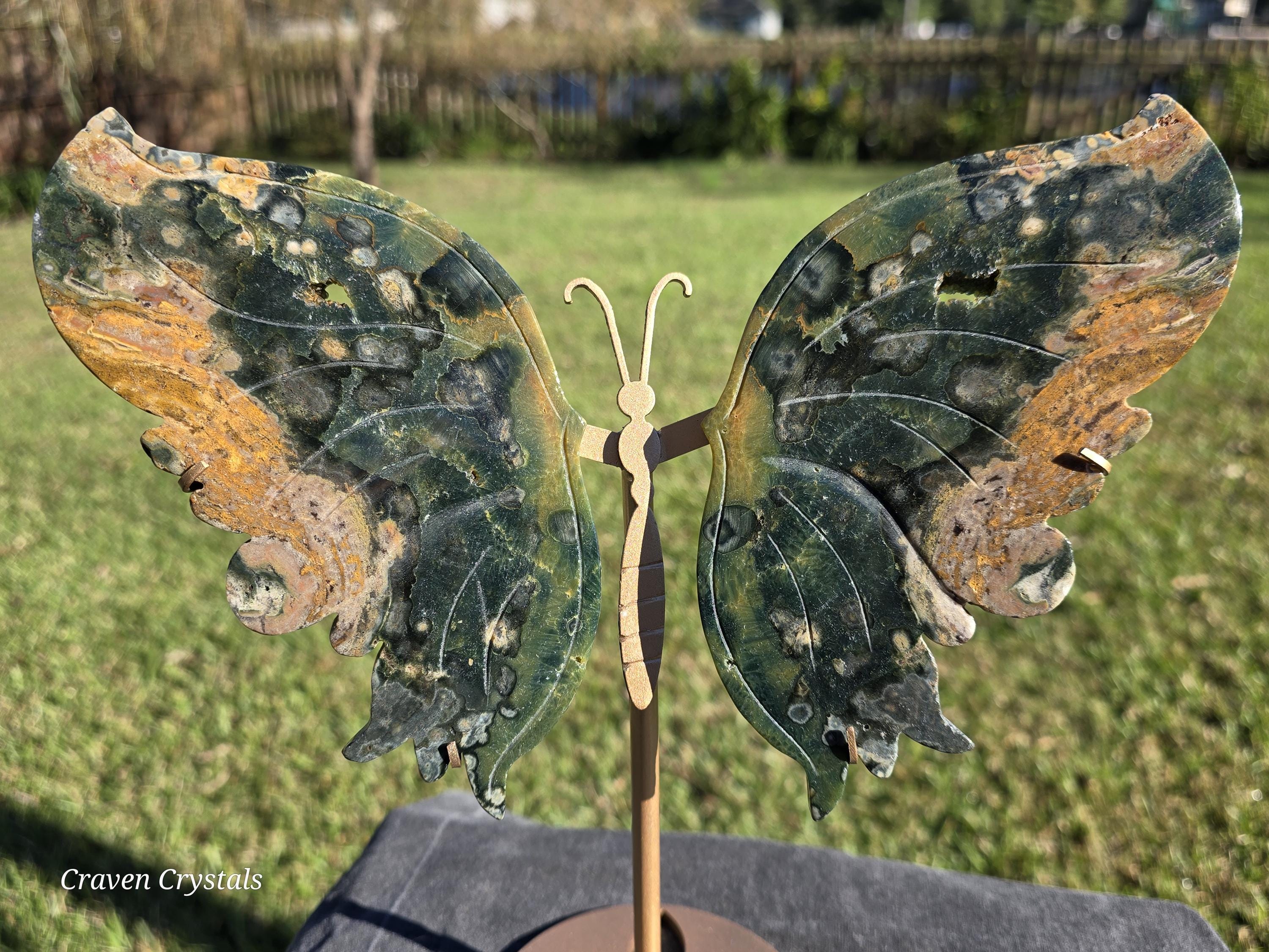 Outstanding Orbicular Ocean Jasper Crystal Butterfly Wings with beautiful greens, yellows and browns giving them an almost camouflage appearance. Drusy pocket on both wings