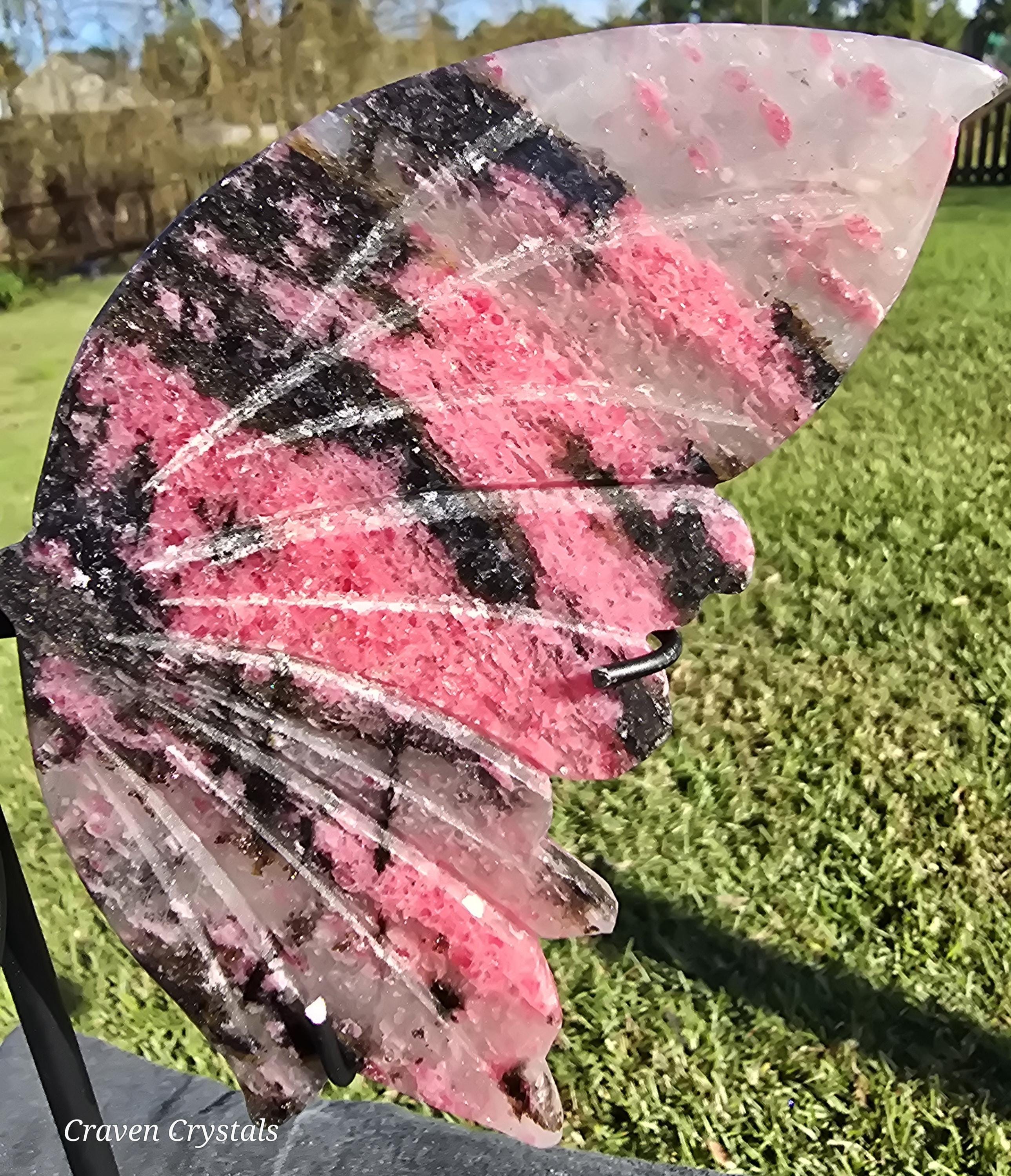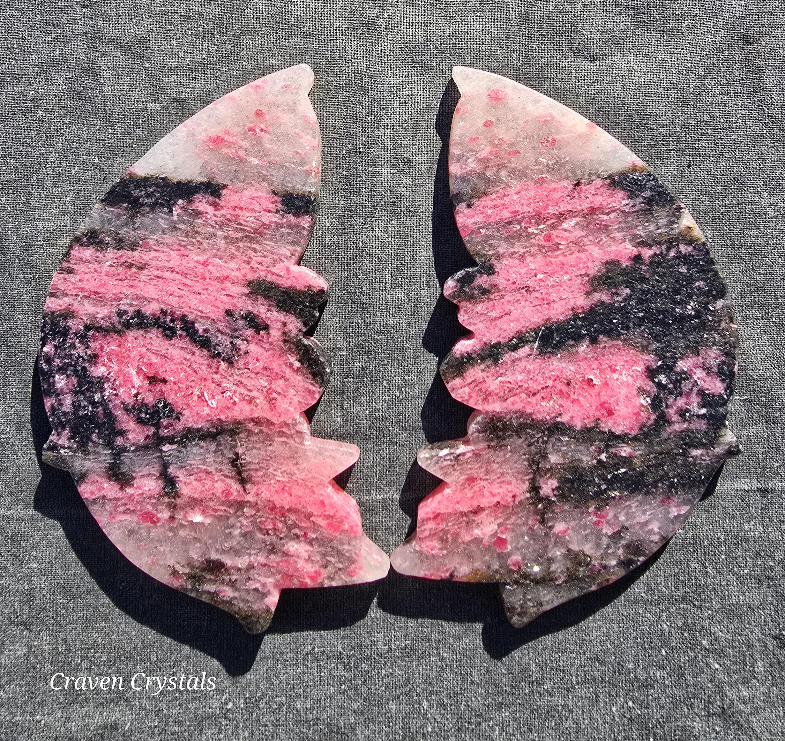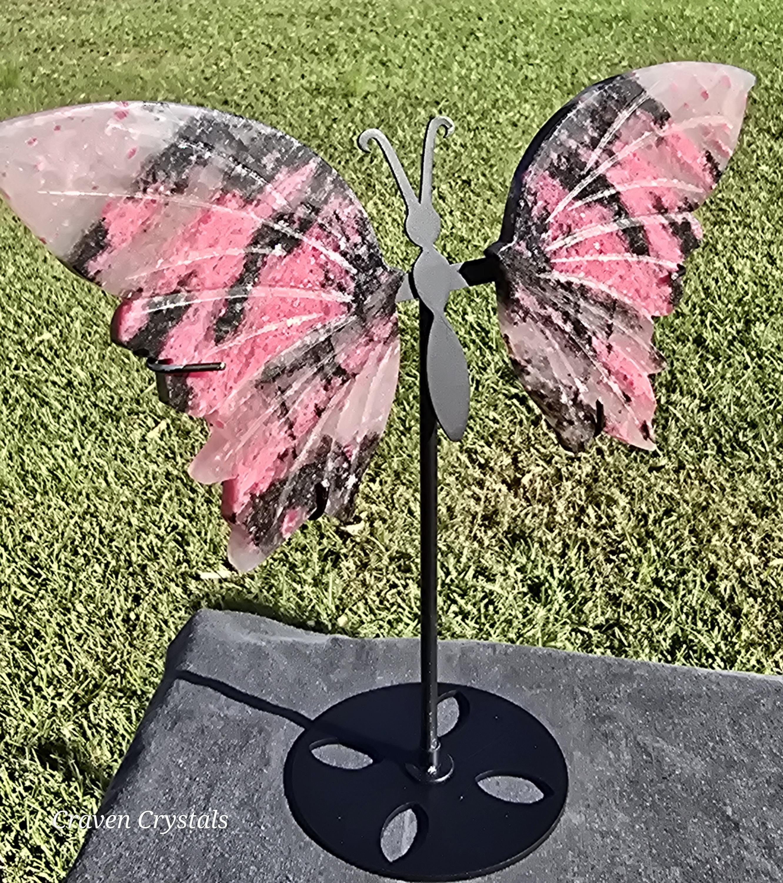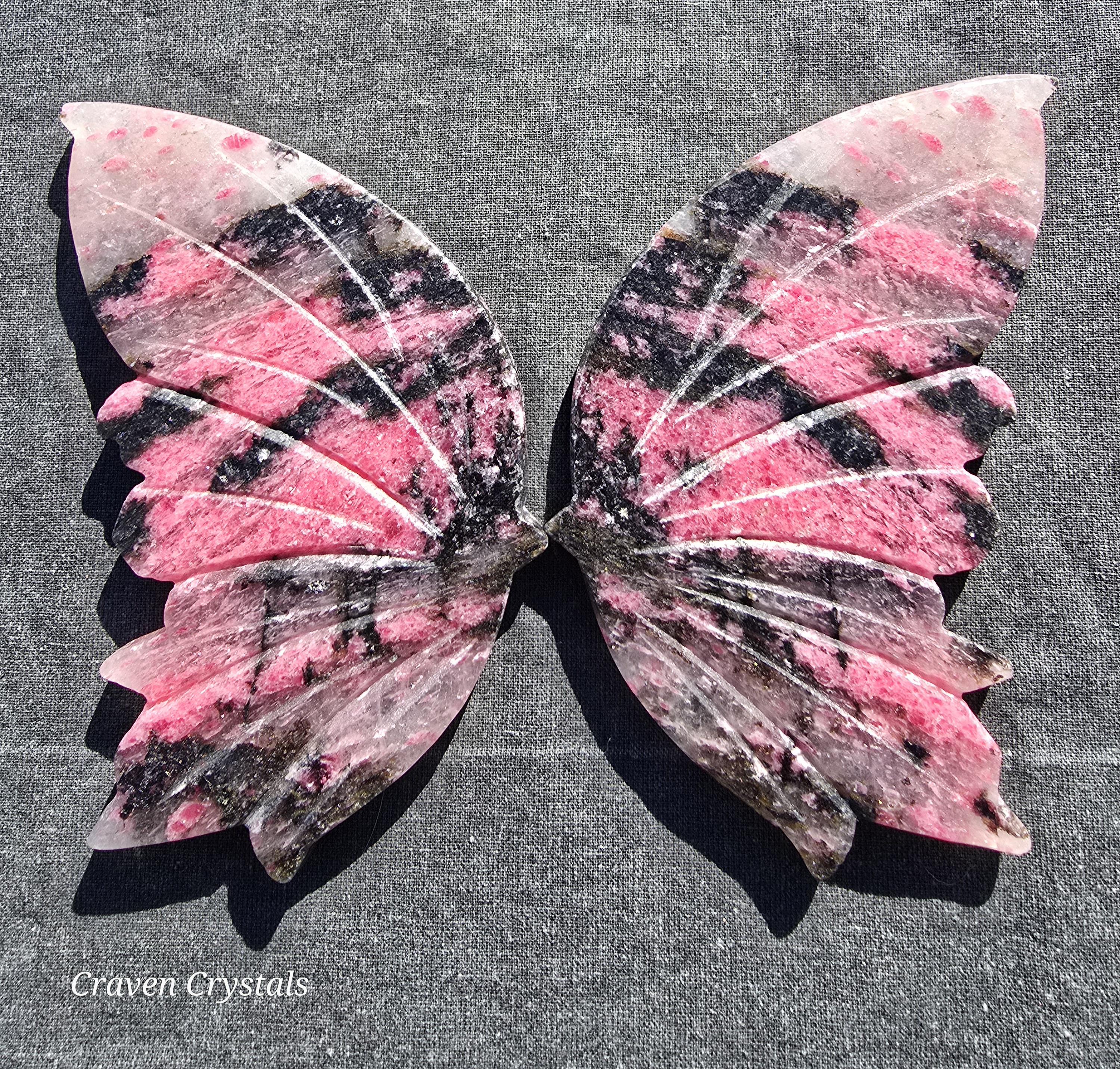 Beautiful mauve-pink Ice Rhodonite Crystal Butterfly Wings with Clear Quartz and stunning sparkle. These almost have a tiger stripe pattern.