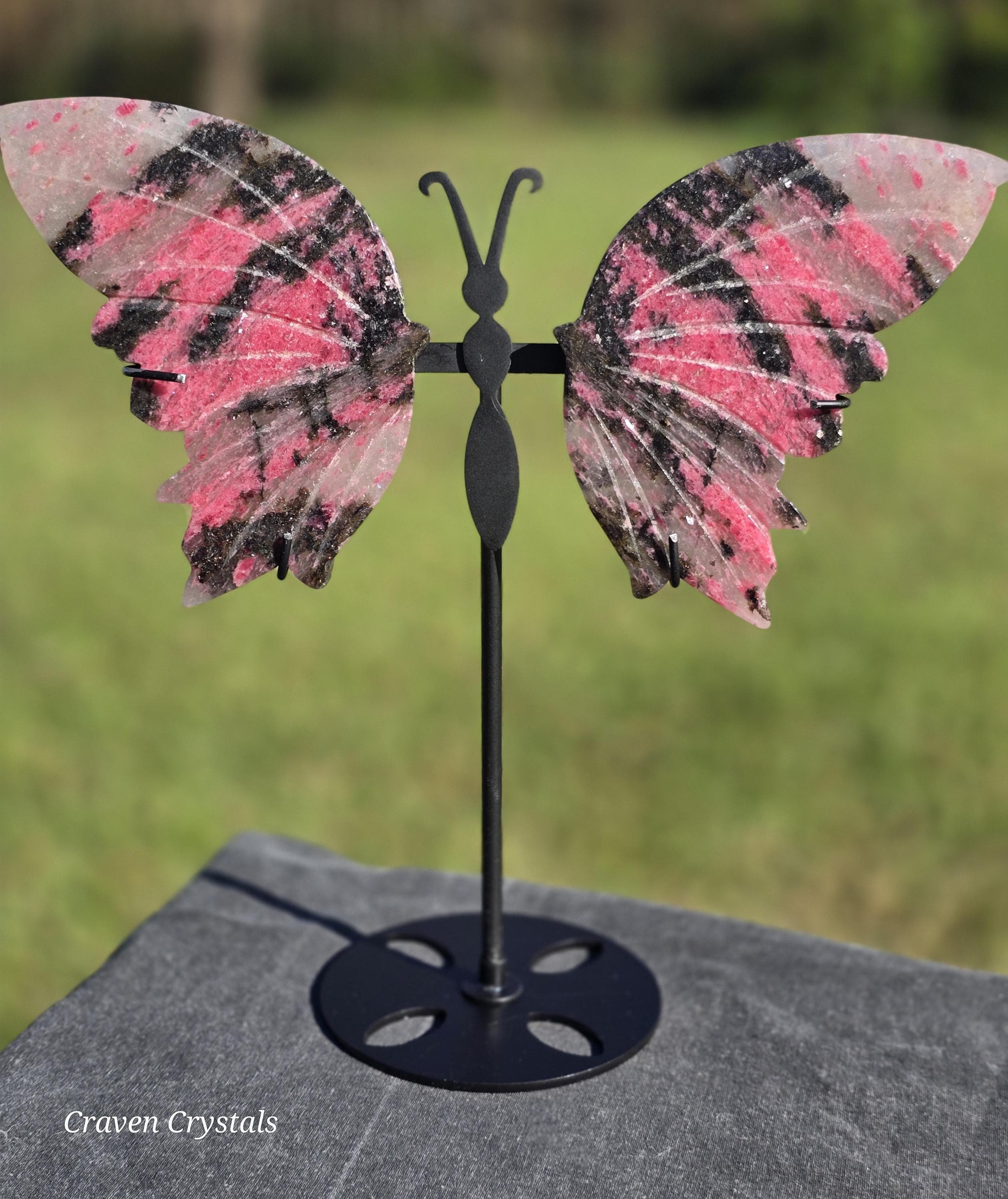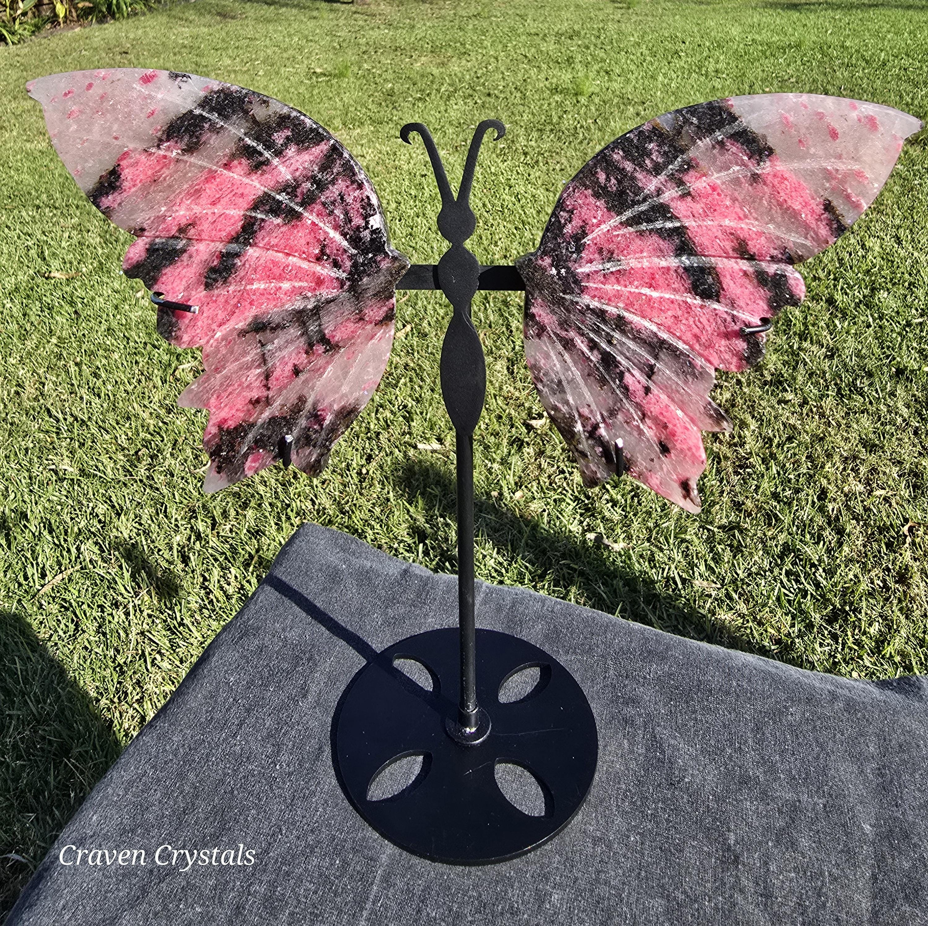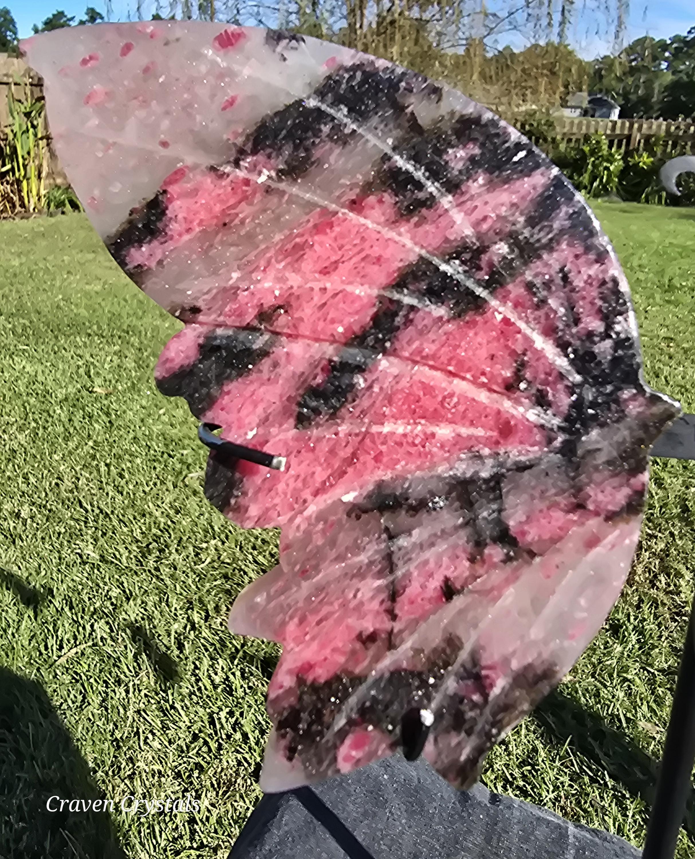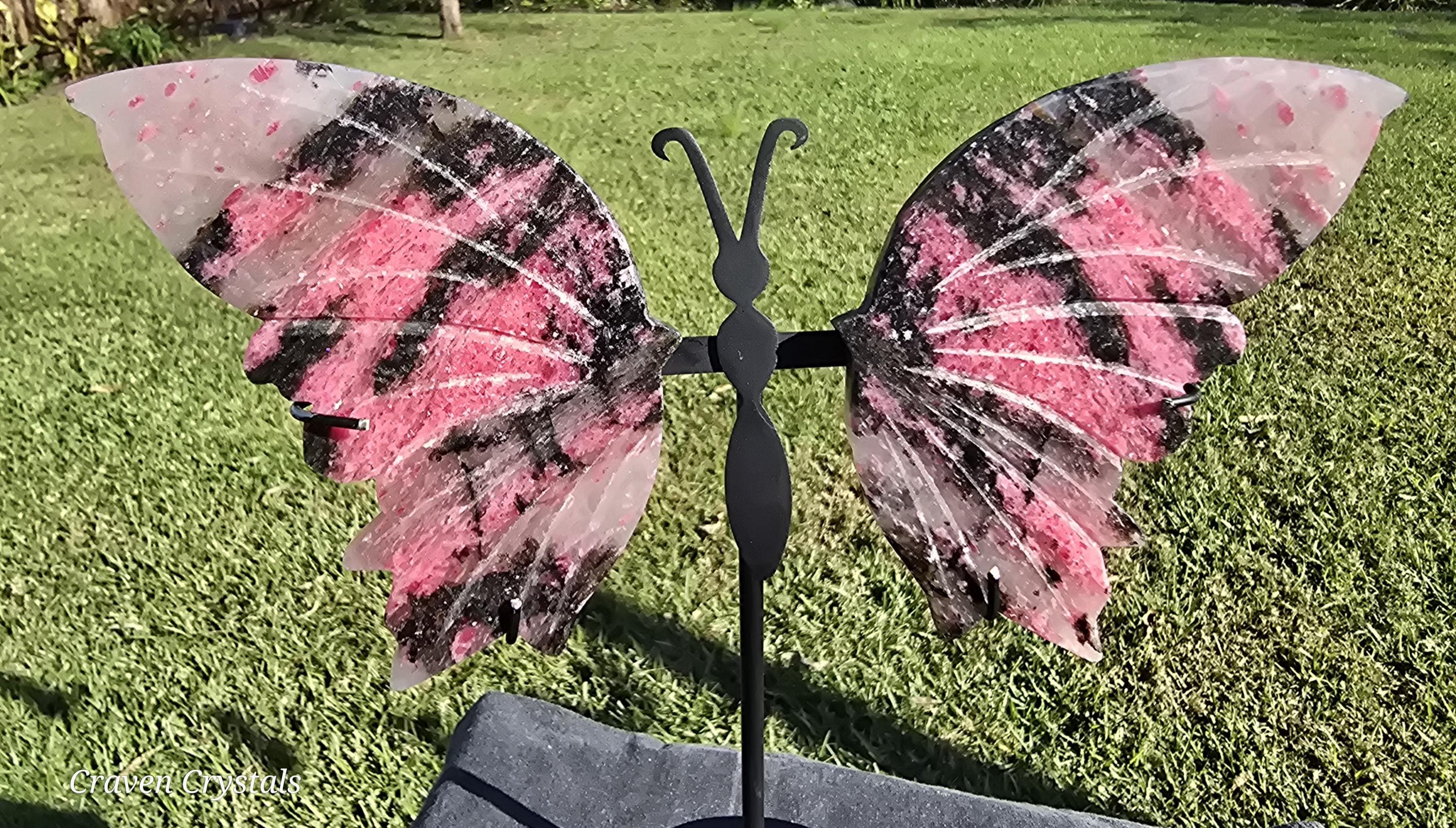 Beautiful mauve-pink Ice Rhodonite Crystal Butterfly Wings with Clear Quartz and stunning sparkle. These almost have a tiger stripe pattern.