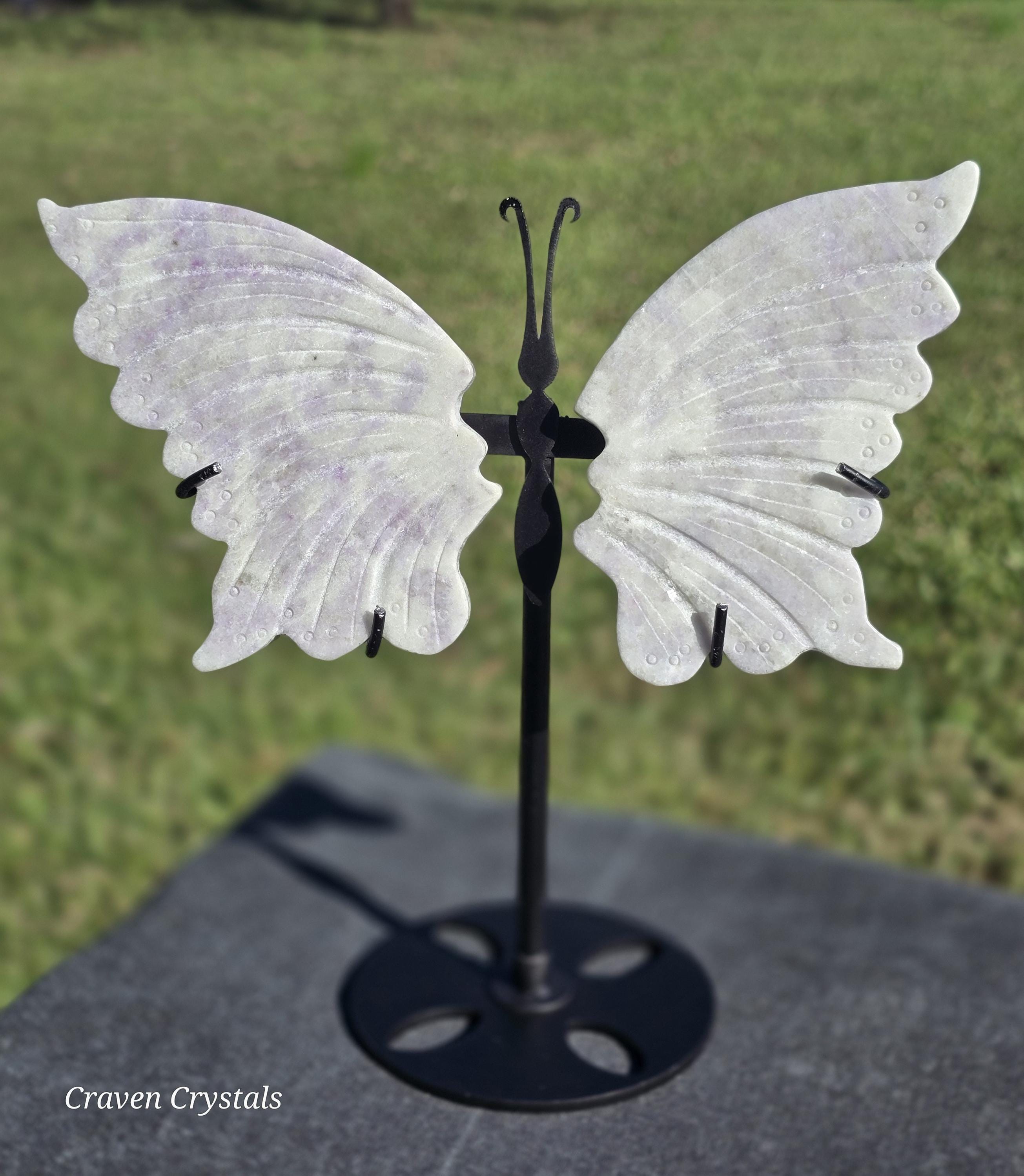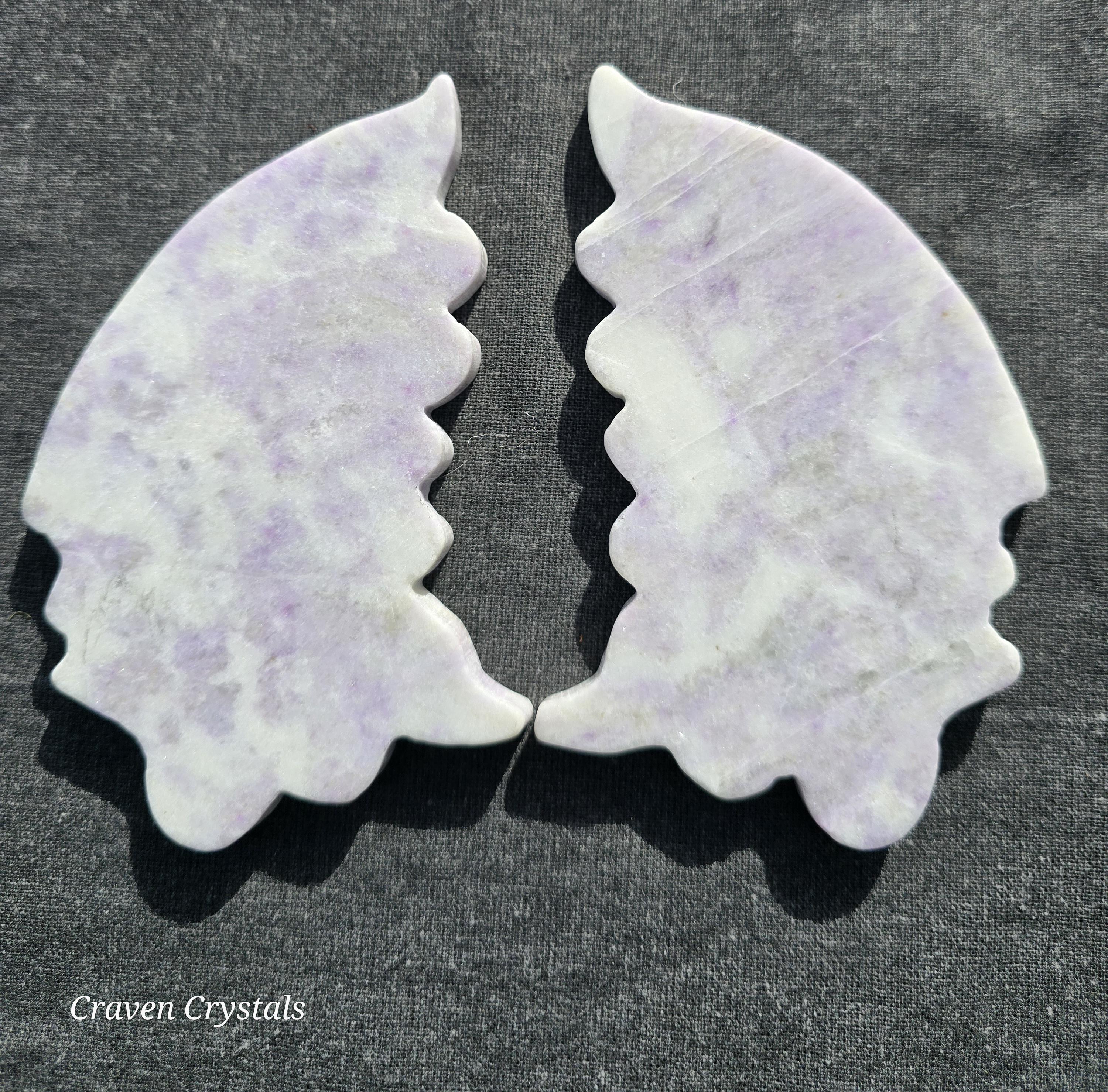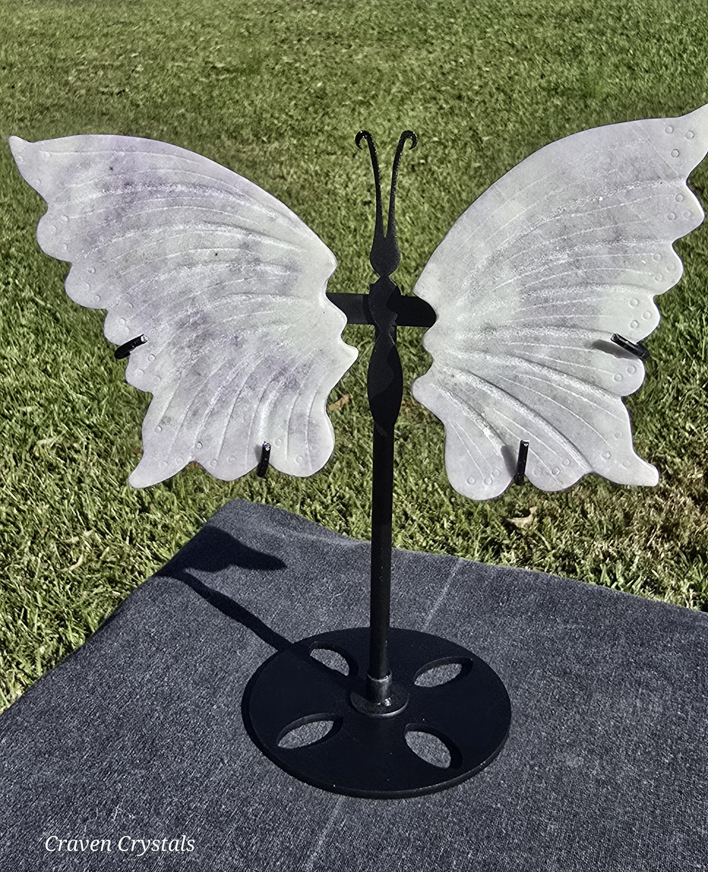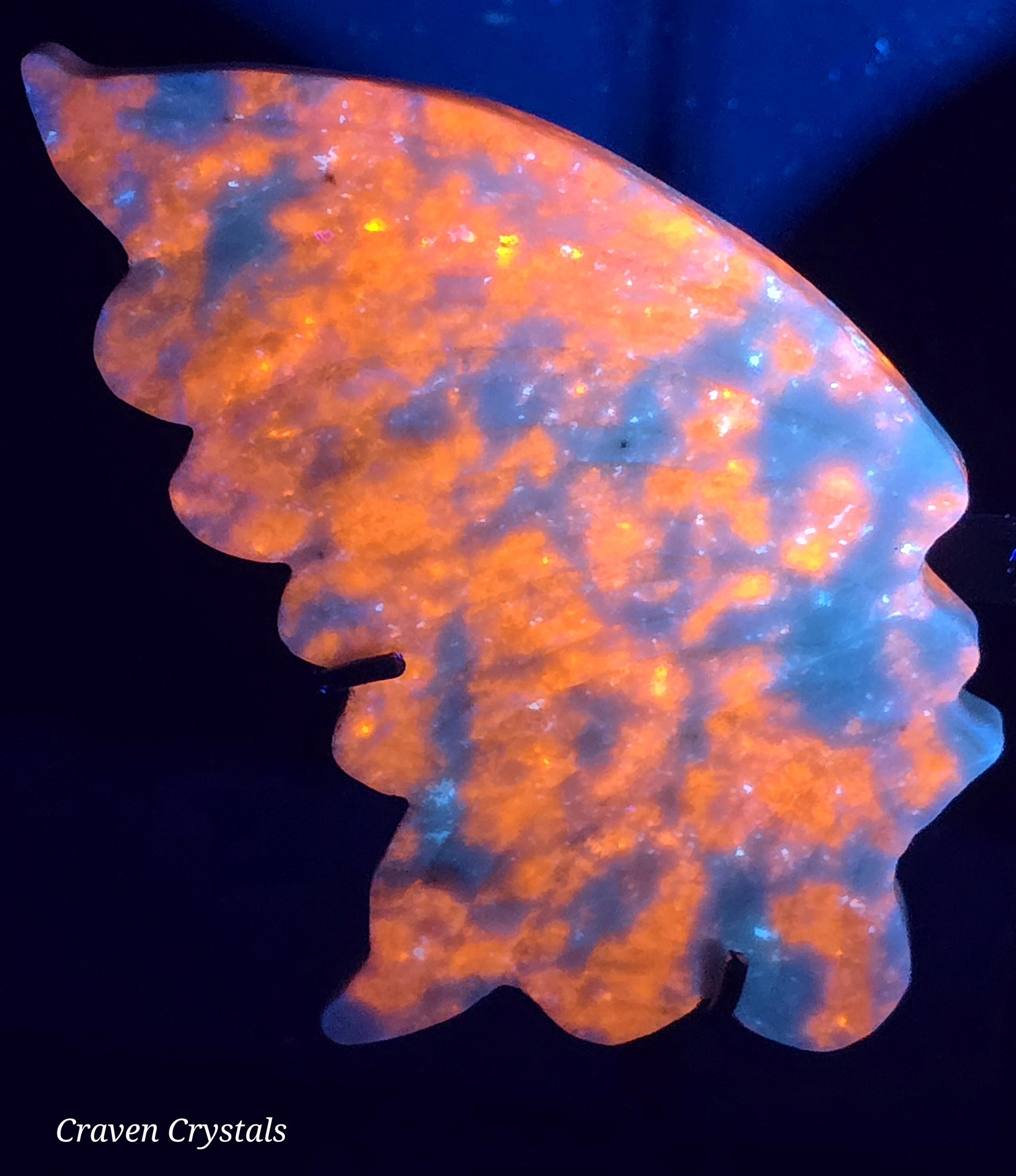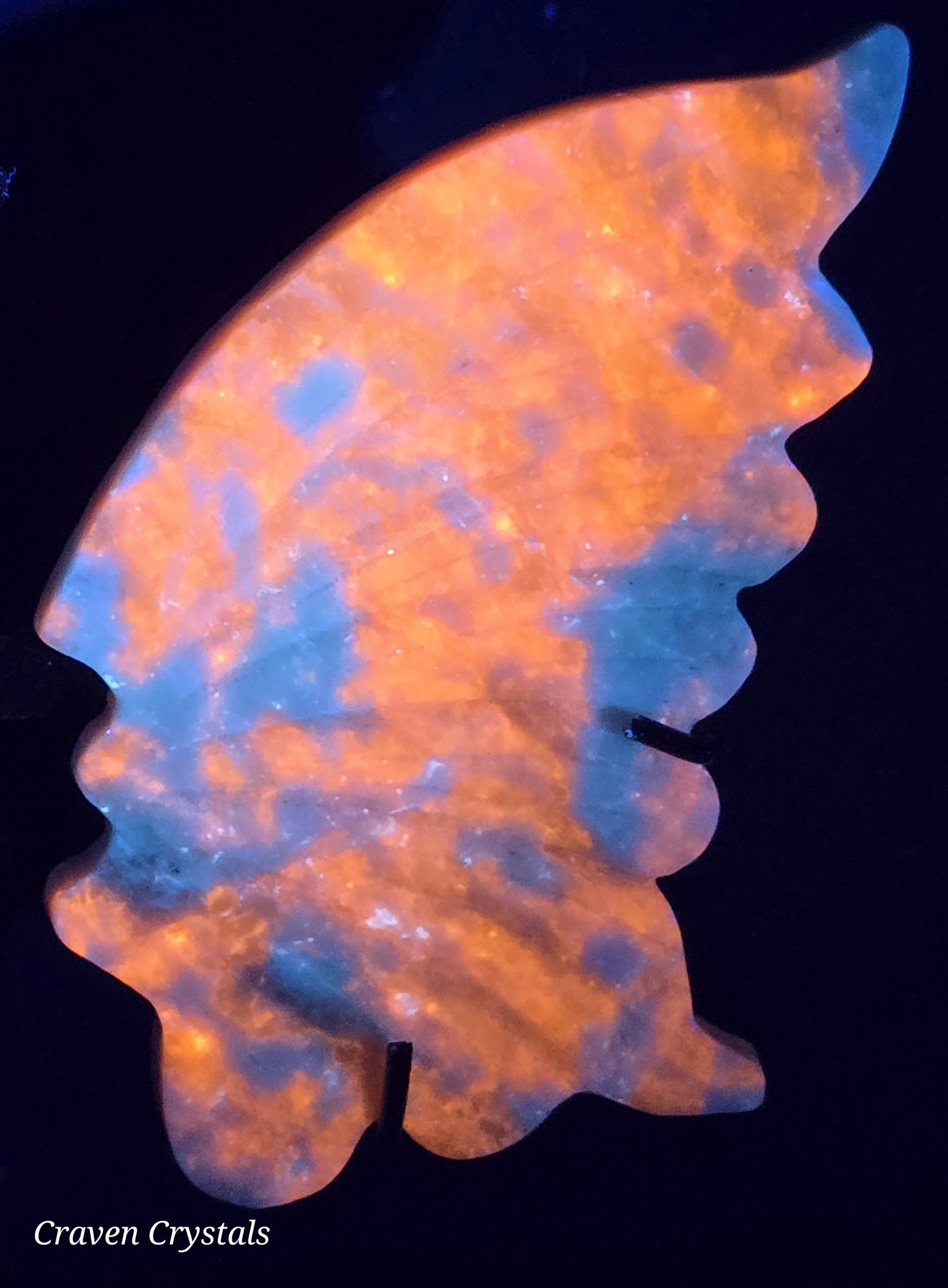 Awesome UV reactive Hackmanite Crystal Butterfly Wings. UV light shows pink. White wings then turn more purple for a few minutes after UV light is removed.