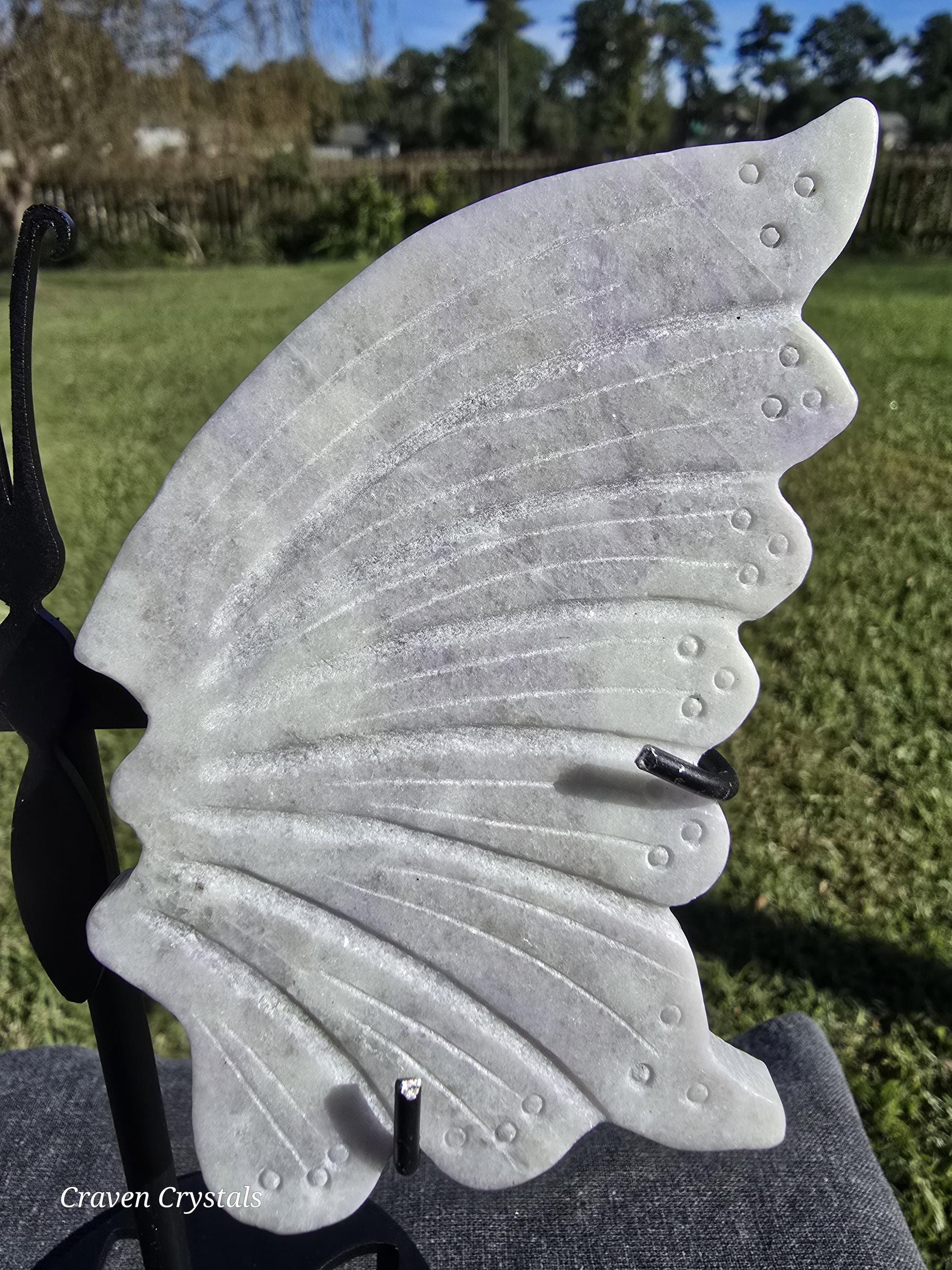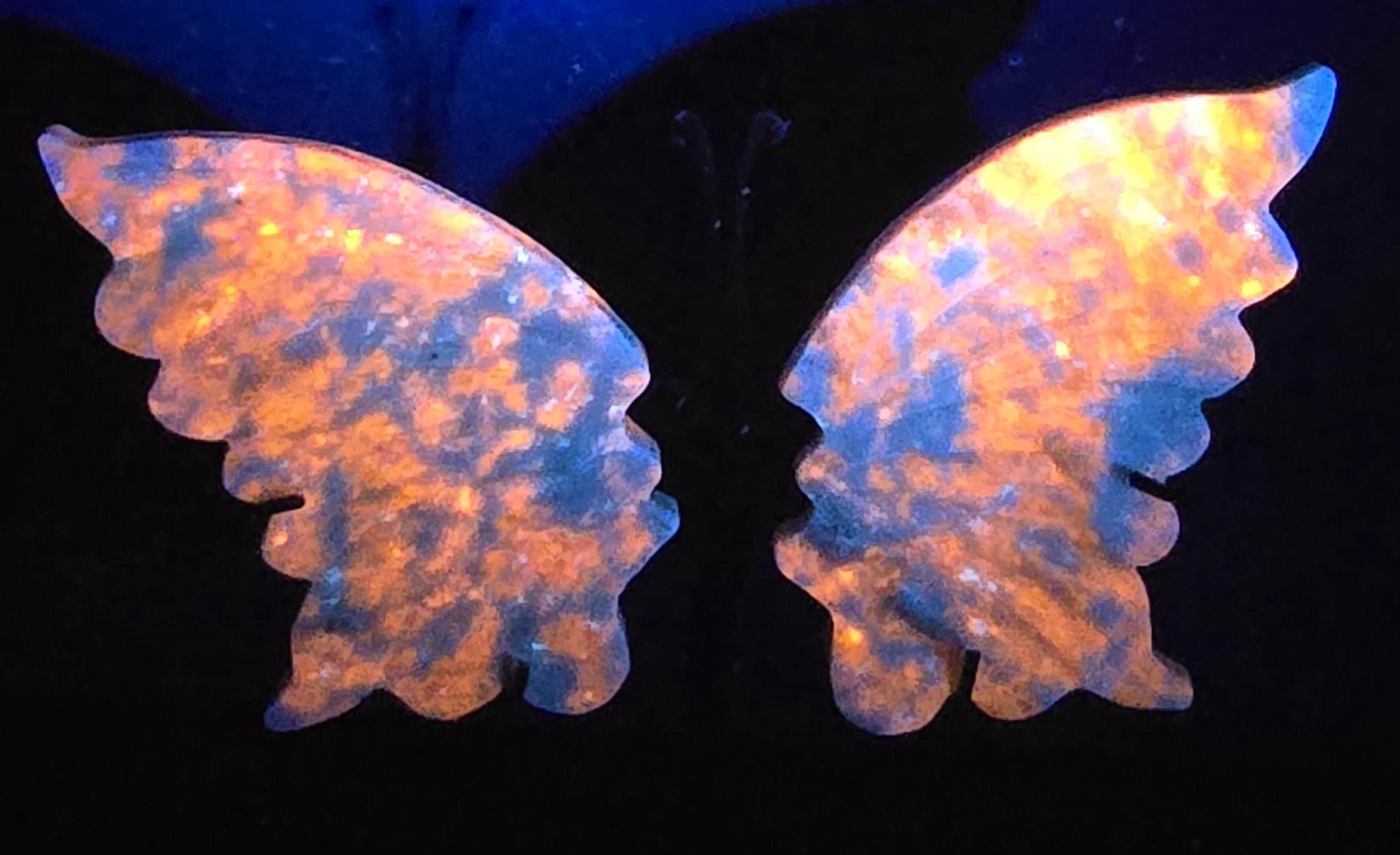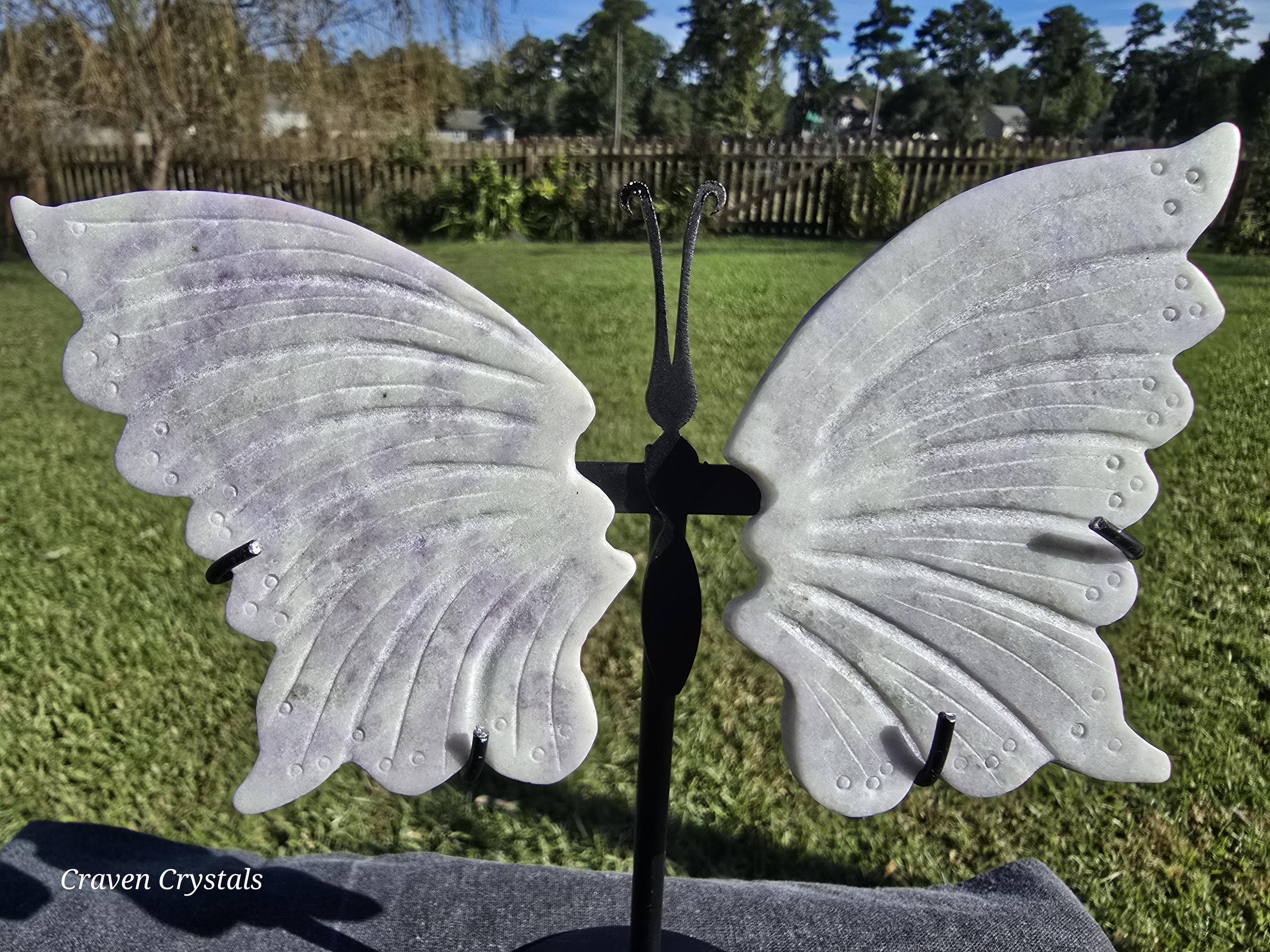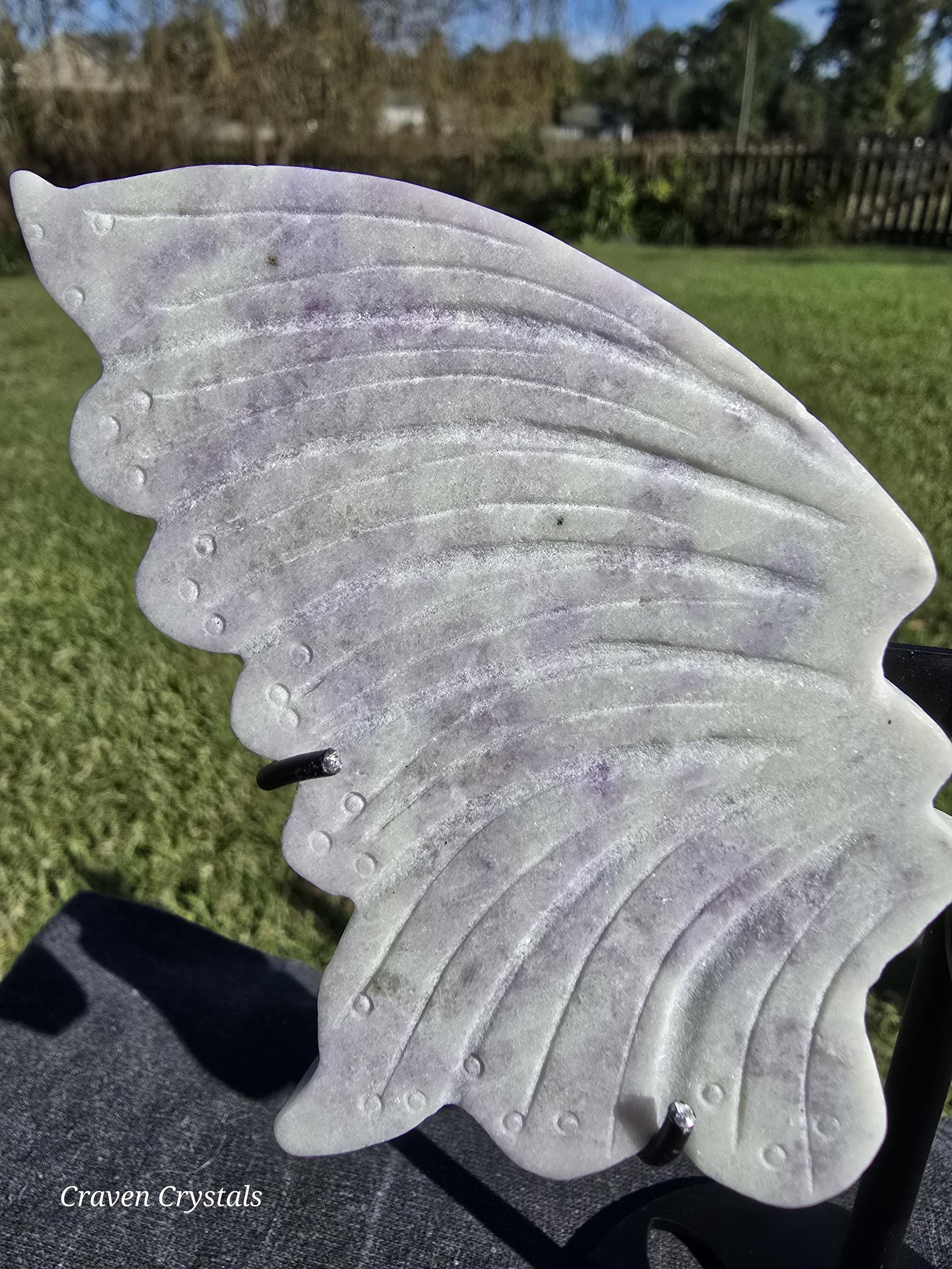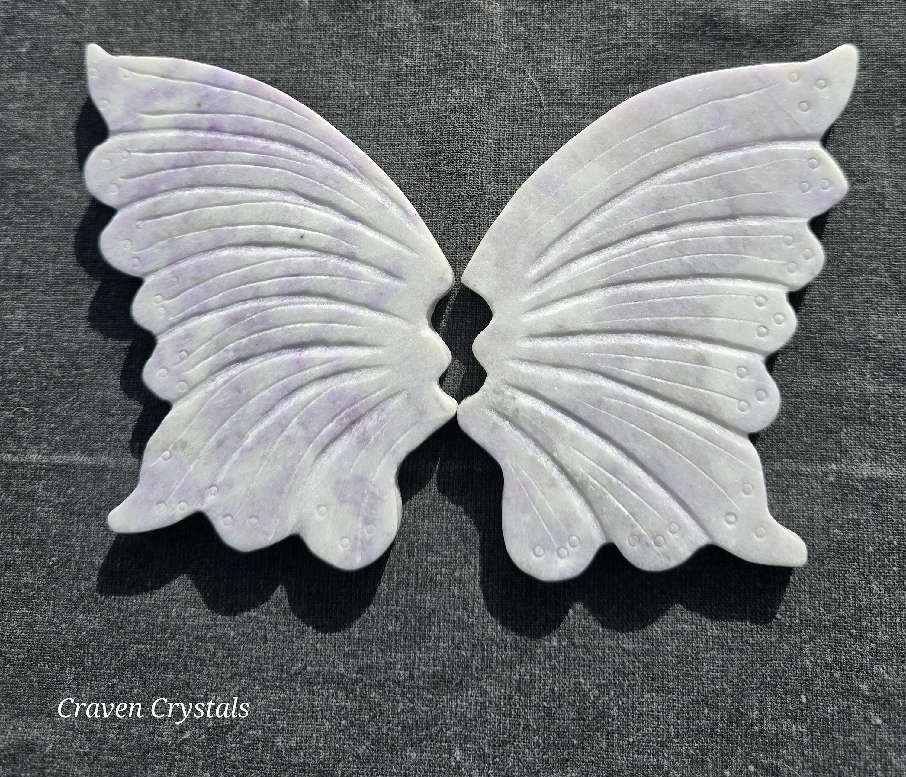Awesome UV reactive Hackmanite Crystal Butterfly Wings. UV light shows pink. White wings then turn more purple for a few minutes after UV light is removed.
