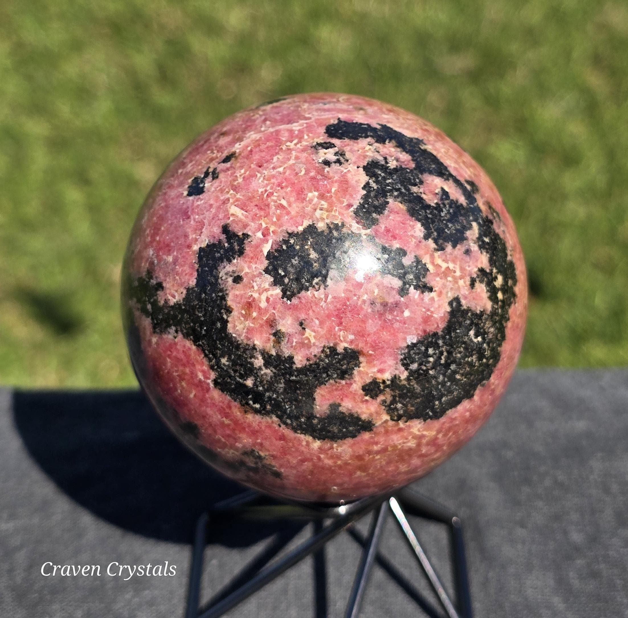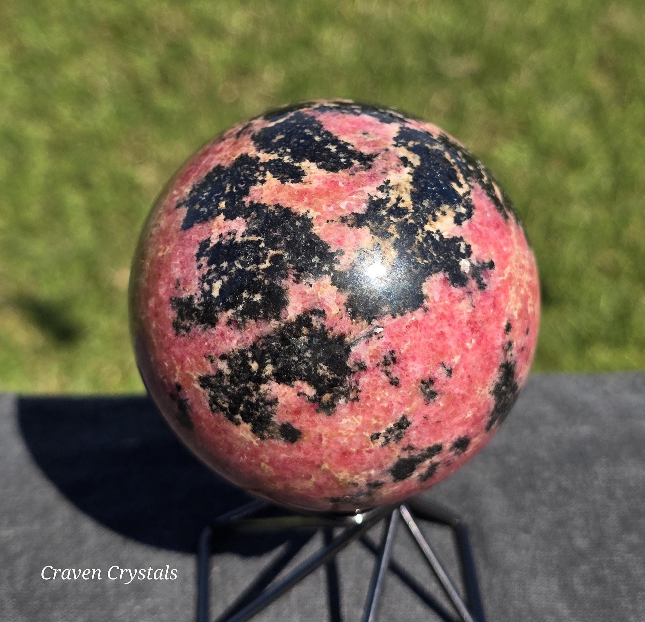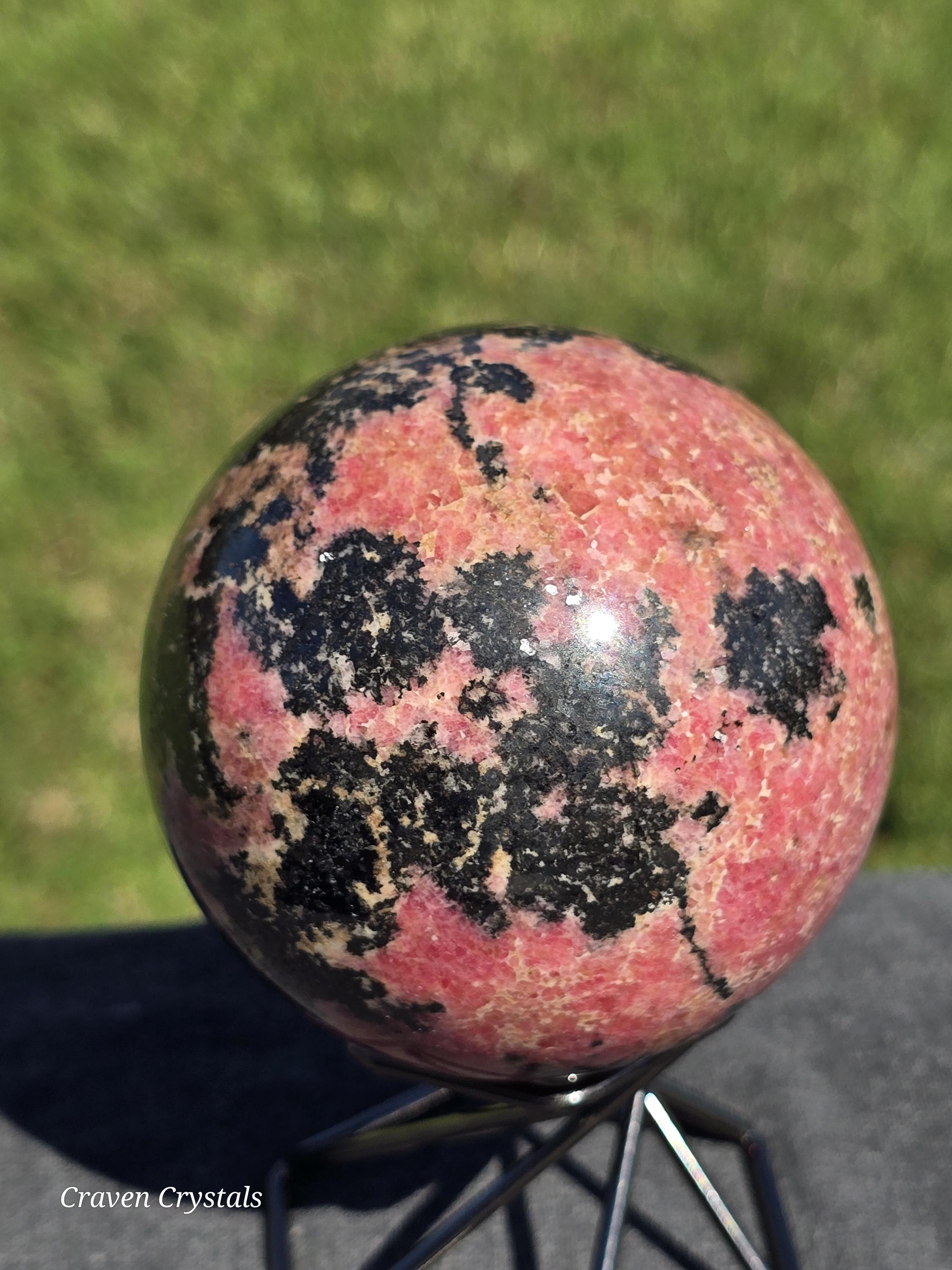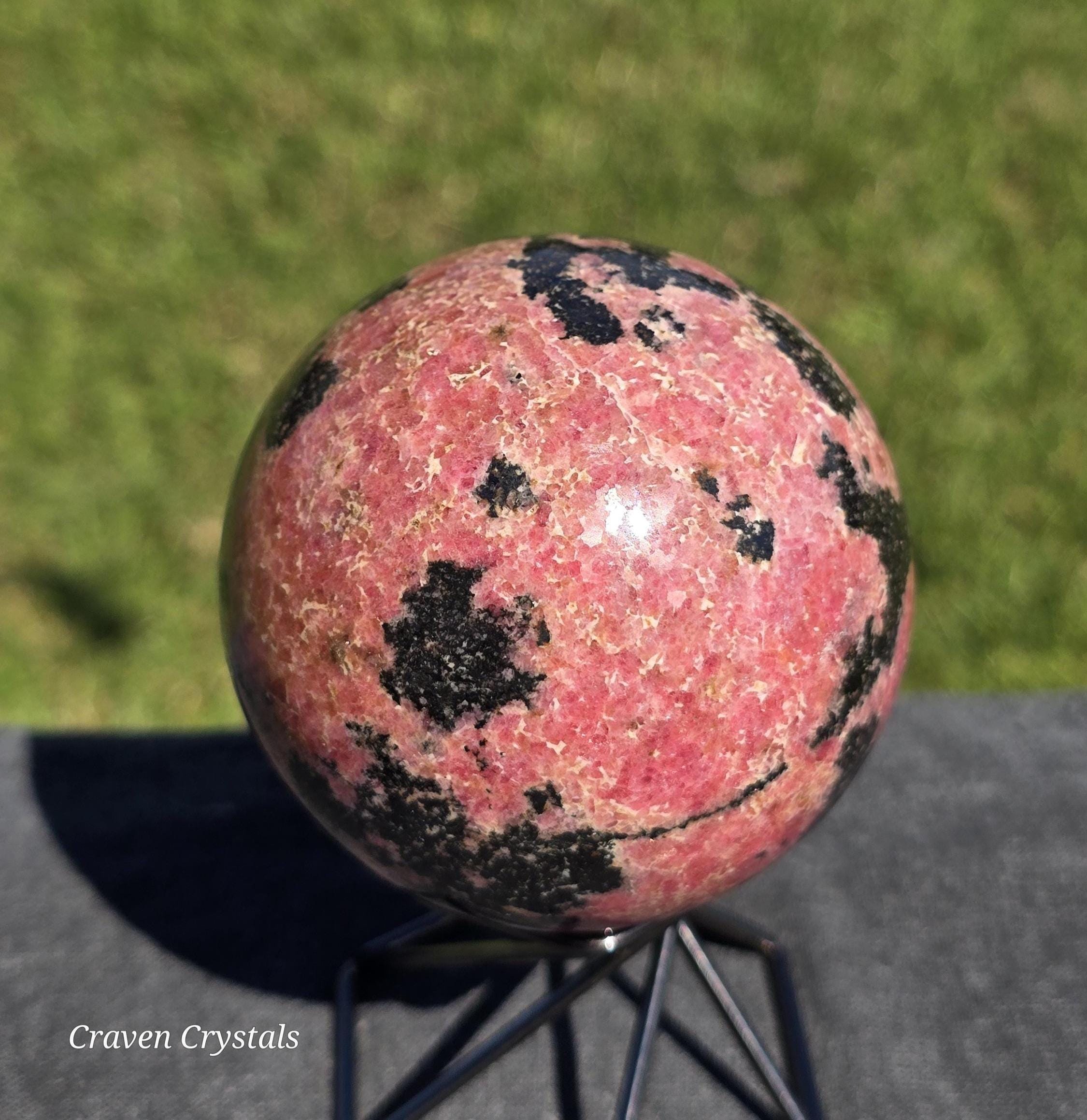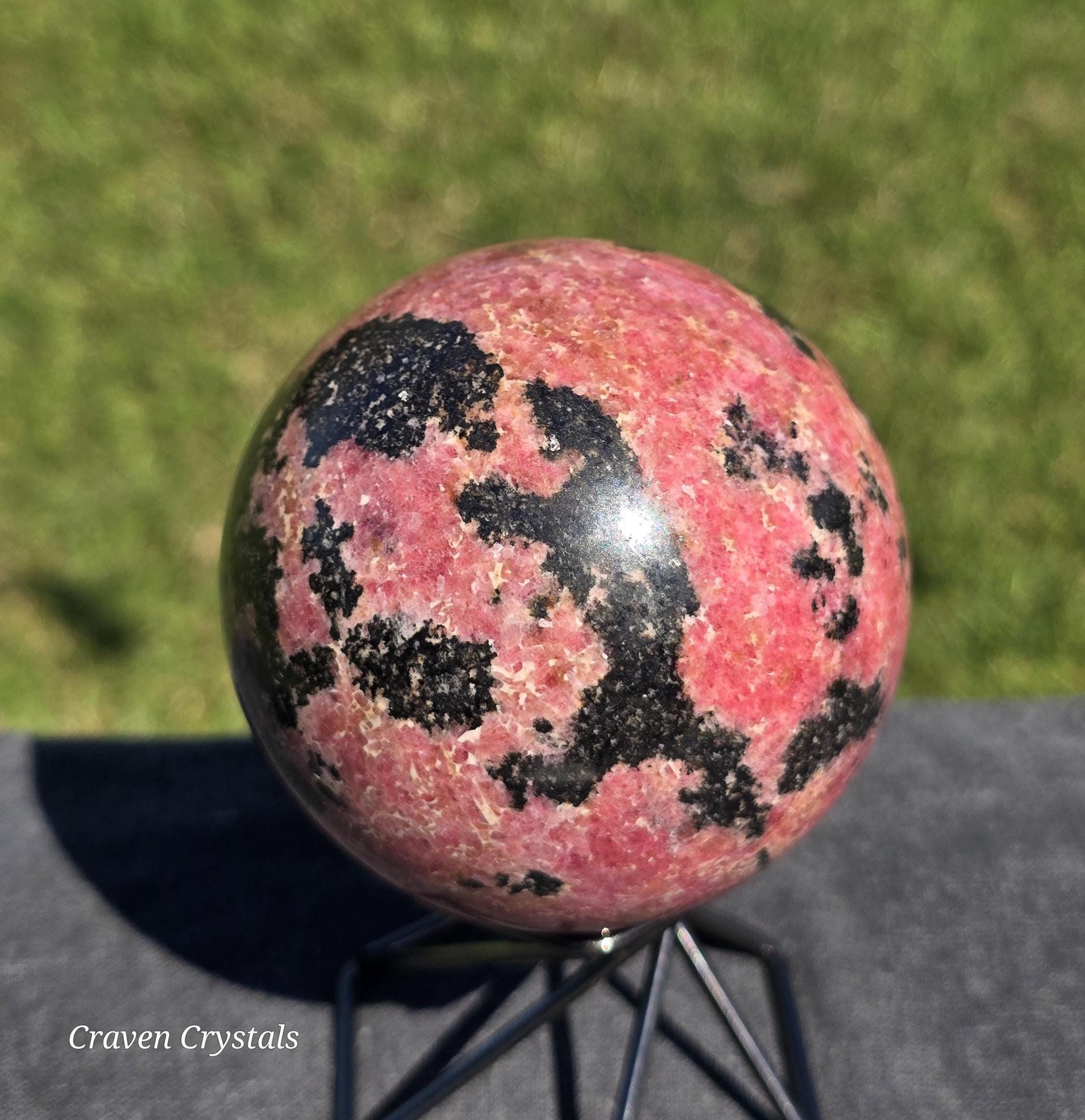 Deep fuchsia pink Rhodonite Crystal Sphere Rhodonite with black manganese oxide veins running through it.