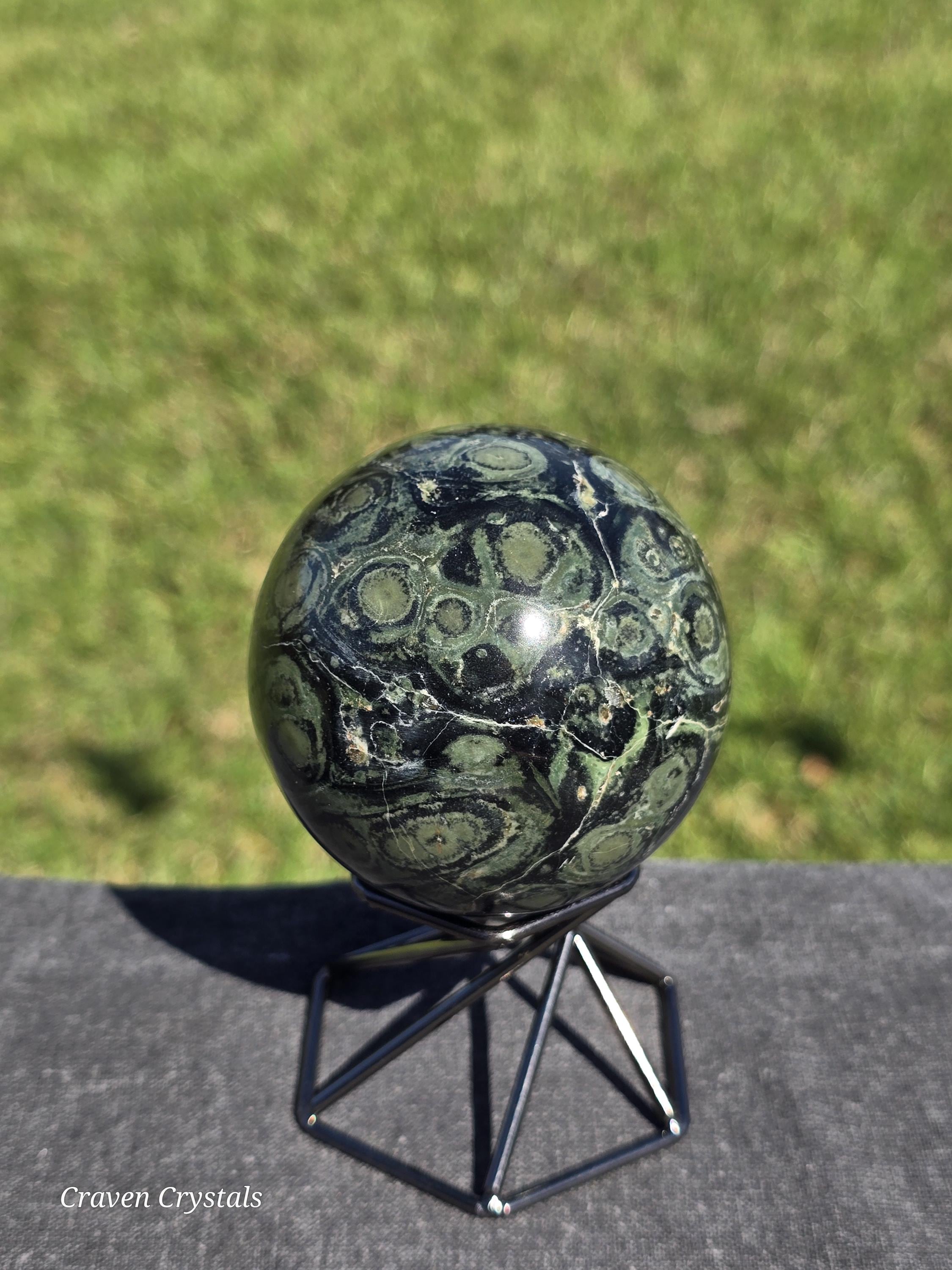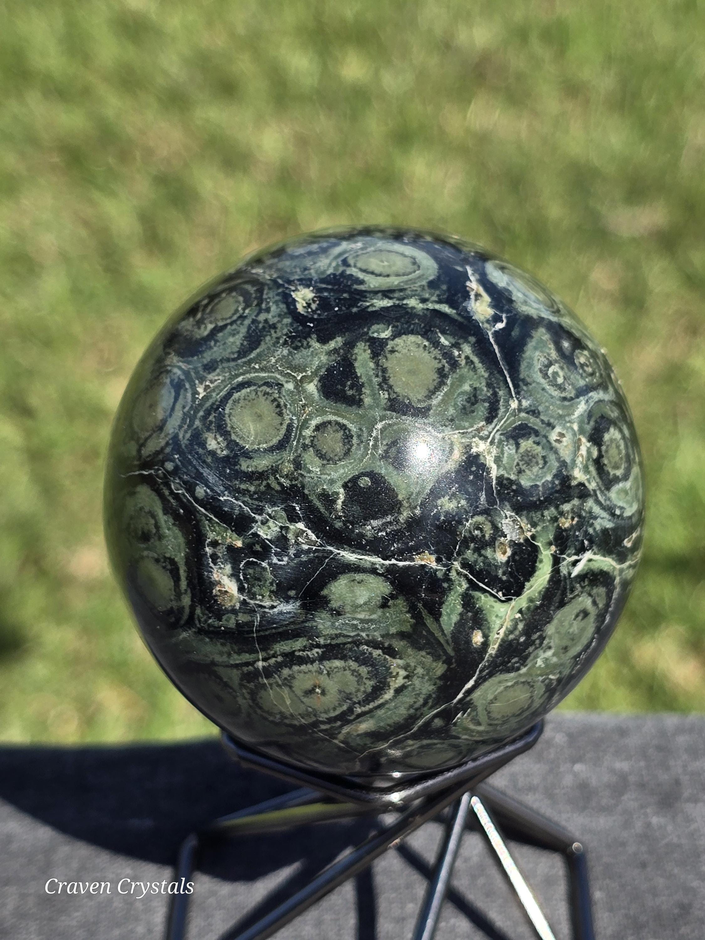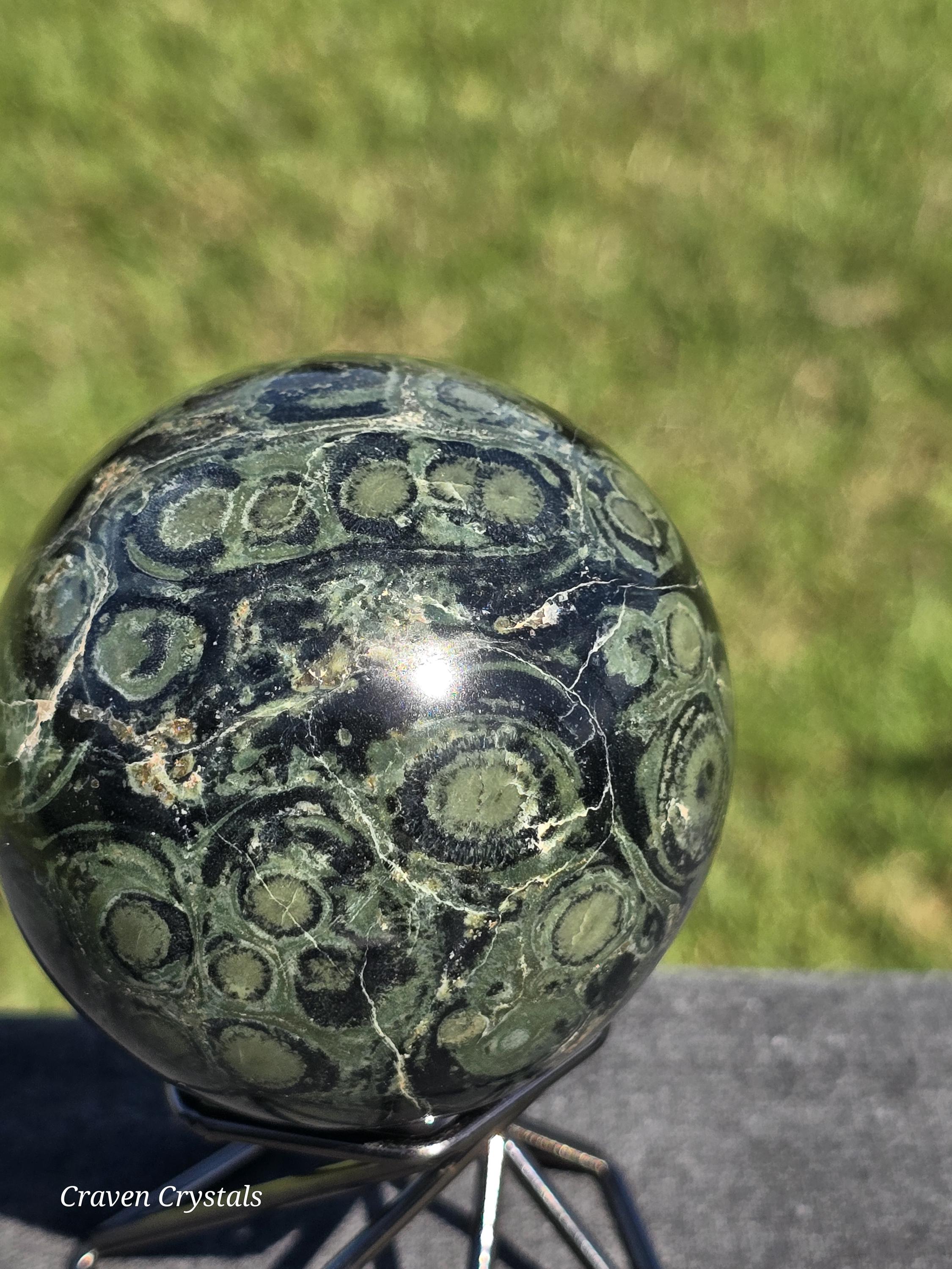 Beautiful deep green Nebula Stone Crystal Sphere covered with the vibrant green eye pattern. Nebula Stone is a rare and unusual igneous stone first discovered in Mexico, recognized for its swirling green and black patterns that resemble distant galaxies—hence its name. It is composed of several minerals, including quartz, anorthoclase, riebeckite, aegirine, and arfvedsonite. This unique mix gives the stone its distinctive dark background with rounded or oval patches of mossy green, often appearing as if tiny nebulas are suspended in space.