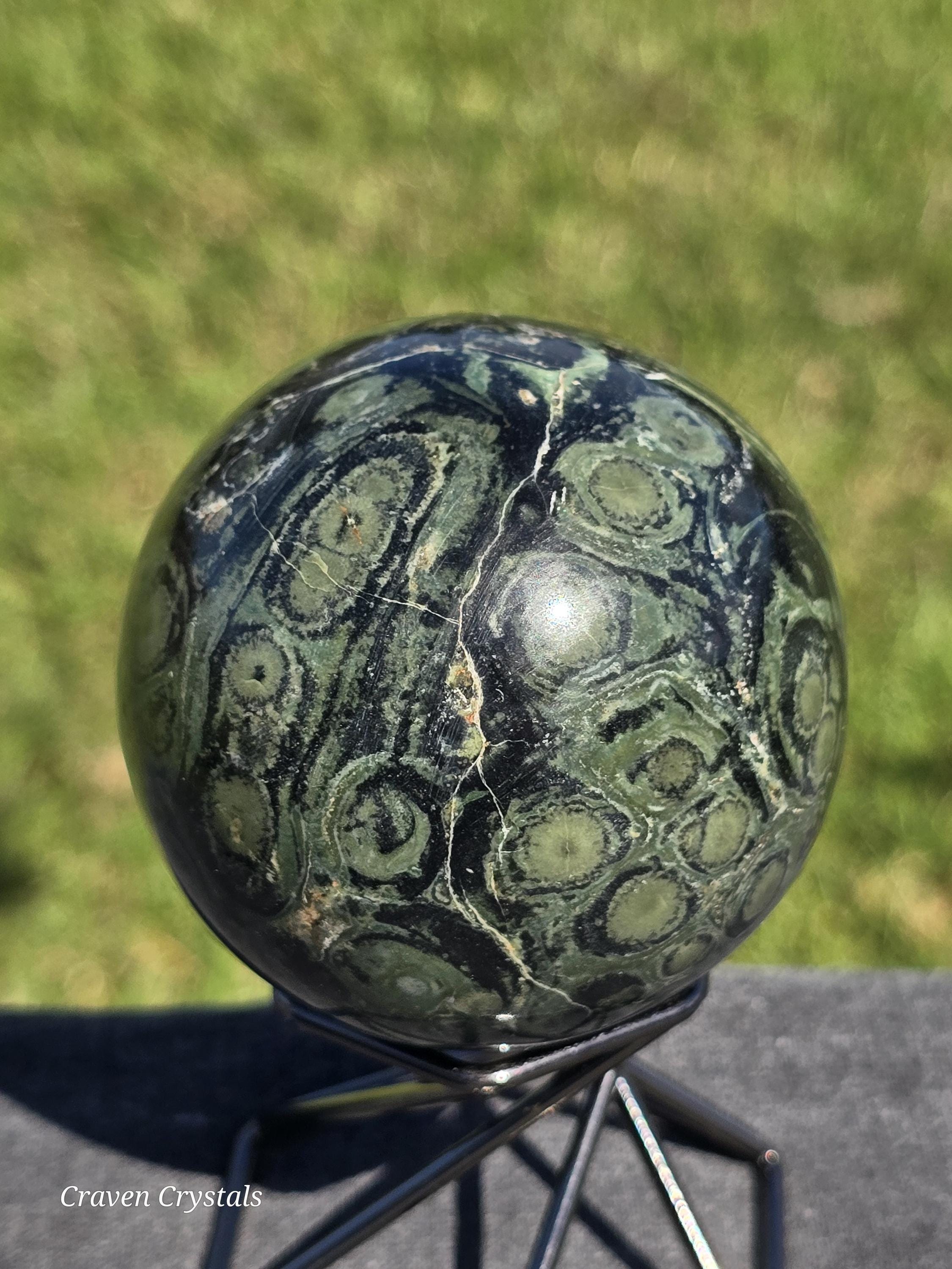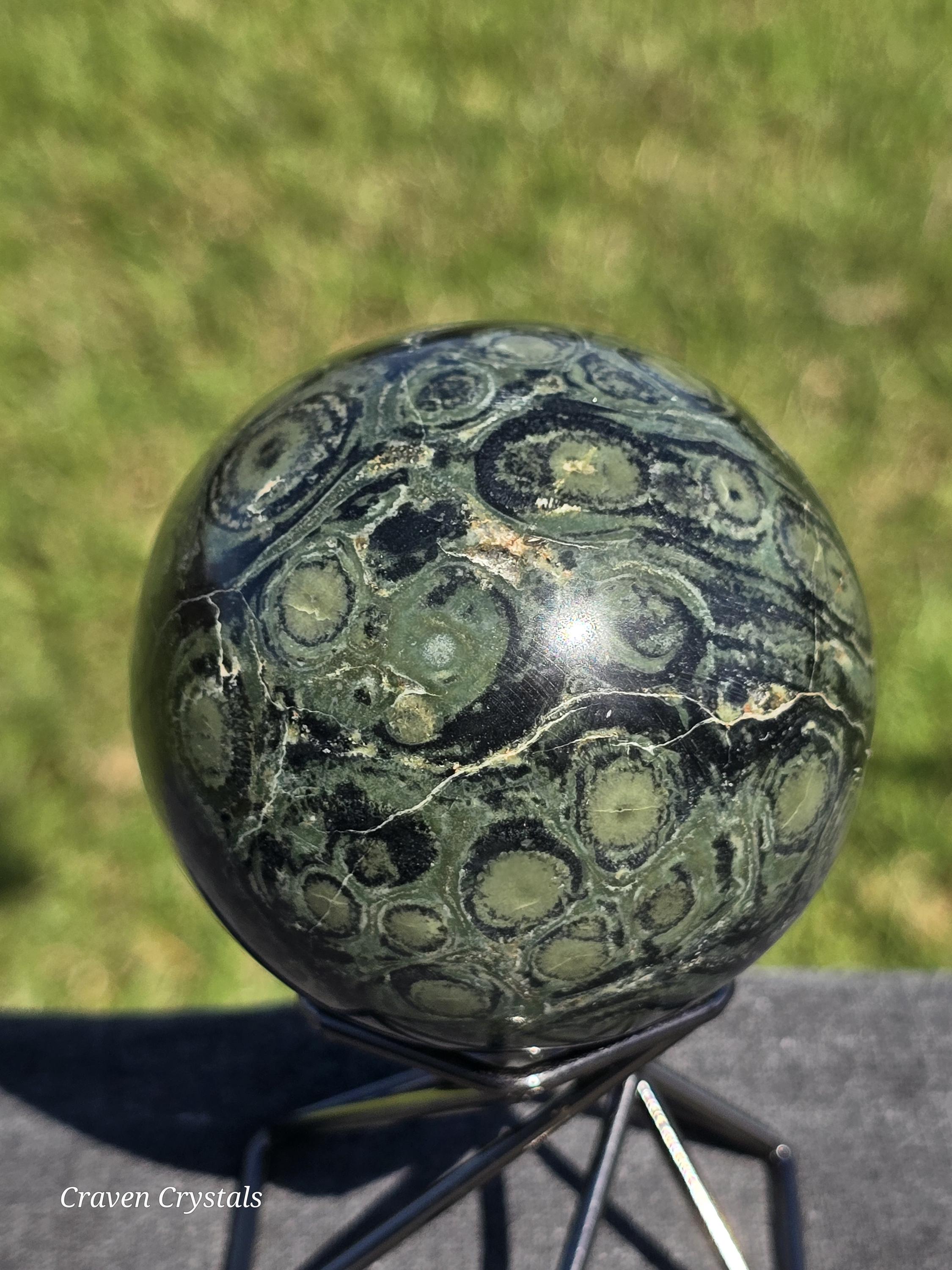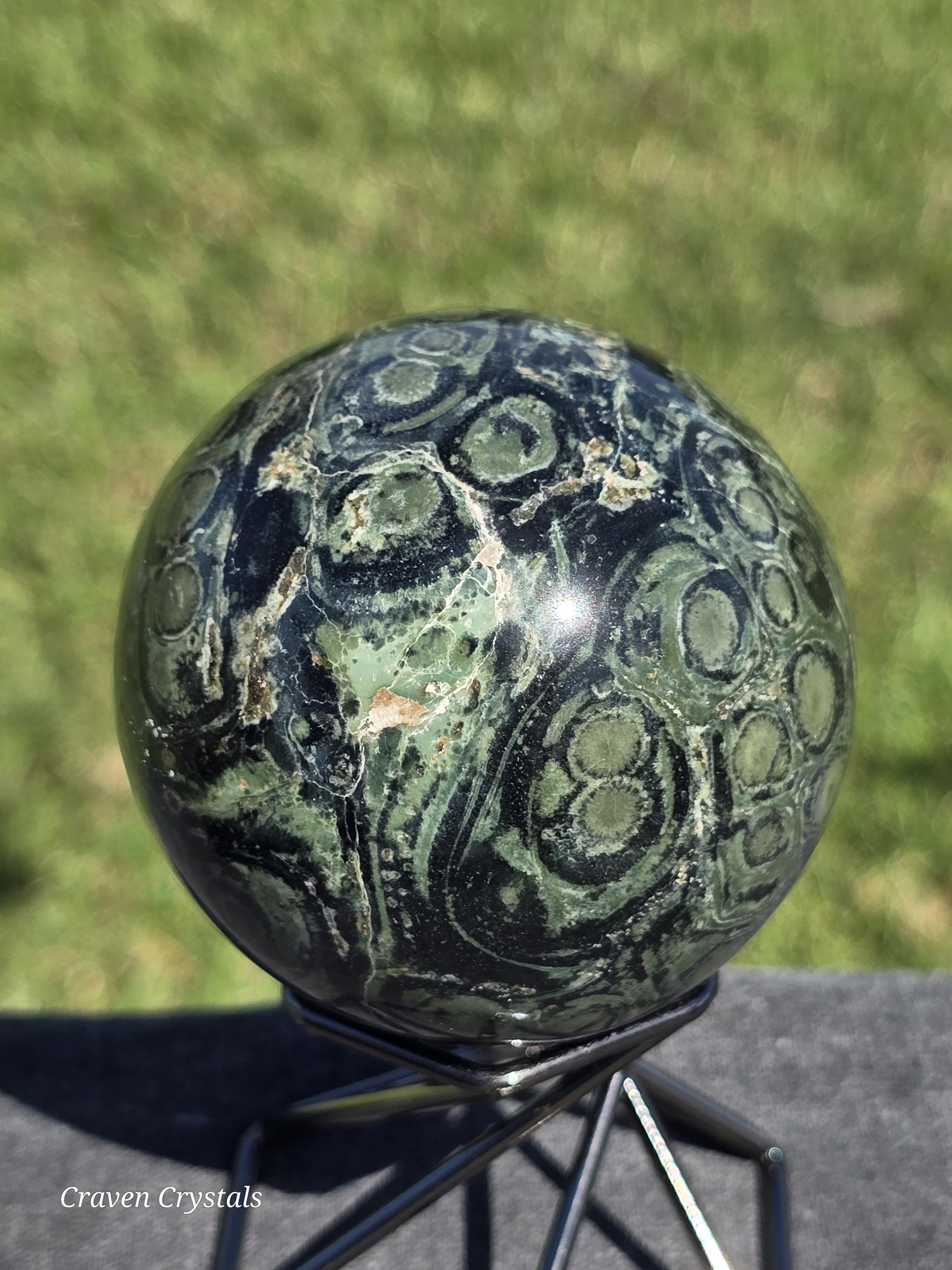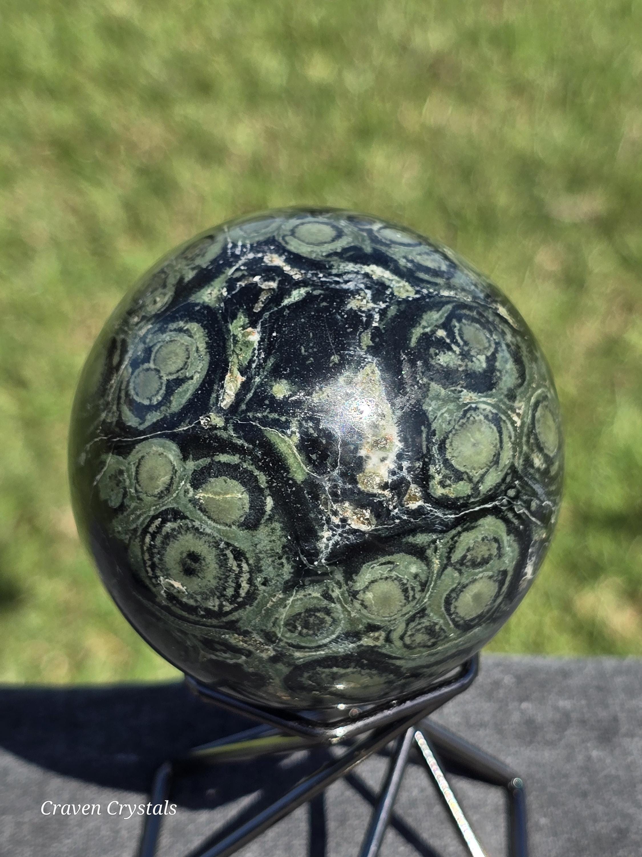 Beautiful deep green Nebula Stone Crystal Sphere covered with the vibrant green eye pattern. Nebula Stone is a rare and unusual igneous stone first discovered in Mexico, recognized for its swirling green and black patterns that resemble distant galaxies—hence its name. It is composed of several minerals, including quartz, anorthoclase, riebeckite, aegirine, and arfvedsonite. This unique mix gives the stone its distinctive dark background with rounded or oval patches of mossy green, often appearing as if tiny nebulas are suspended in space.