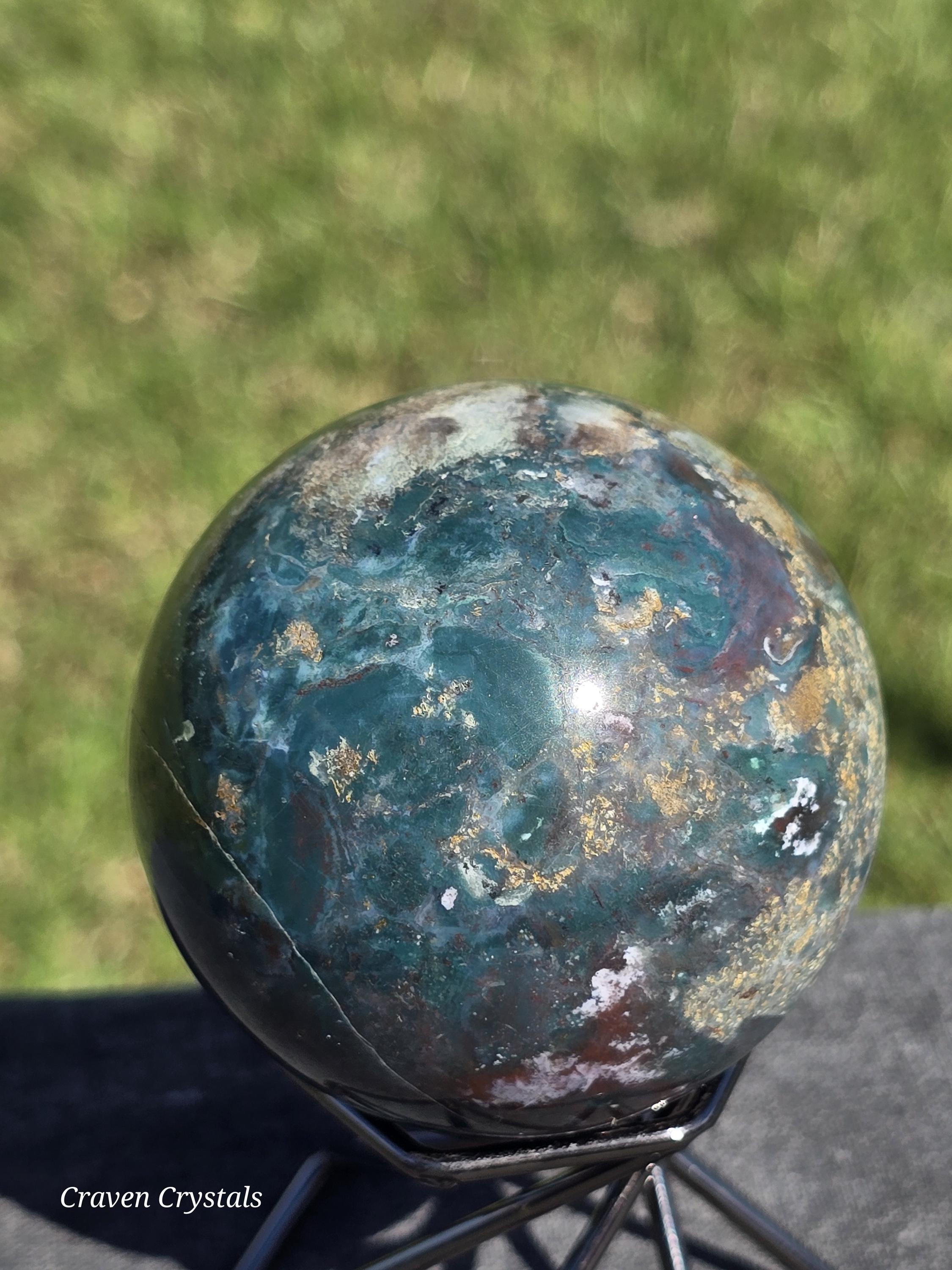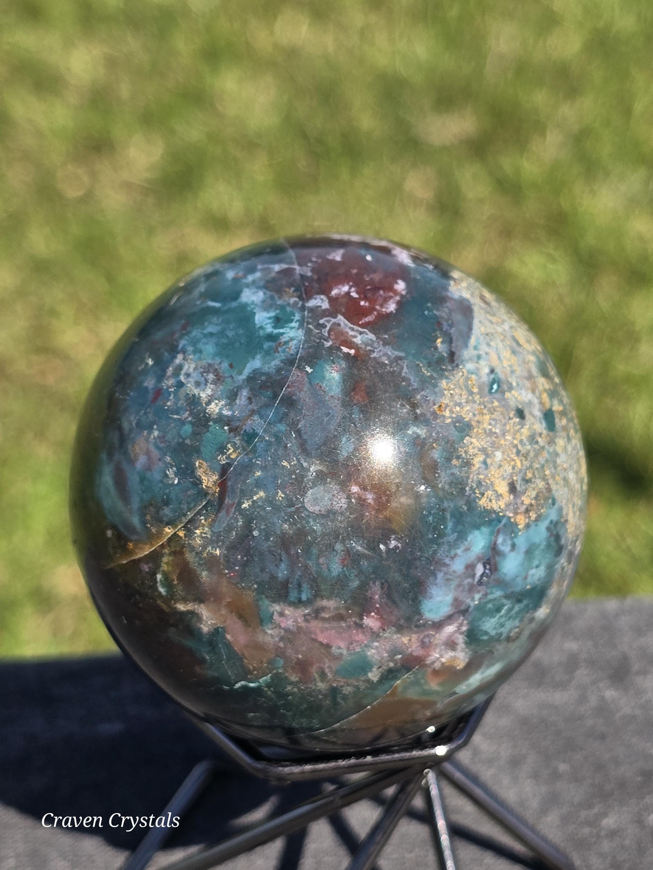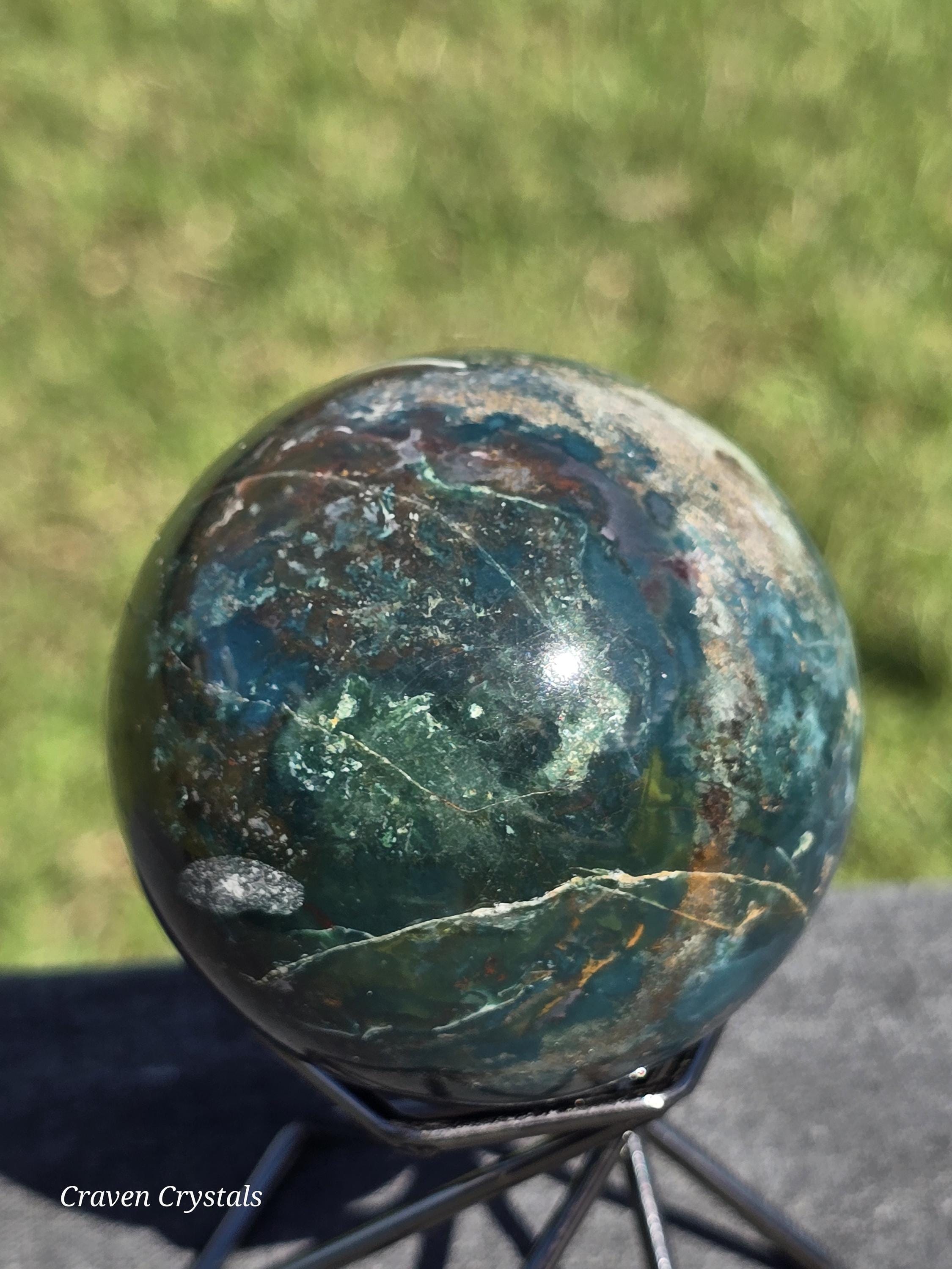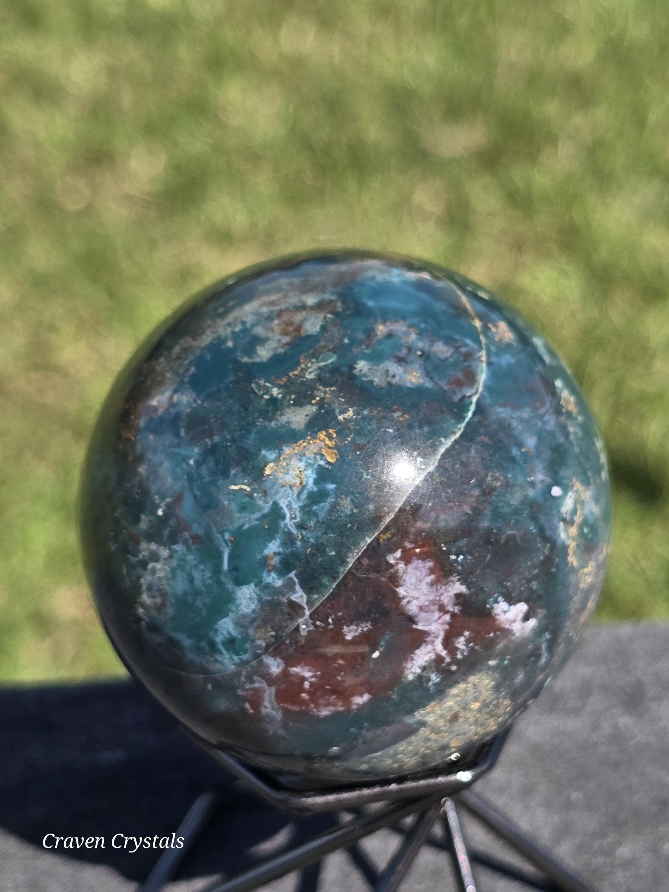 Stunning deep teal Ocean Jasper Crystal Sphere with swirls of purple and red