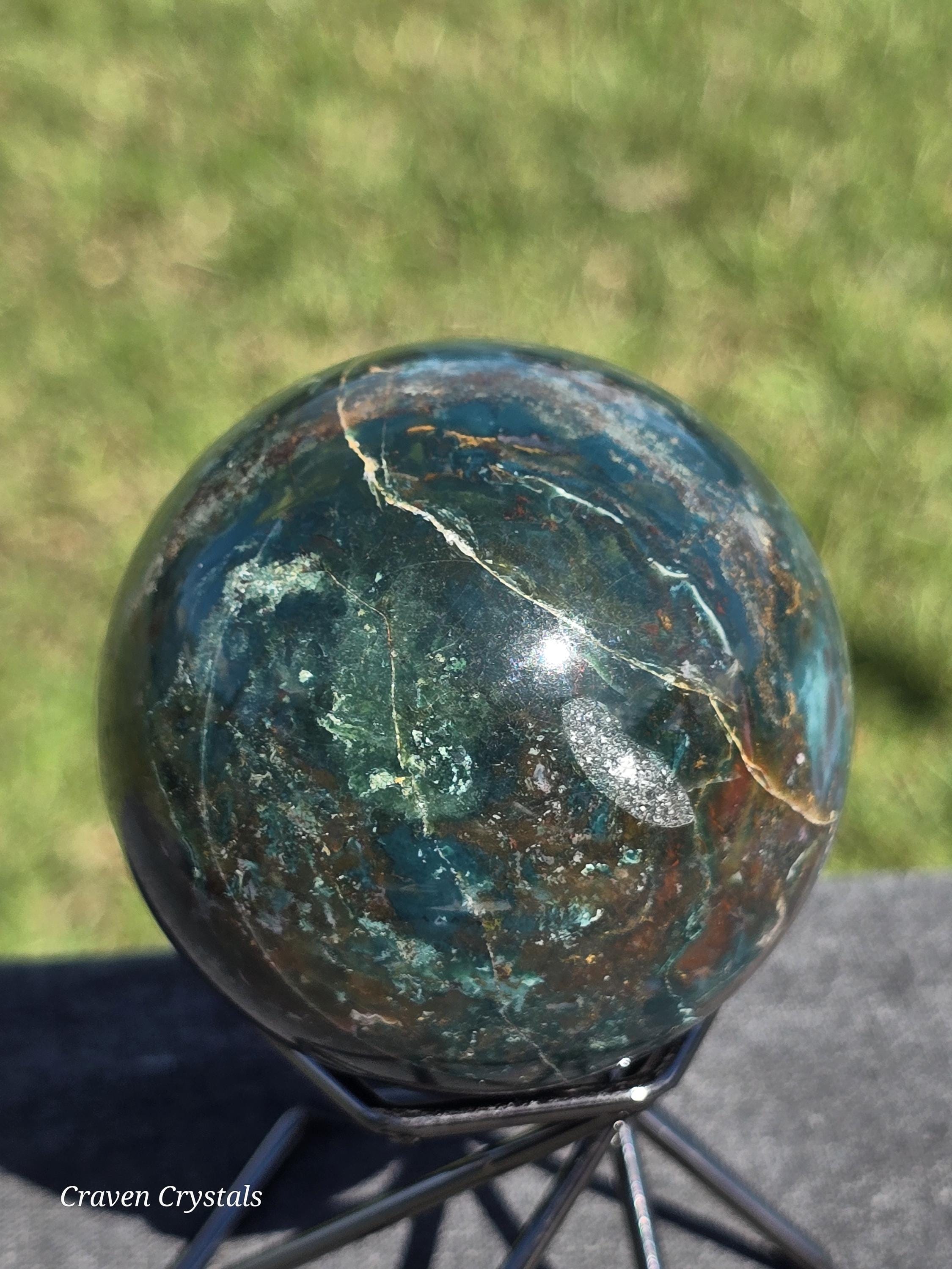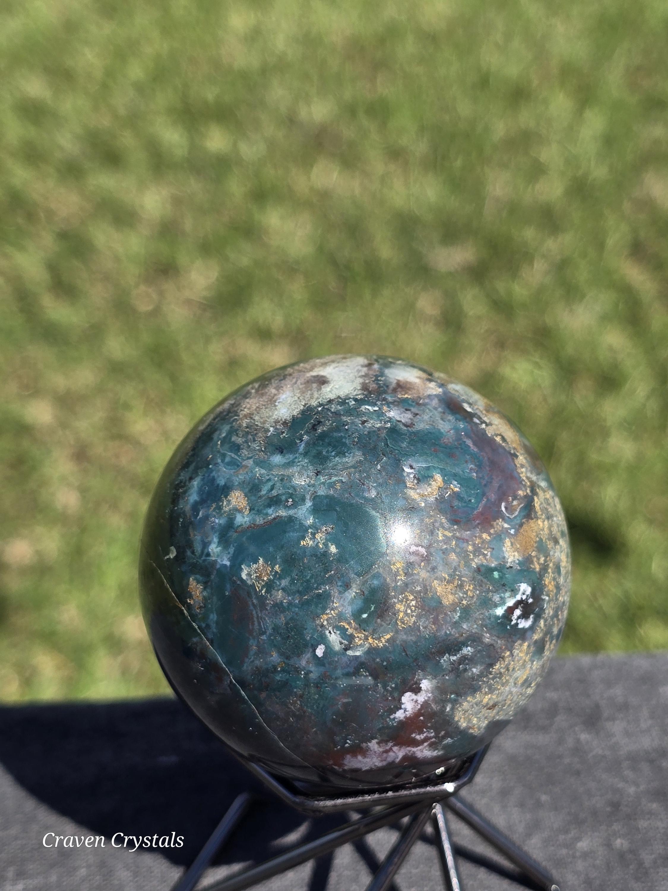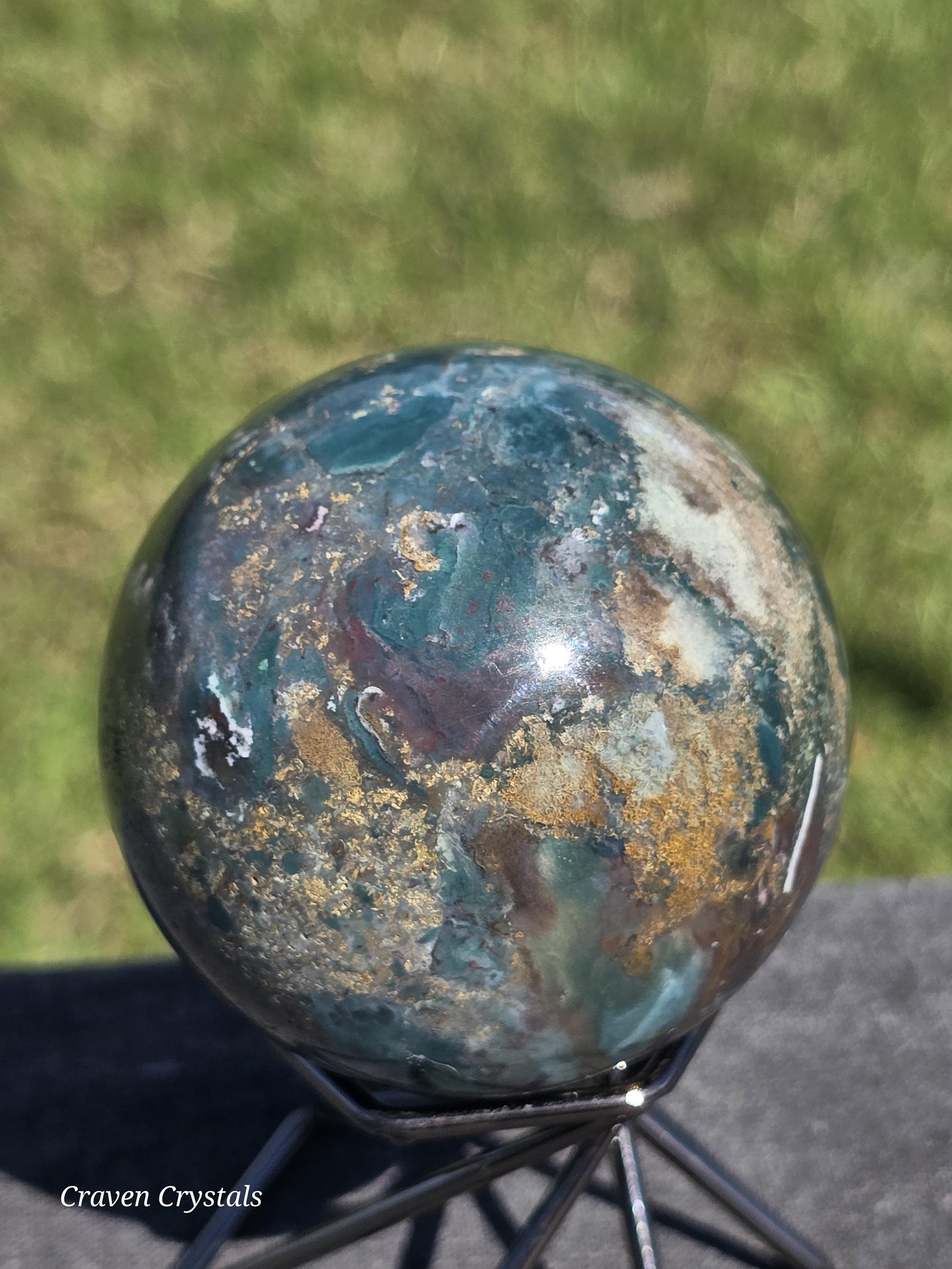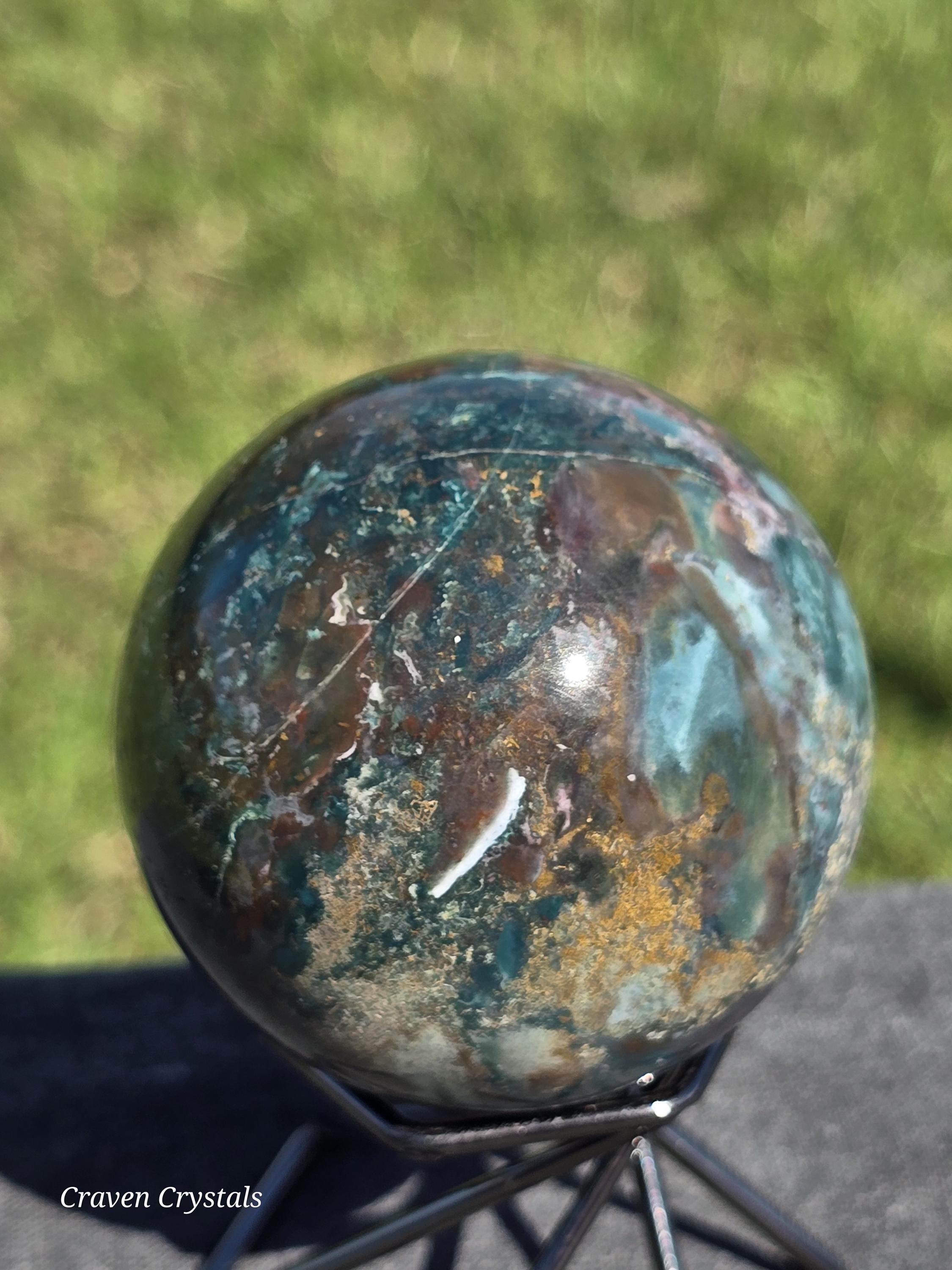 Stunning deep teal Ocean Jasper Crystal Sphere with swirls of purple and red