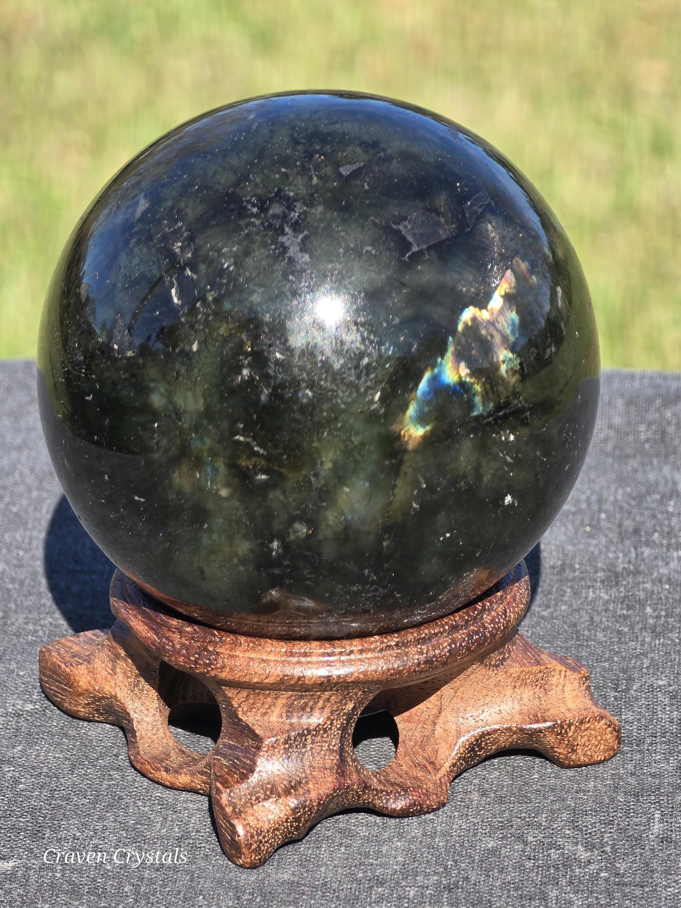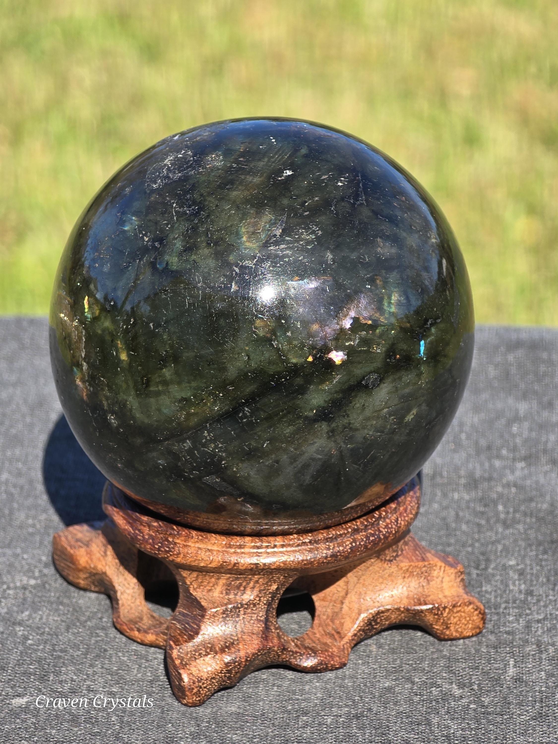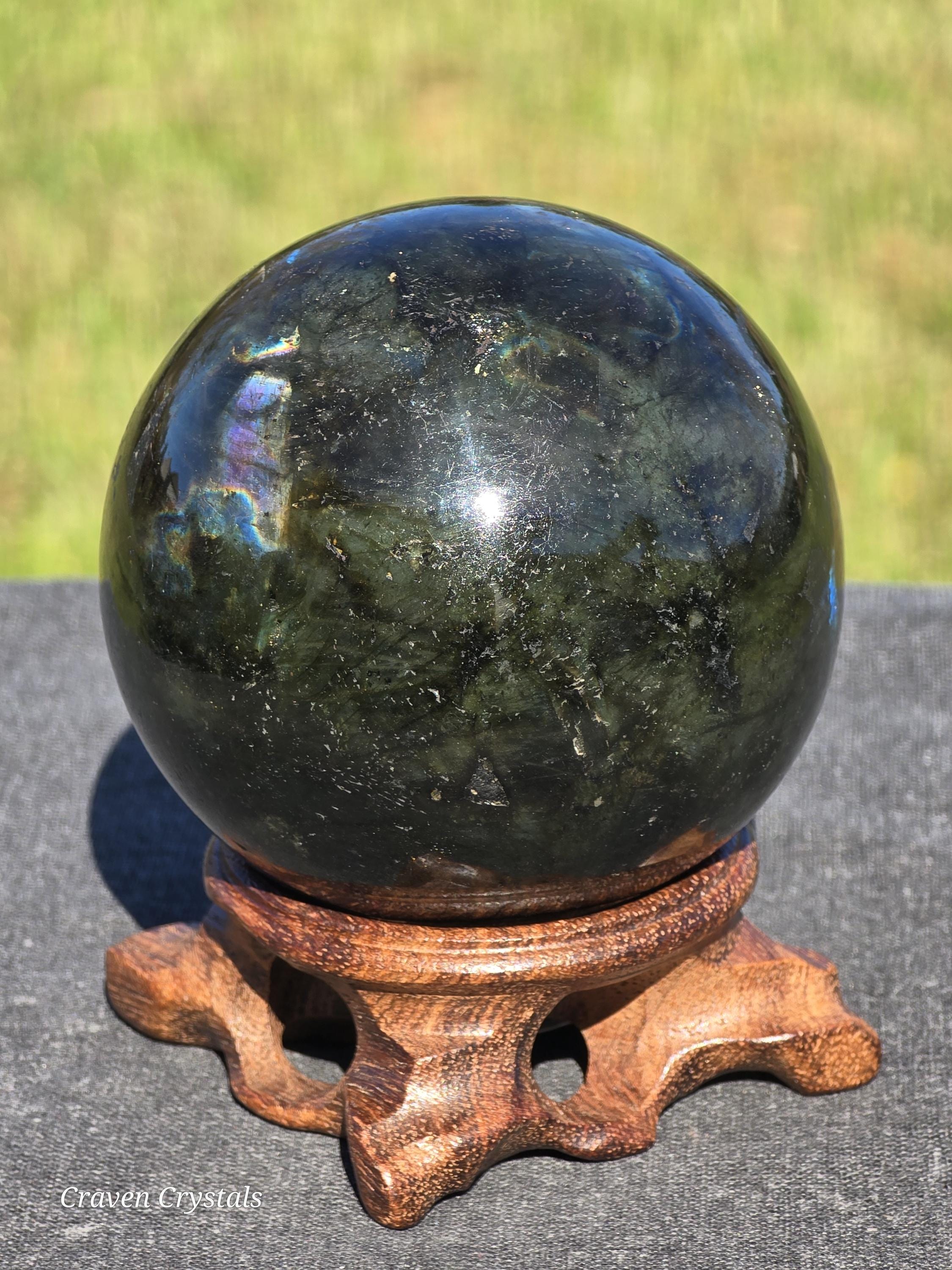 Rainbow flash Black Labradorite Crystal Sphere with spots of purple, blue, green and gold