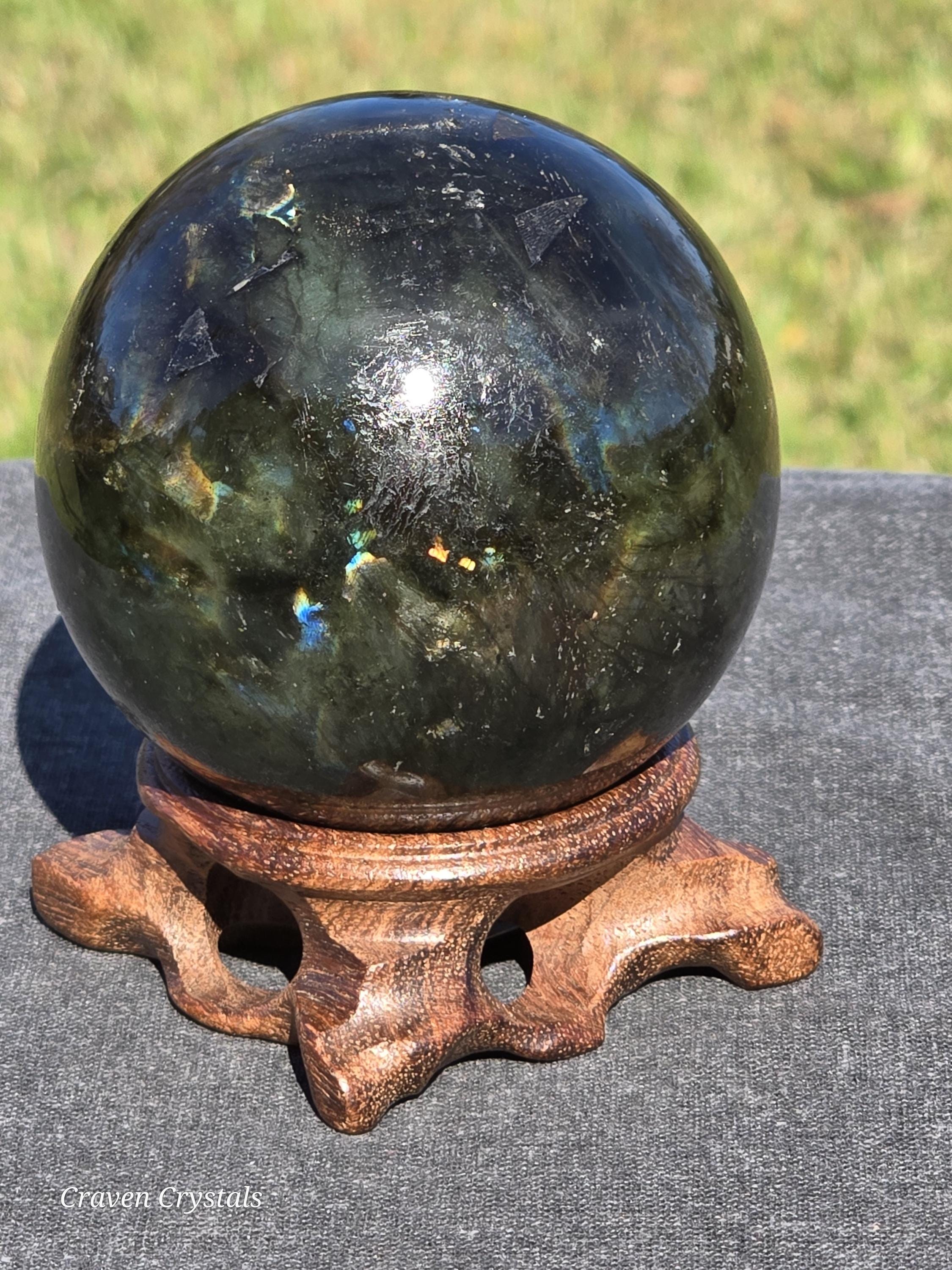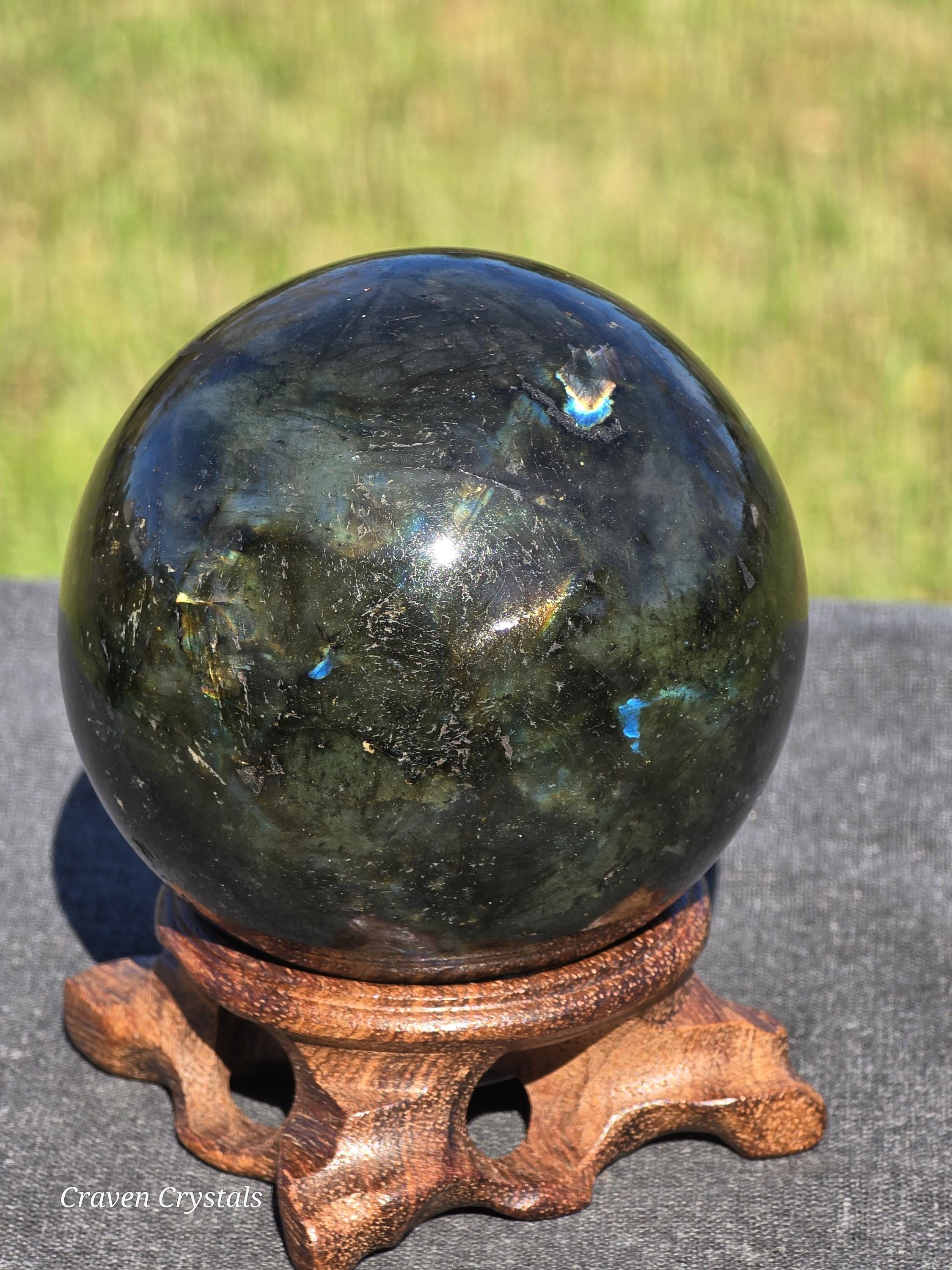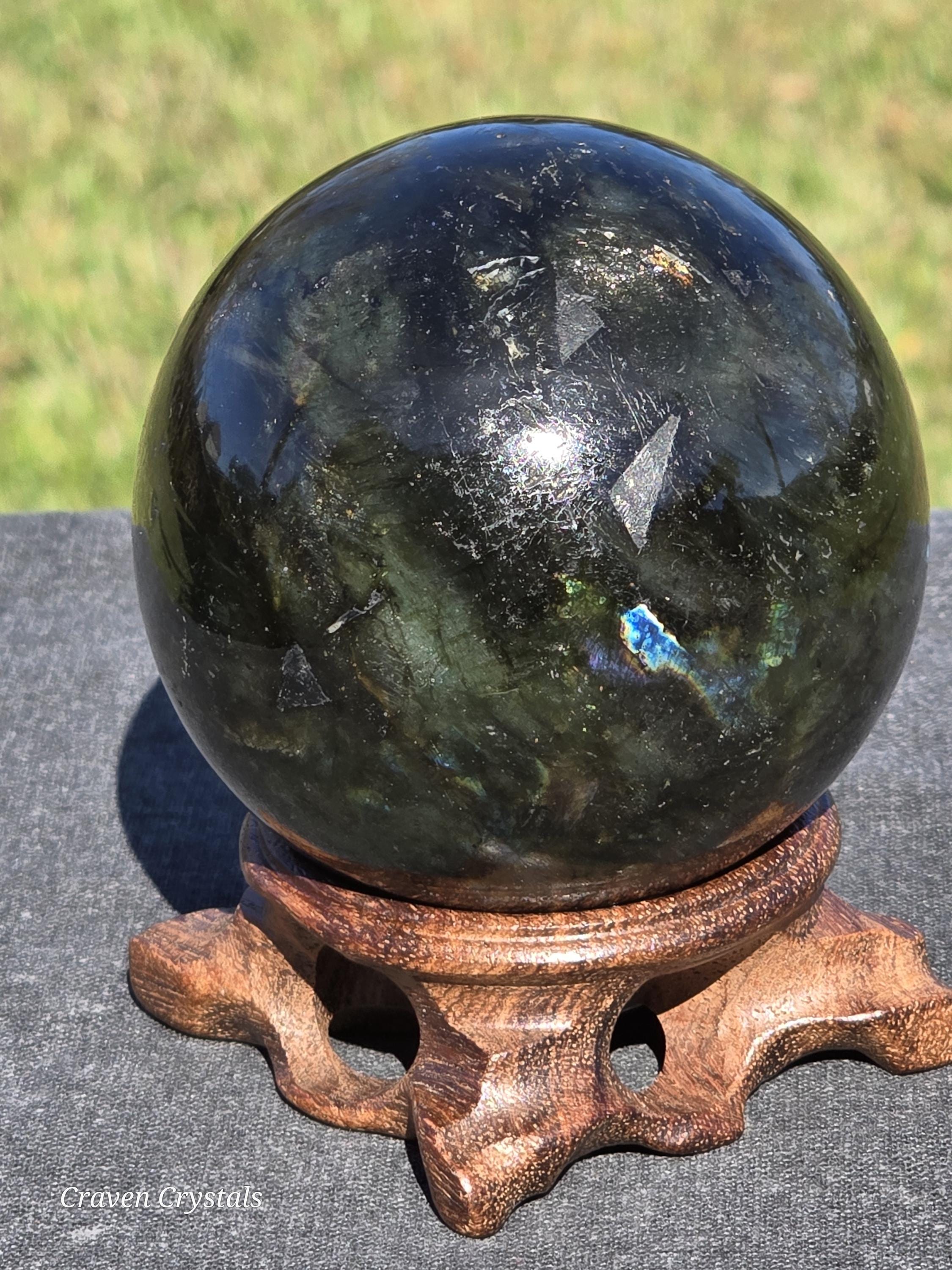 Rainbow flash Black Labradorite Crystal Sphere with spots of purple, blue, green and gold
