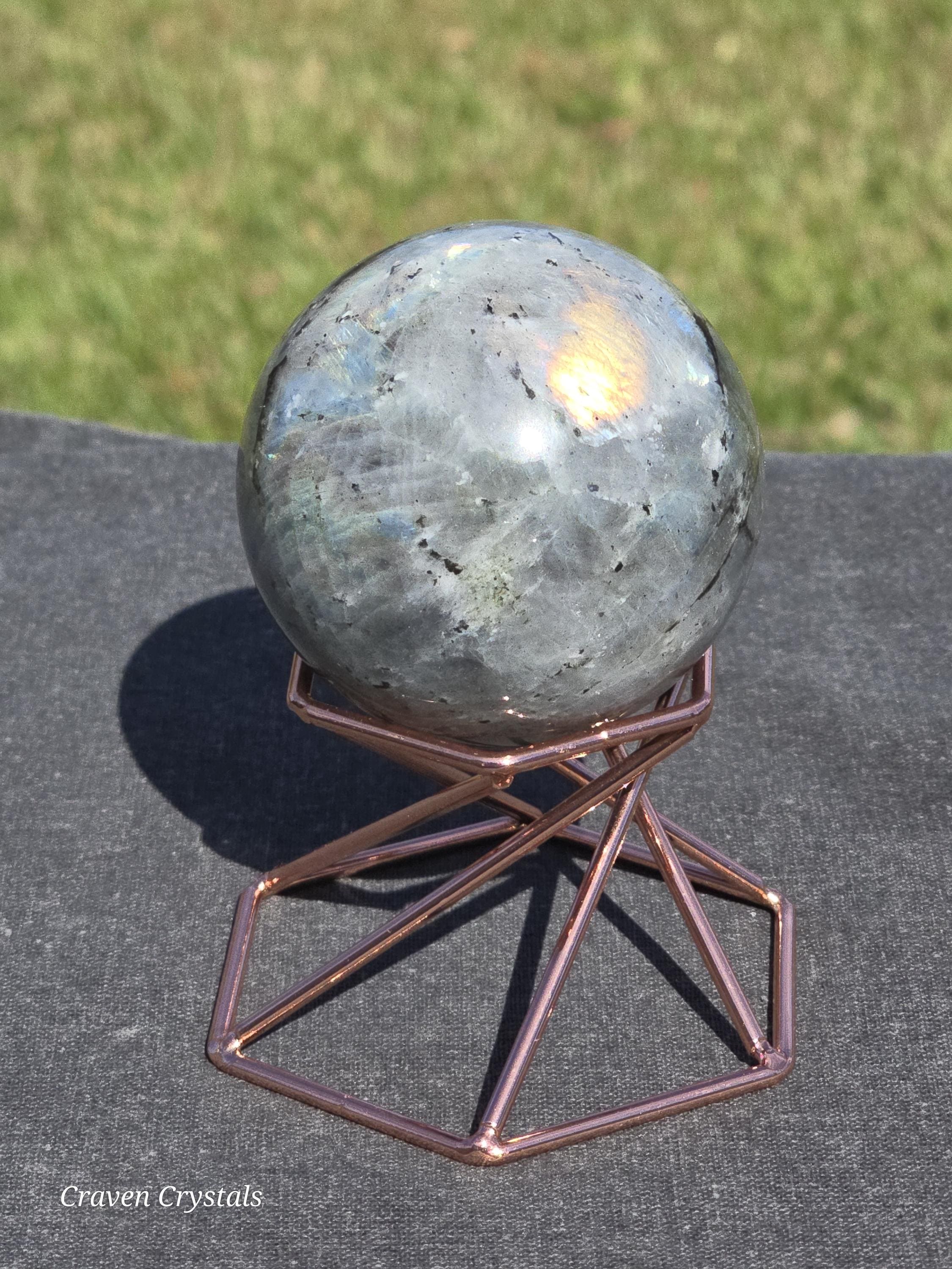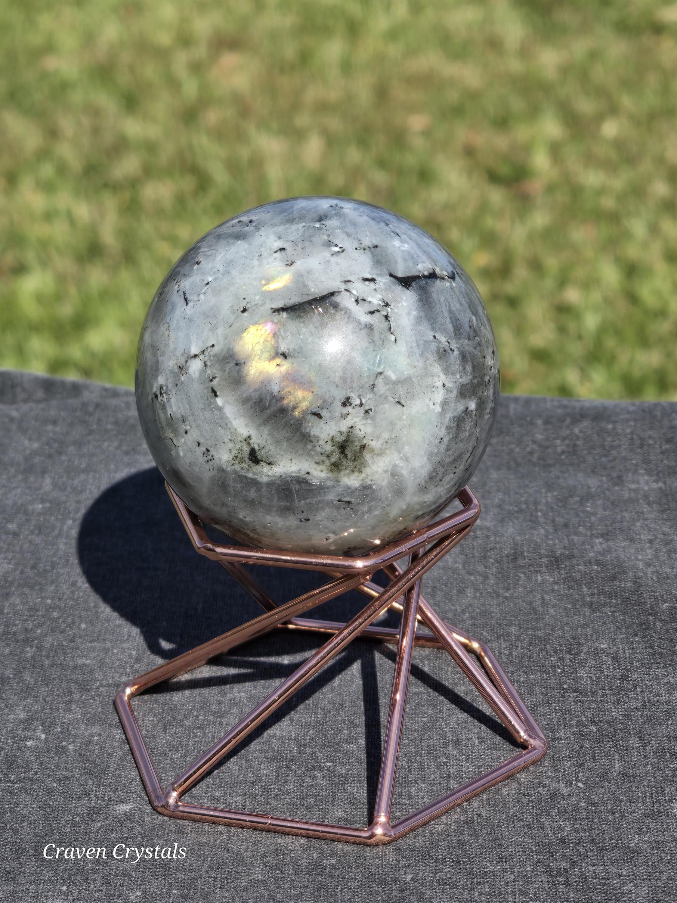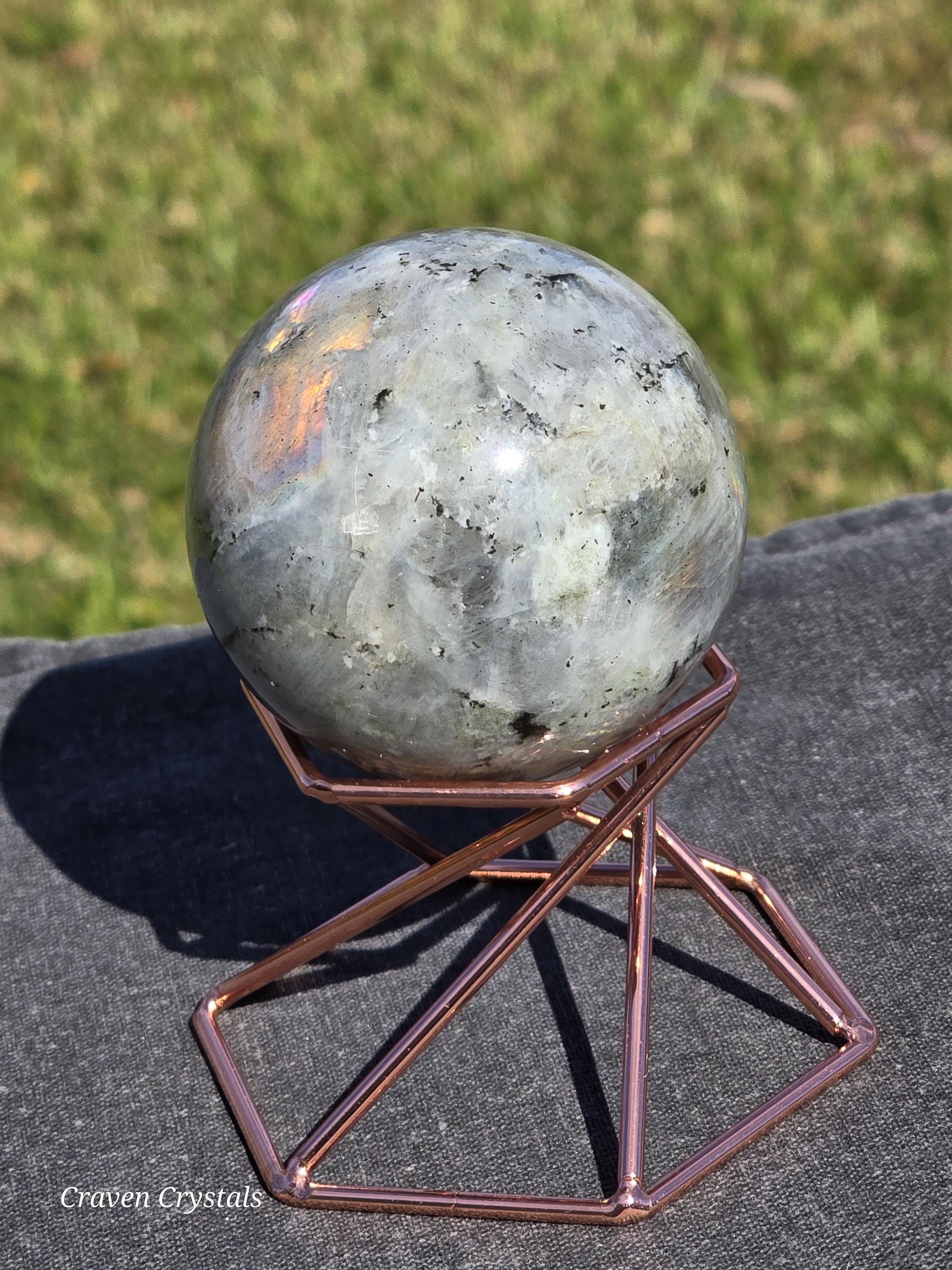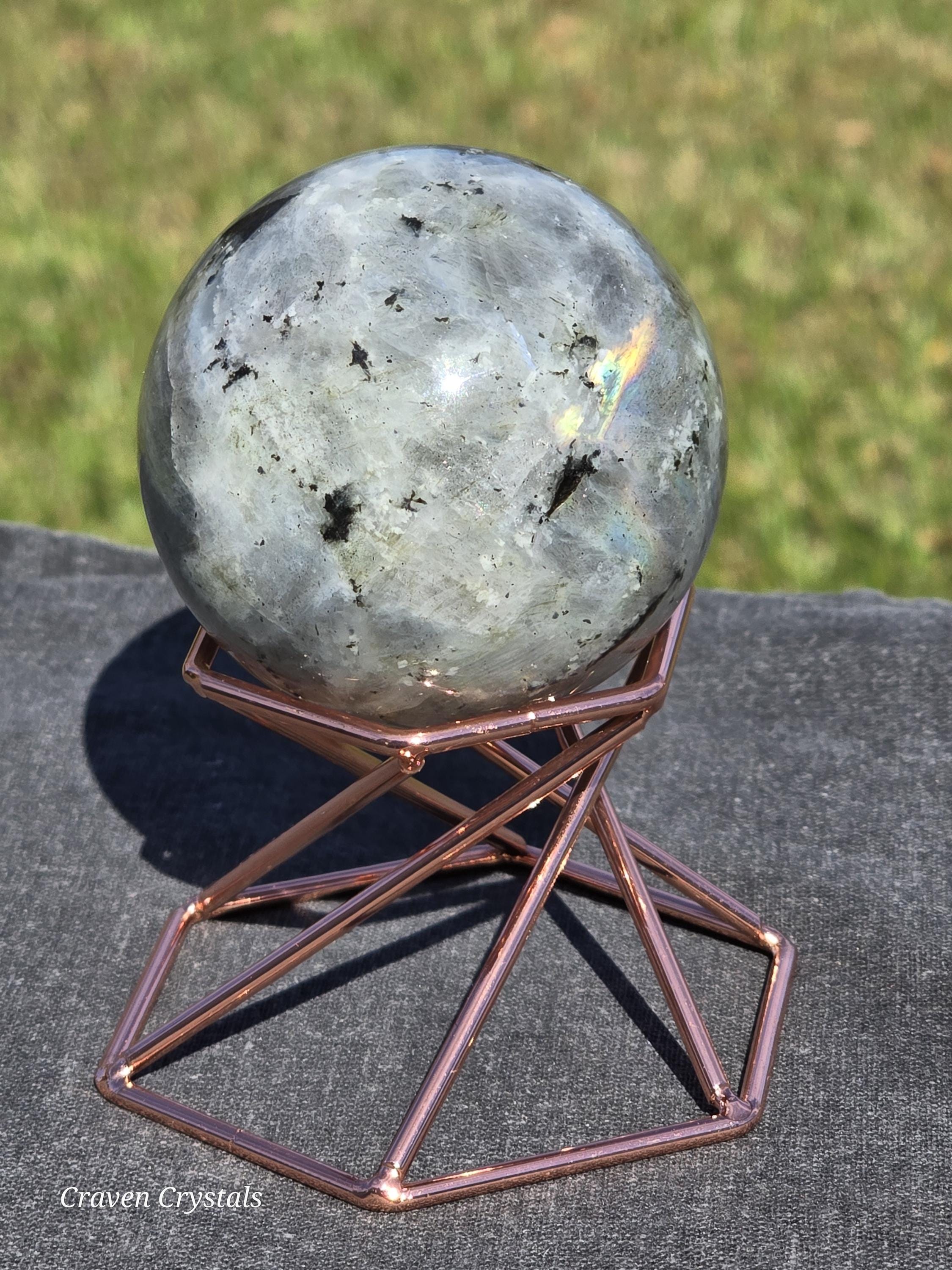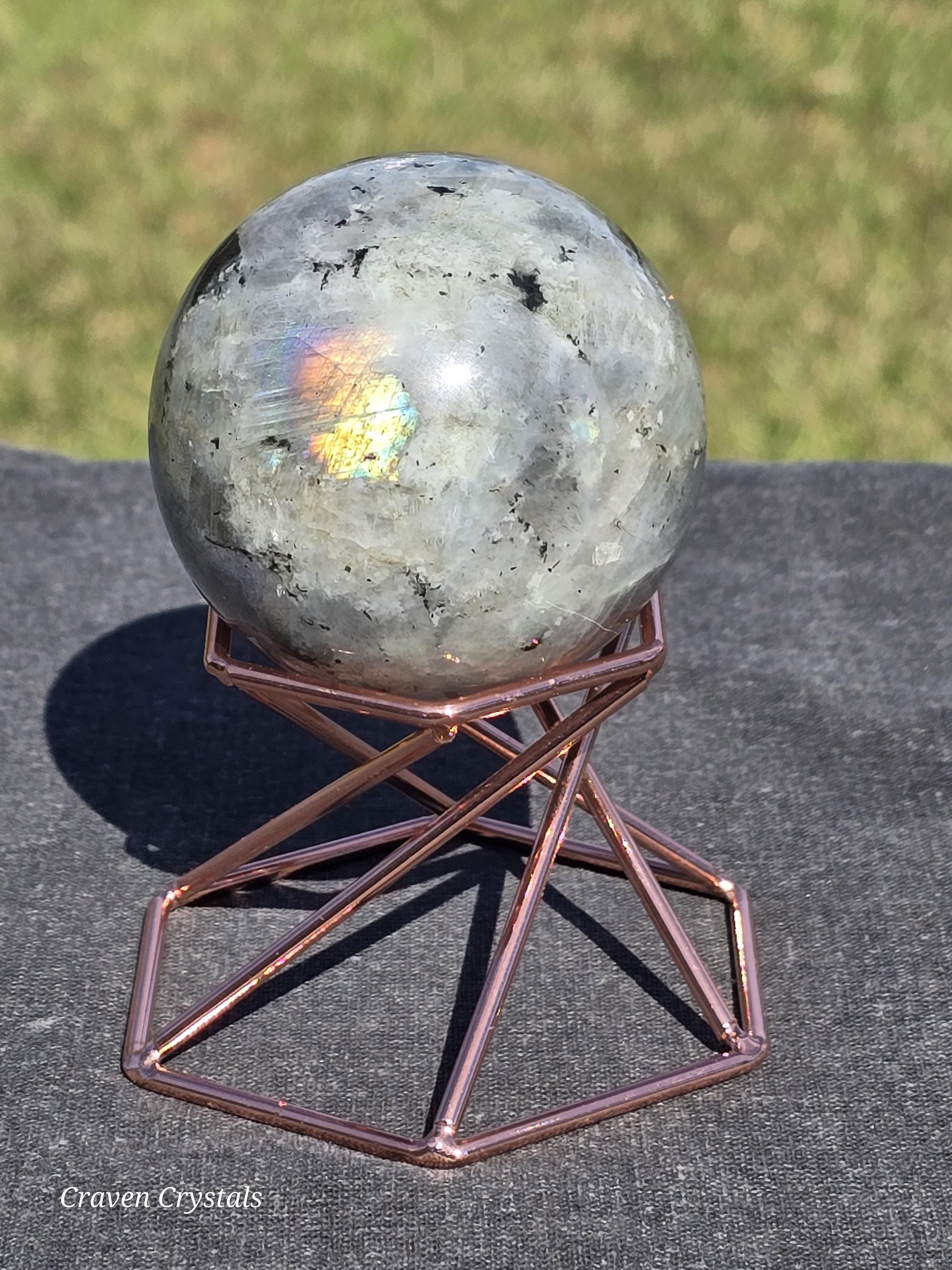 Rainbow flash light gray Labradorite Crystal Sphere with spots of purple, blue, green and gold