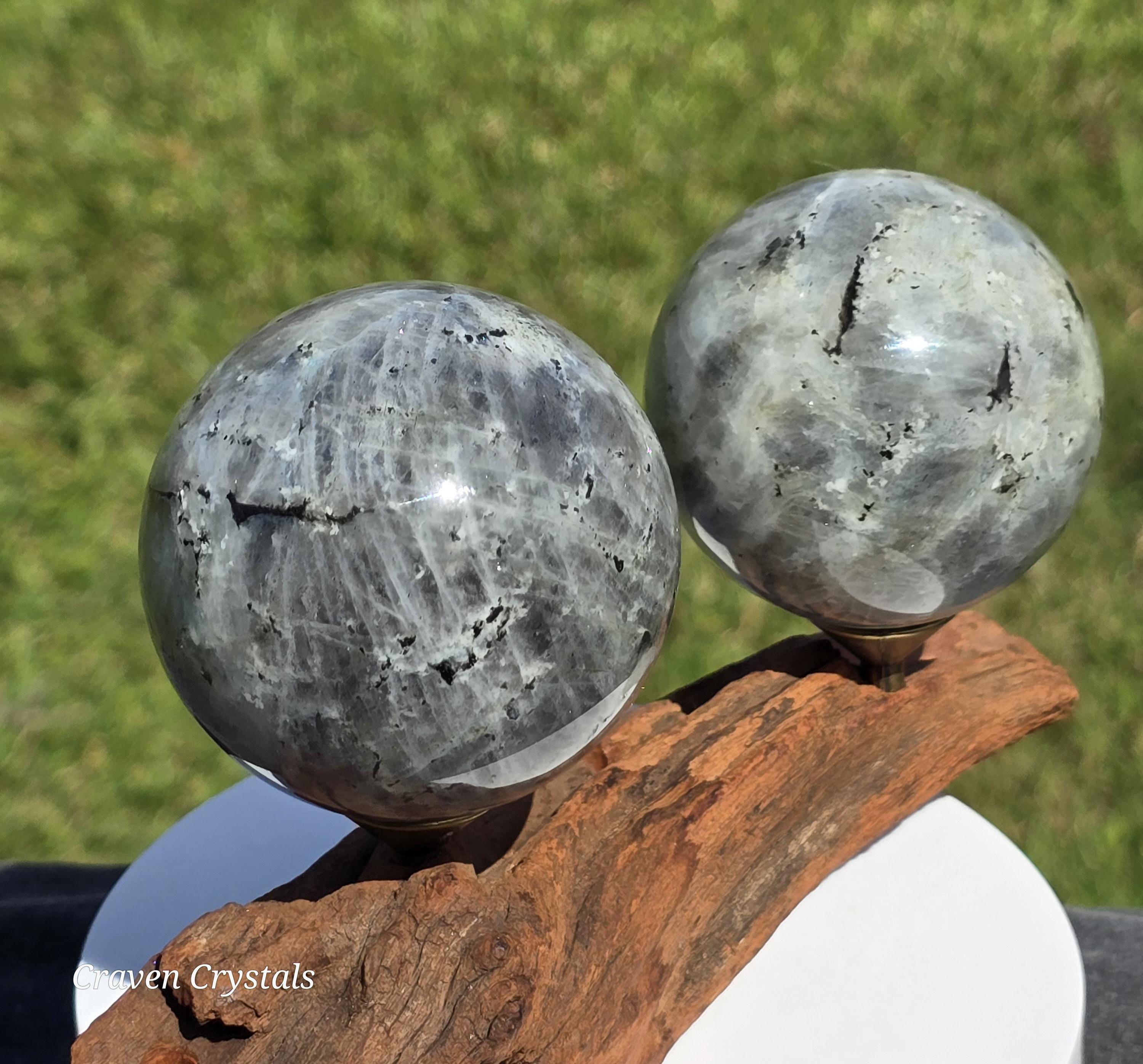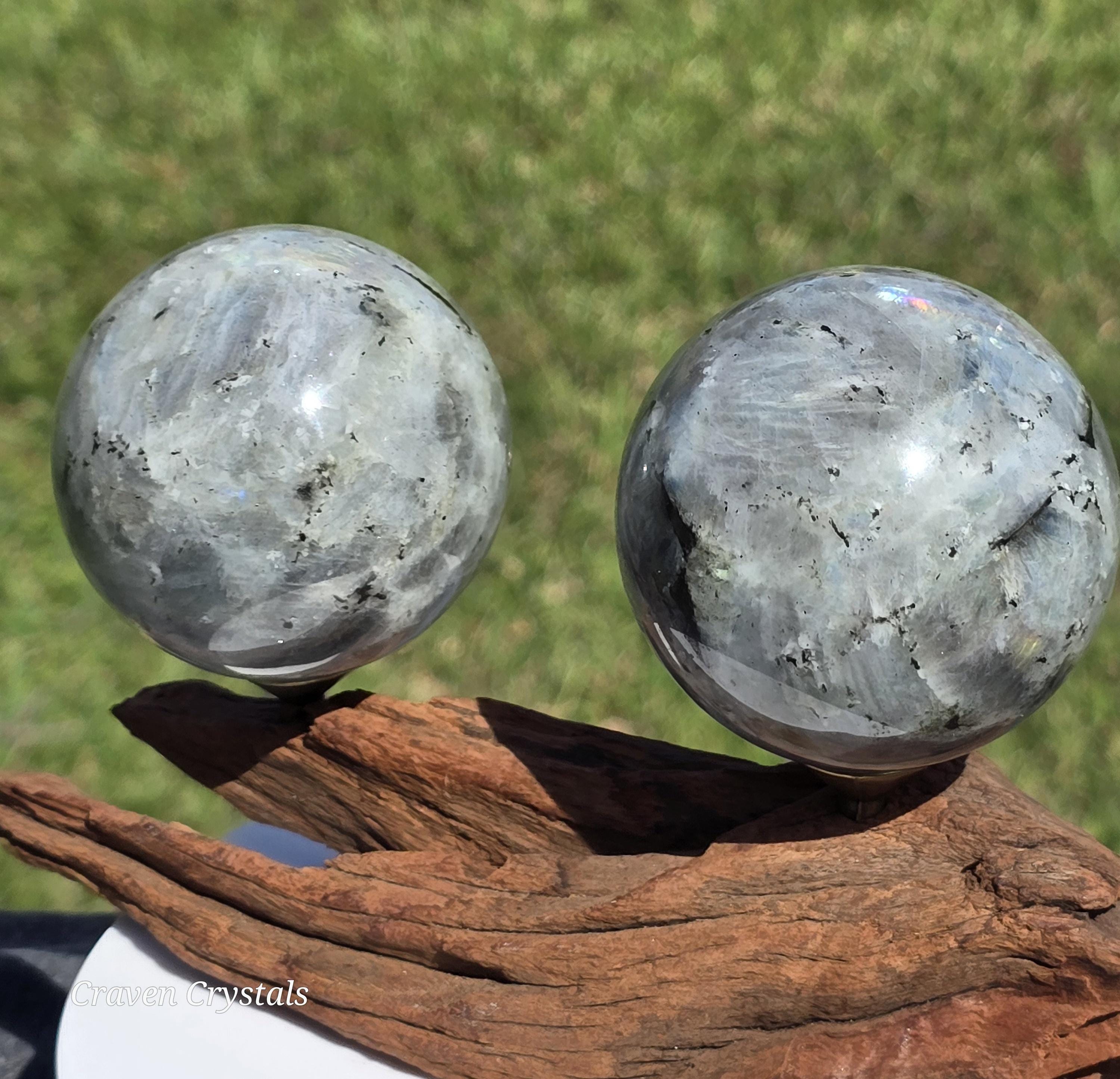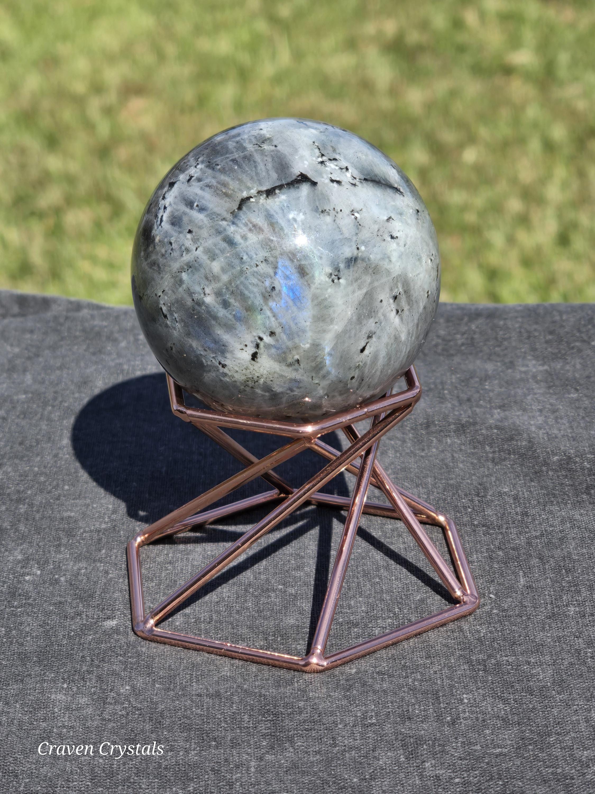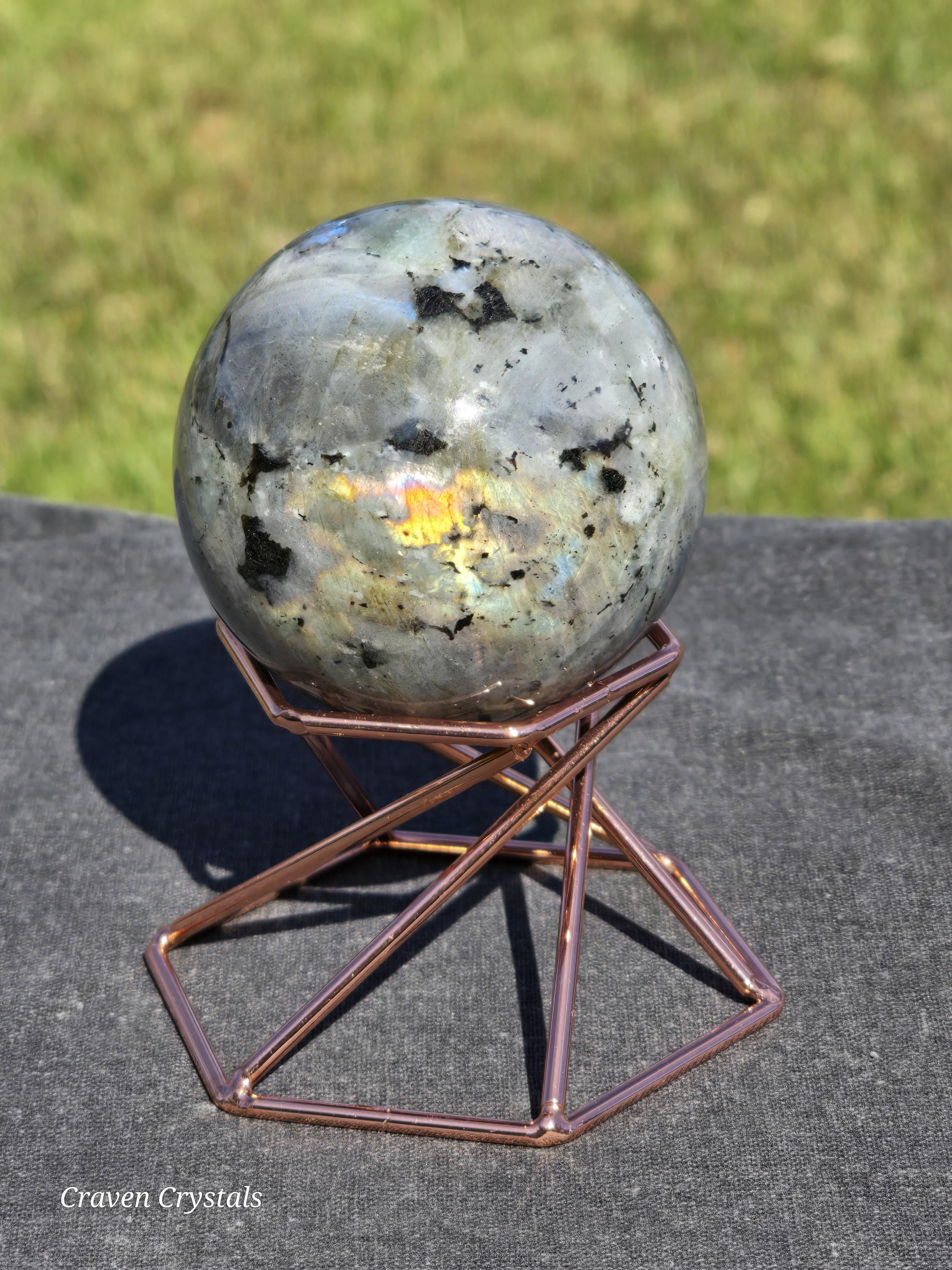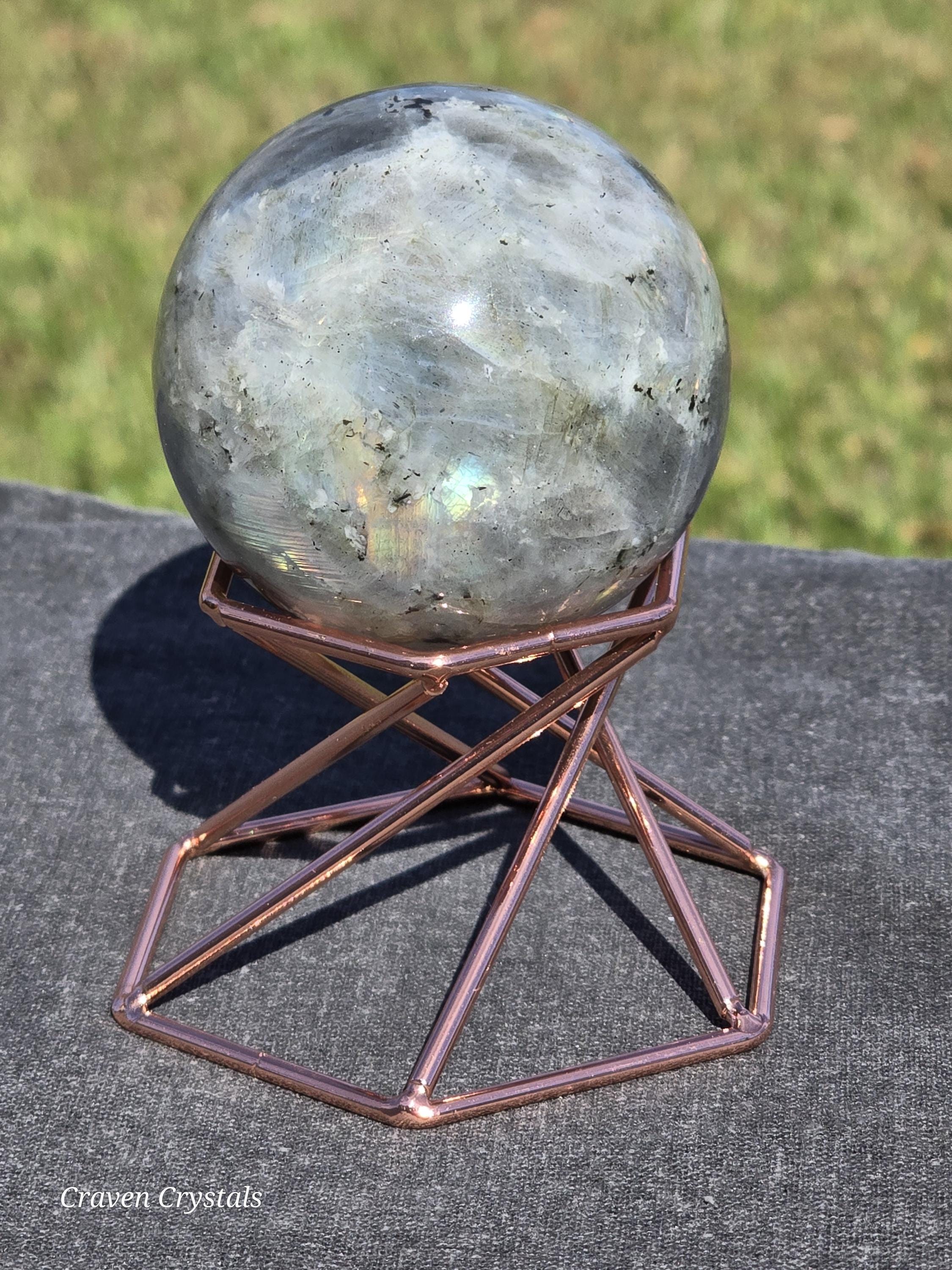 Rainbow flash light gray Labradorite Crystal Sphere with spots of purple, blue, green and gold