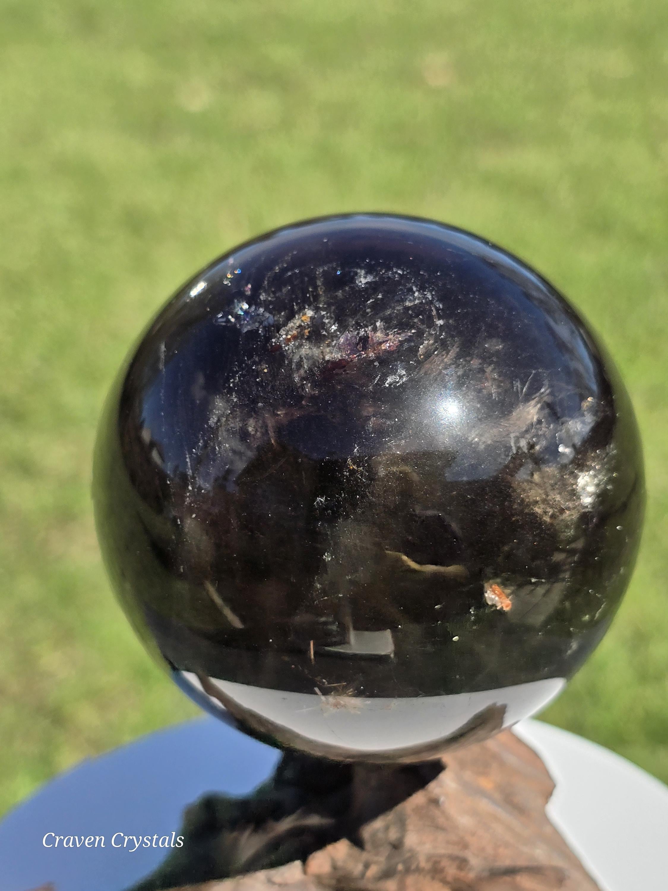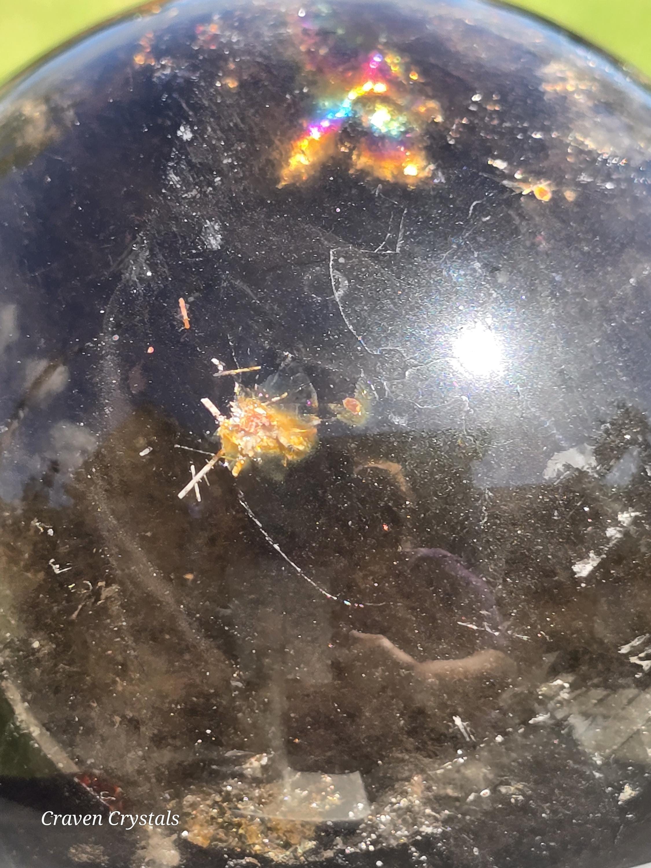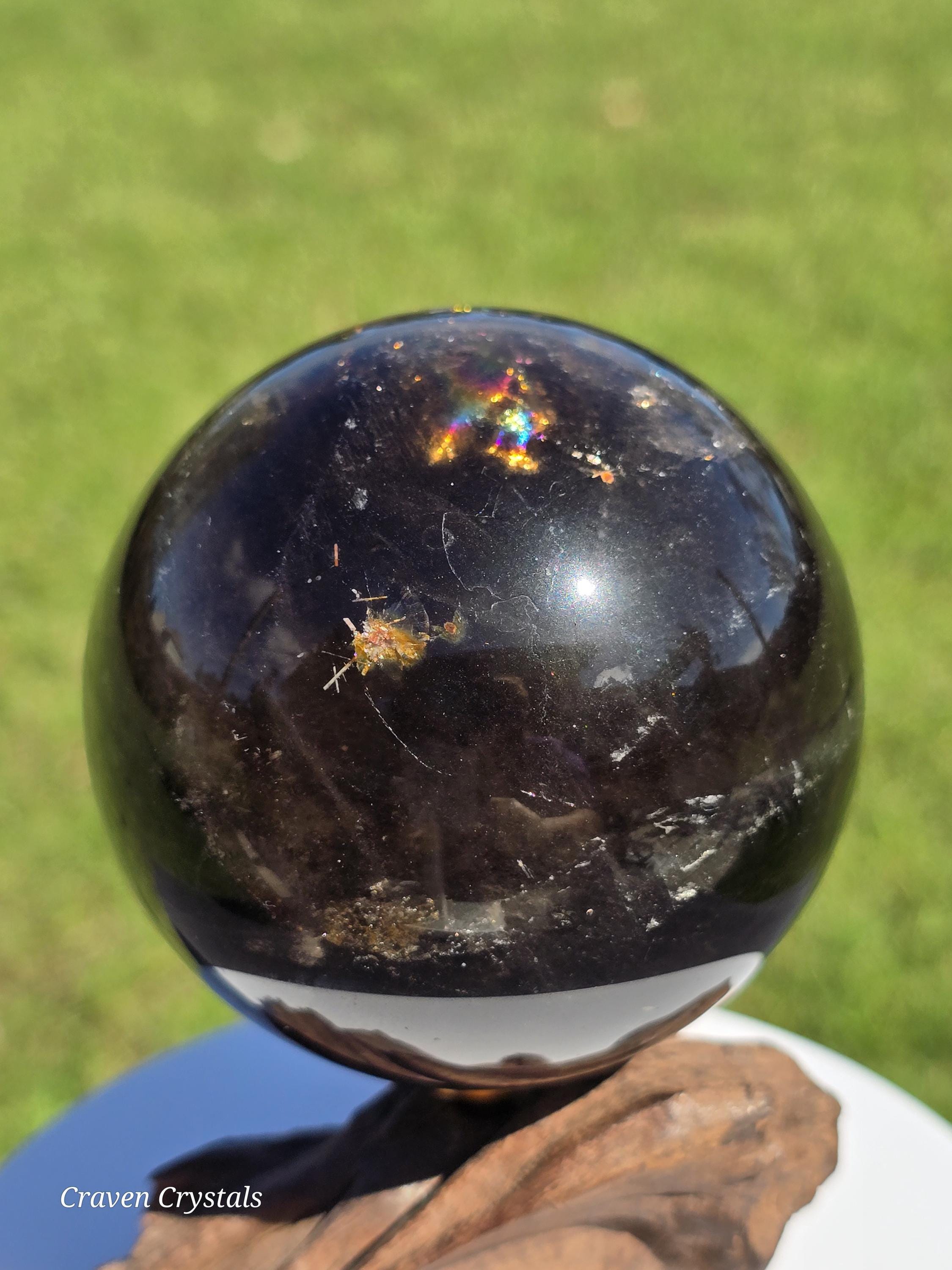 Amazing dark Smokey Quartz Crystal Sphere with rainbows and a burst of golden rutile