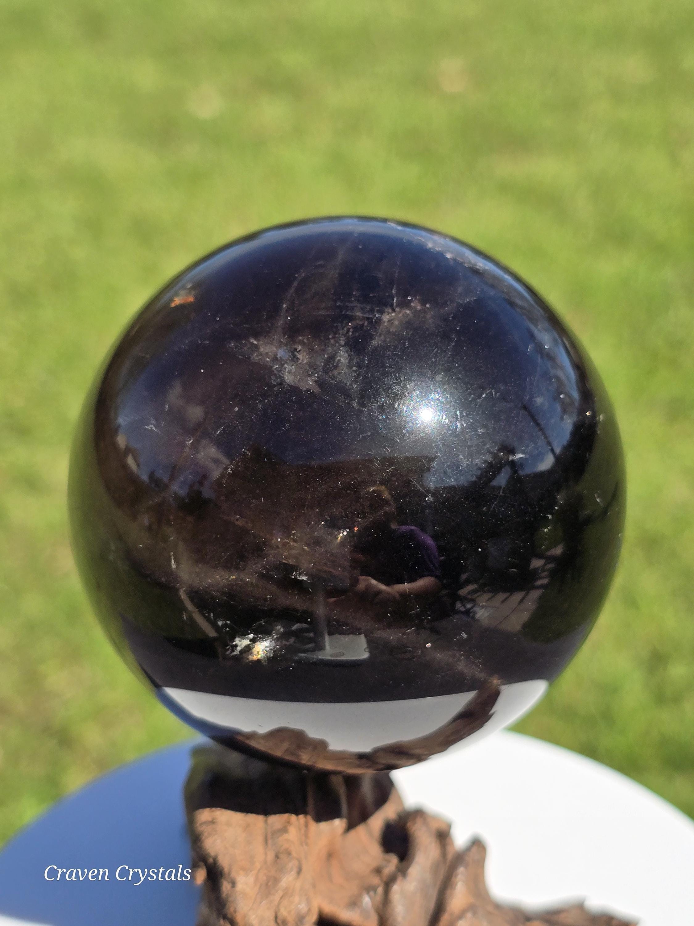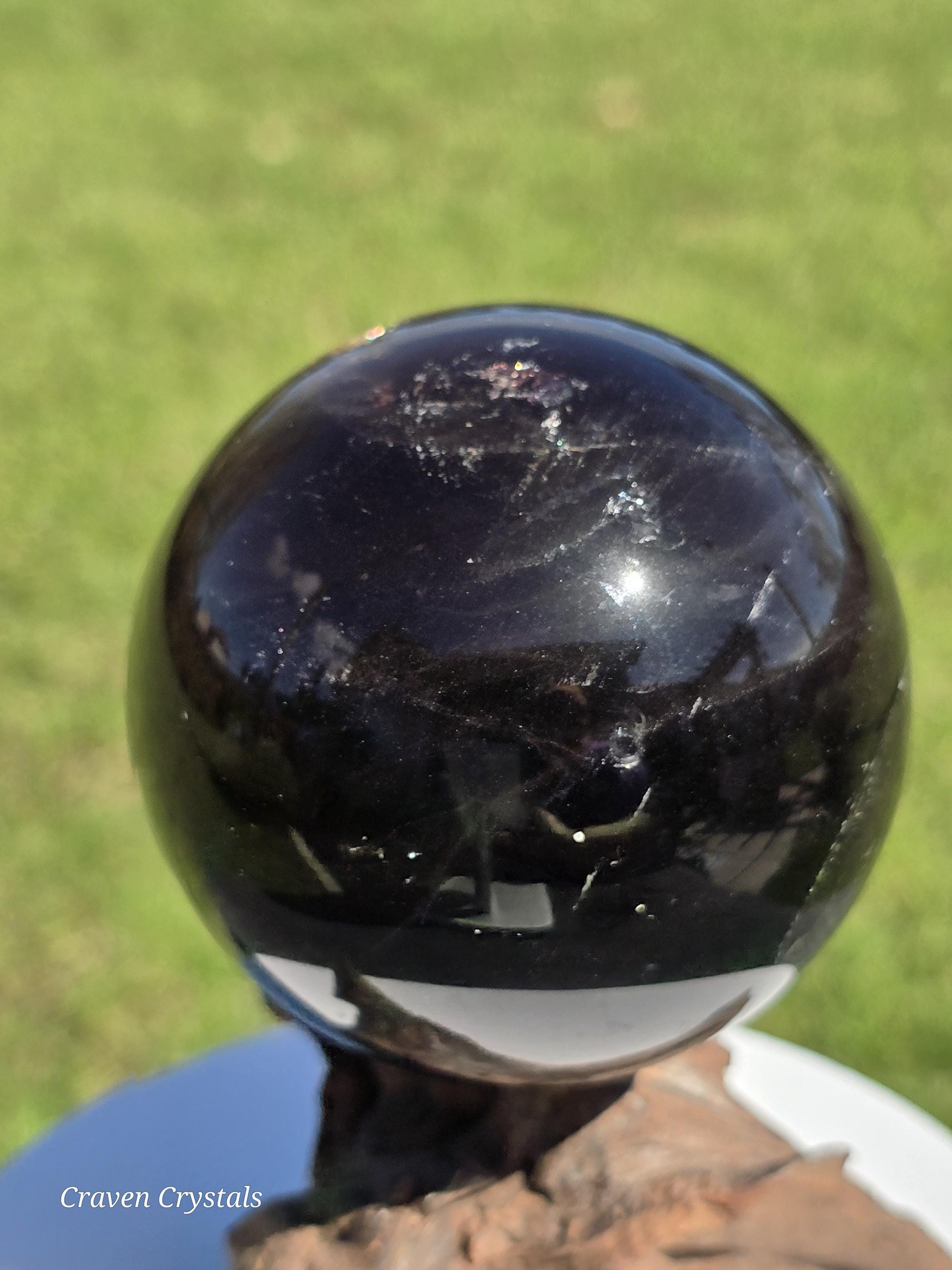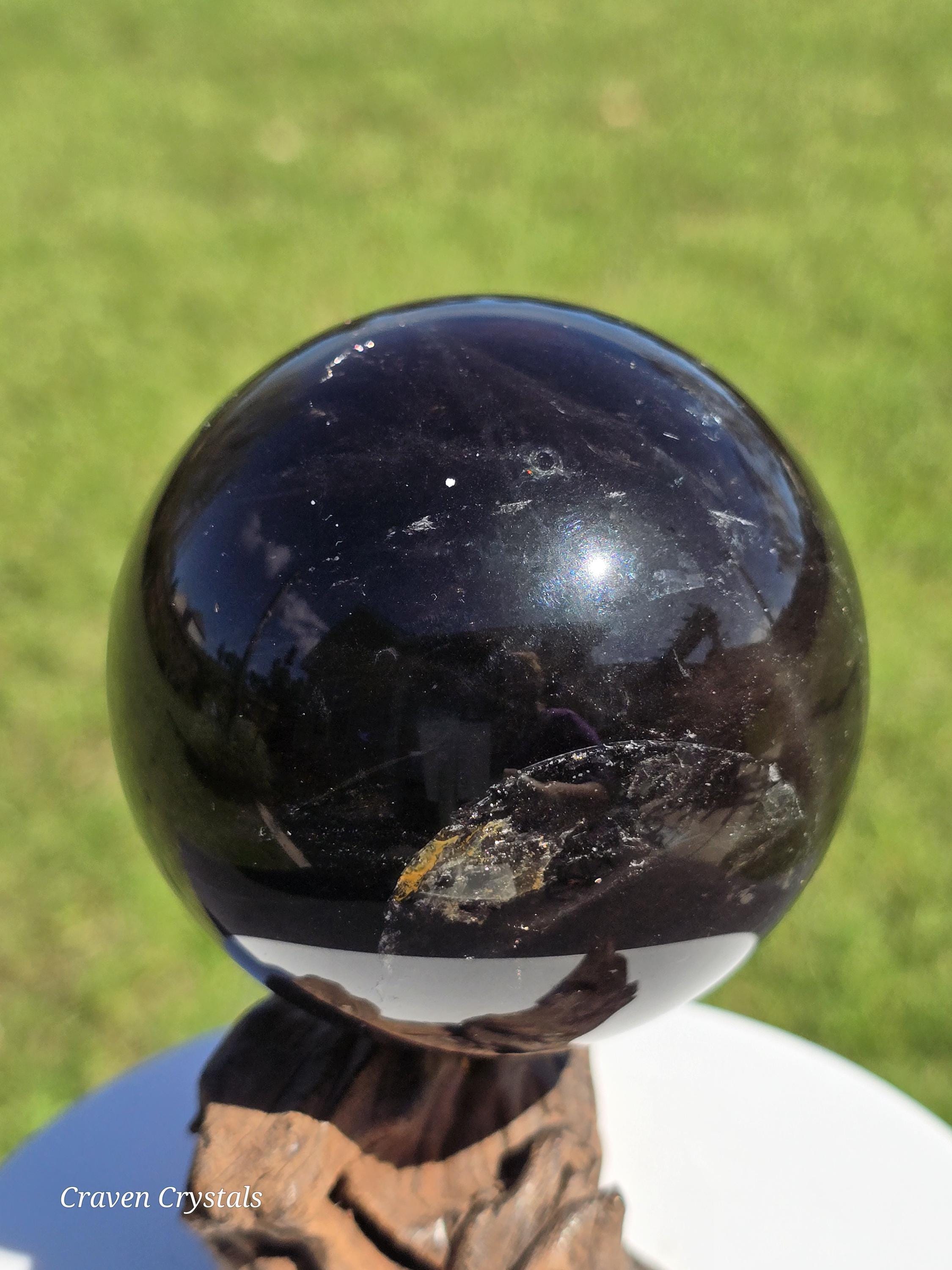 Amazing dark Smokey Quartz Crystal Sphere with rainbows and a burst of golden rutile