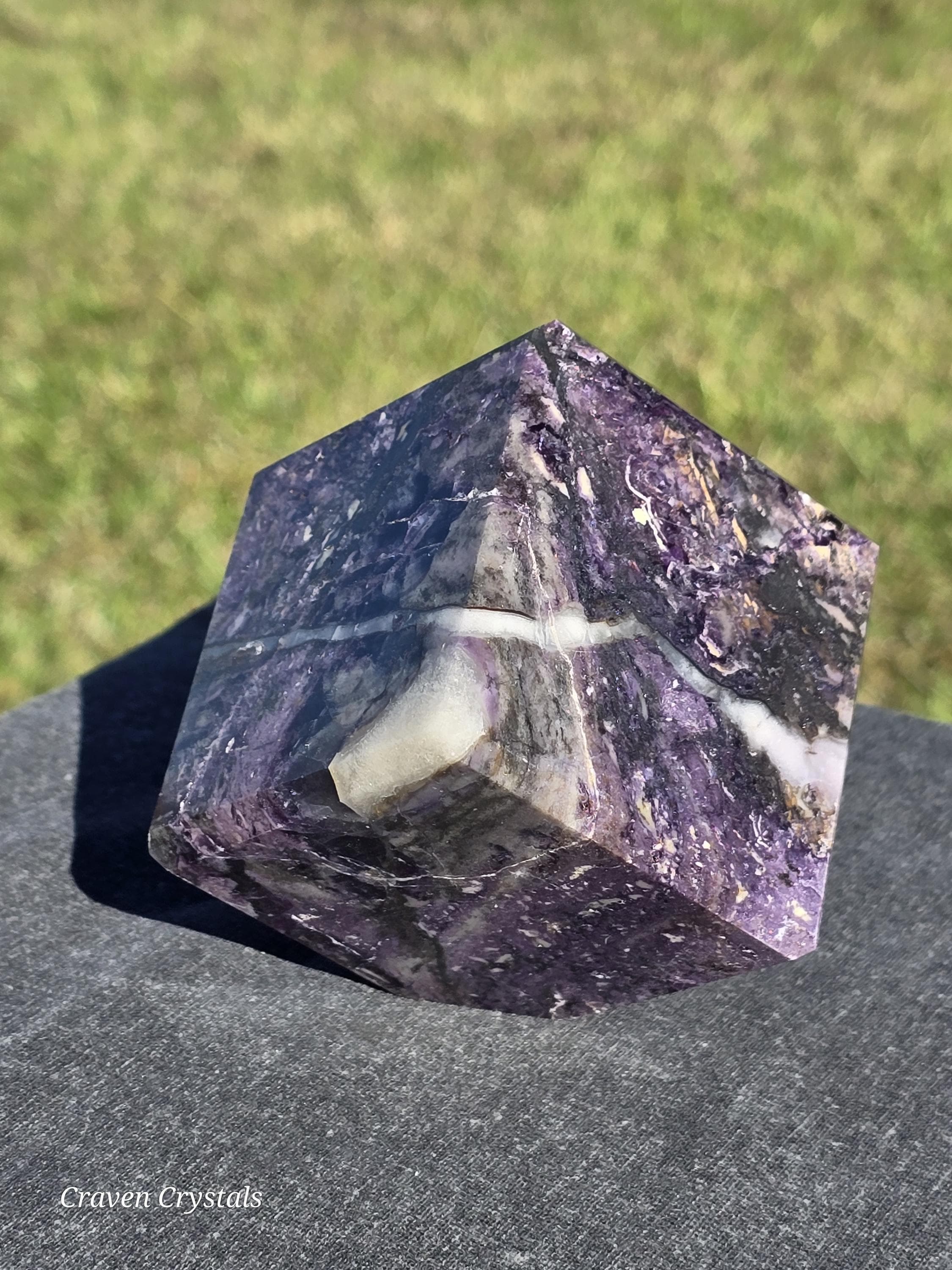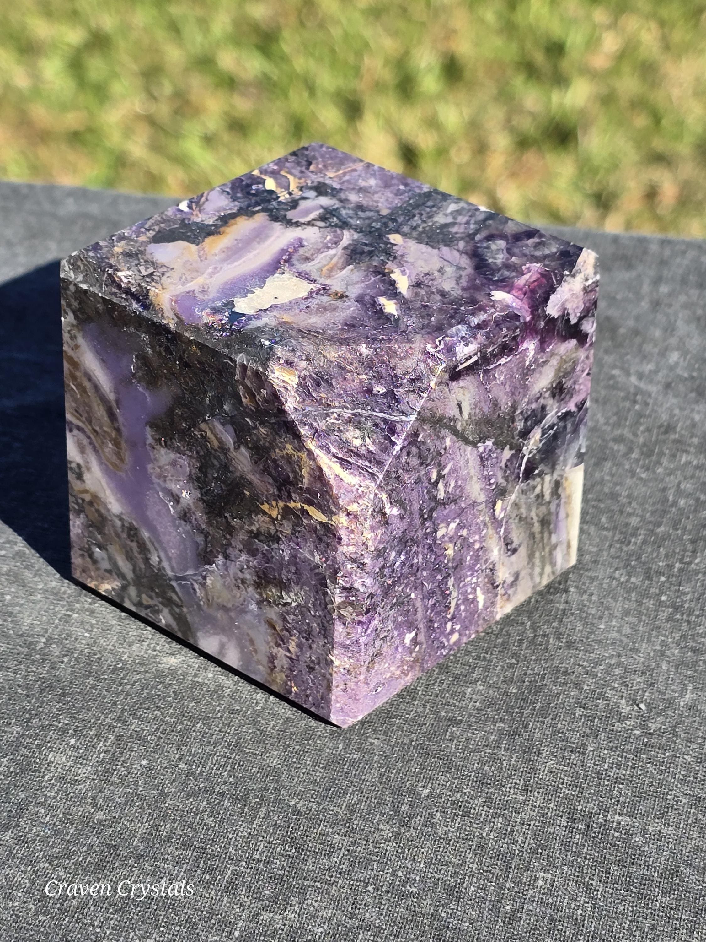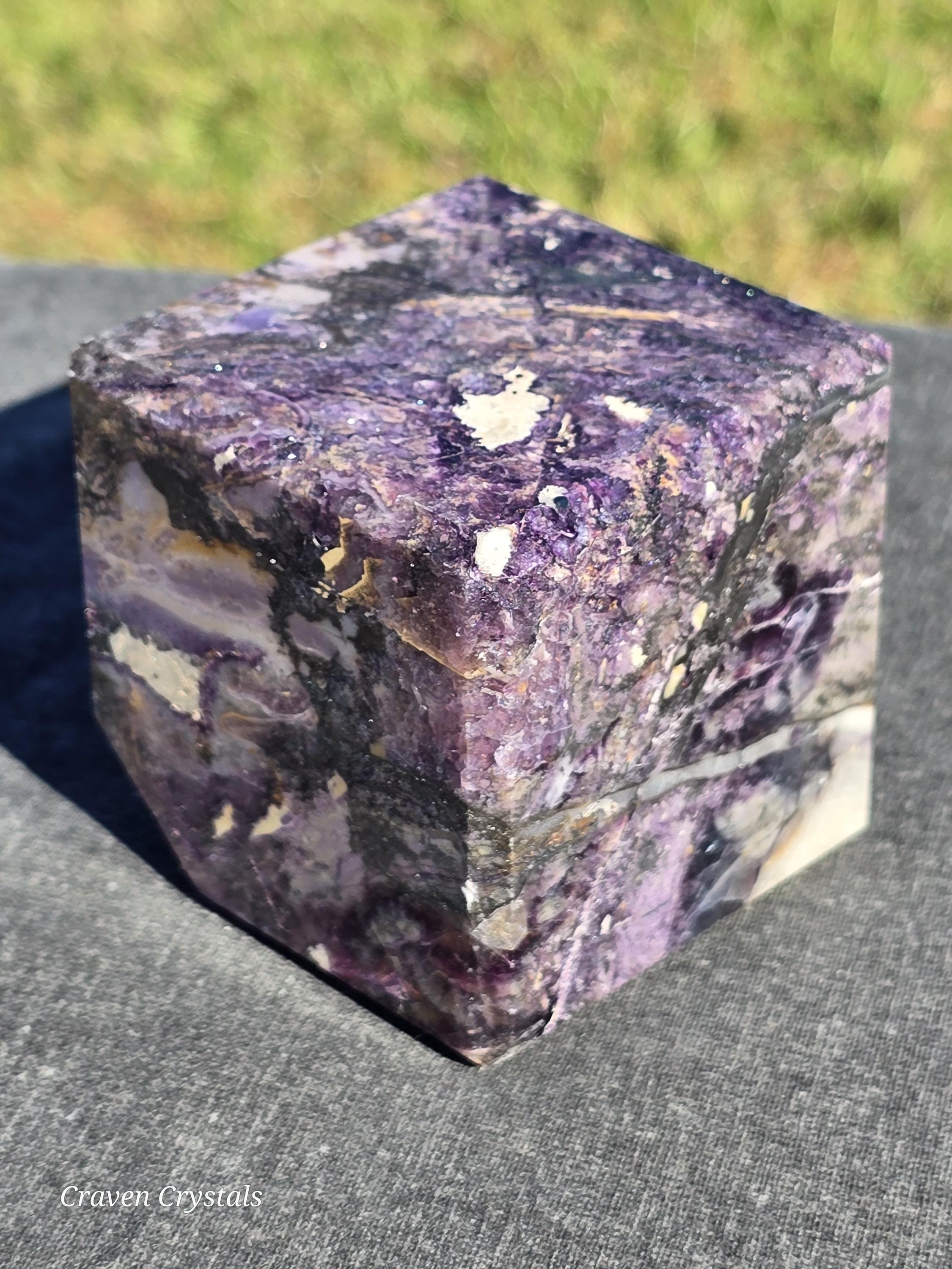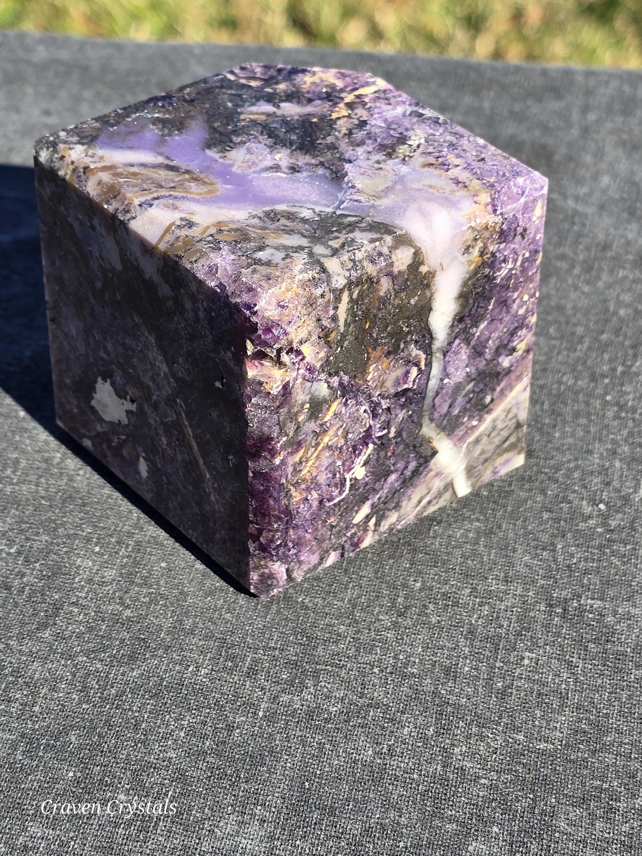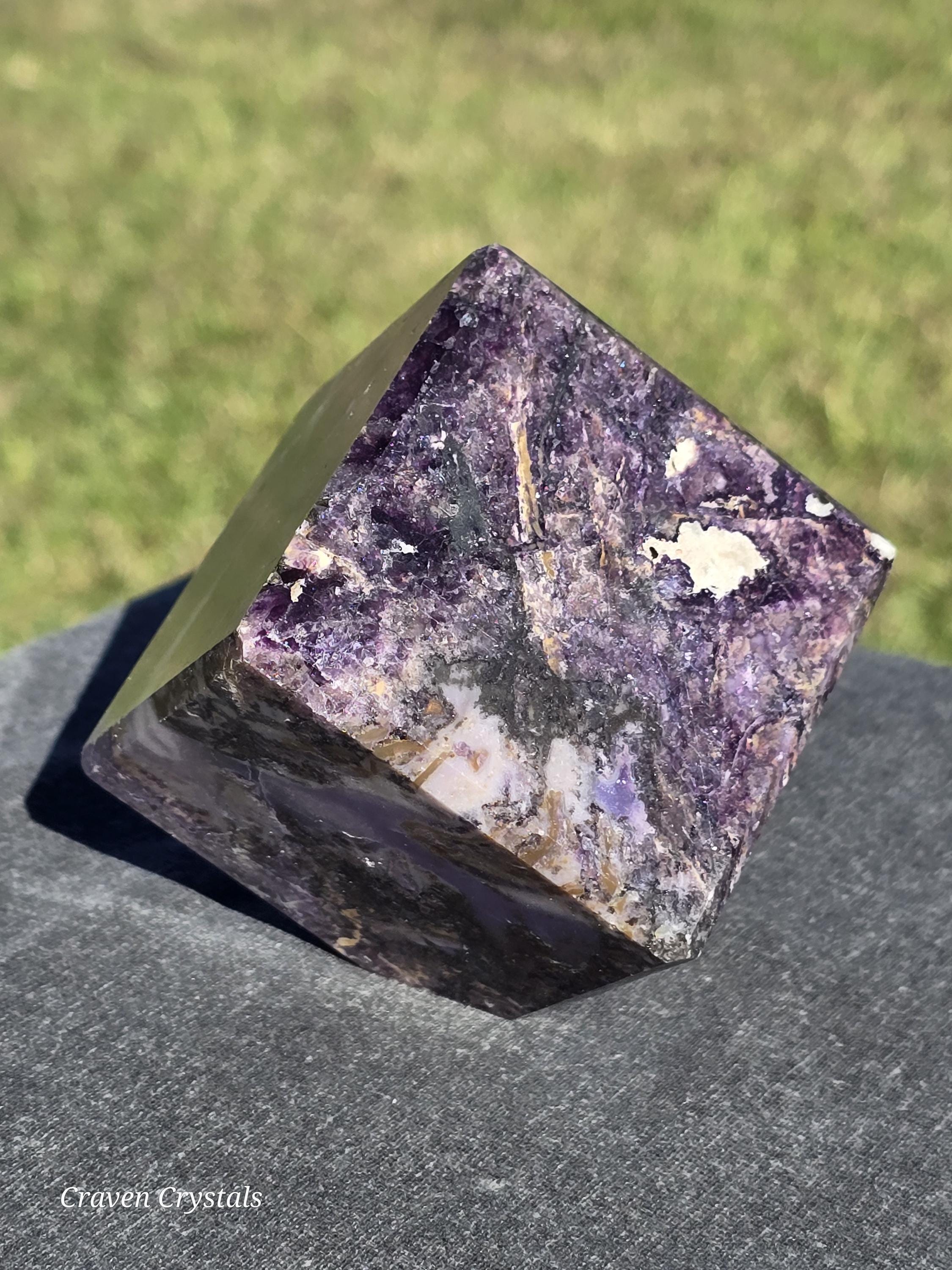 Beautiful Purple Fluorite Root Crystal Cube with cut corner to stand on.
