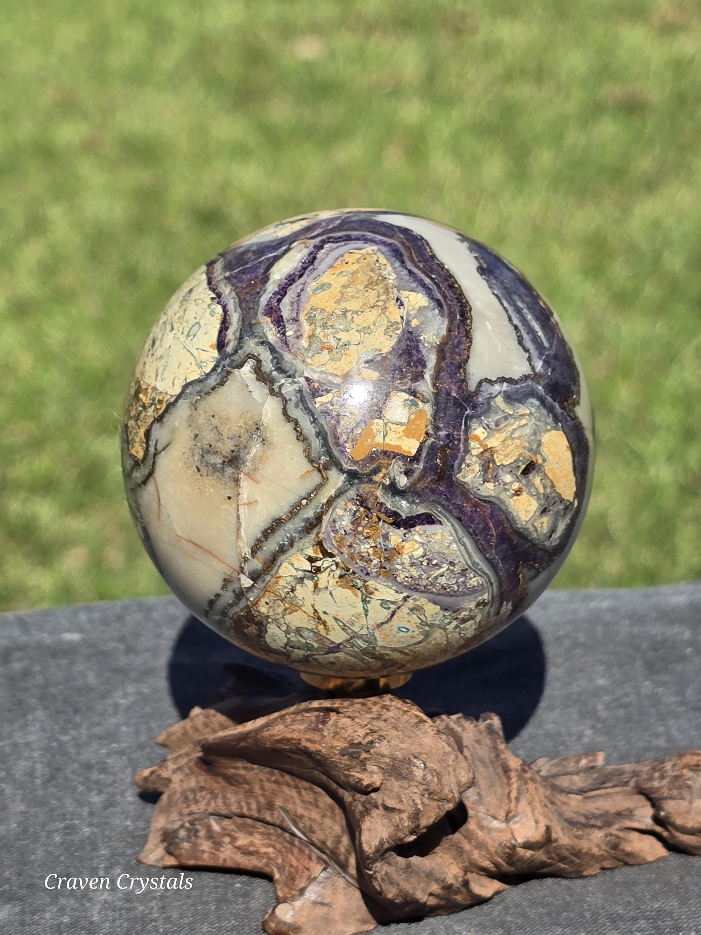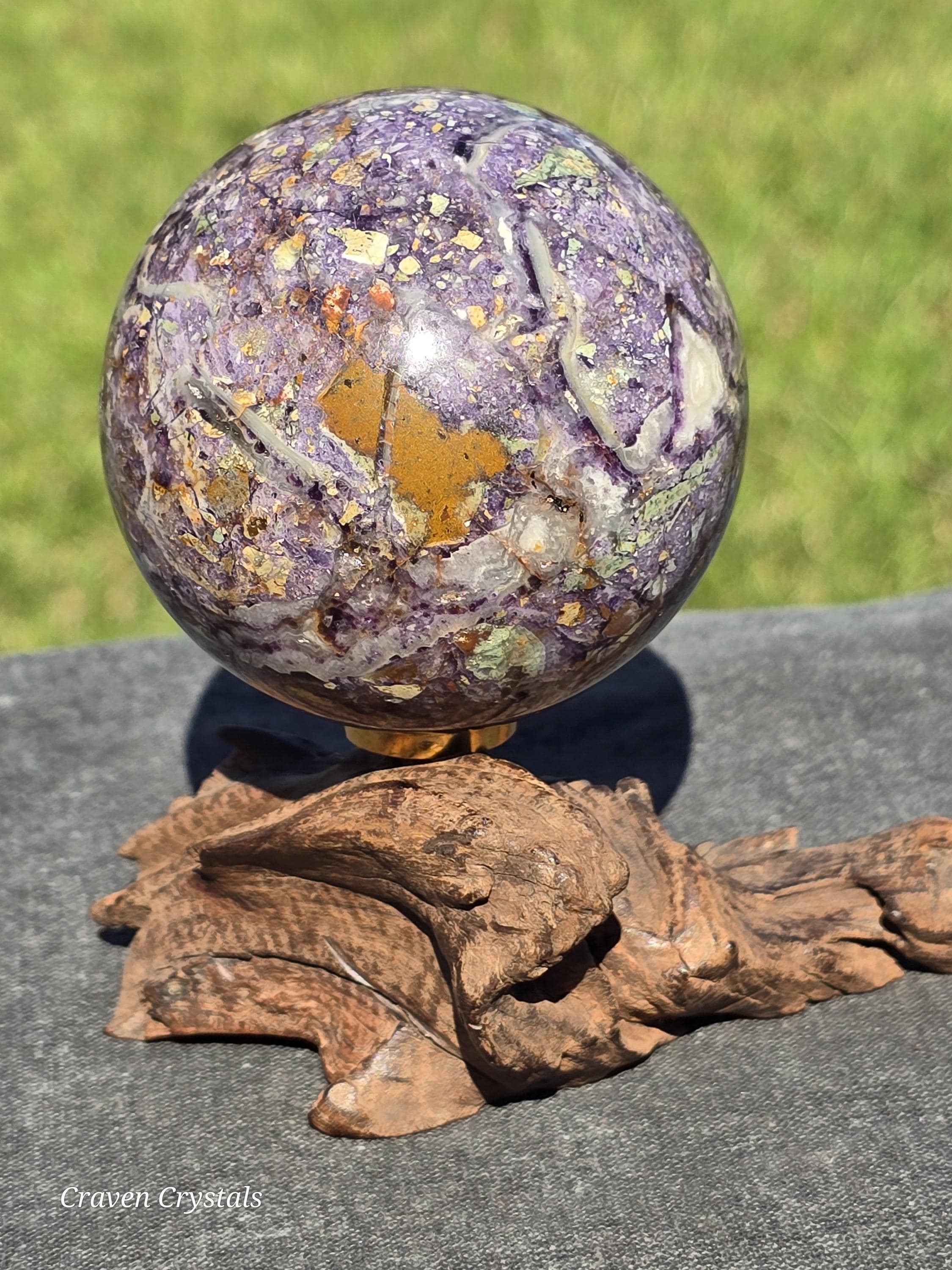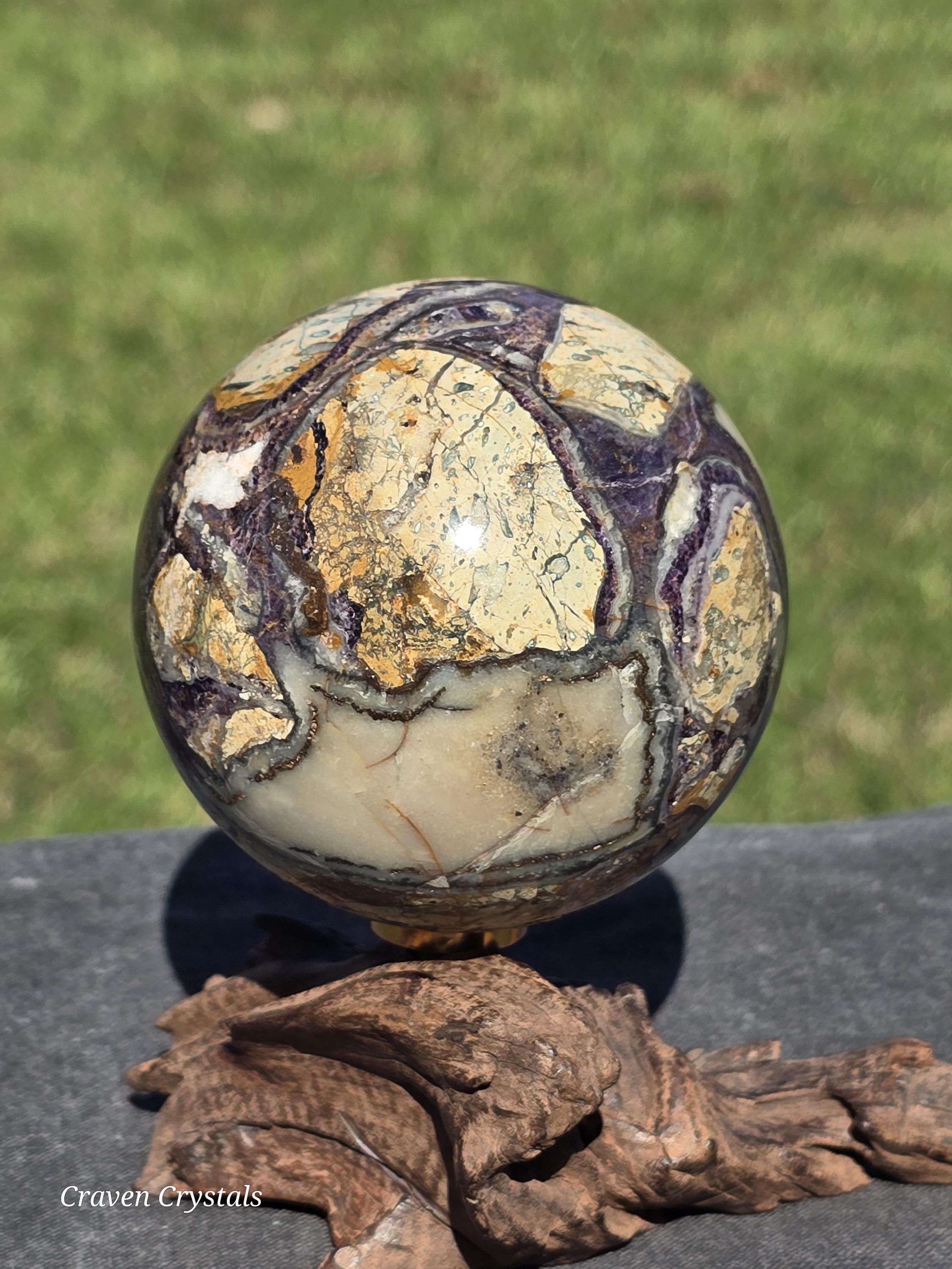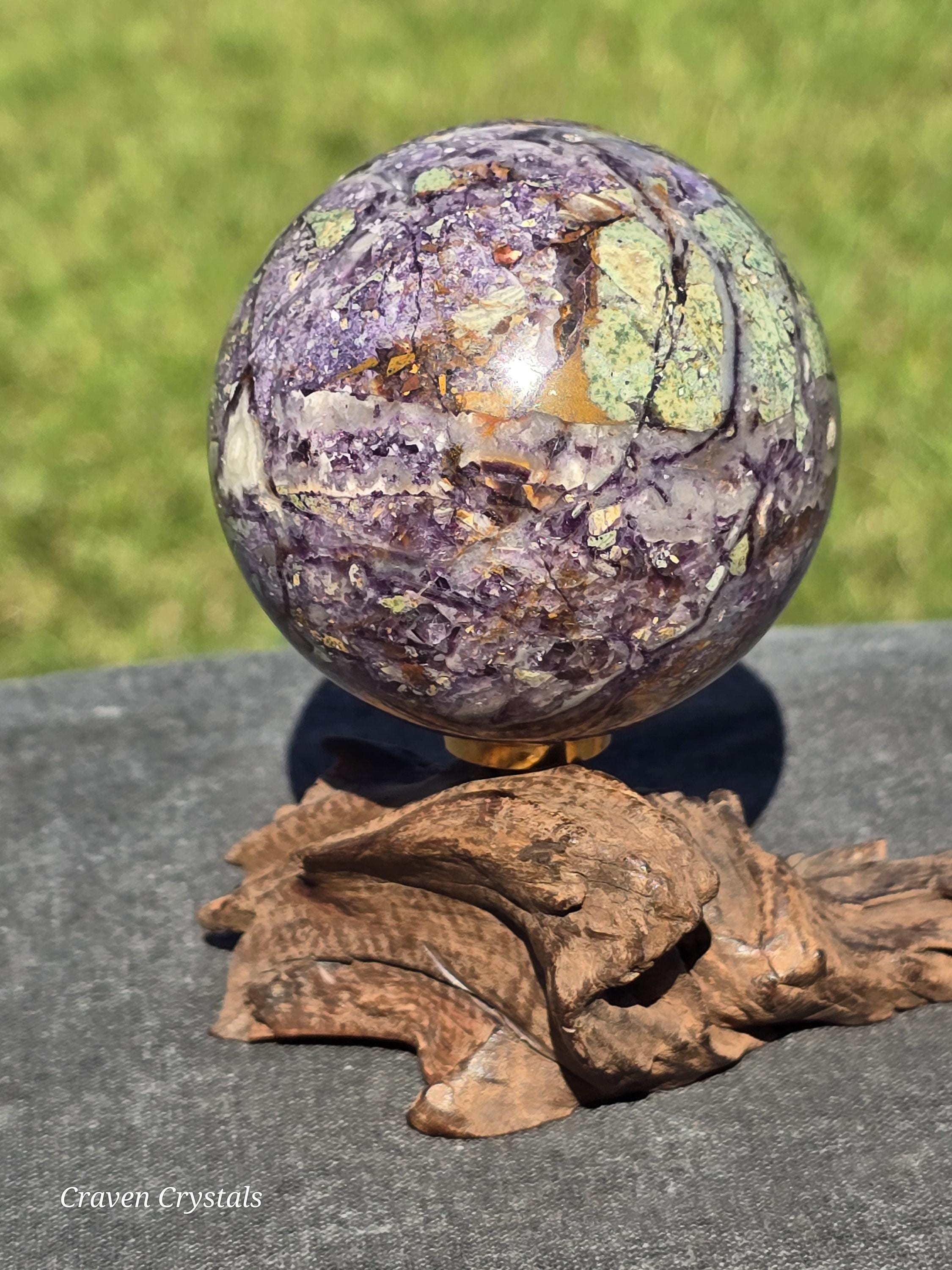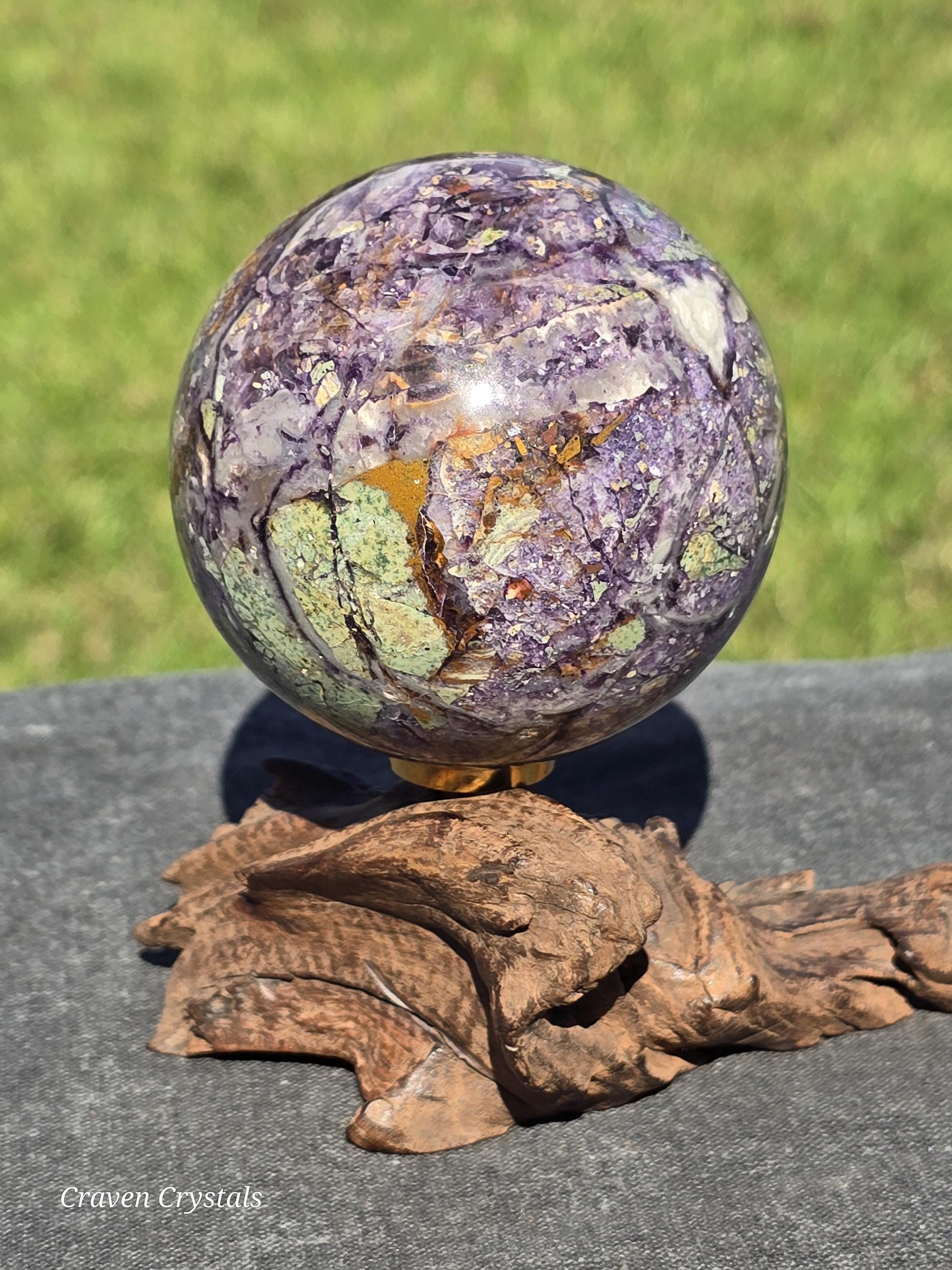 Brecciated Fluorite Root Crystal Sphere, a unique and visually striking form of fluorite that consists of angular fragments of fluorite cemented together by a fine-grained matrix. This brecciated appearance gives the stone a mosaic-like look.