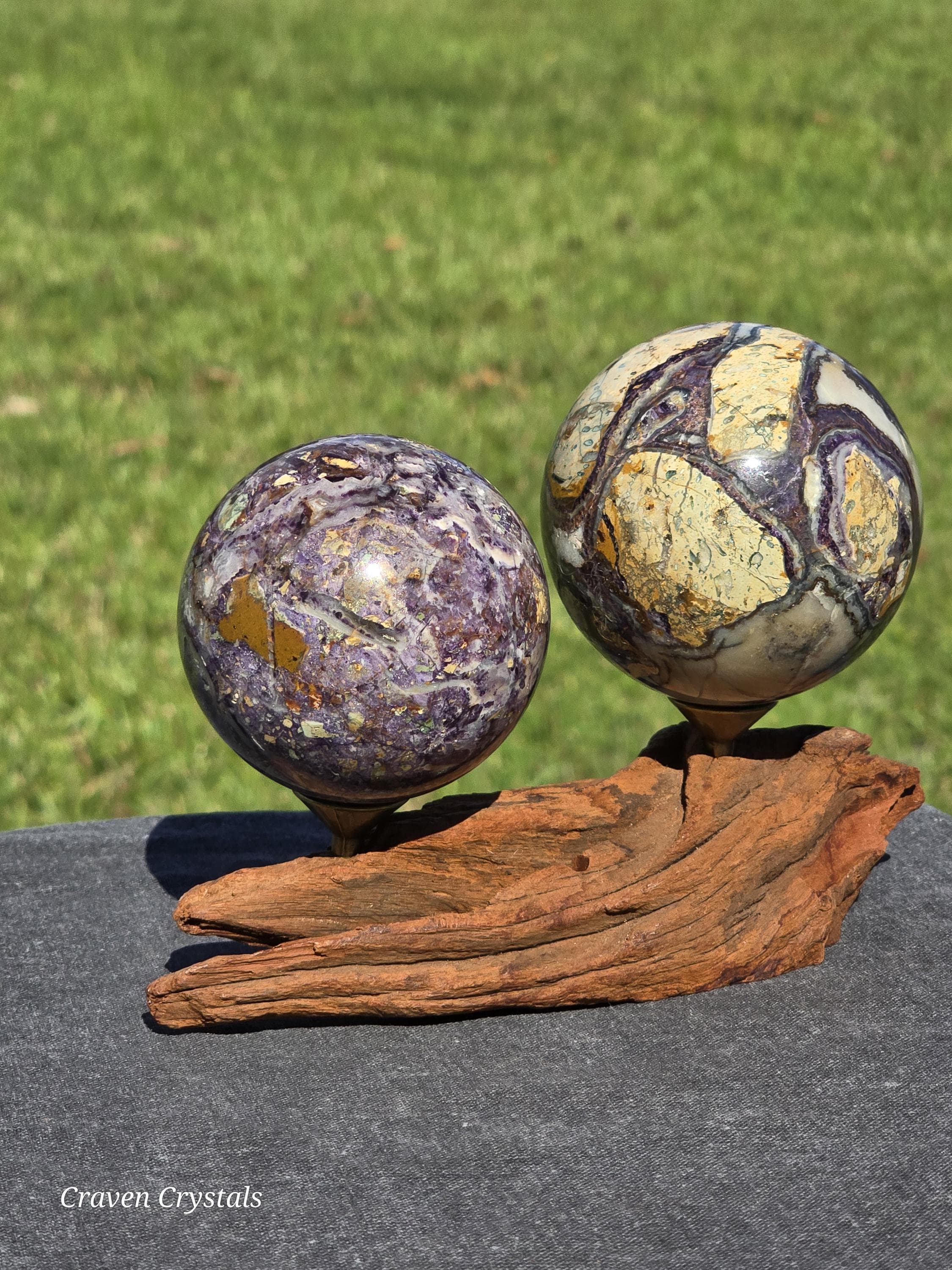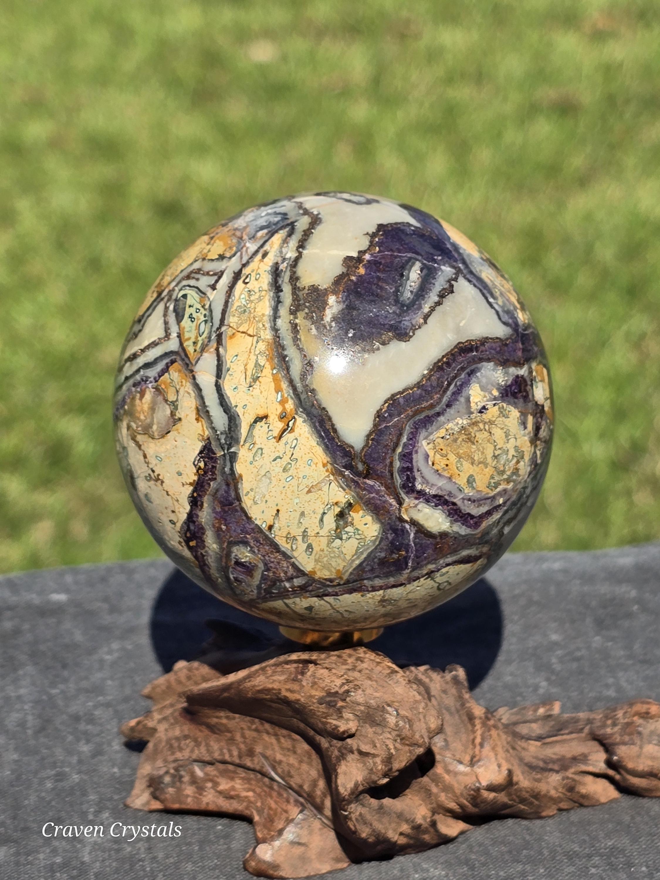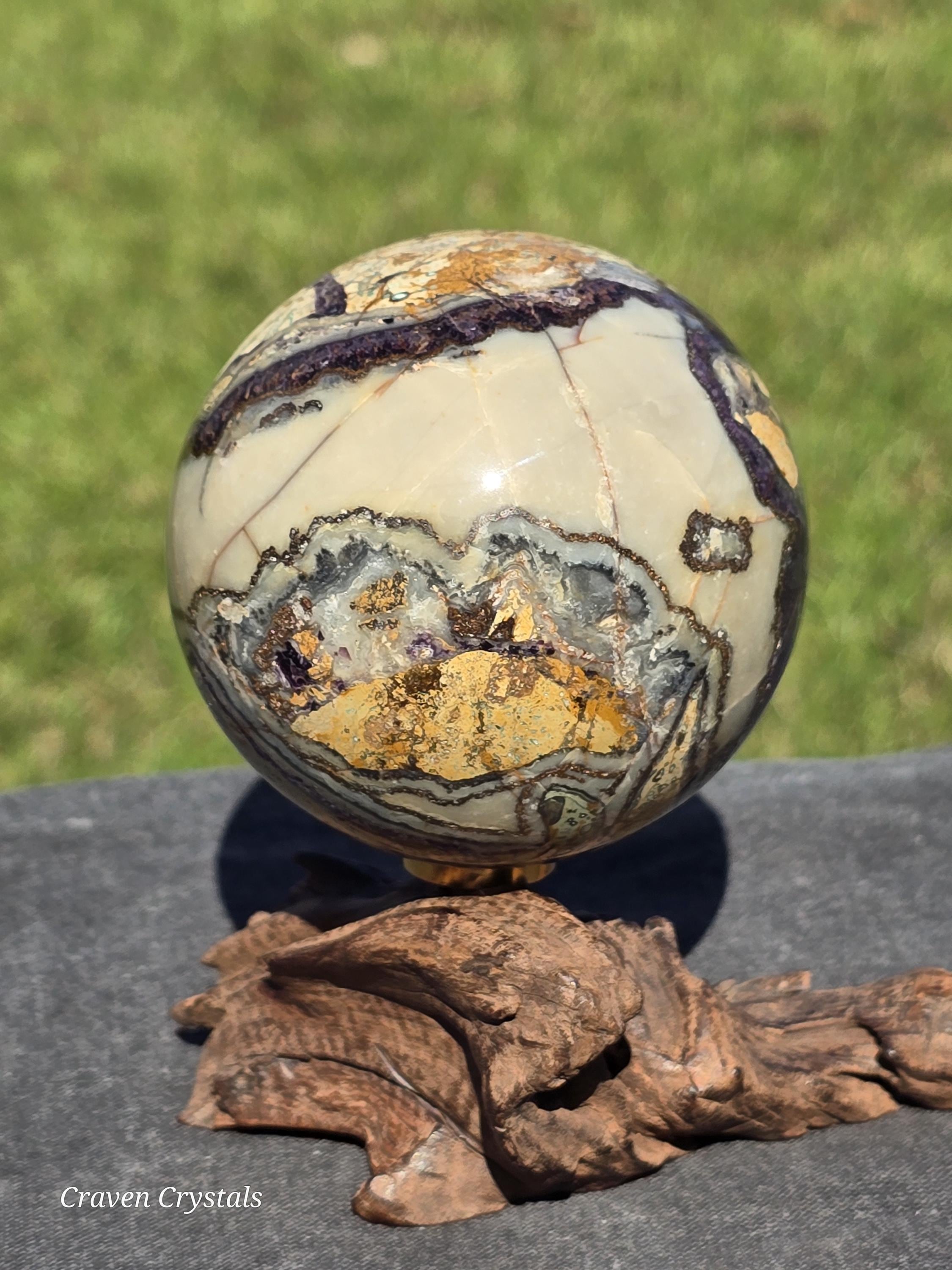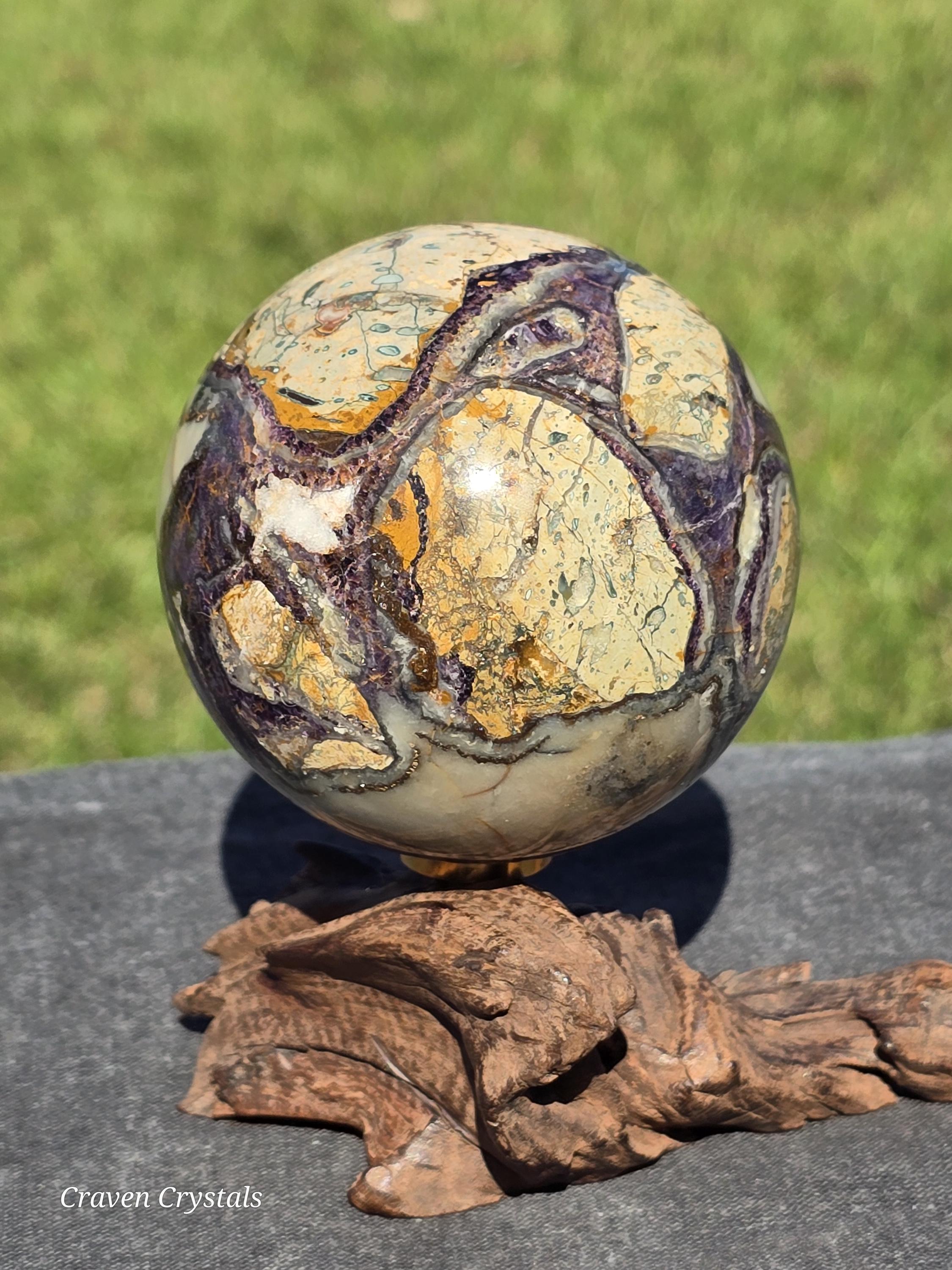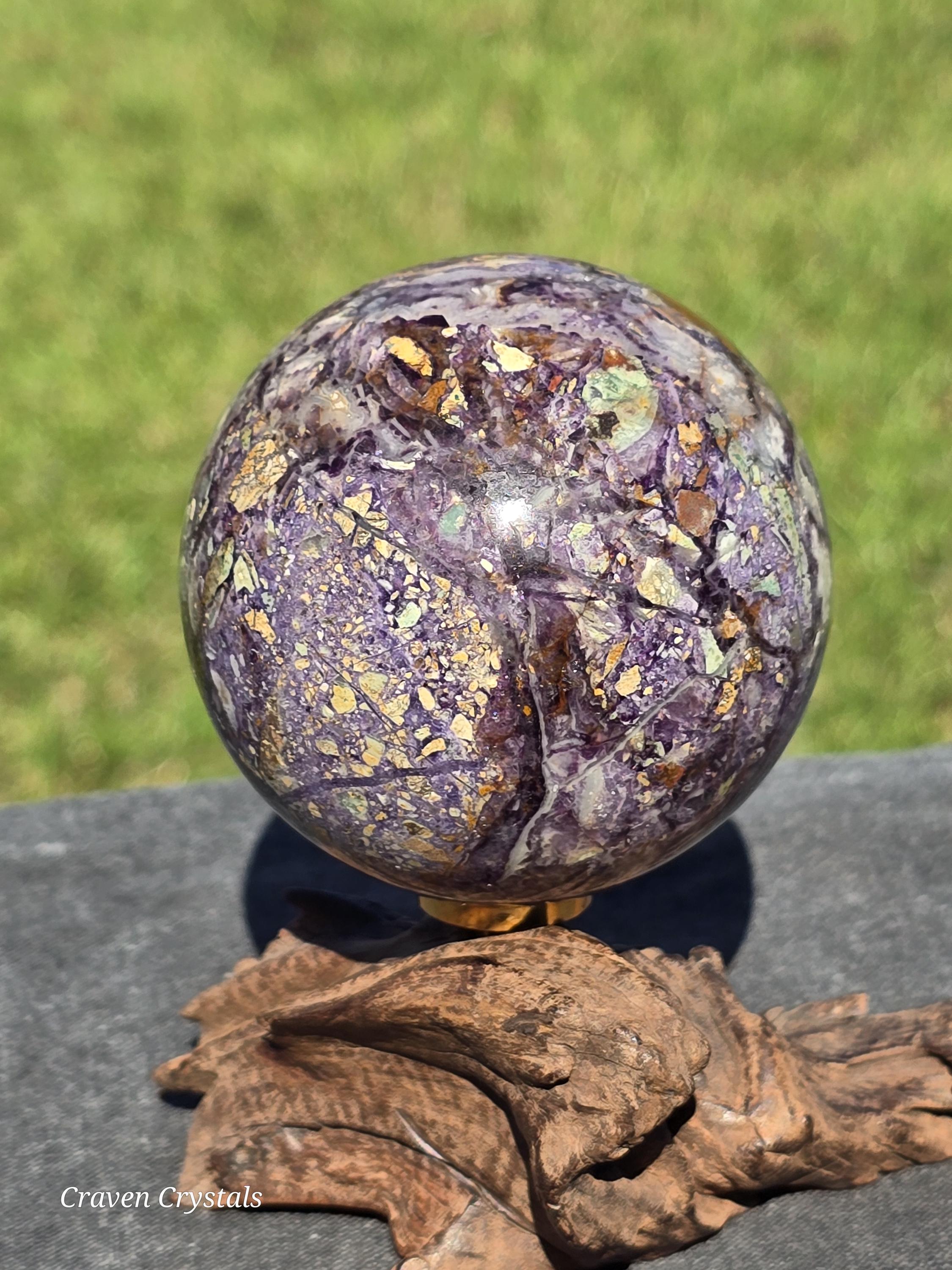 Brecciated Fluorite Root Crystal Sphere, a unique and visually striking form of fluorite that consists of angular fragments of fluorite cemented together by a fine-grained matrix. This brecciated appearance gives the stone a mosaic-like look.