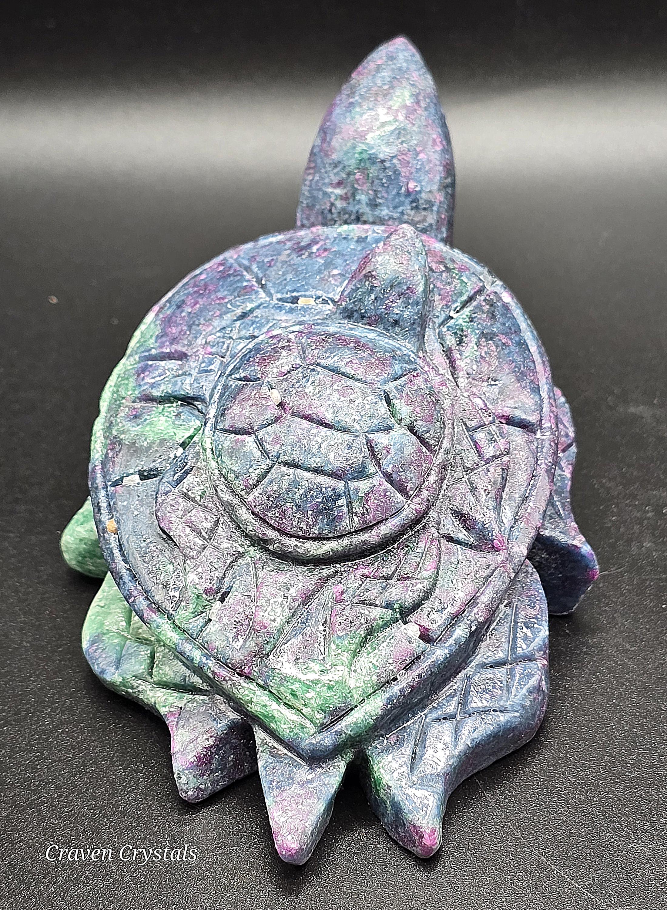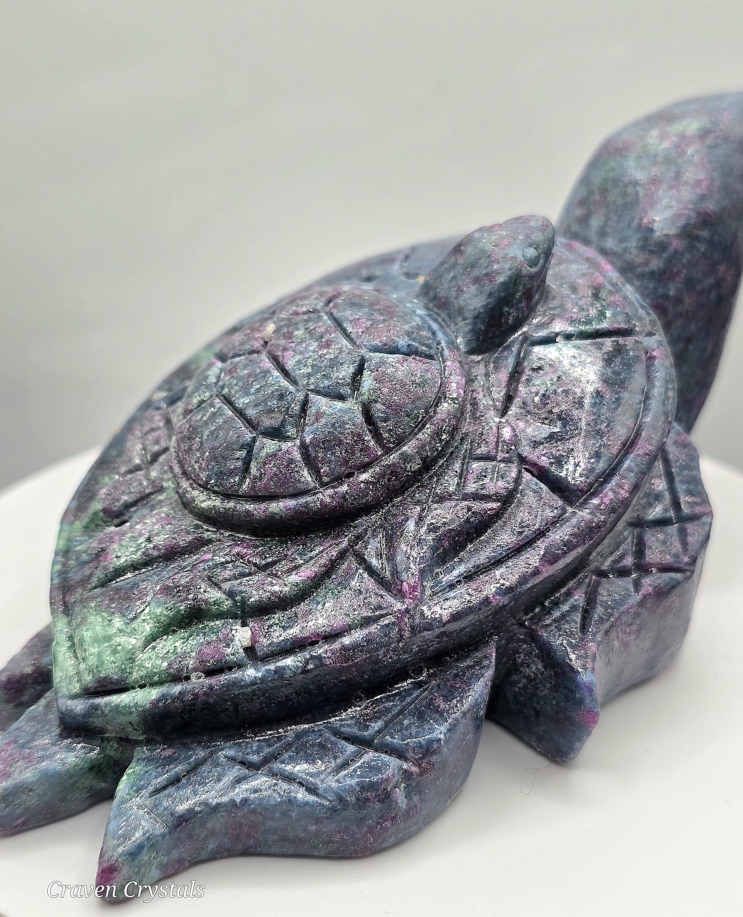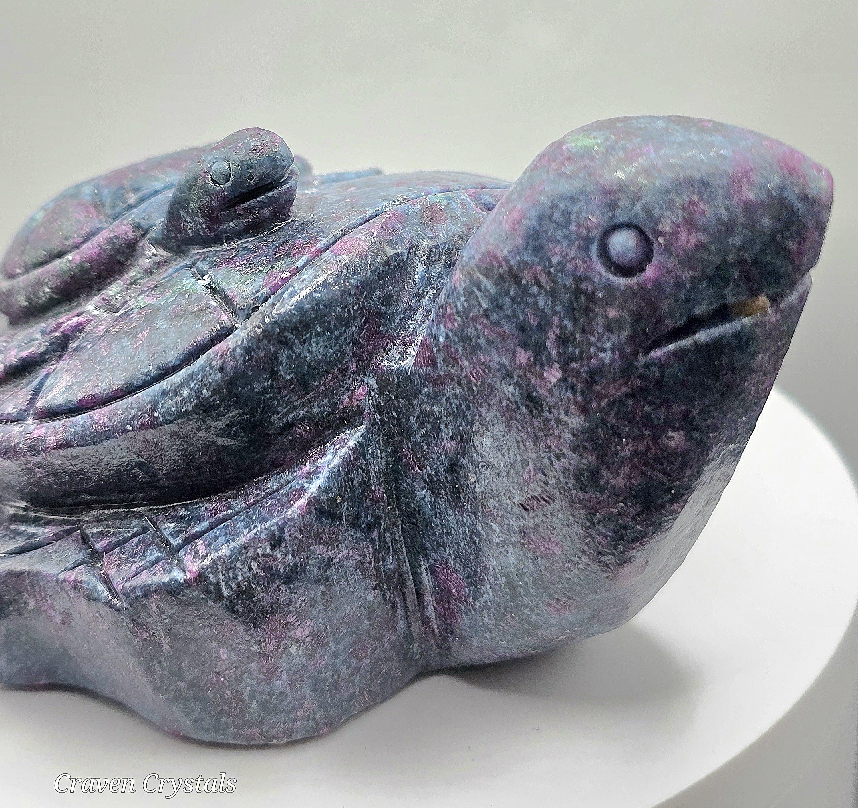 Unleash the power of resilience, passion, and wisdom with this breathtaking Ruby Fuchsite turtle carving. A symbol of protection and steady growth, the turtle embodies patience and endurance, guiding you through life's challenges. Infused with the potent energies of Ruby, Fuchsite and Kyanite, this carving radiates courage, clarity, and intuition, making it the perfect spiritual companion. Let this Guardian of Strength be your guiding force, helping you stay grounded, resilient, and fearless on your journey. A true masterpiece of nature, ready to empower and inspire! 🐢🔥💙❤️