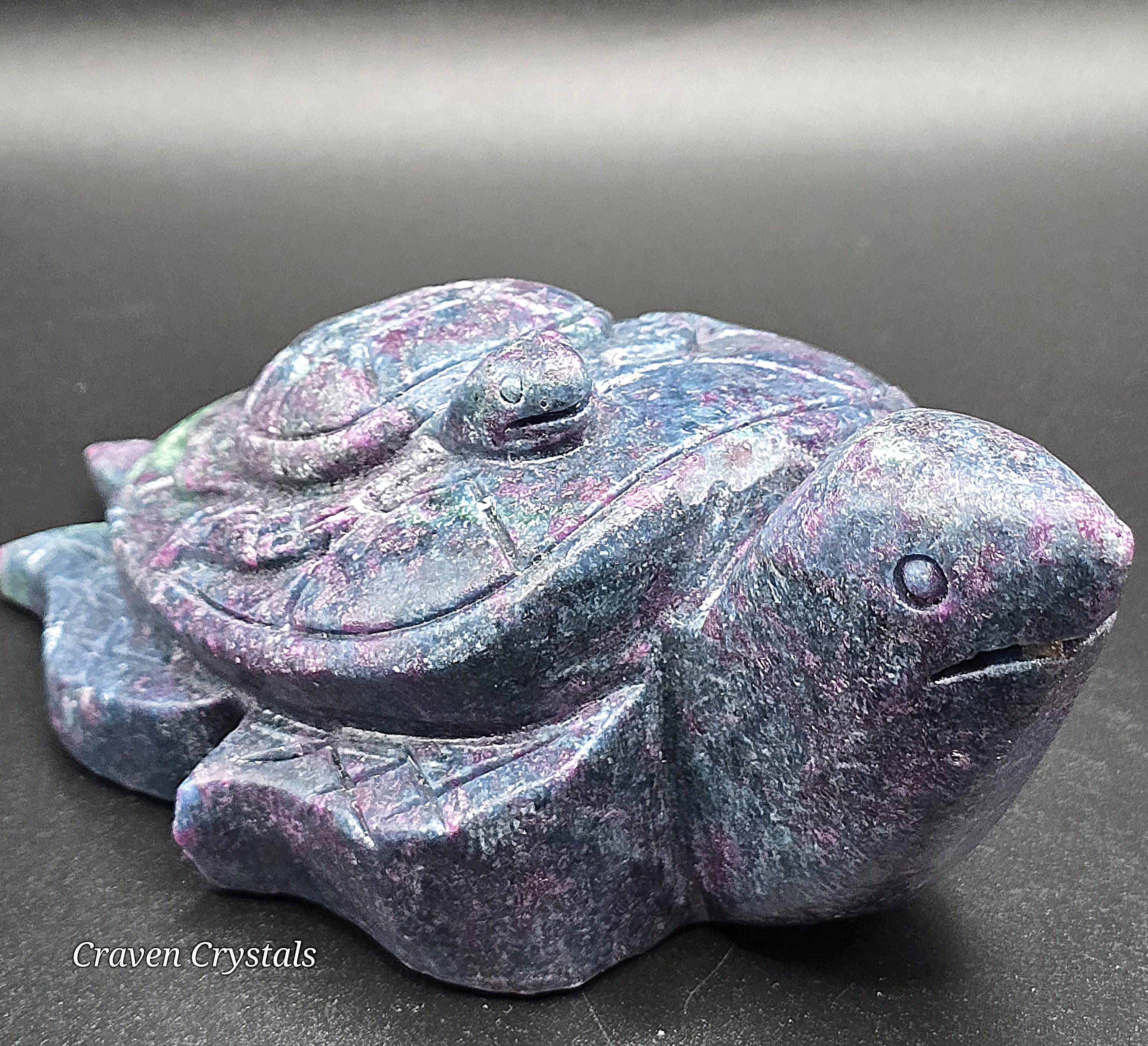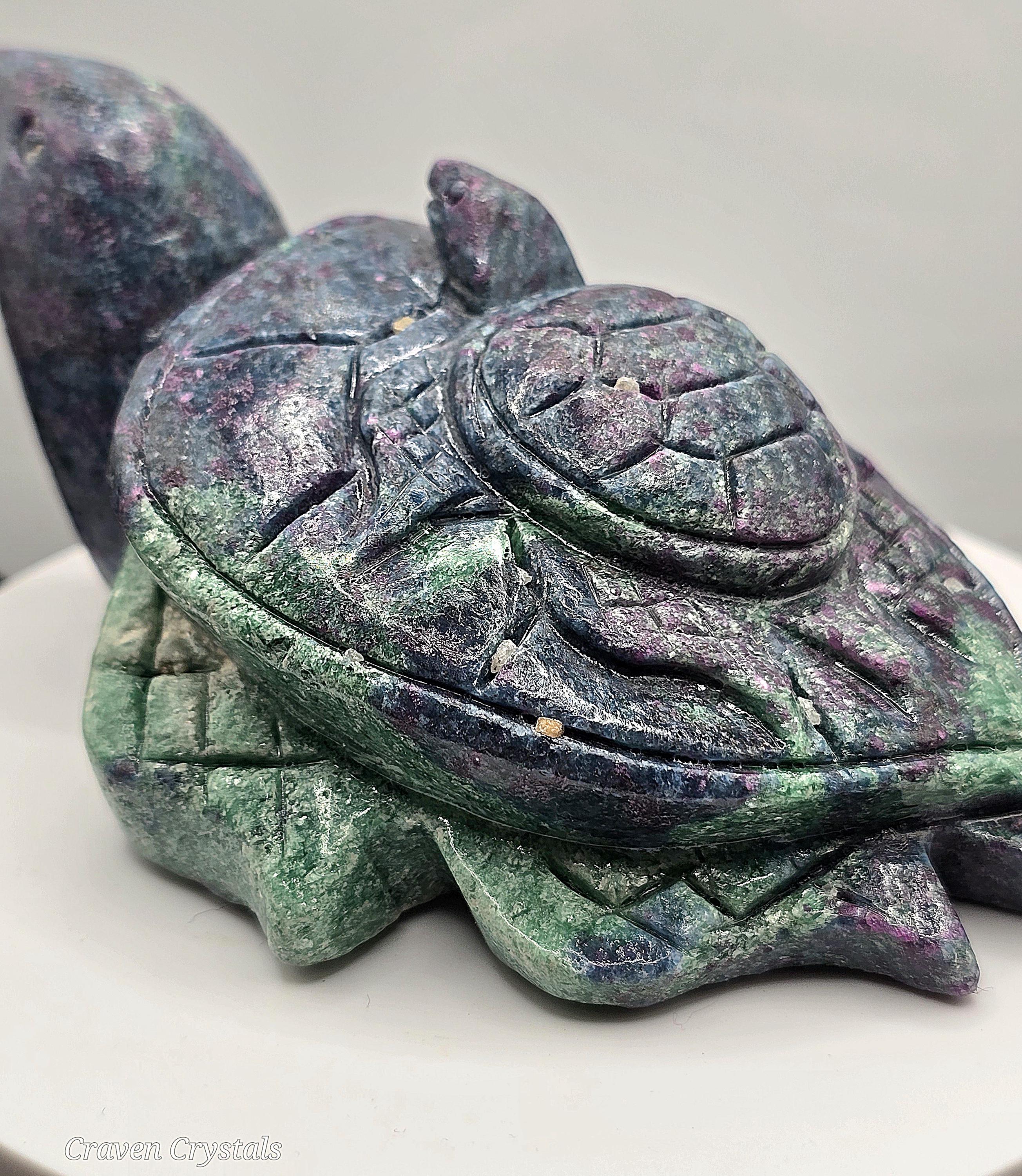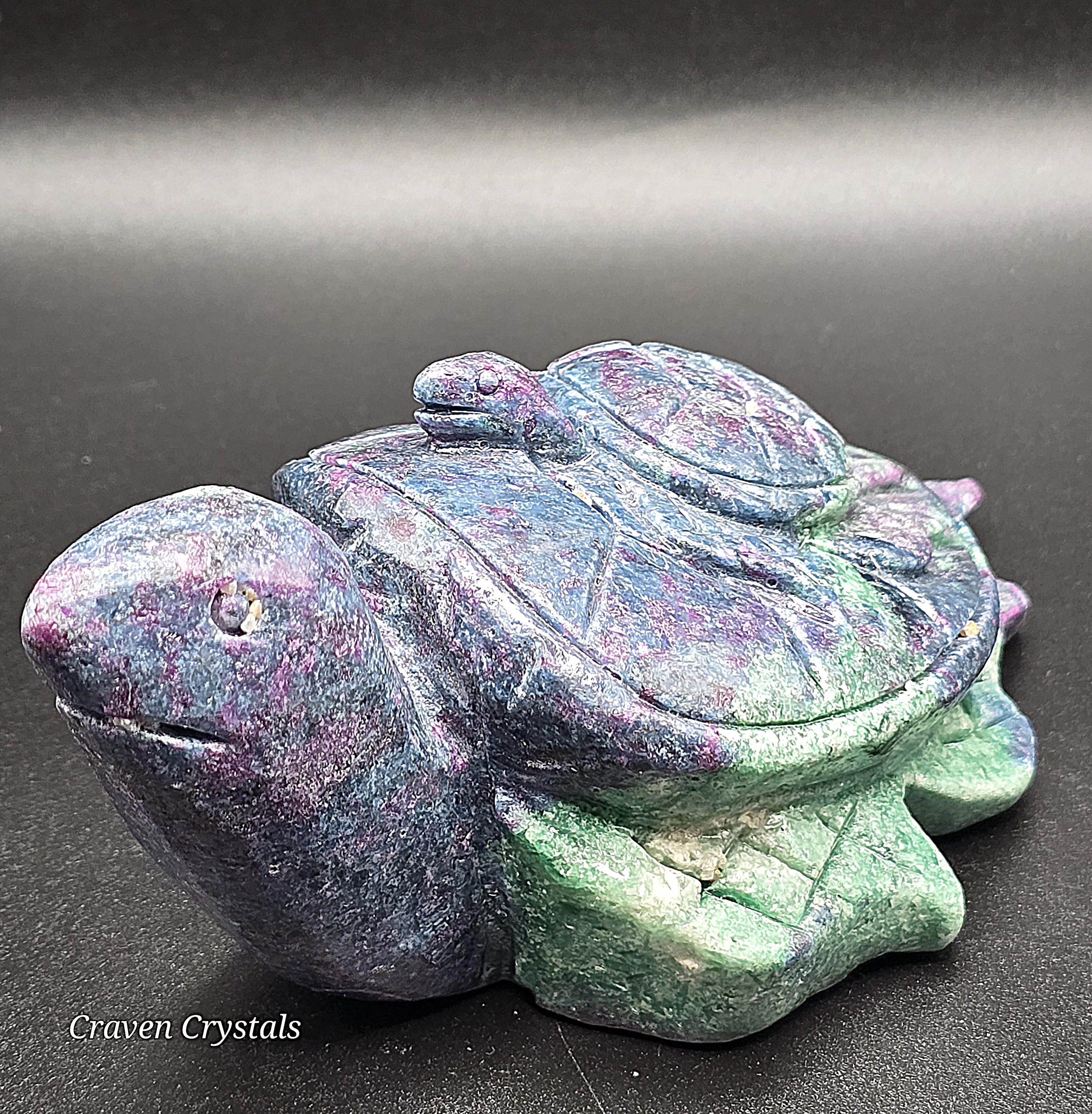 Unleash the power of resilience, passion, and wisdom with this breathtaking Ruby Fuchsite turtle carving. A symbol of protection and steady growth, the turtle embodies patience and endurance, guiding you through life's challenges. Infused with the potent energies of Ruby, Fuchsite and Kyanite, this carving radiates courage, clarity, and intuition, making it the perfect spiritual companion. Let this Guardian of Strength be your guiding force, helping you stay grounded, resilient, and fearless on your journey. A true masterpiece of nature, ready to empower and inspire! 🐢🔥💙❤️