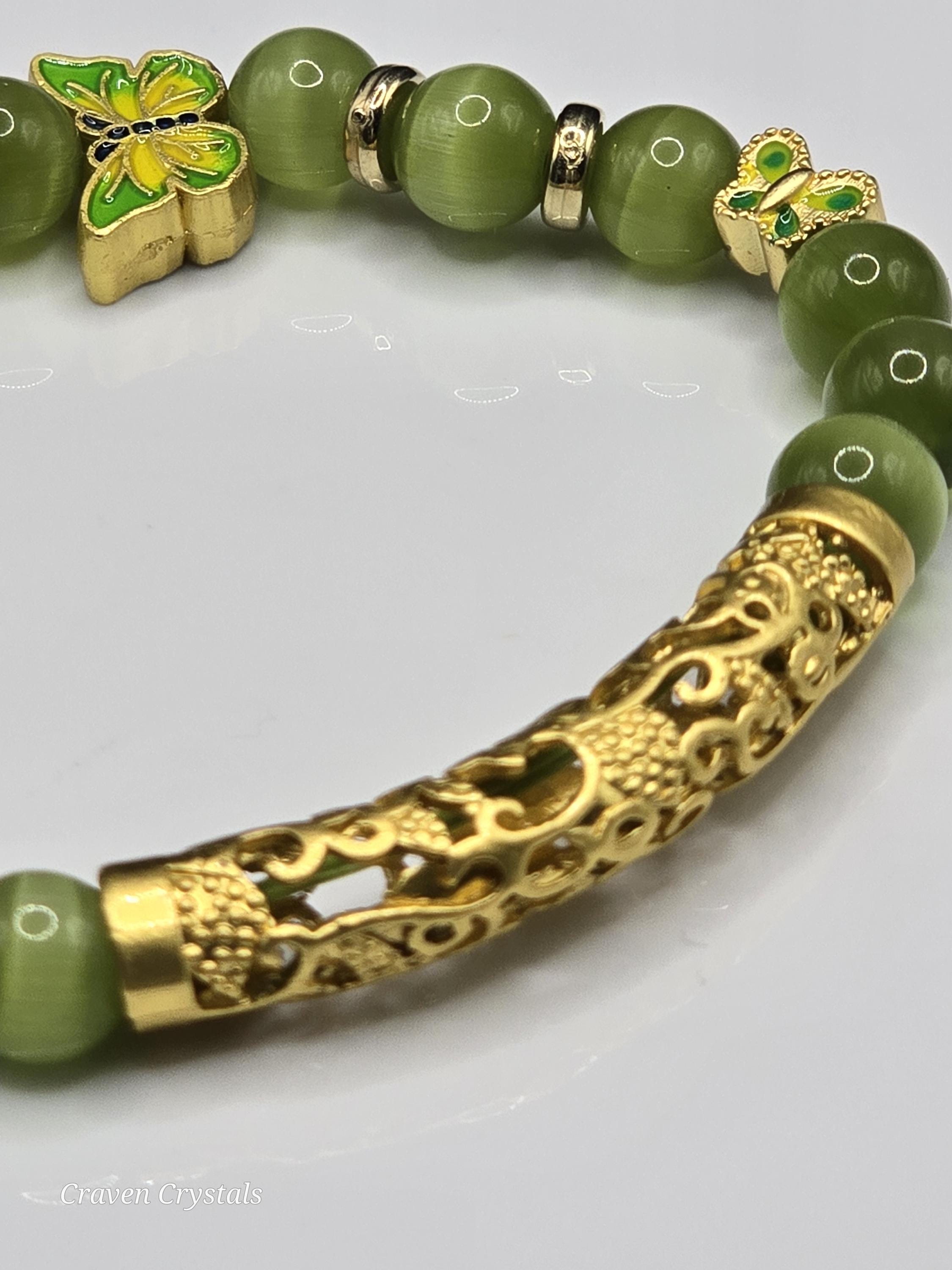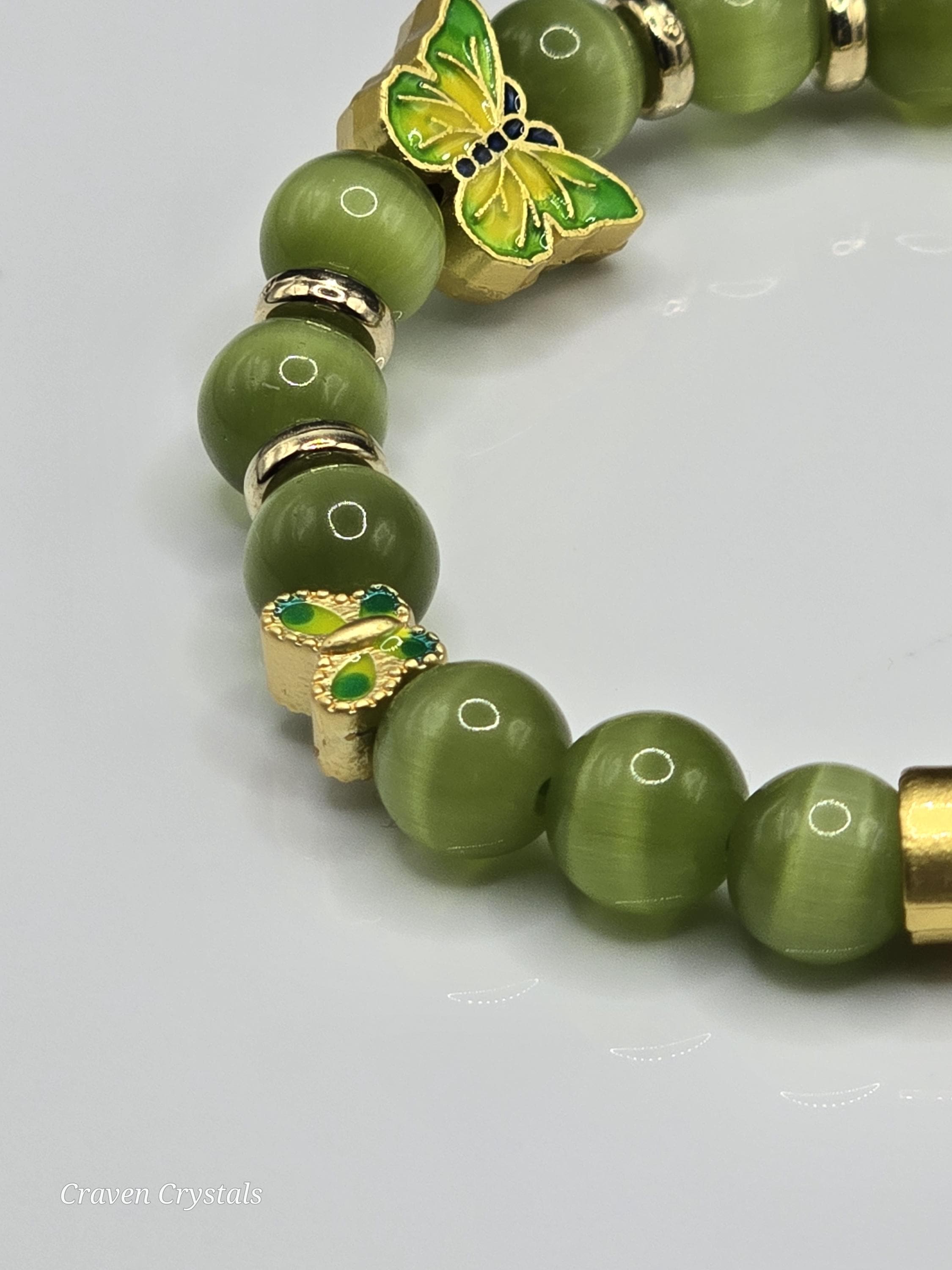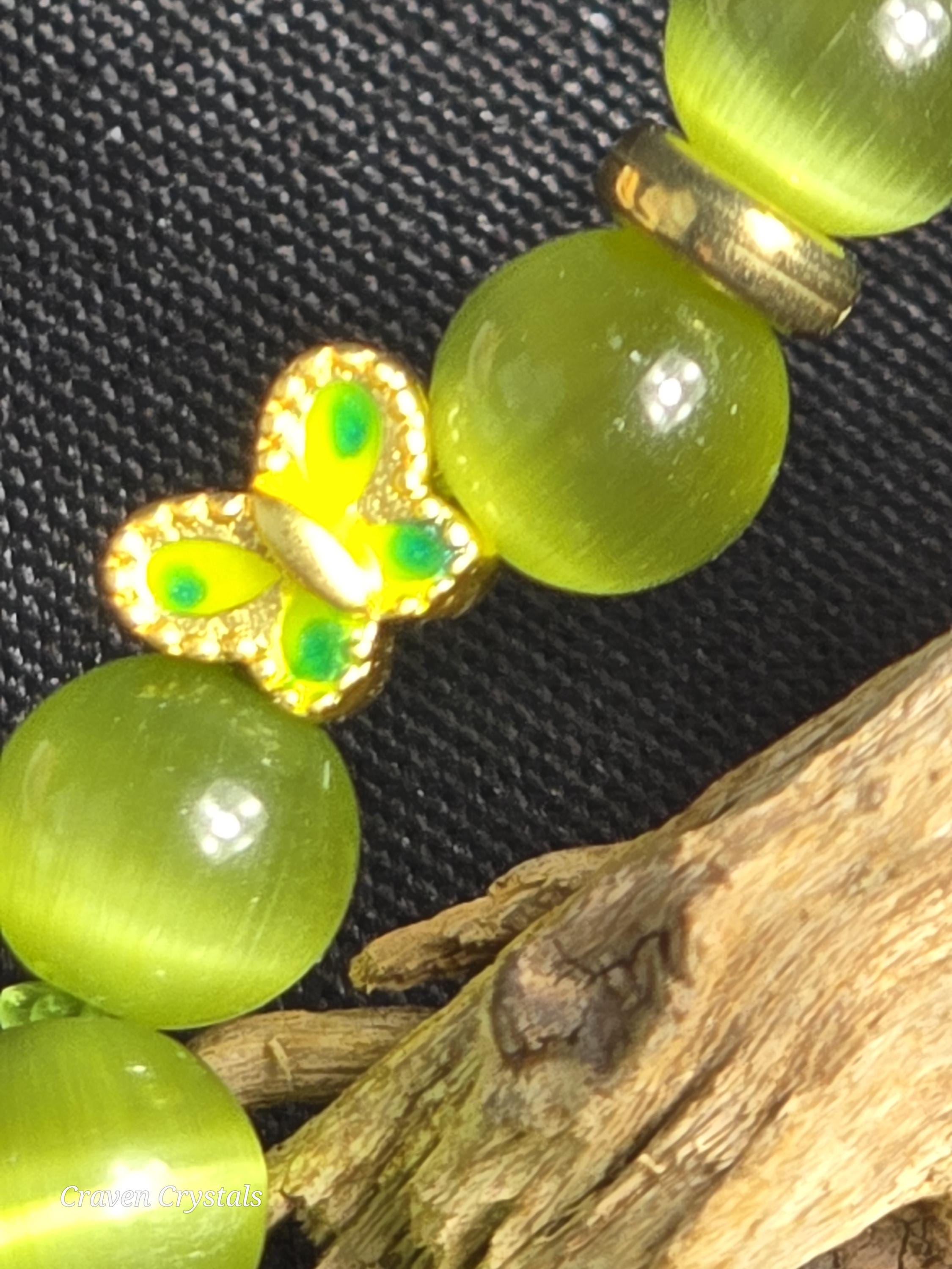 Soft, luminous, and full of promise, “Spring Awakening” is a bracelet inspired by the first warm breeze and the quiet magic of new beginnings. Crafted with enhanced color spring green cat eye selenite, each bead glows with a silky, light-catching shimmer that evokes fresh leaves, open fields, and gentle renewal. Delicate gold and green butterfly beads flutter throughout the design, symbolizing transformation, hope, and rebirth, while polished golden accents add warmth and elegance. The result is a bracelet that feels uplifting, cleansing, and beautifully alive — a wearable reminder that growth is always unfolding.